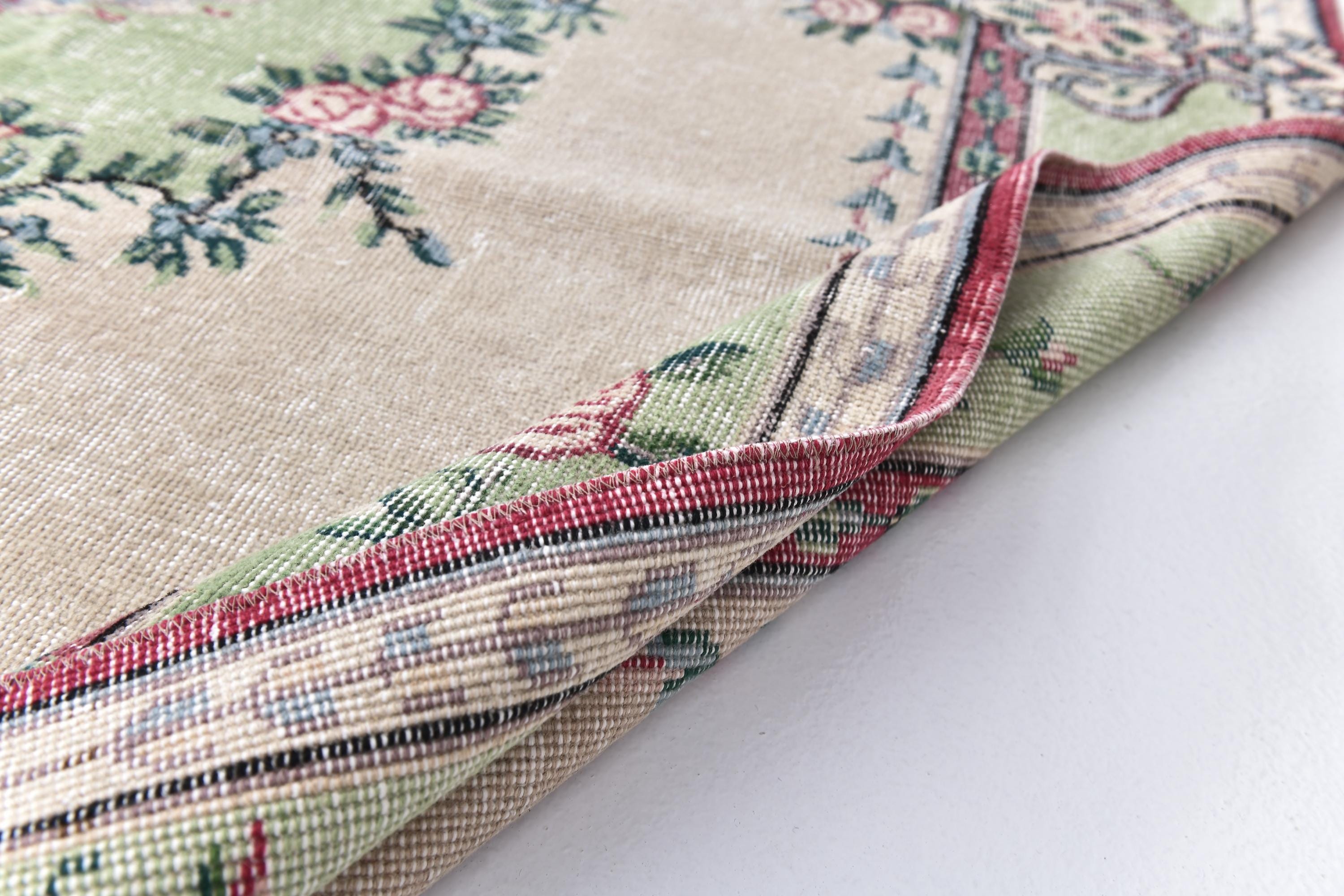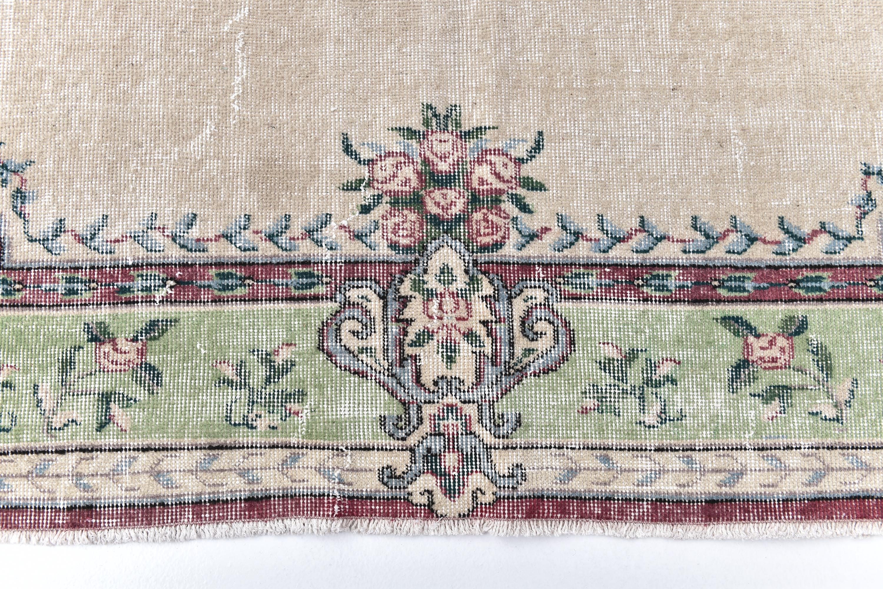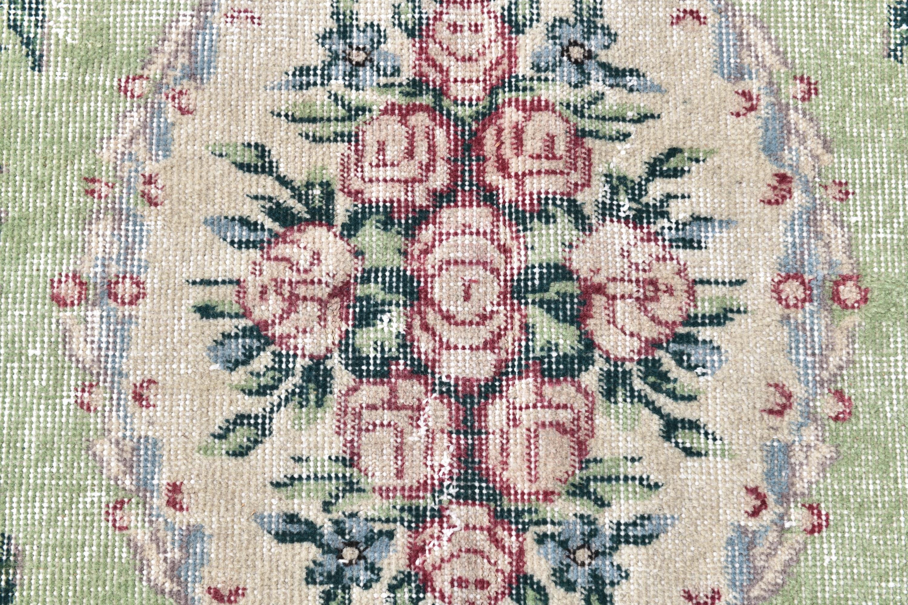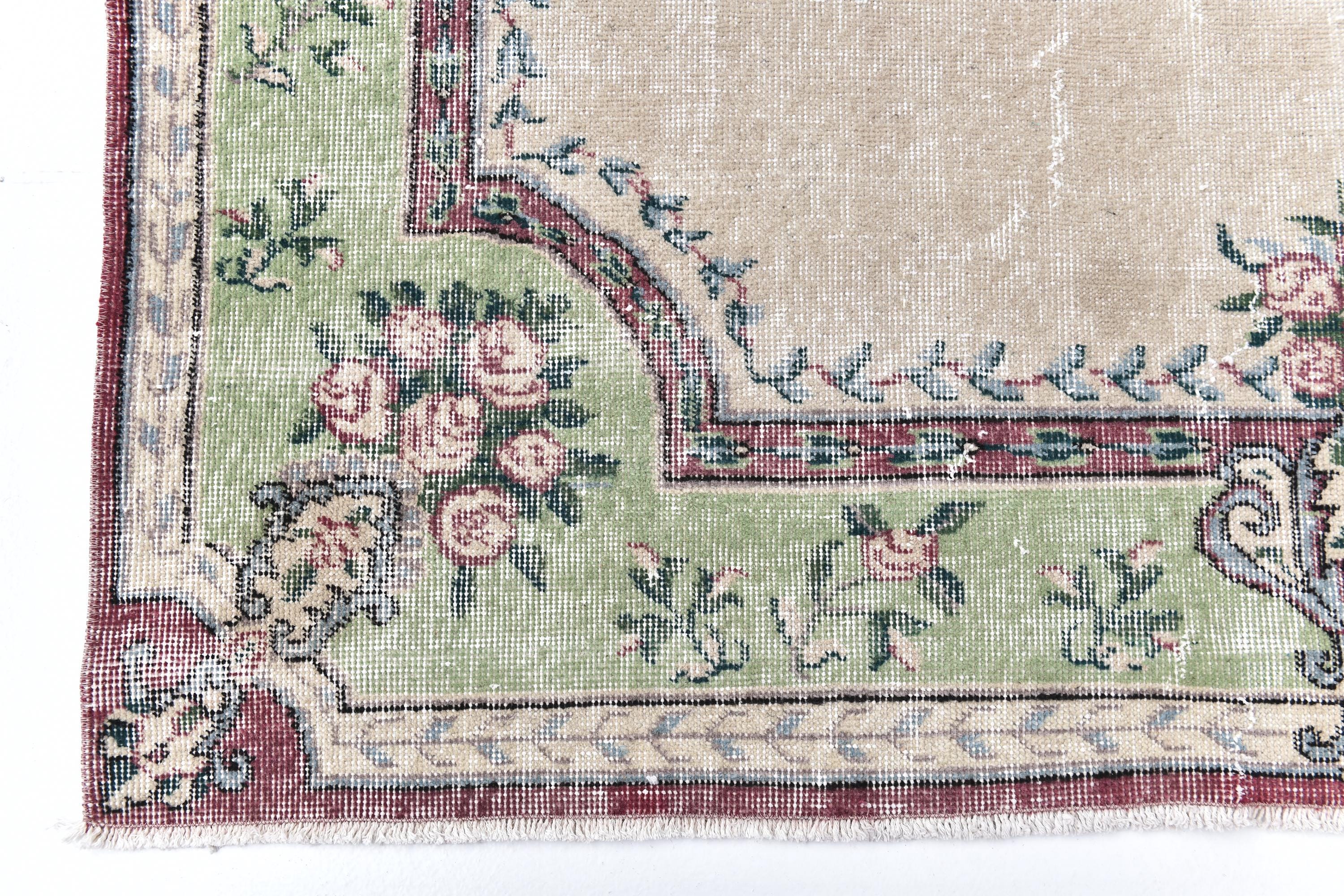 📜 Victorian style Anatolian rug featuring pastel color palette of cream, soft green, and rose pink. Central floral medallion with ornate corner spandrels, delicate rose bouquets throughout mint green border, hand-knotted construction with authentic worn vintage appearance.
