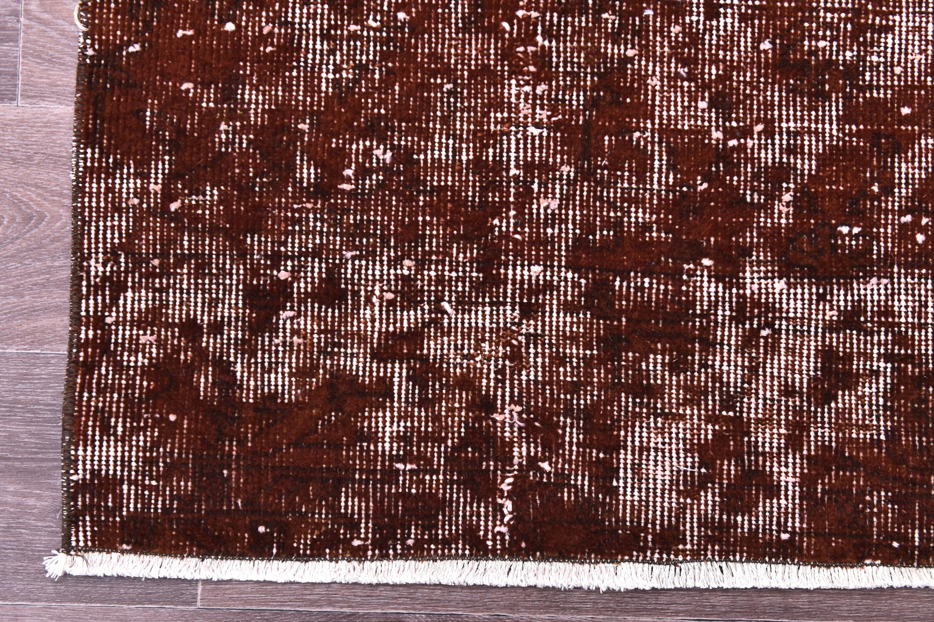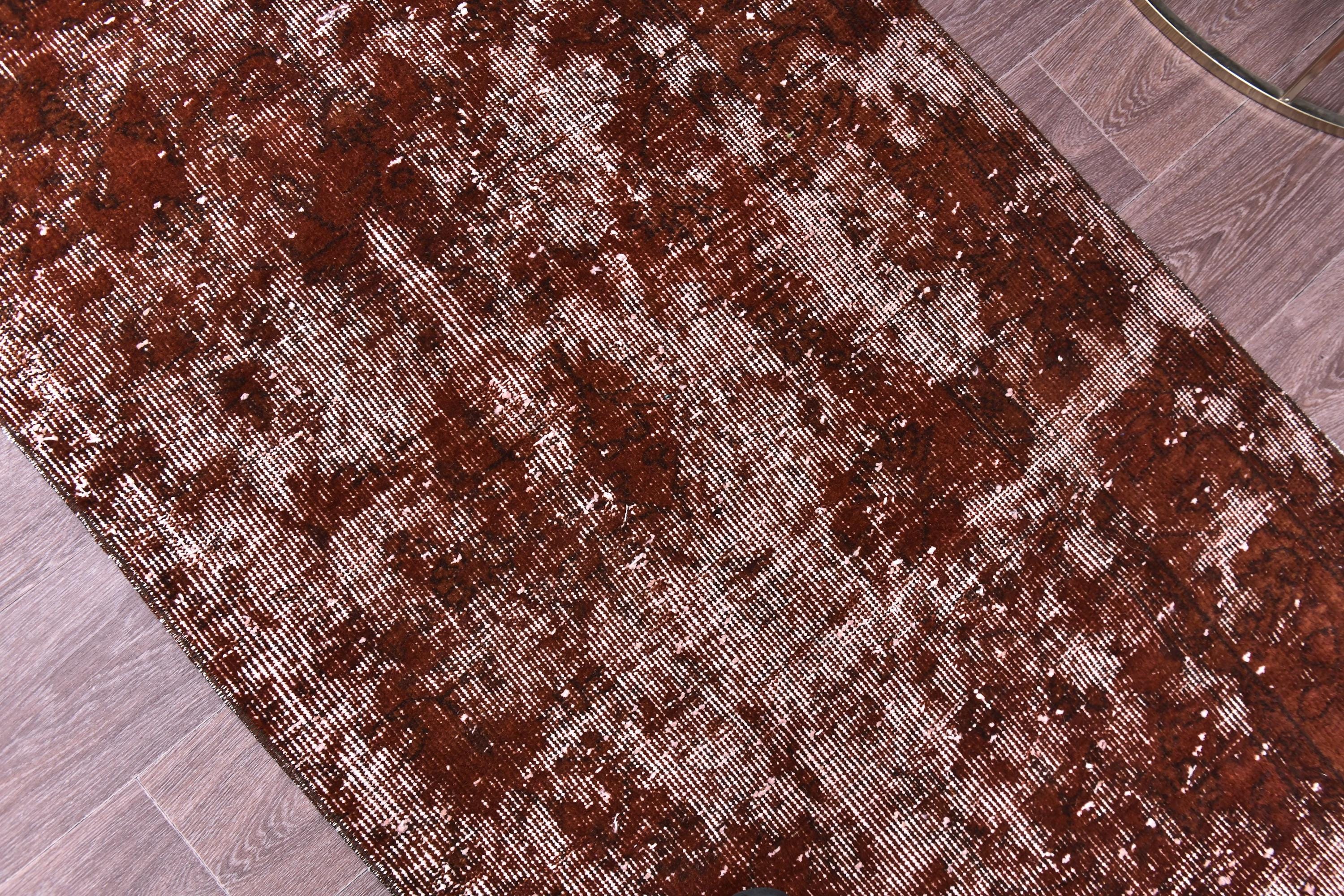 📜📌 Overdyed vintage runner rug in rich chocolate brown and beige tones featuring a distressed, weathered appearance with faded floral and geometric patterns visible beneath the surface. This hand-knotted wool Turkish carpet displays an elongated rectangular shape perfect for hallways, with intentional color variation creating depth and character. The overdyeing process reveals subtle undertones of cream and taupe showing through the deep brown primary color.