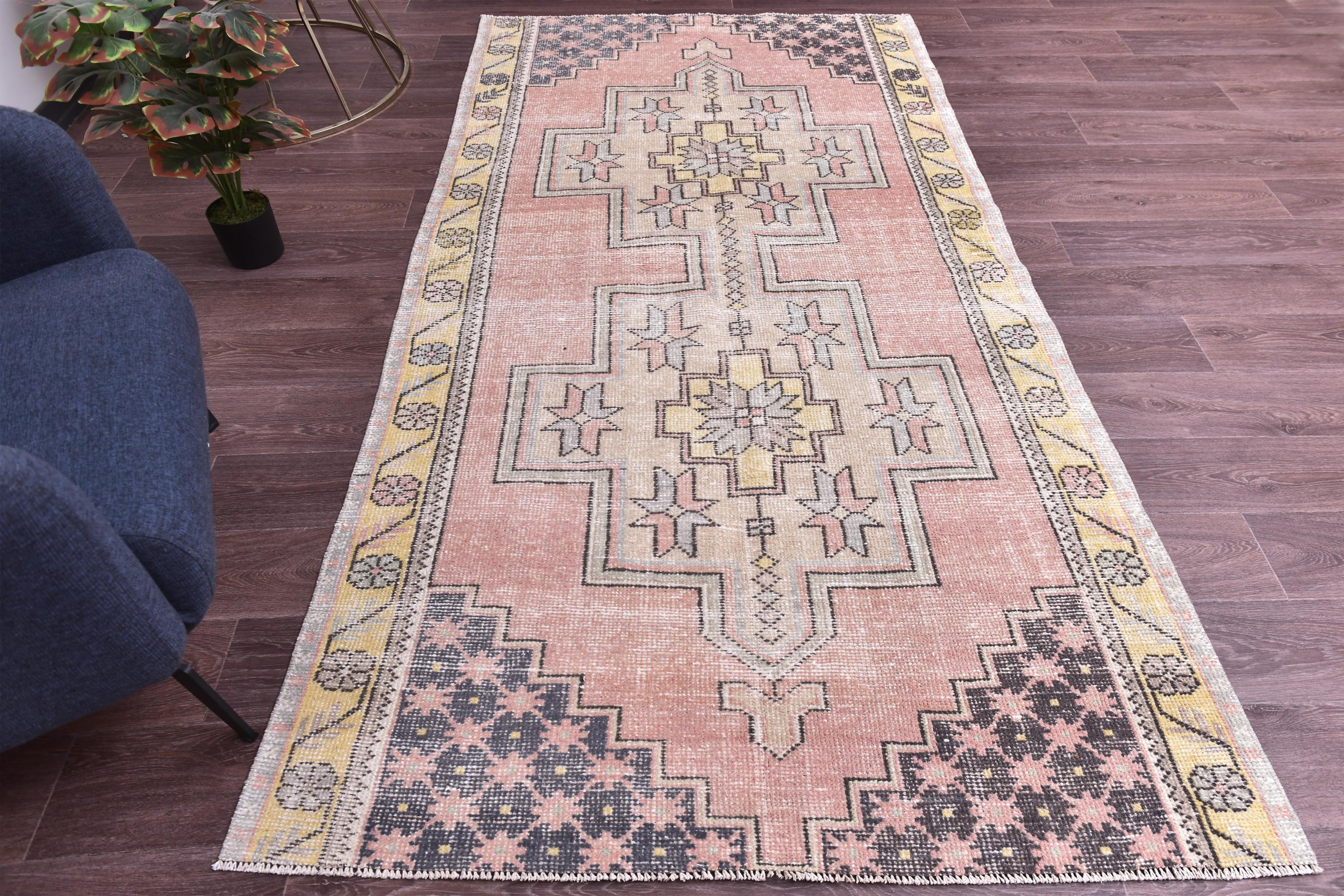 📜📌 Hand-knotted Anatolian runner carpet displaying classic center medallions in muted pink salmon, golden mustard yellow, and slate gray tones with stepped diamond shapes, decorative corner spandrels, and worn vintage patina on low-pile wool foundation with natural abrash