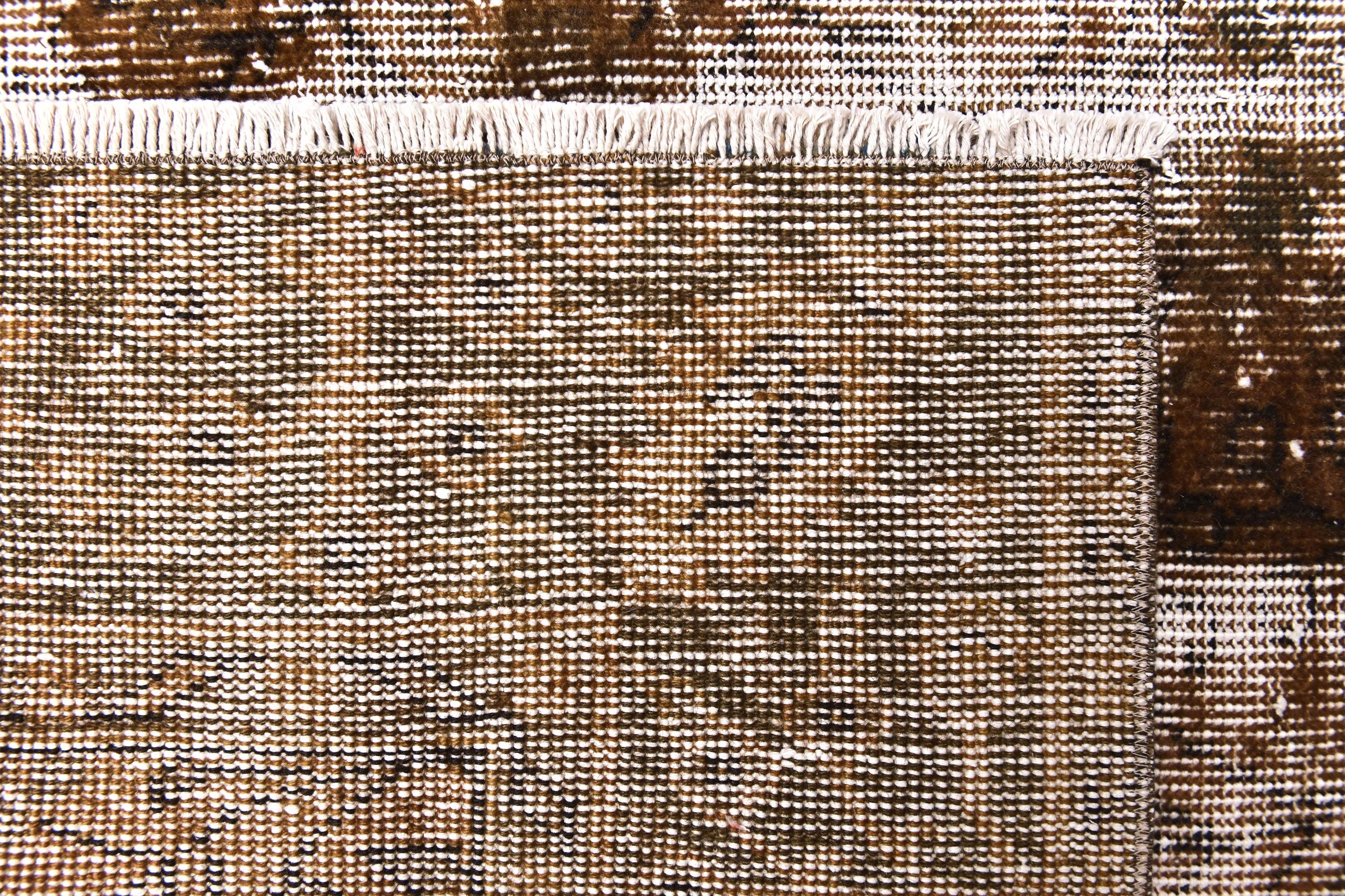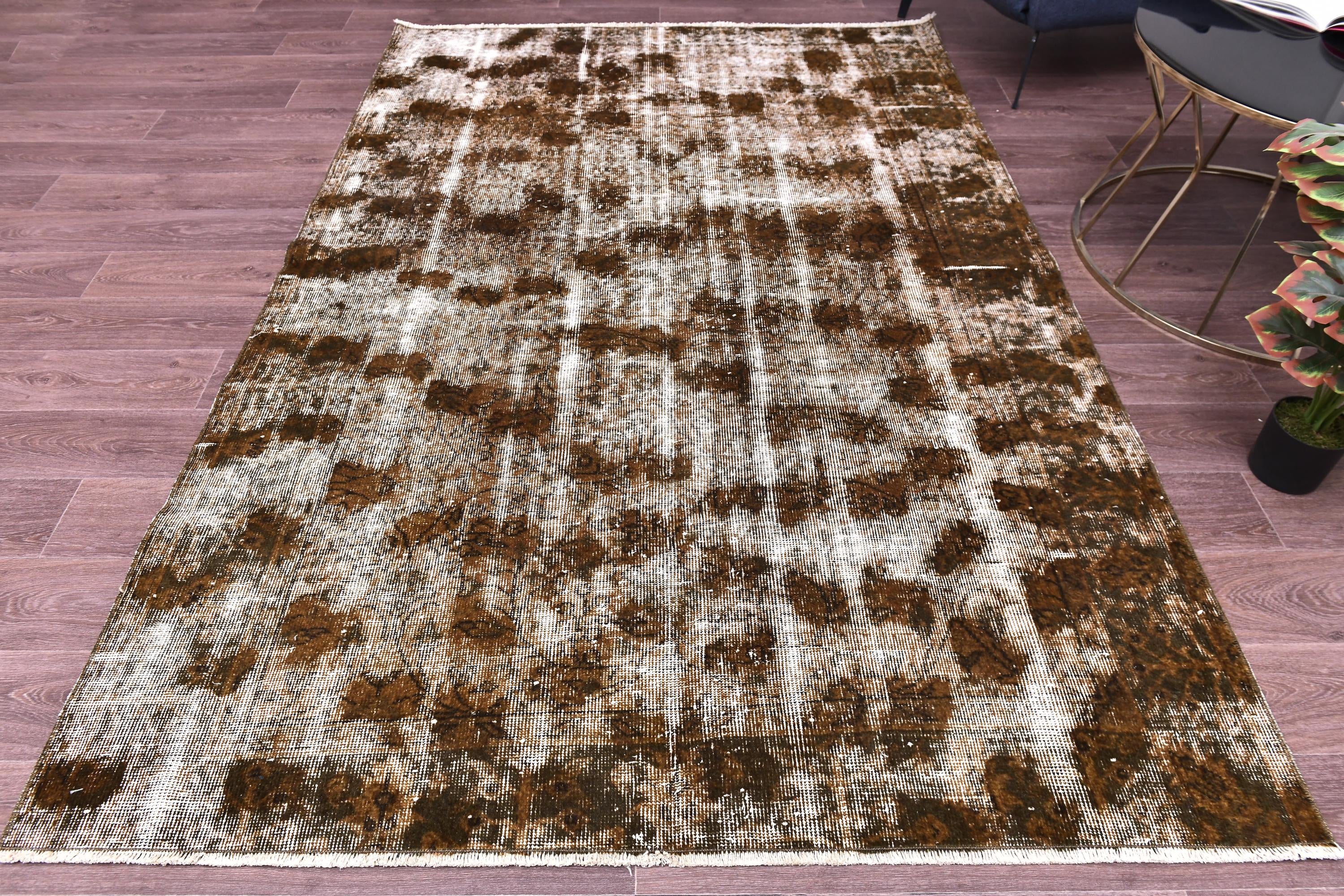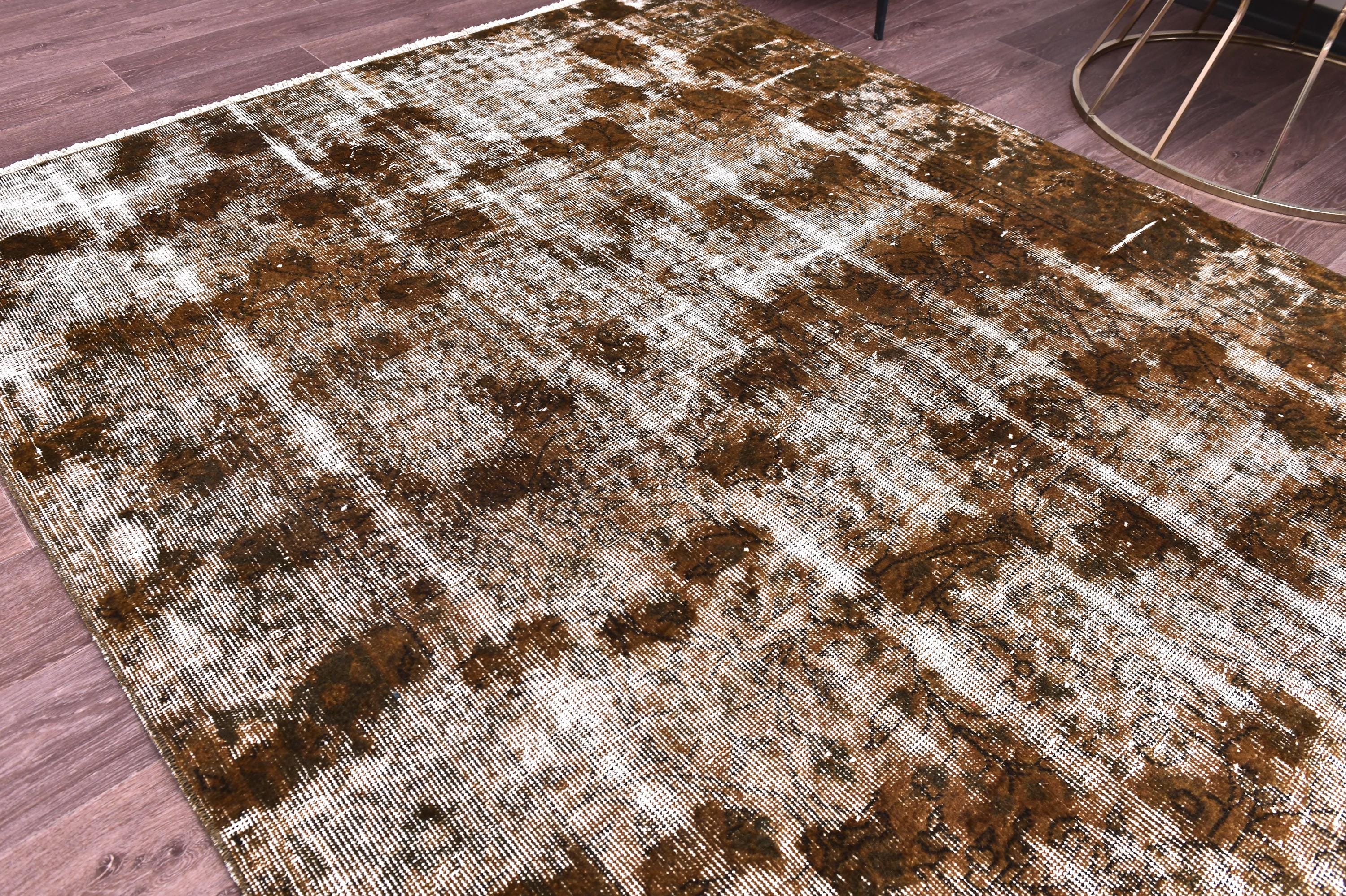 📜📌 Vintage overdyed area rug featuring golden mustard and brown tones with distressed floral medallion patterns throughout. Hand-knotted wool carpet with weathered appearance, cream-colored abrash effects, and traditional Oriental border design. Perfect for bohemian or eclectic interior spaces.