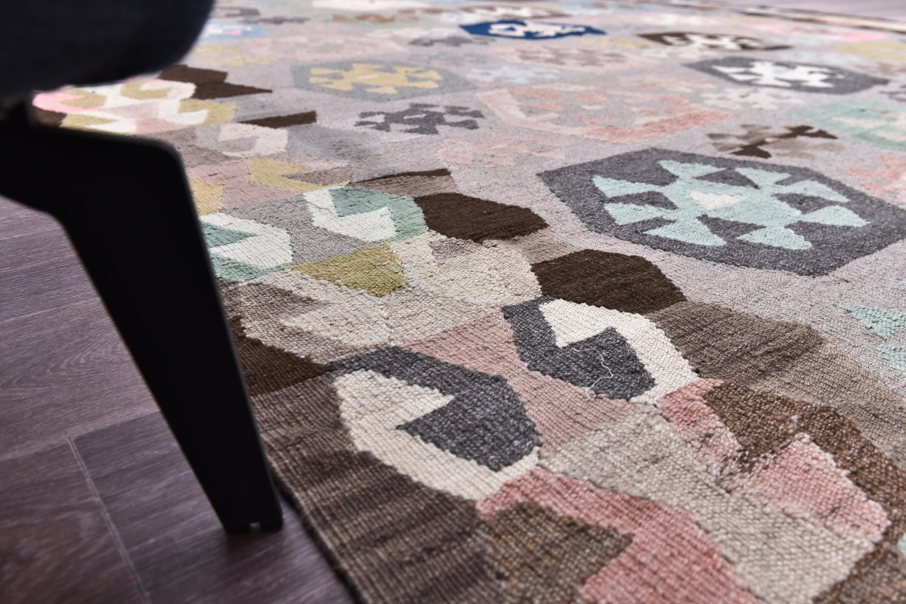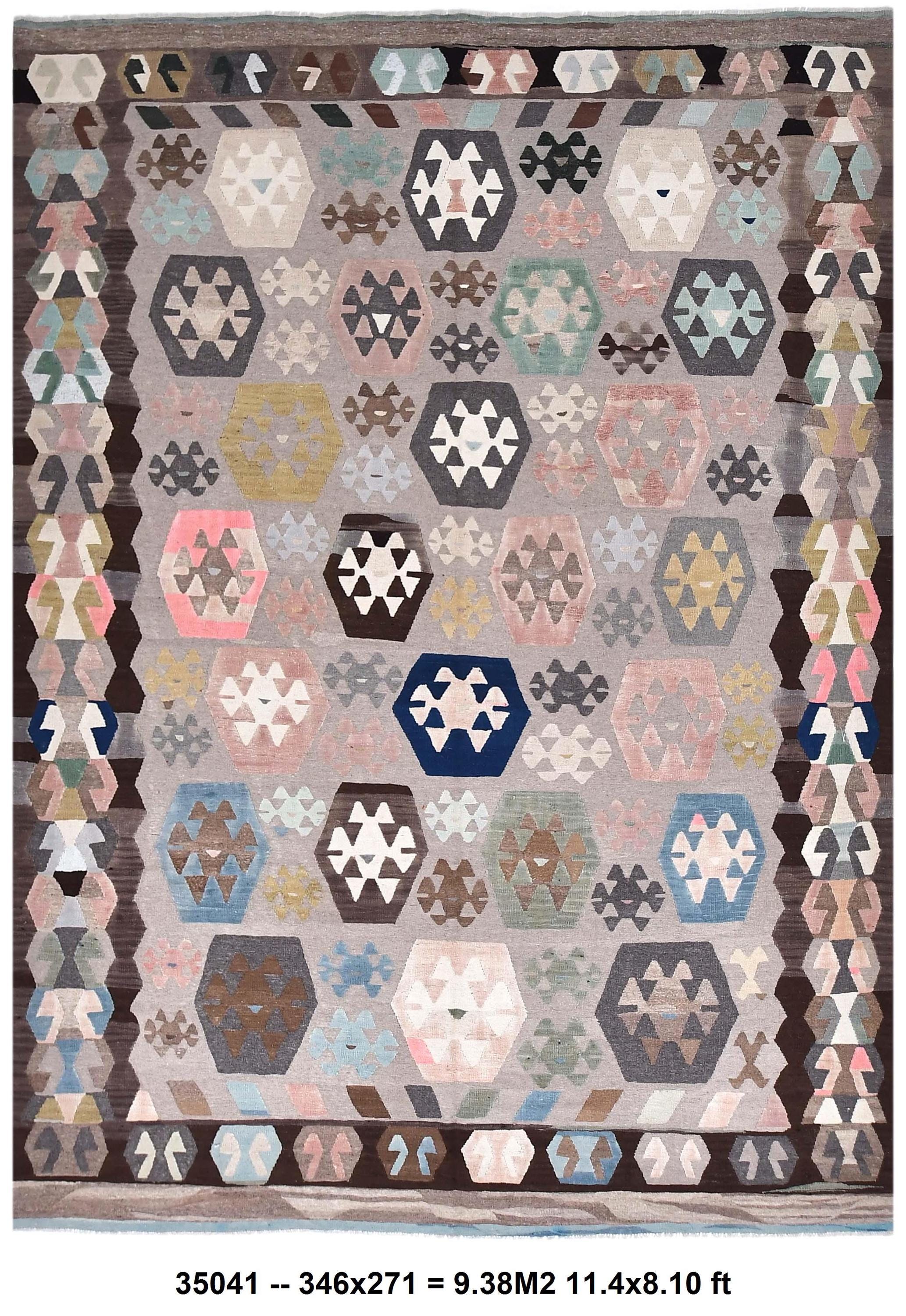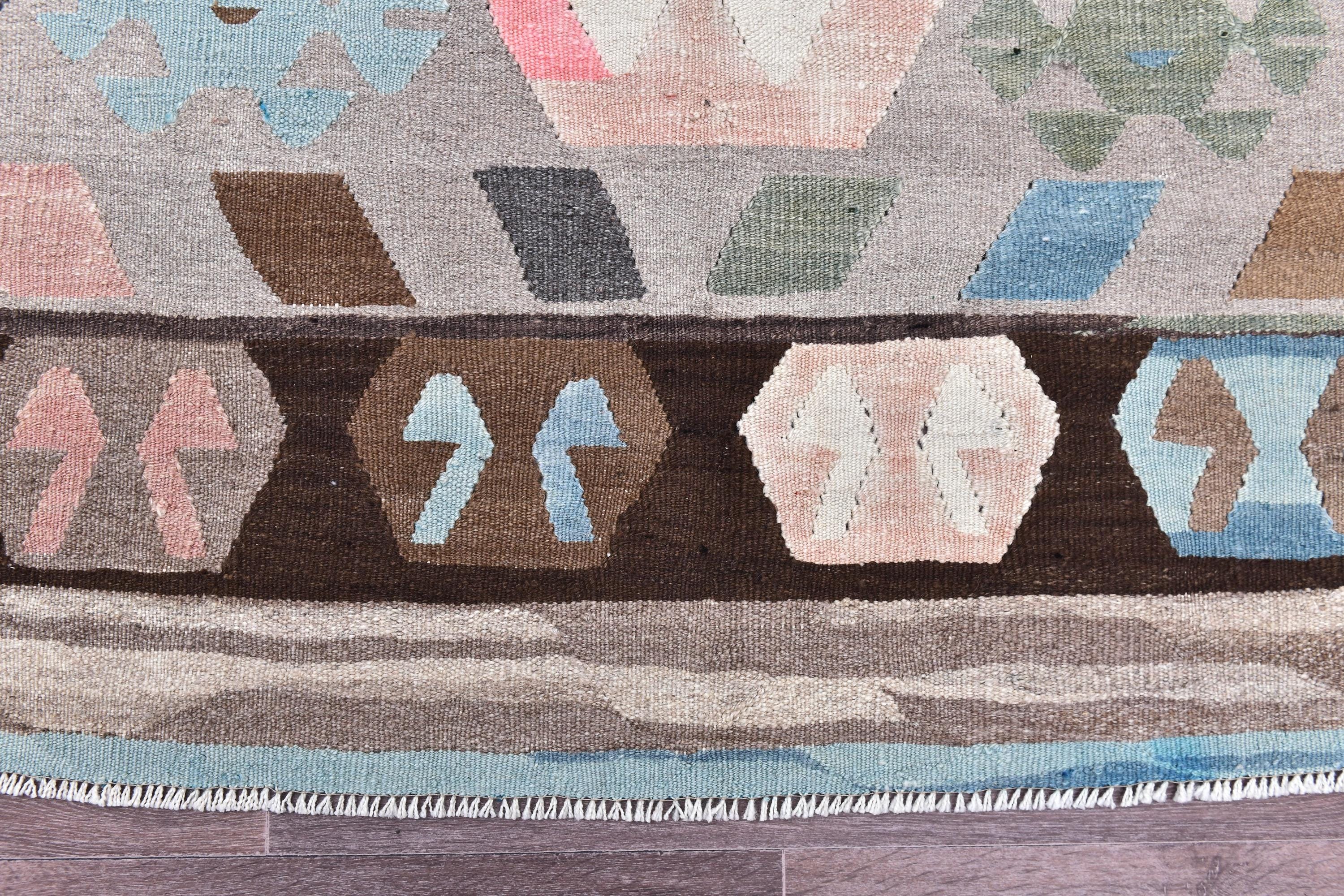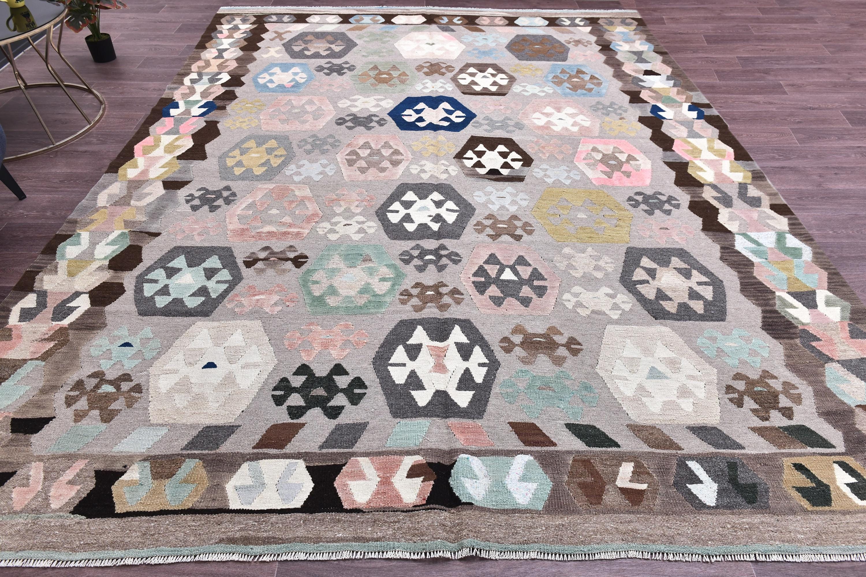 📜📌 Vintage style kilim flatweave rug with repeating hexagon geometric motifs in multi-color palette including pastel pink, navy blue, mustard yellow, sage green and earth tones, handmade wool carpet with decorative zigzag border and authentic tribal design