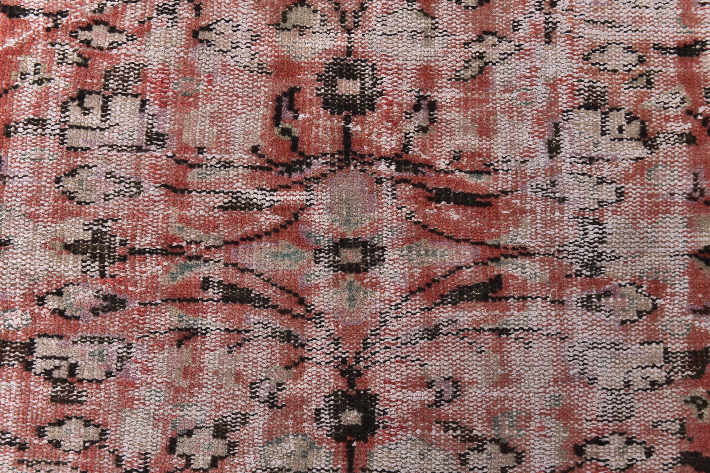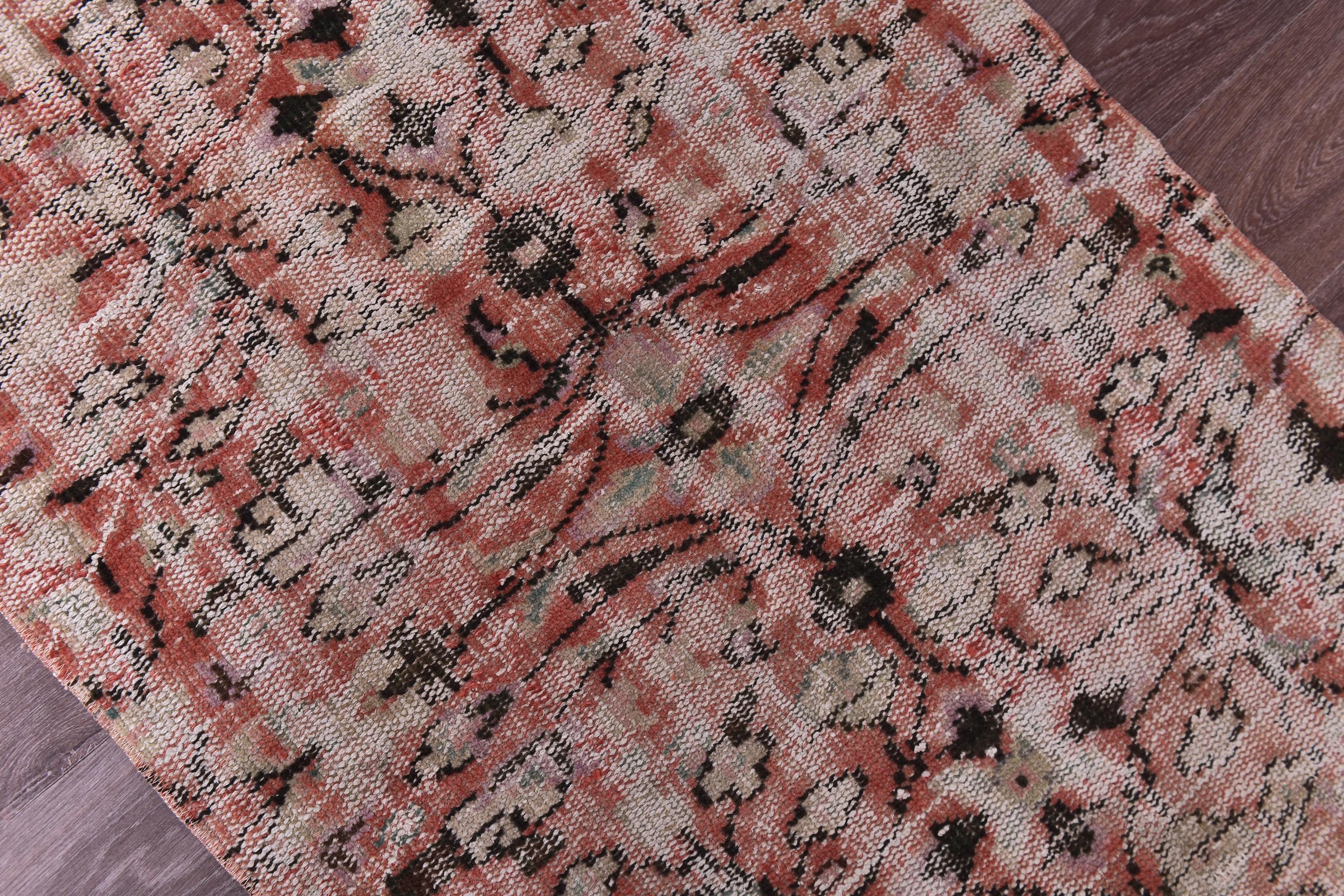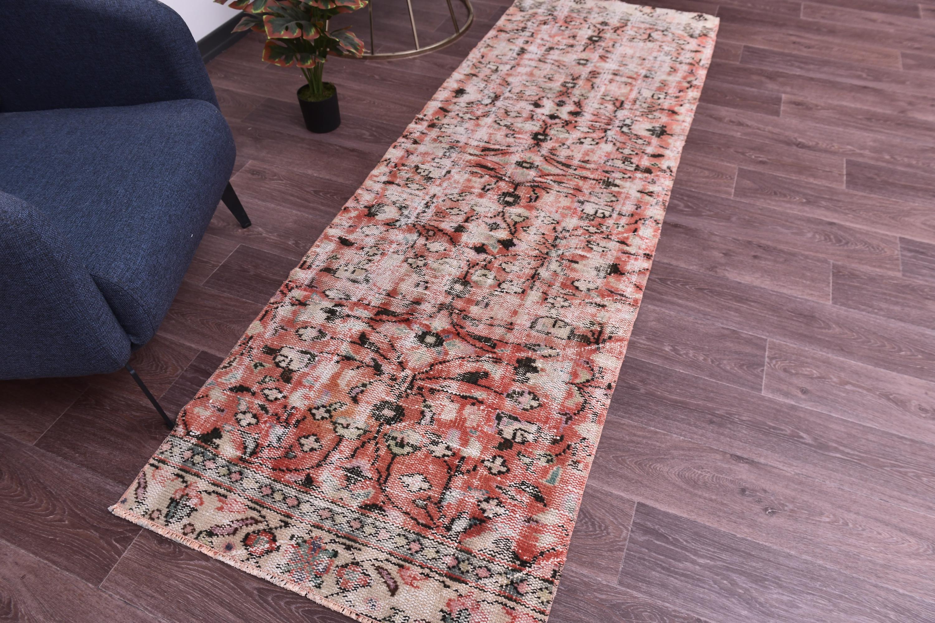 📜📌 Vintage Turkish runner rug featuring distressed coral pink and salmon orange botanical floral design, hand knotted wool construction with all-over faded pattern in beige, cream and charcoal accents, long narrow hallway carpet with authentic aged patina and low pile texture