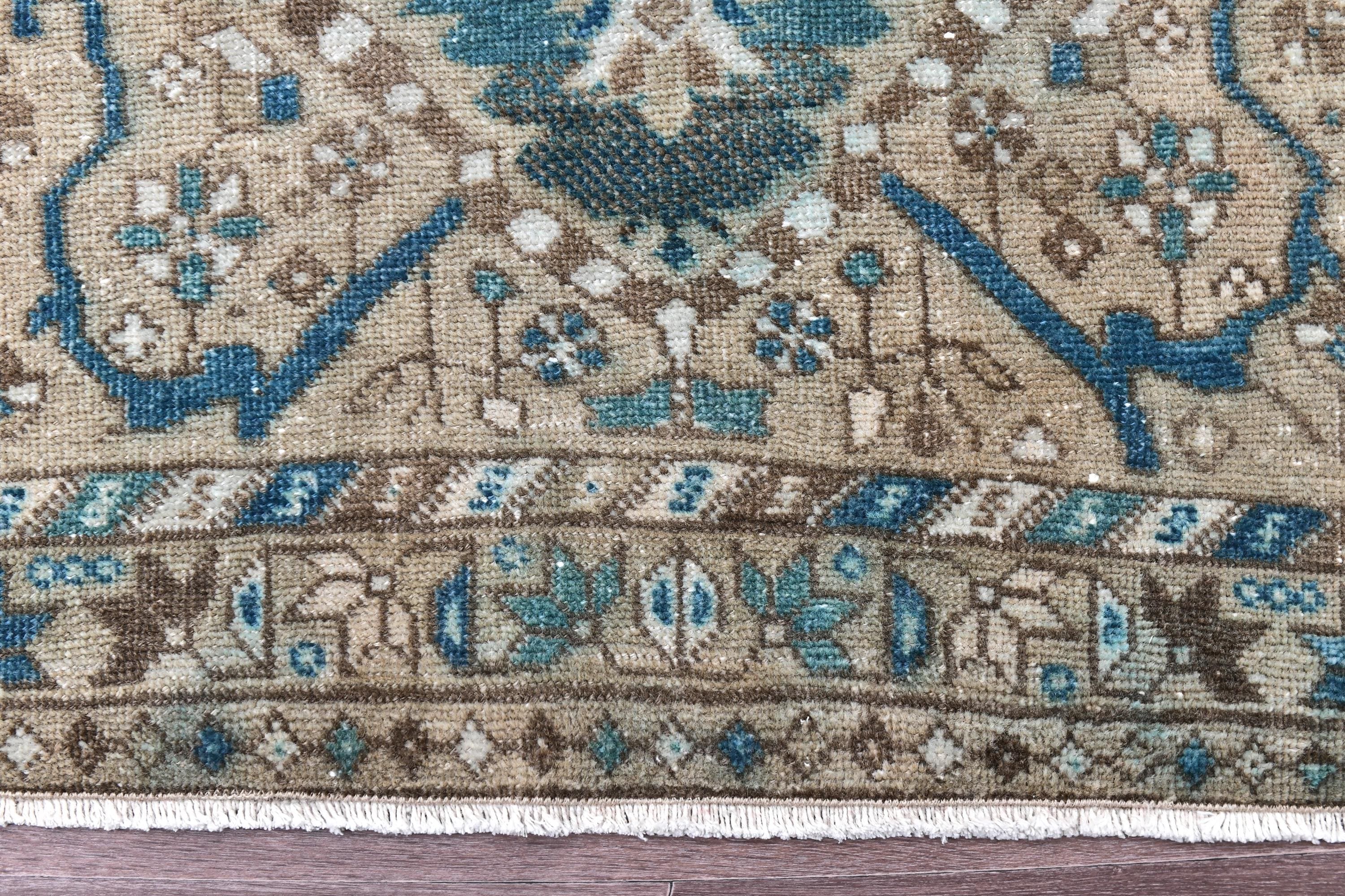 📜📌 Vintage Persian Heriz runner rug featuring turquoise blue medallion patterns on cream and beige background, hand knotted wool with distressed patina finish, traditional floral motifs and geometric border, displayed on gray wood floor