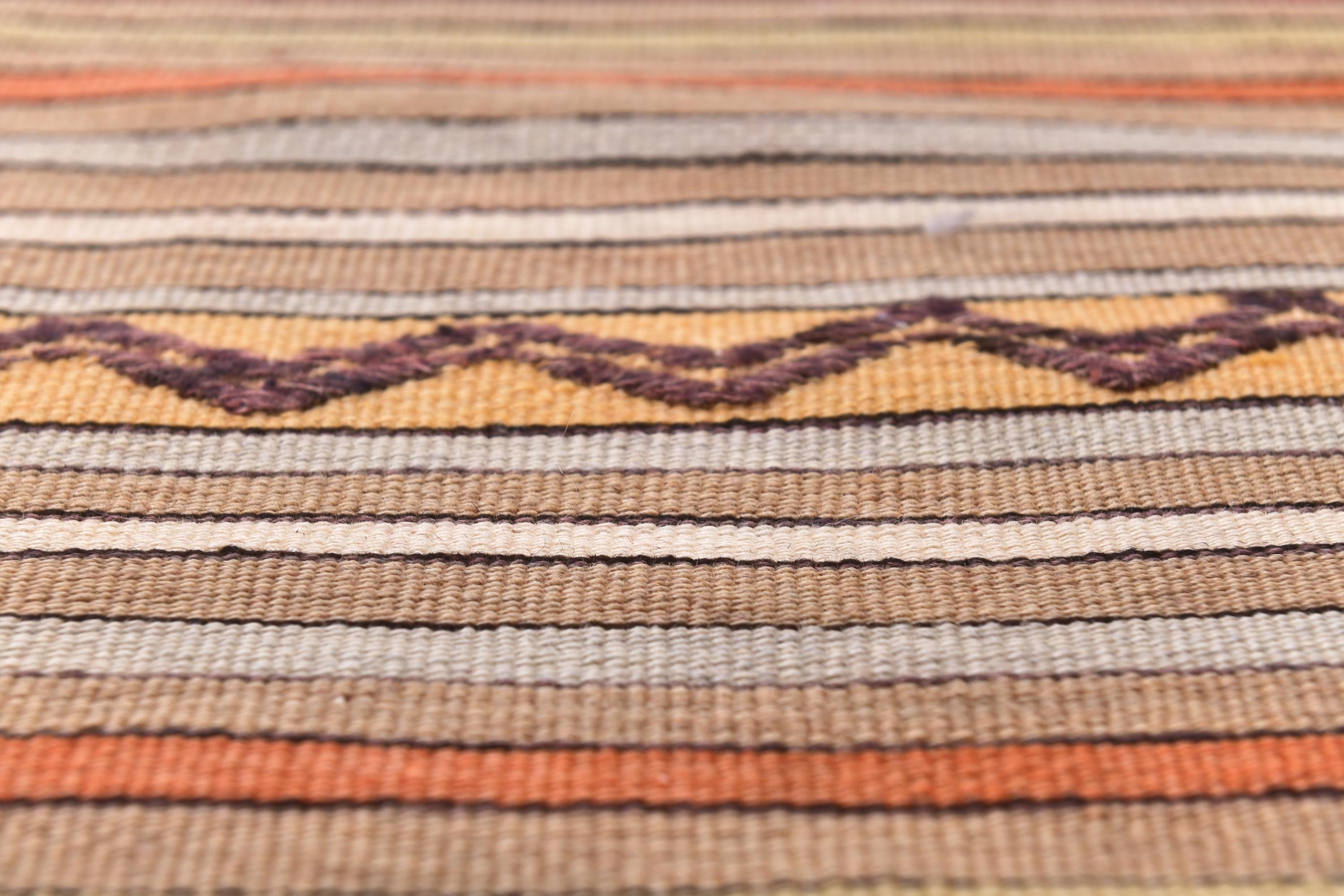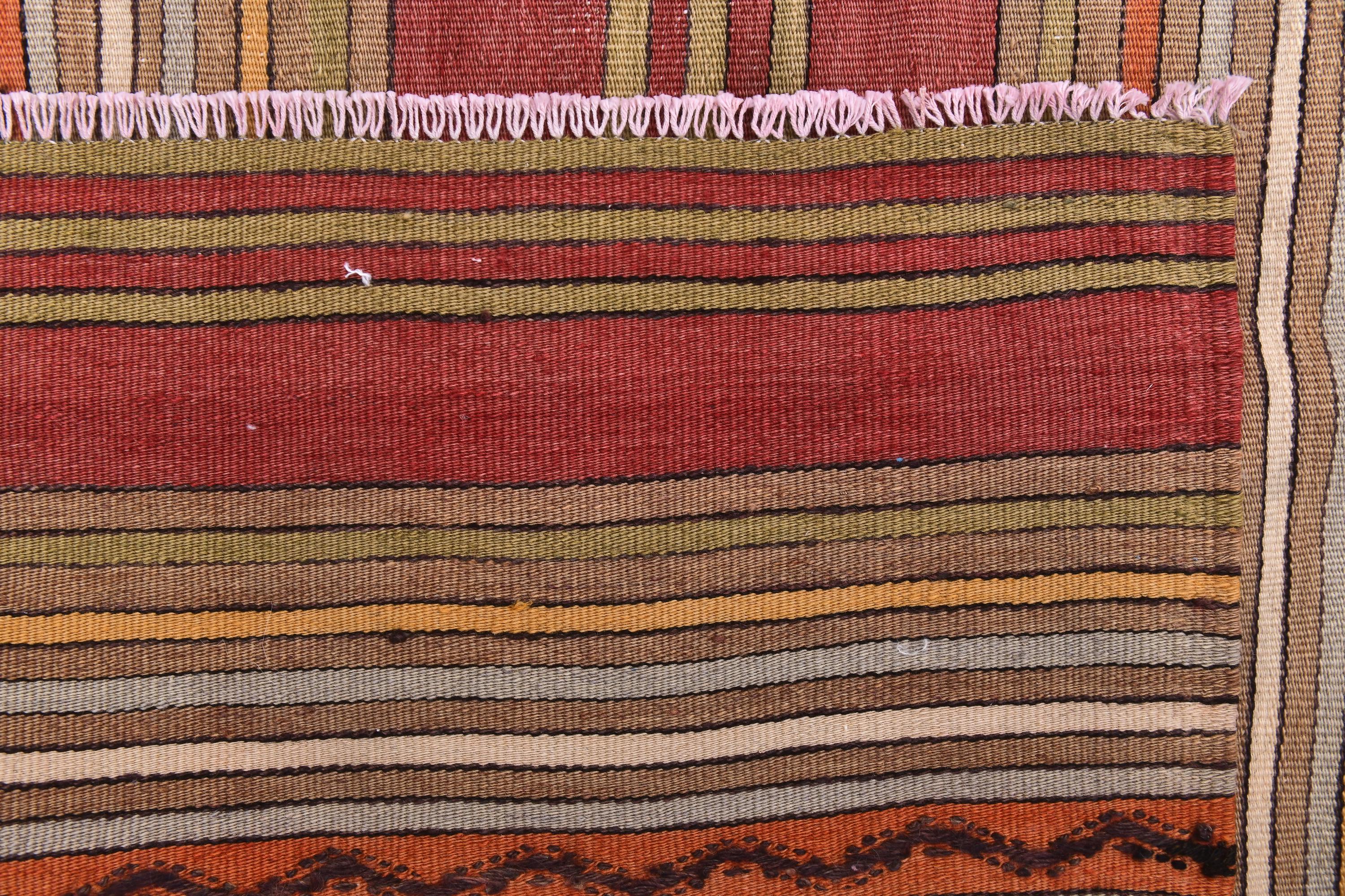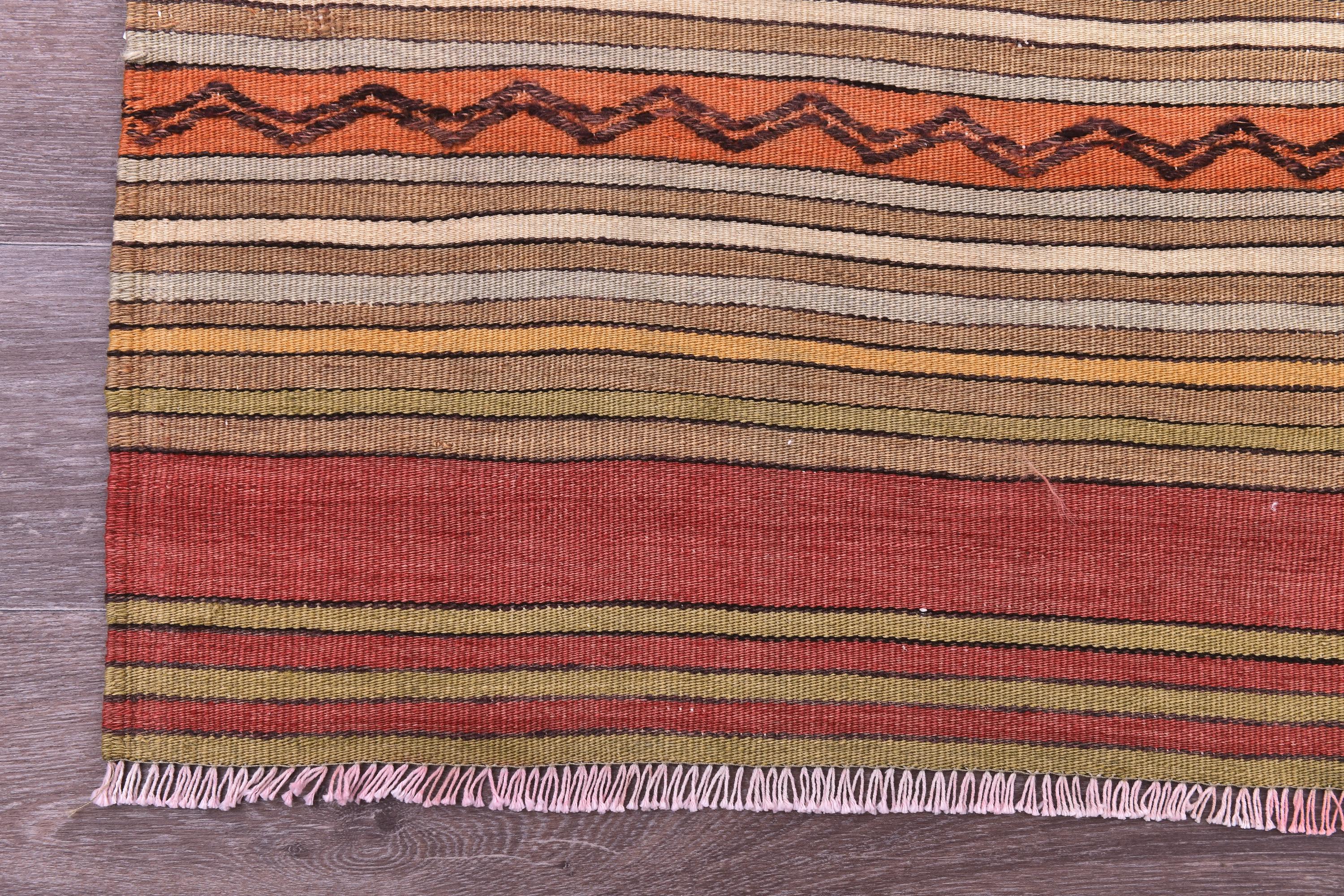 📜📌 Handwoven kilim flatweave area rug with bold striped pattern in warm earth tones including rust red, golden yellow, cream and orange, accented with traditional black diamond zigzag designs, authentic Turkish tribal textile with natural wool