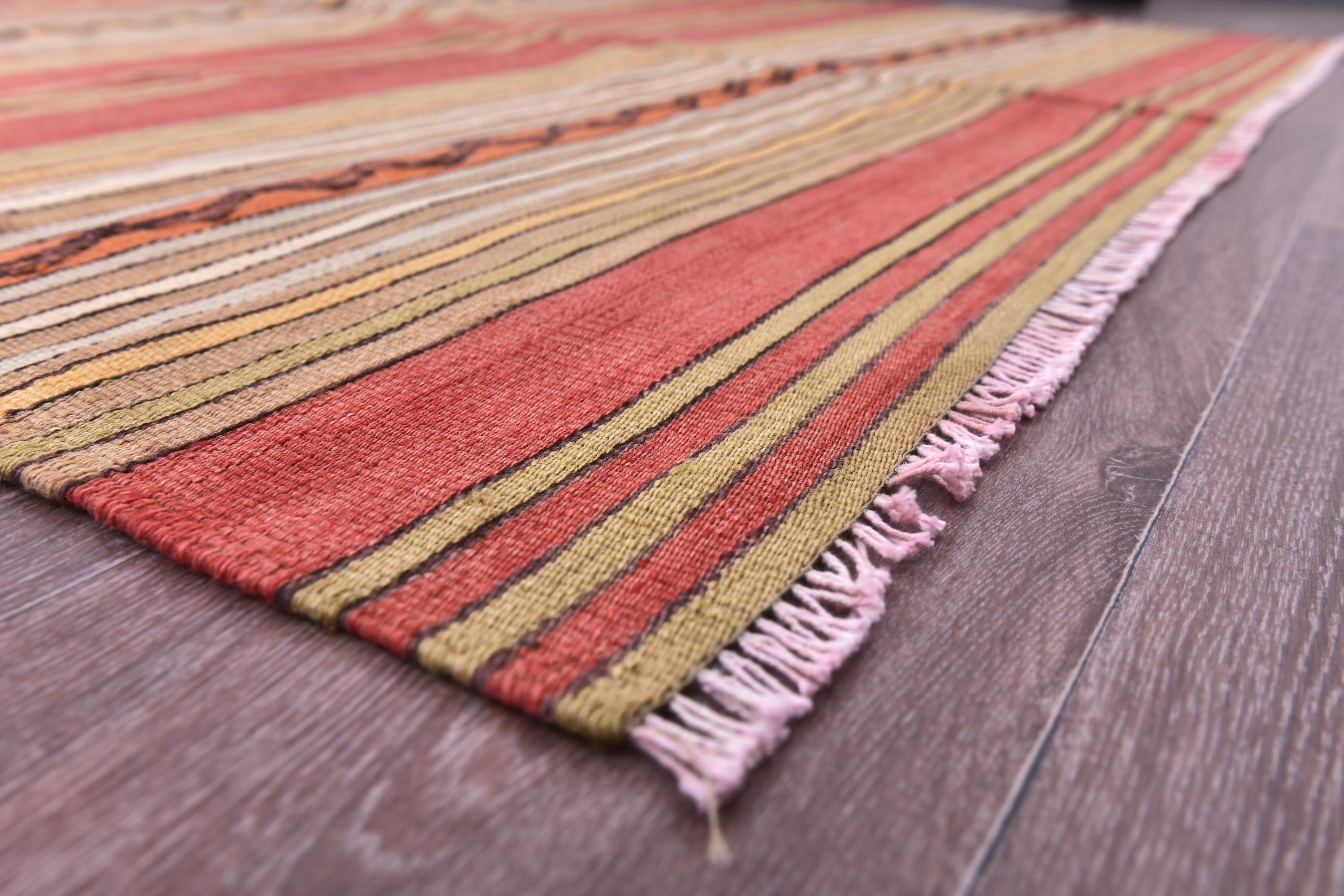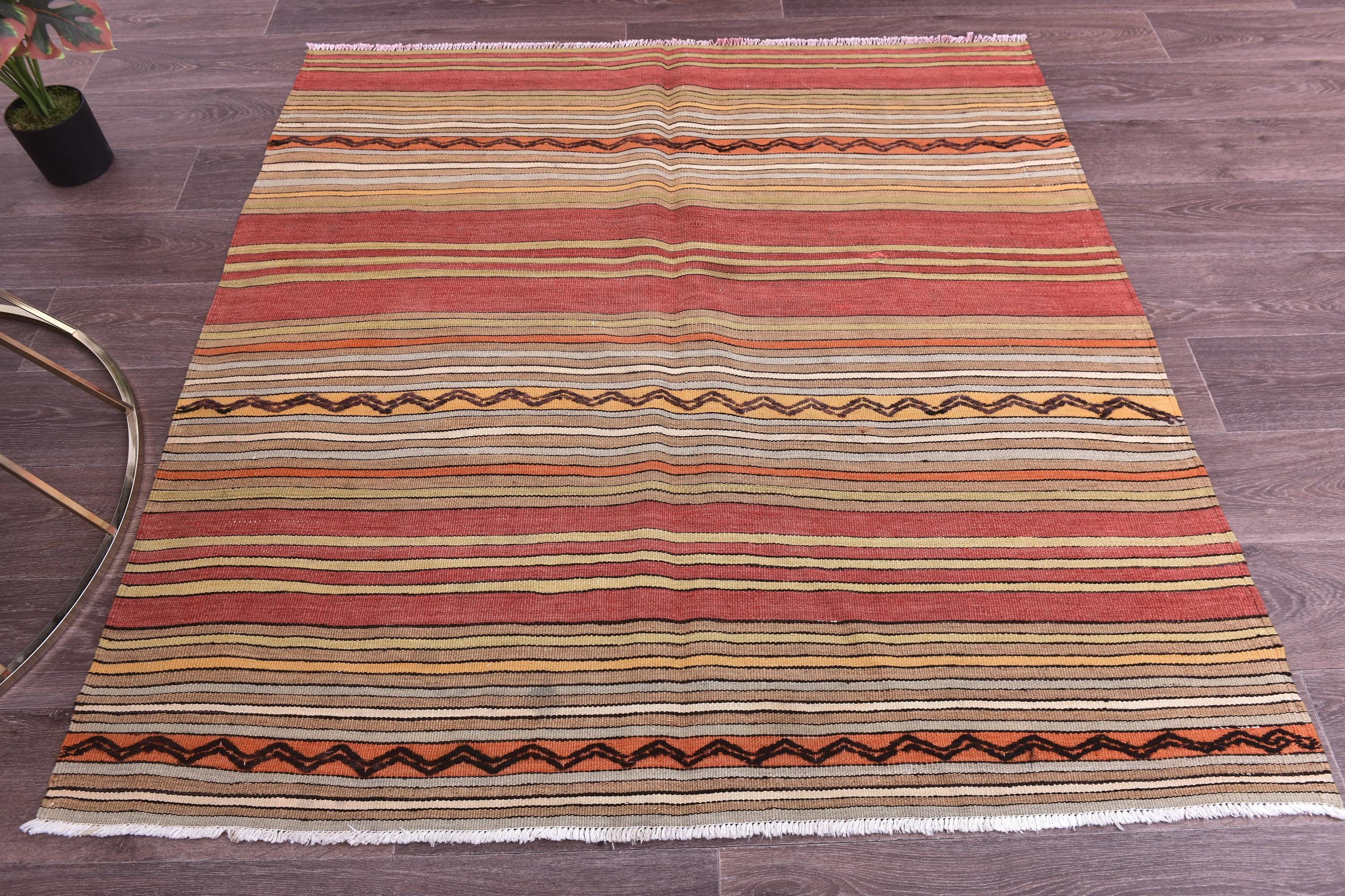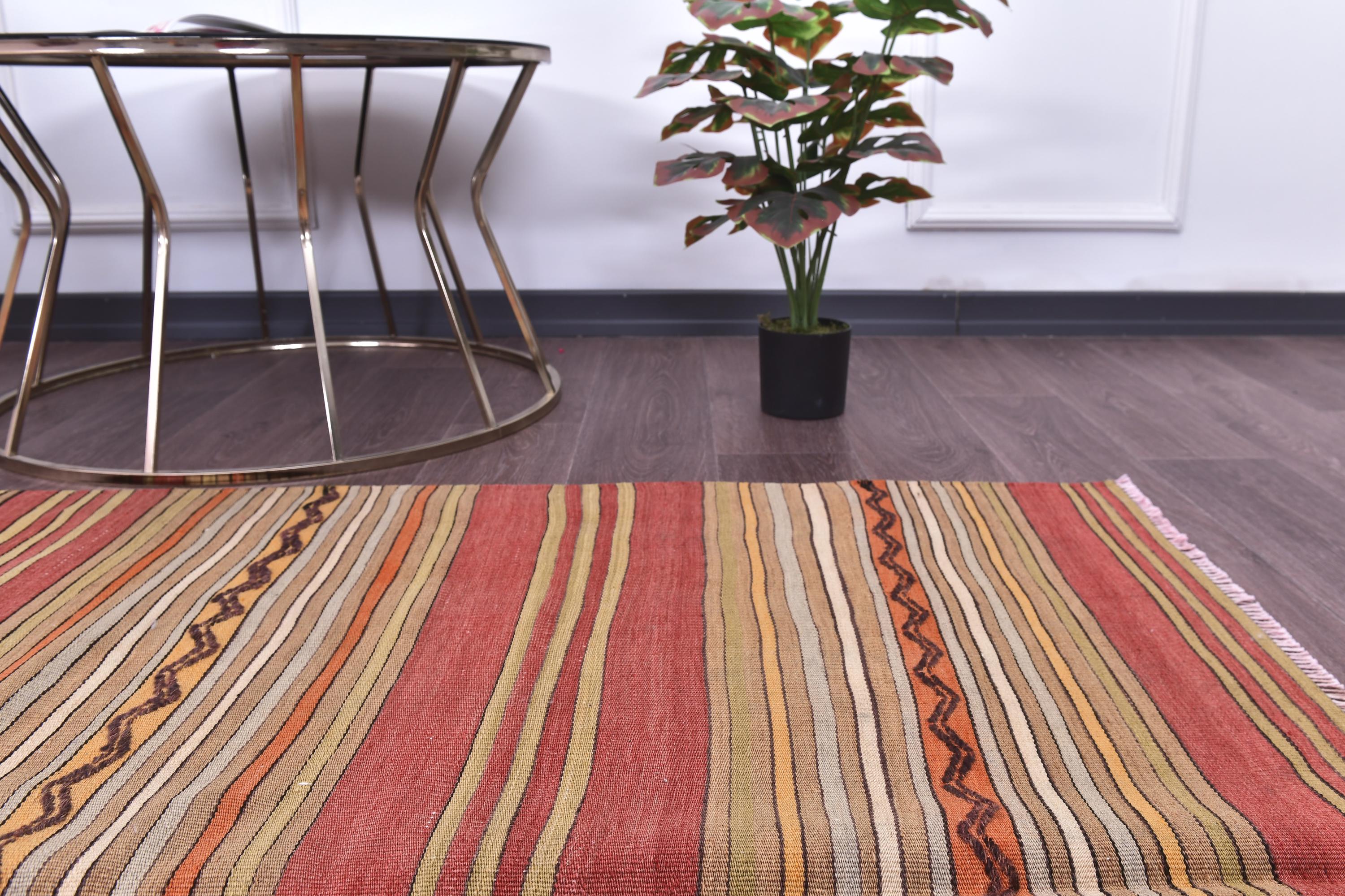 📜📌 Handwoven kilim flatweave area rug with bold striped pattern in warm earth tones including rust red, golden yellow, cream and orange, accented with traditional black diamond zigzag designs, authentic Turkish tribal textile with natural wool