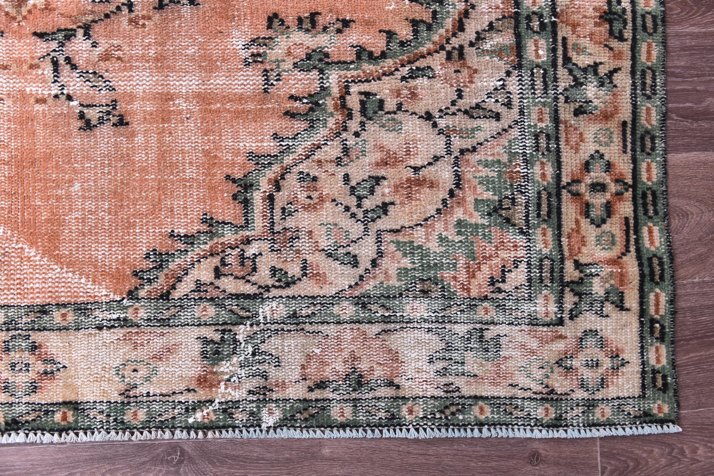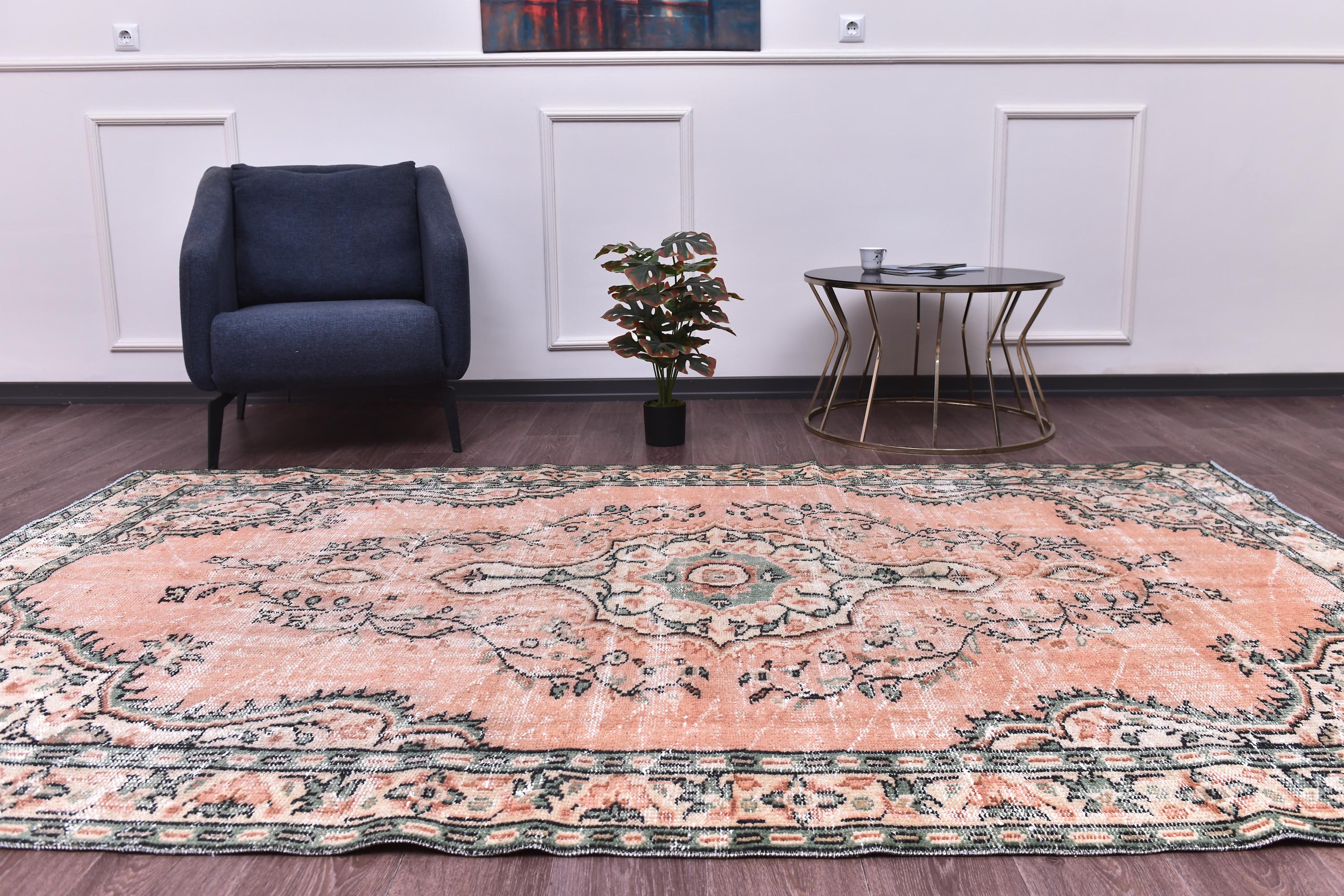 📜📌 Vintage Turkish area rug in soft peach coral and sage green colors featuring ornate floral medallion design with traditional botanical motifs, hand knotted wool with naturally distressed patina and low pile, ivory and cream border accents