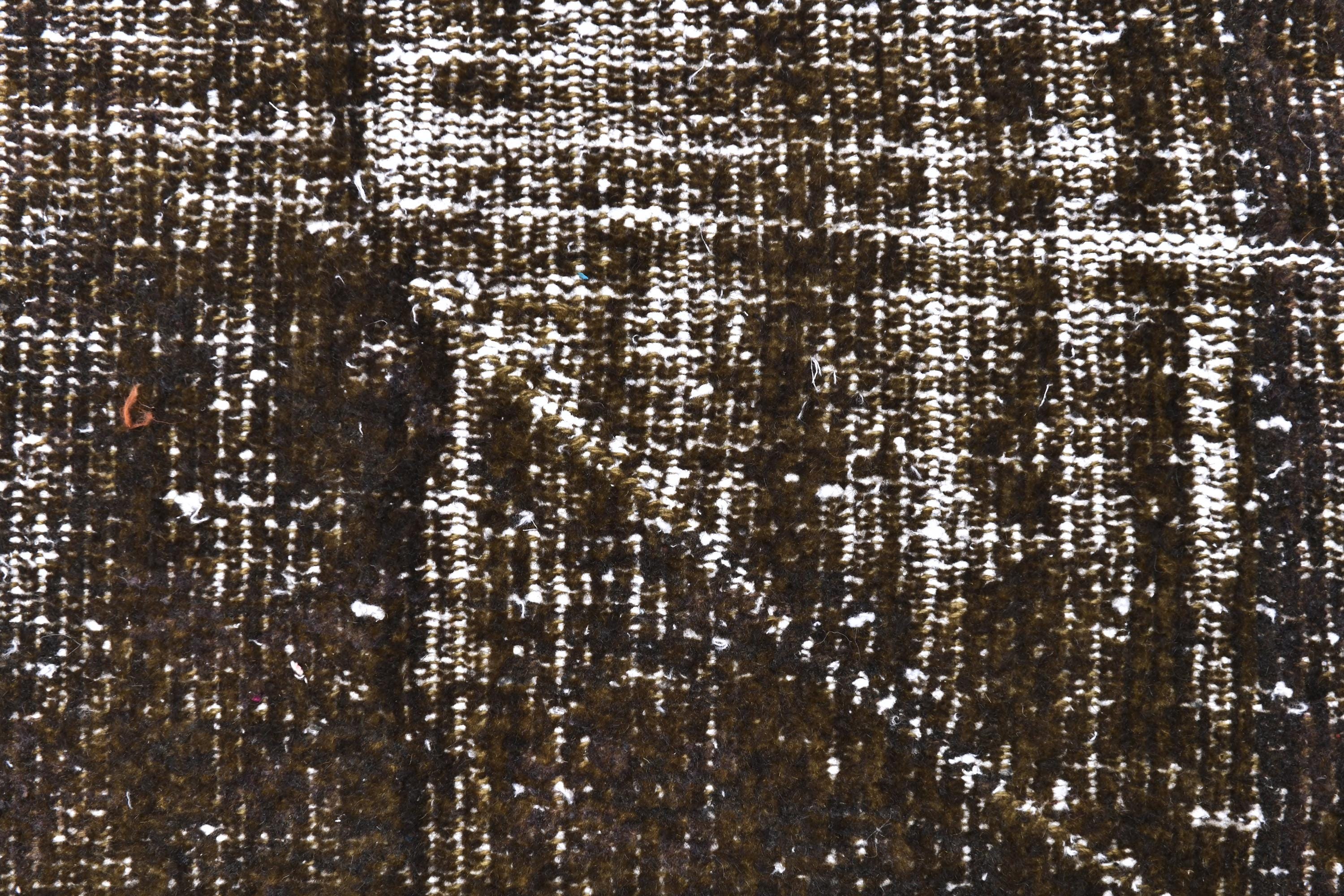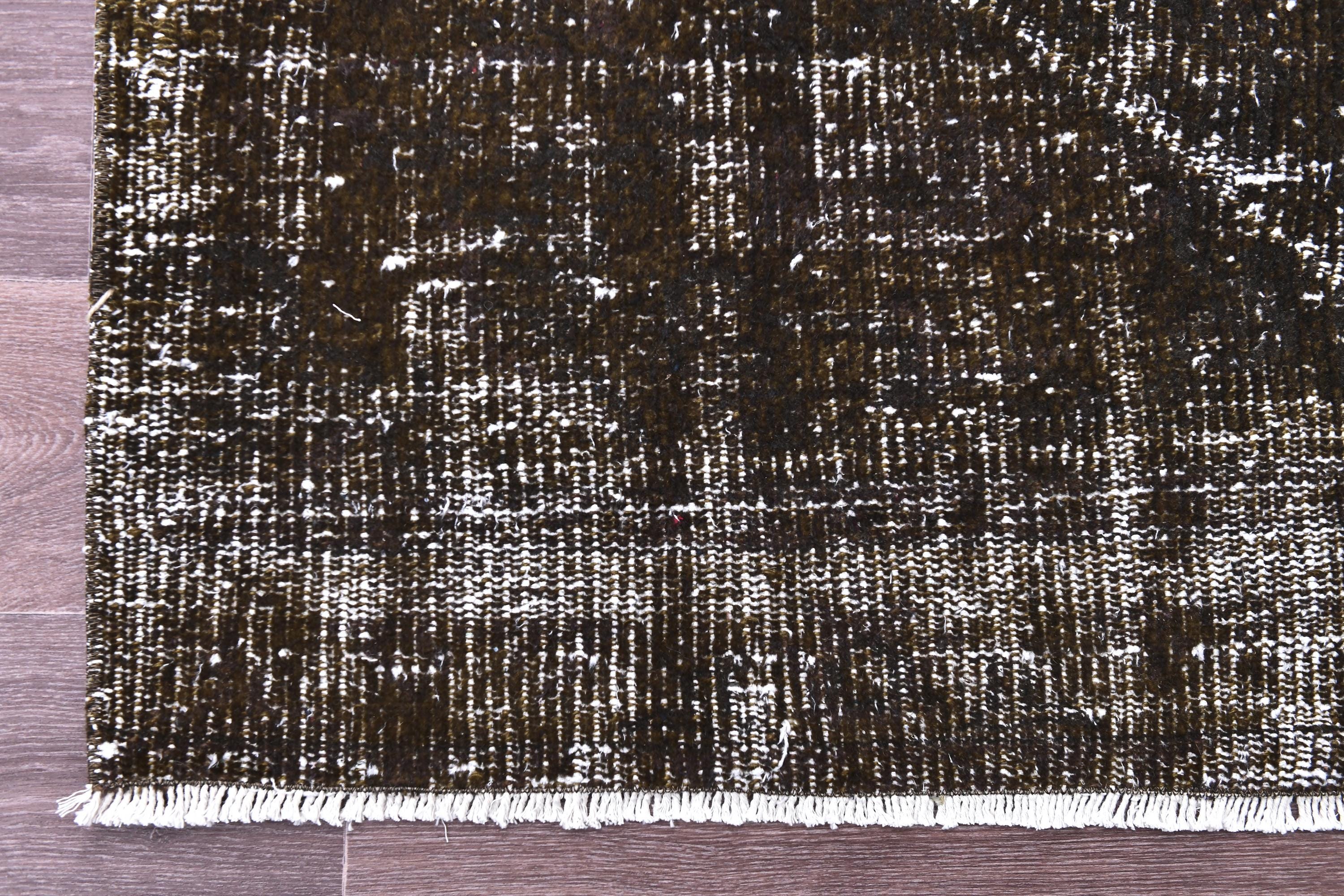 📜📌 Distressed dark green overdyed corridor runner carpet with vintage Oriental design elements and faded decorative patterns. This long narrow floor rug features a textured woven construction in earth tones of brown, taupe, and ivory with a bohemian aesthetic, showcasing traditional Turkish craftsmanship with modern overdyed treatment and natural fiber fringe trim.