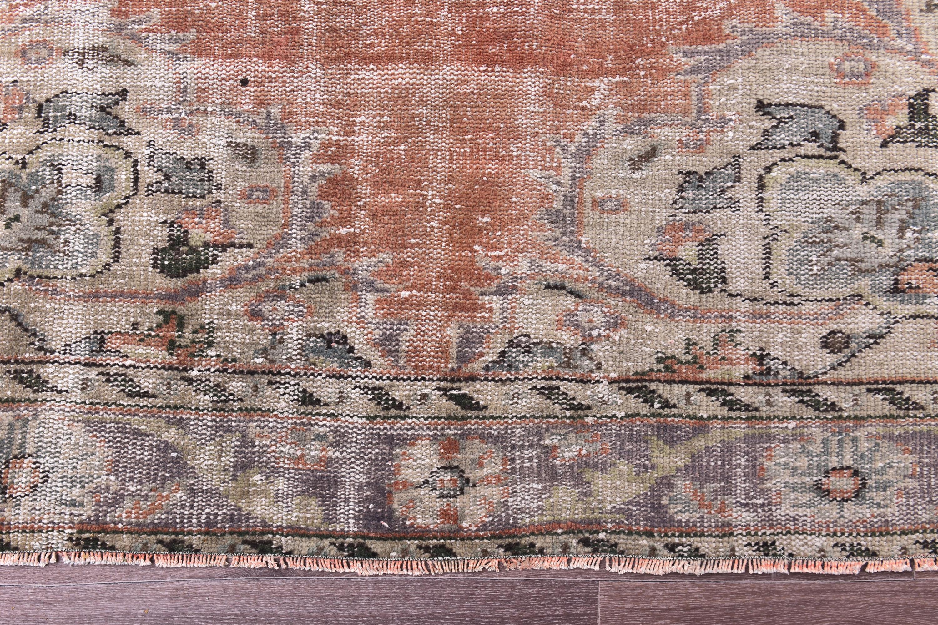 📜📌 Distressed Oushak rug in soft coral, terracotta, and cream colors with a large central medallion surrounded by delicate floral motifs. The hand-woven vintage Turkish carpet showcases a faded worn finish, intricate border designs with botanical elements, and a low pile wool construction. Features include natural color variations, shabby chic appeal, and authentic Anatolian craftsmanship with beige fringe edges.