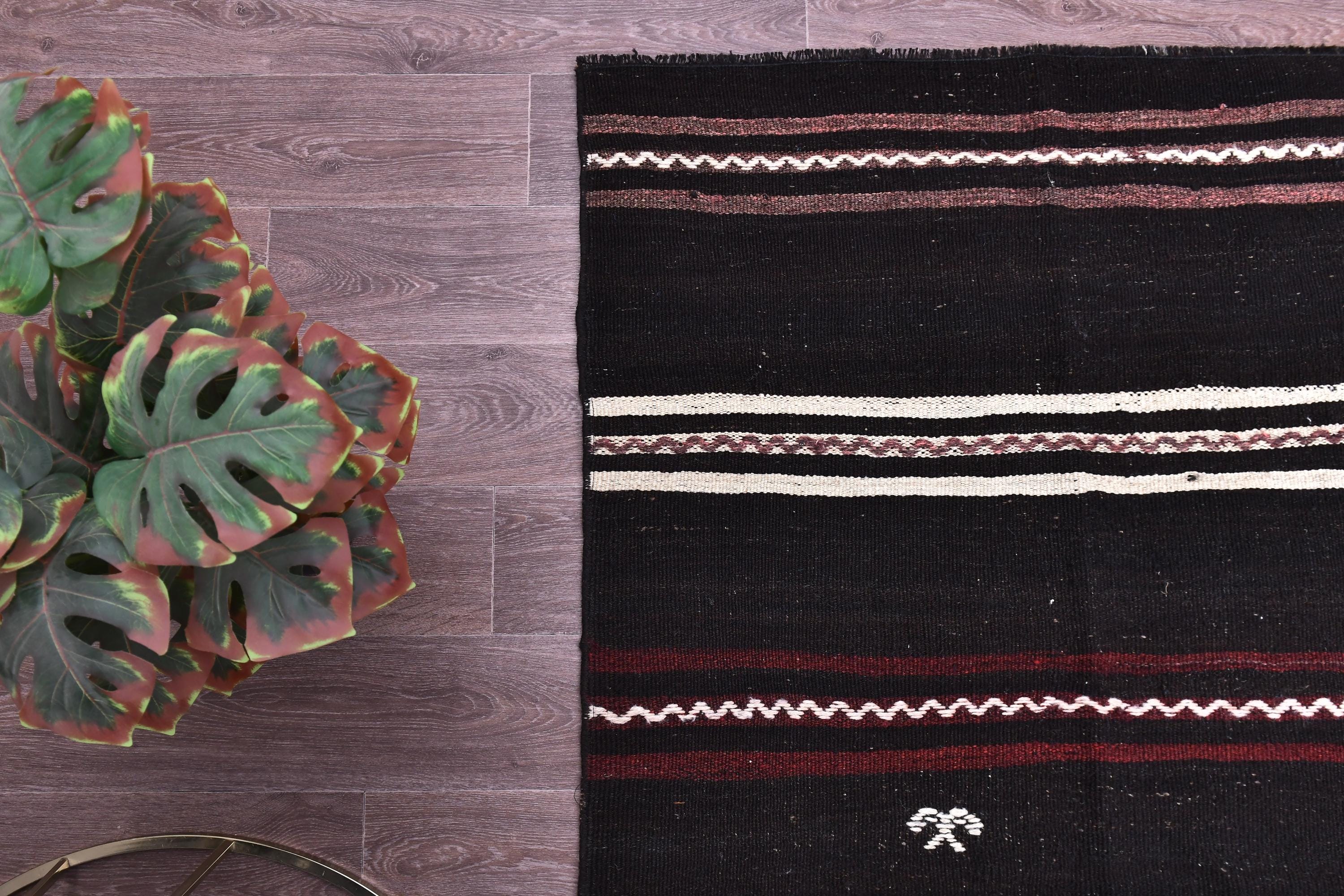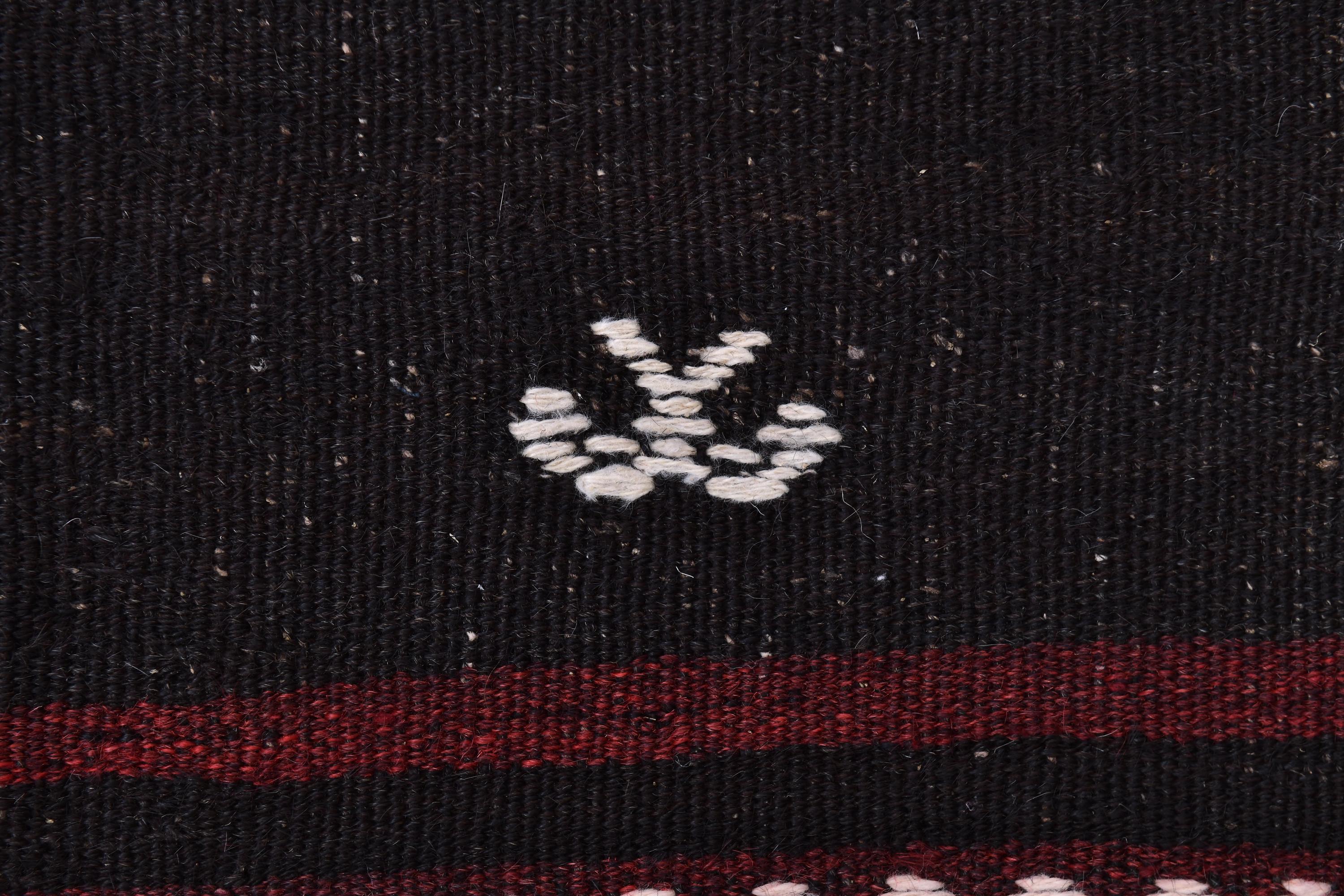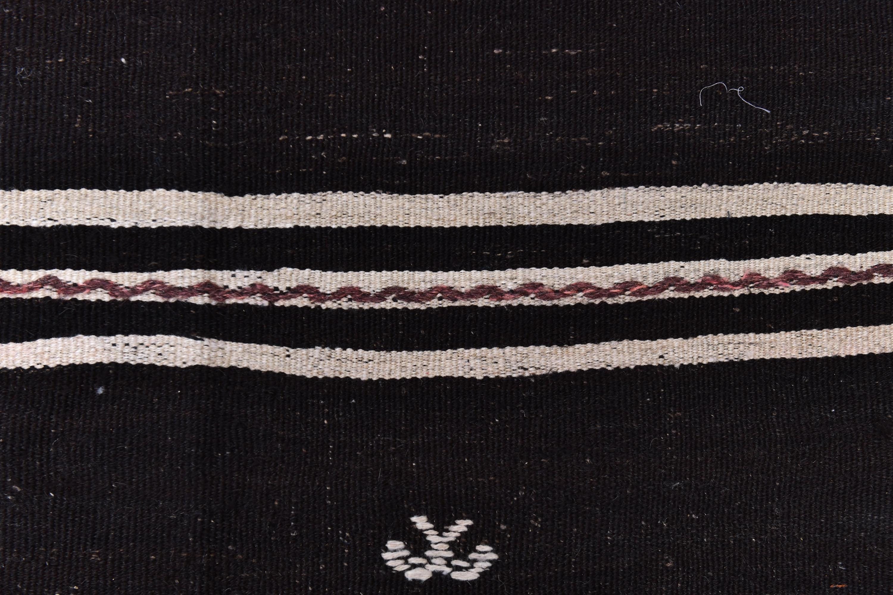 📜📌 Minimalist Turkish kilim rug featuring bold horizontal stripes on a solid black background with ivory white and burgundy red accents. This handwoven flat-weave wool carpet displays clean linear patterns with wavy decorative lines and a small white geometric motif in the center. The modern design combines traditional craftsmanship with contemporary aesthetic, finished with natural black fringe edges.