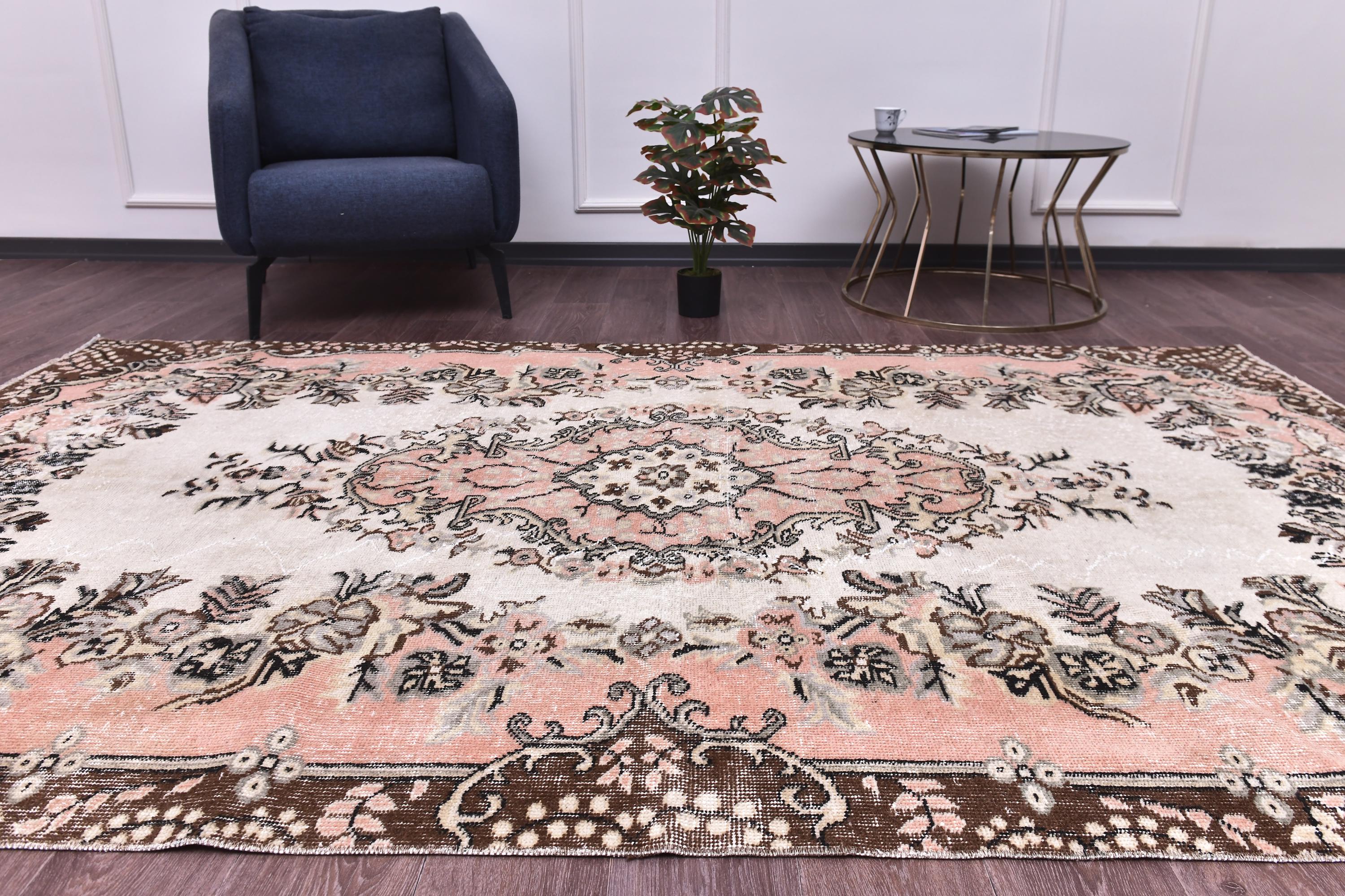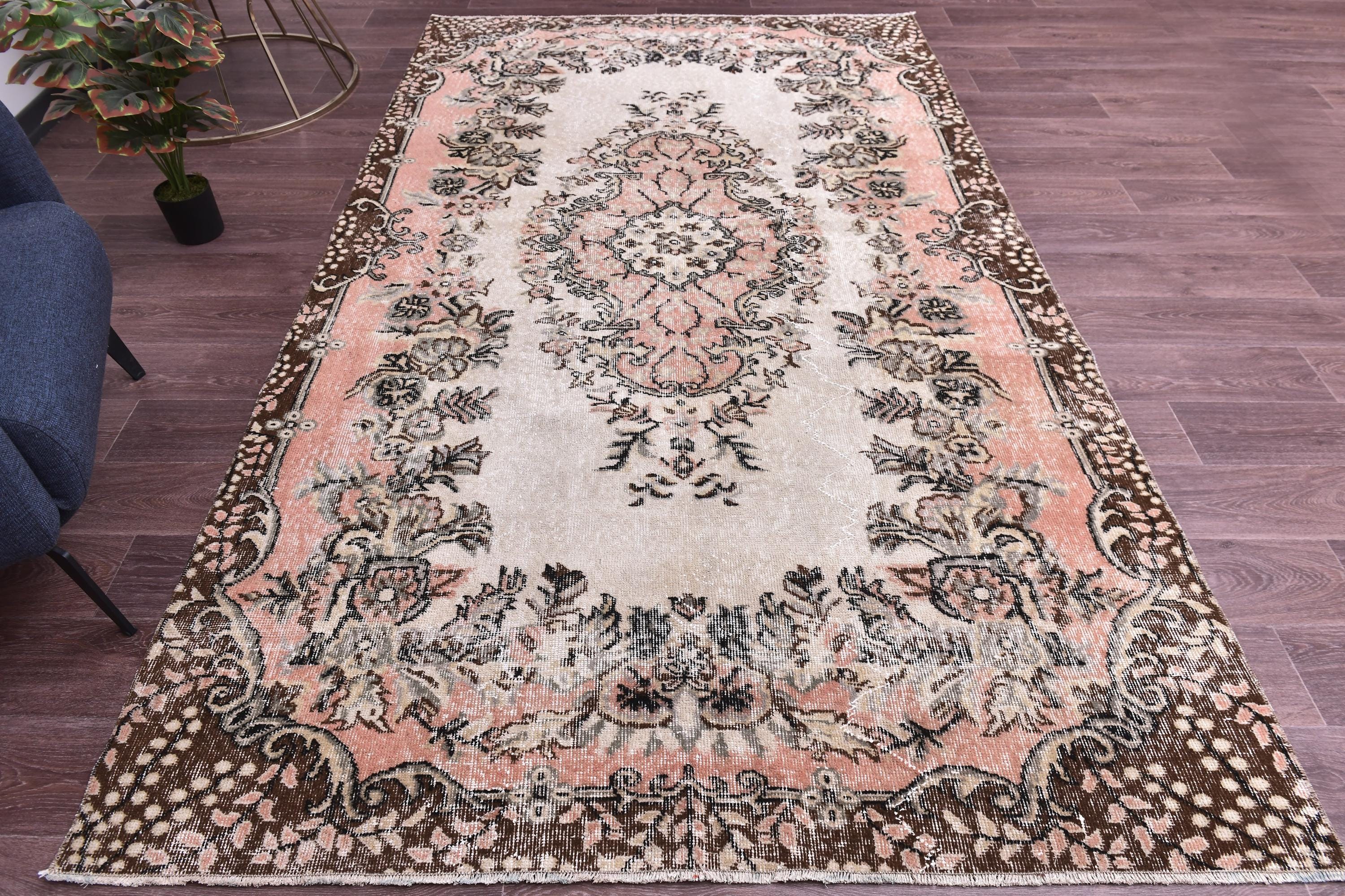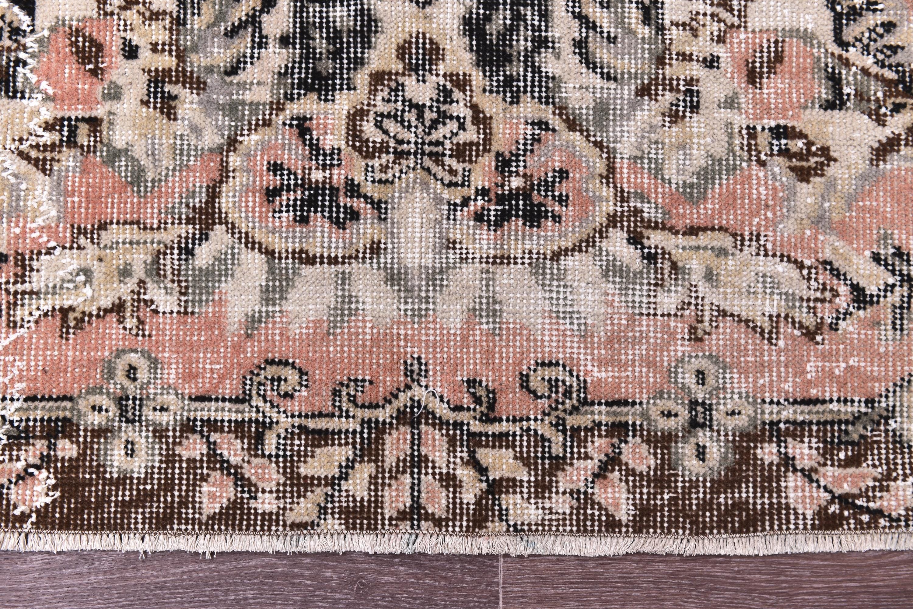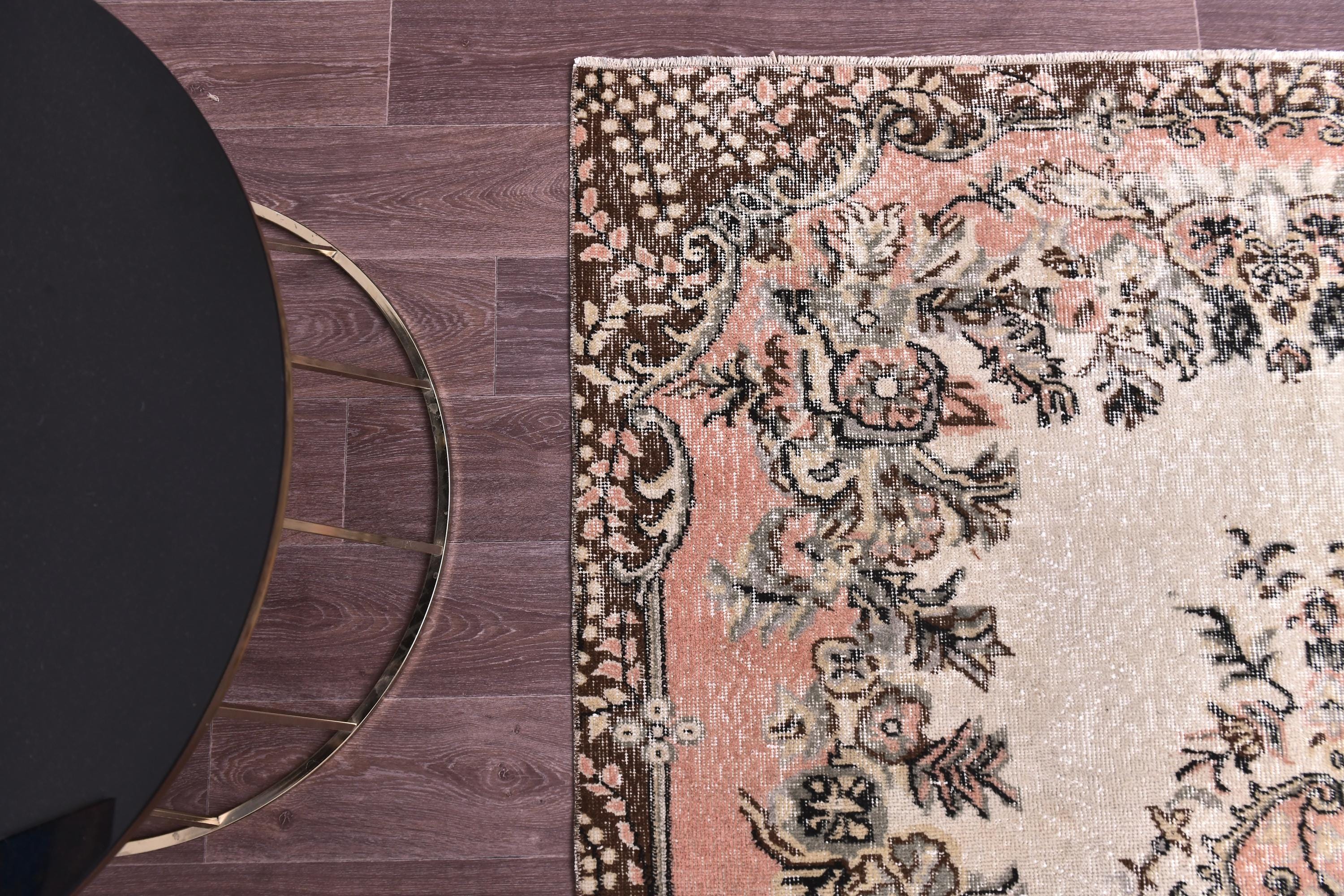 📜📌 Vintage Turkish area rug featuring a soft ivory center field with an ornate floral medallion surrounded by faded coral pink borders and chocolate brown geometric outer borders. This distressed hand-knotted wool carpet showcases intricate botanical scrollwork, delicate vine patterns, and traditional Persian-style corner spandrels in muted pink, cream, charcoal, and beige tones with authentic weathered patina and low pile texture.