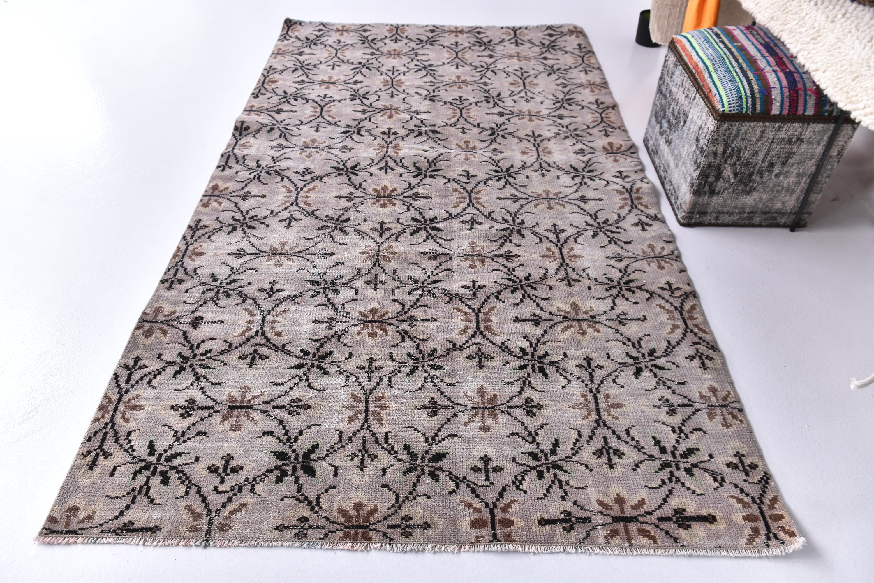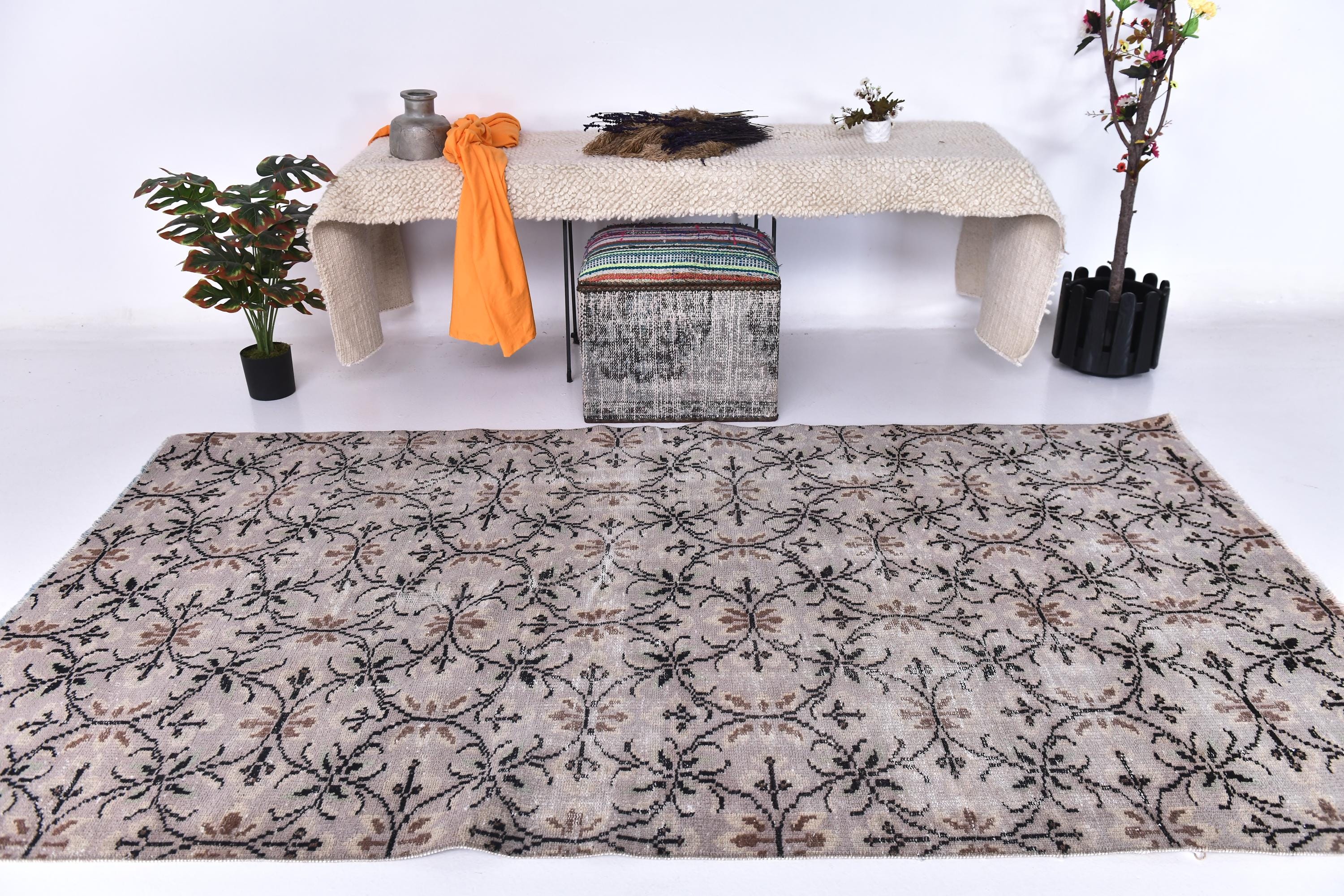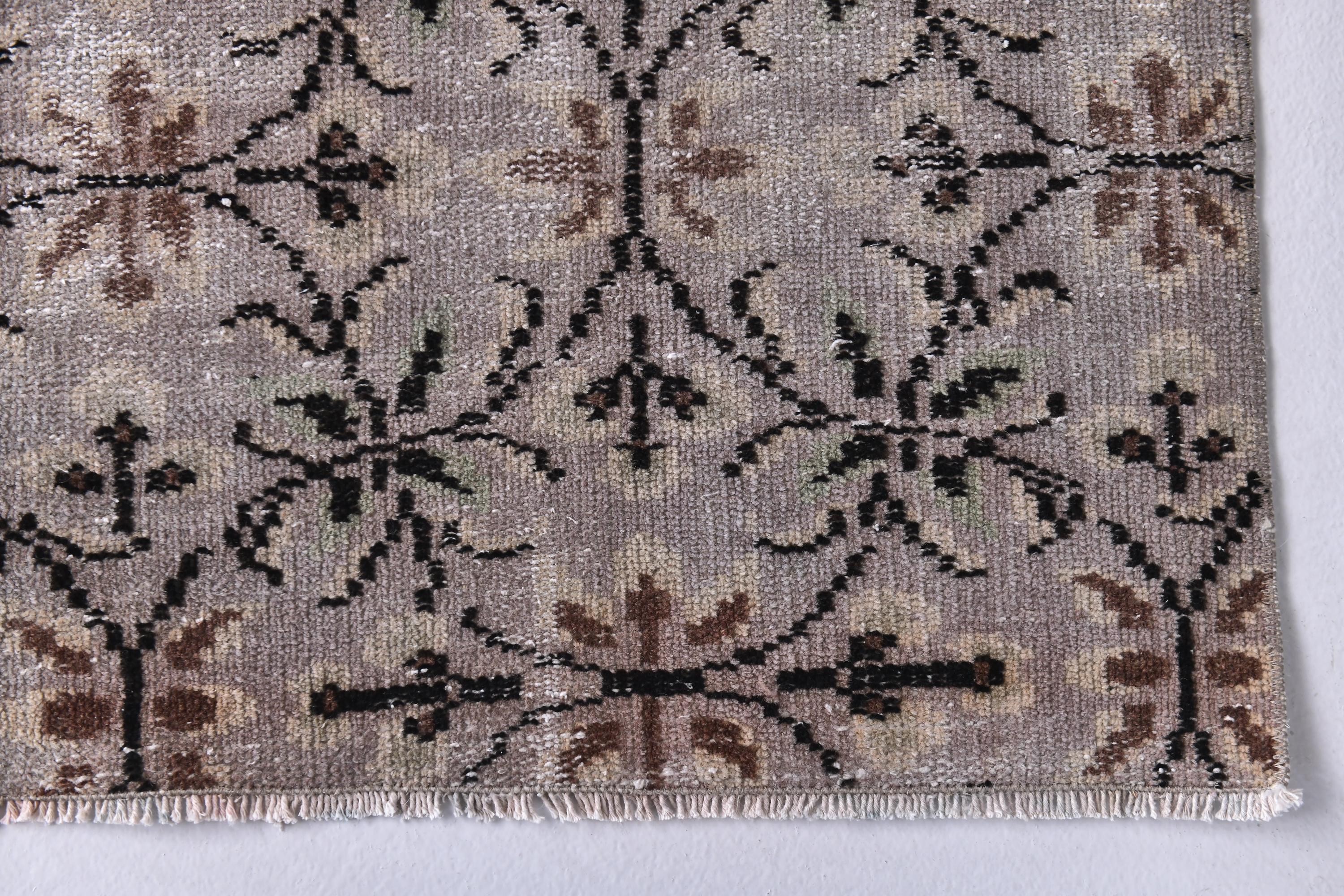 📜📌 Vintage overdyed Turkish area rug in muted gray, beige, and black tones with all-over floral botanical pattern. Hand-knotted wool Oushak carpet featuring delicate vine and flower motifs in a distressed finish. Perfect bohemian statement piece for living room or bedroom with soft neutral colors.