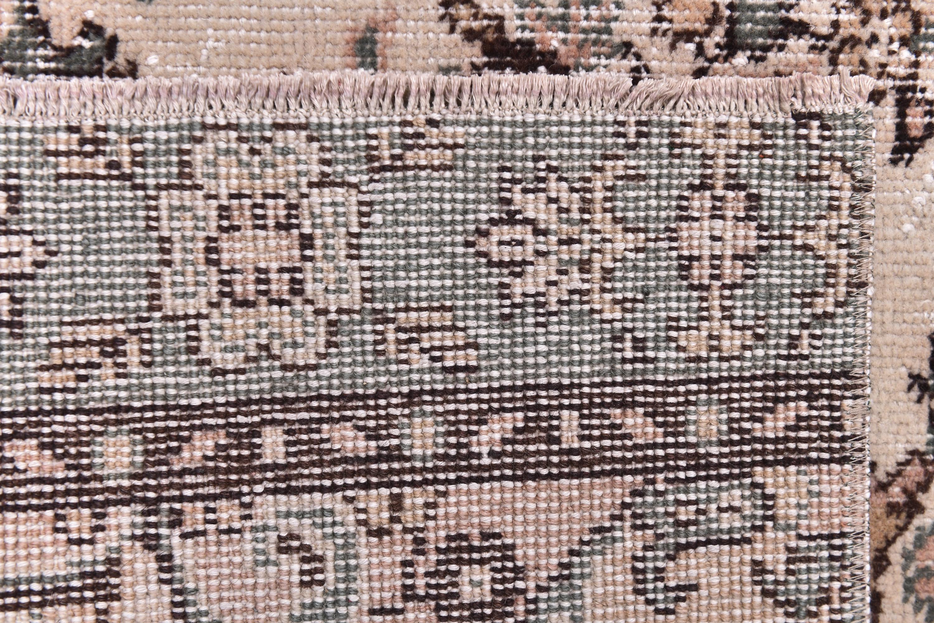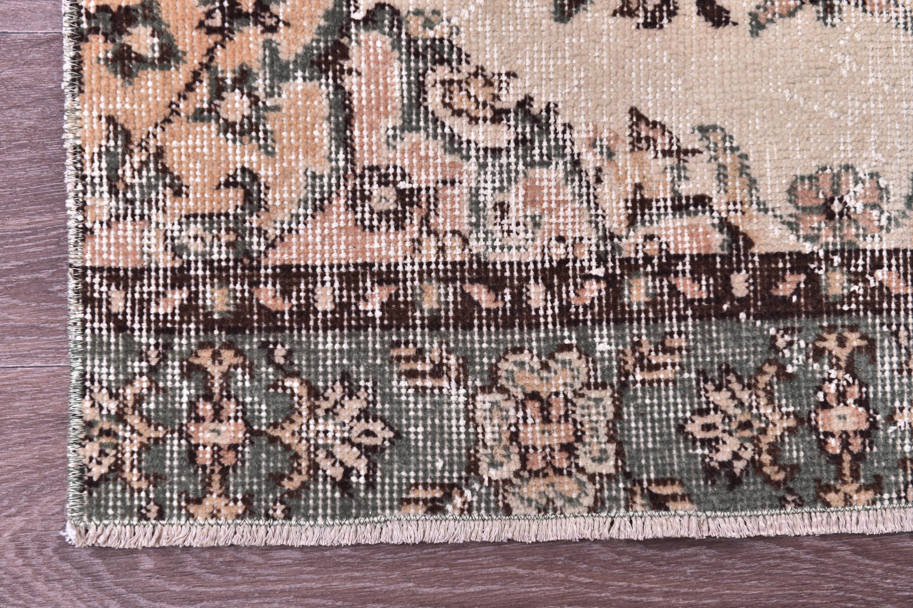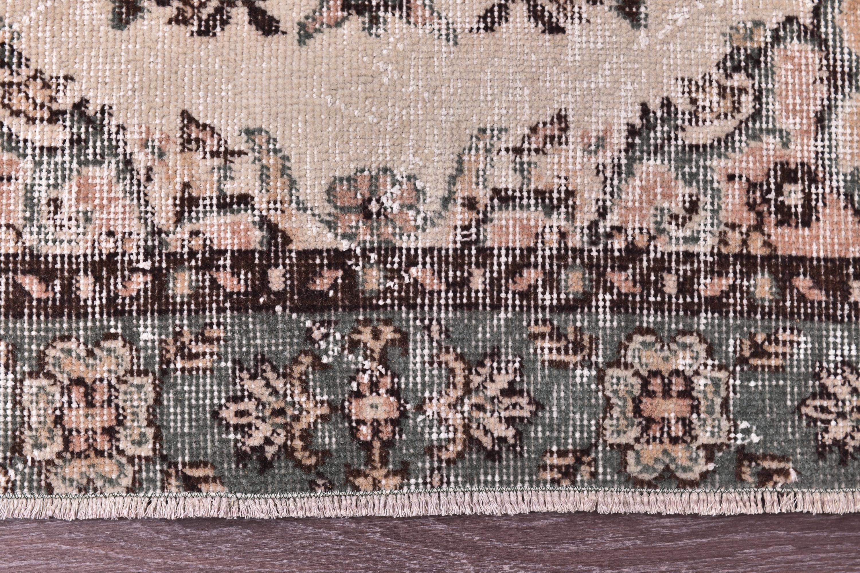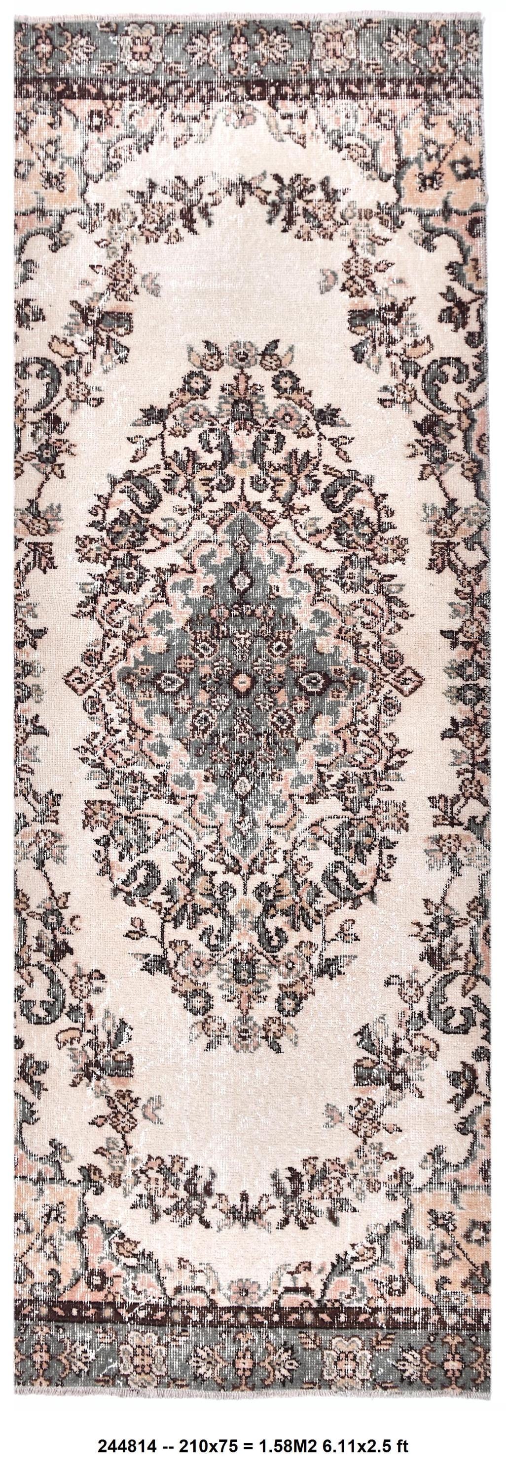 📜📌 Antique hand-woven Turkish runner rug in soft neutral tones of cream, beige, pink, and muted teal. Features classic Oushak medallion design with elaborate floral motifs, decorative borders, and worn vintage appearance. Narrow wool carpet ideal for entryways, hallways, or beside bed with timeless elegance.