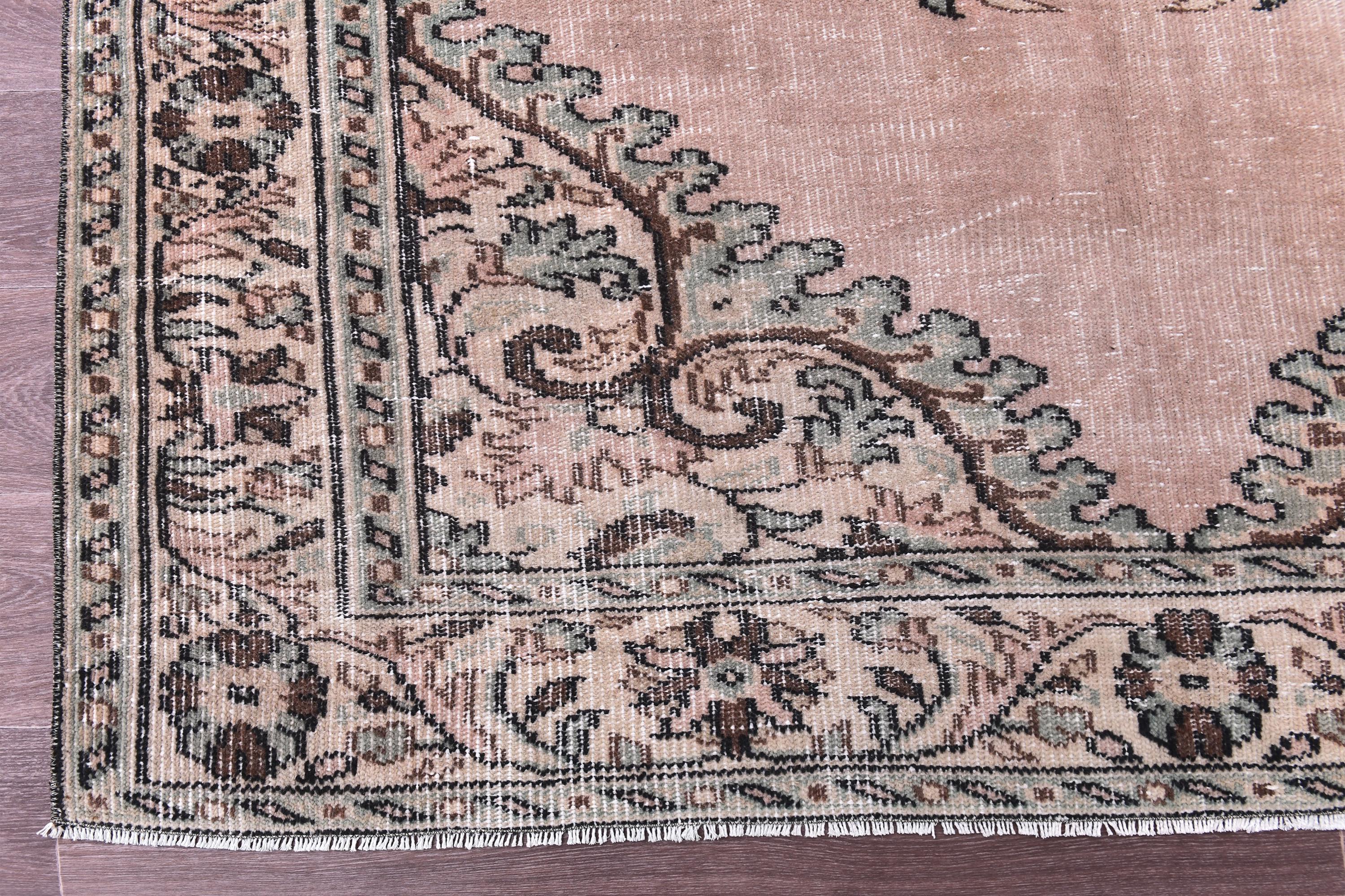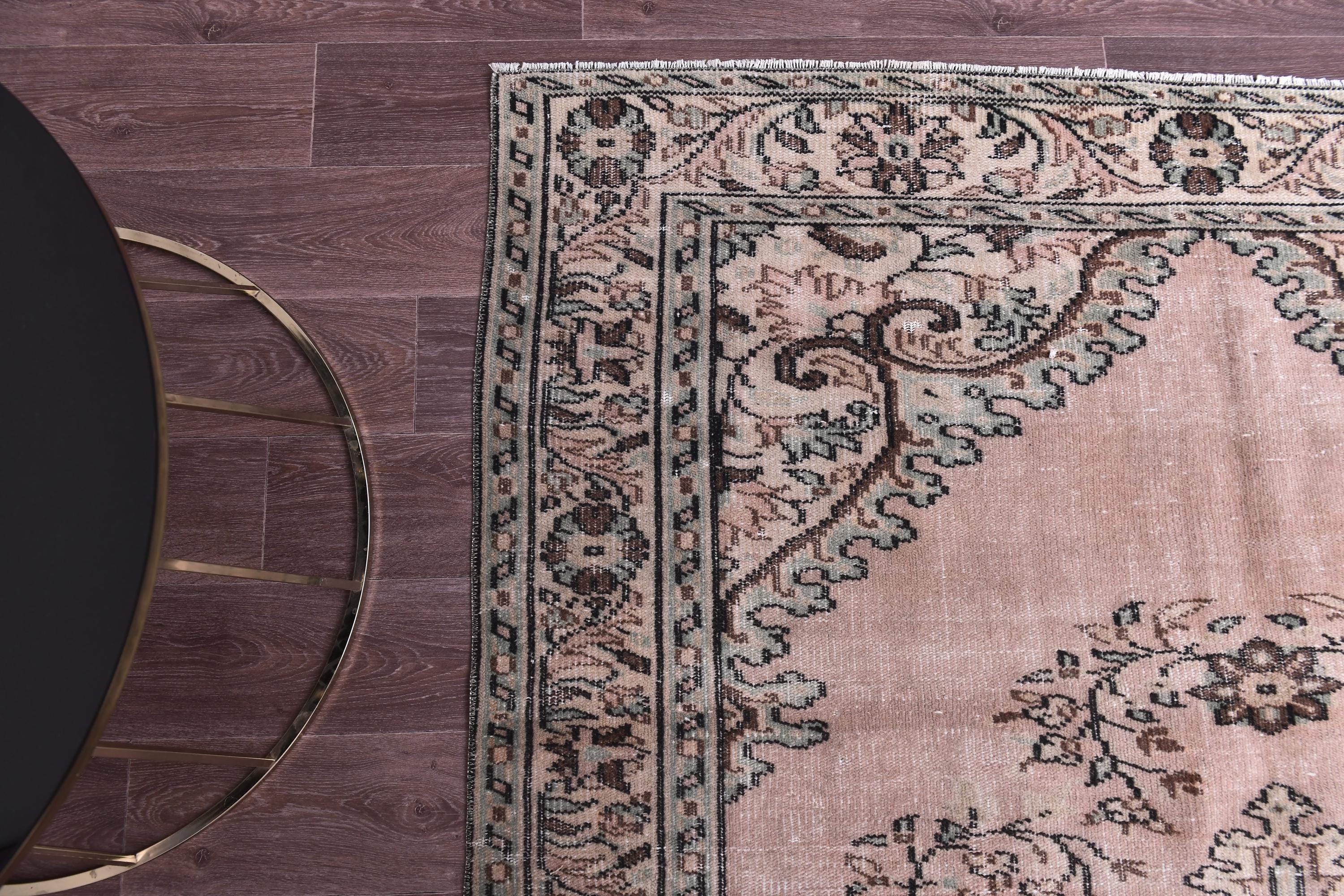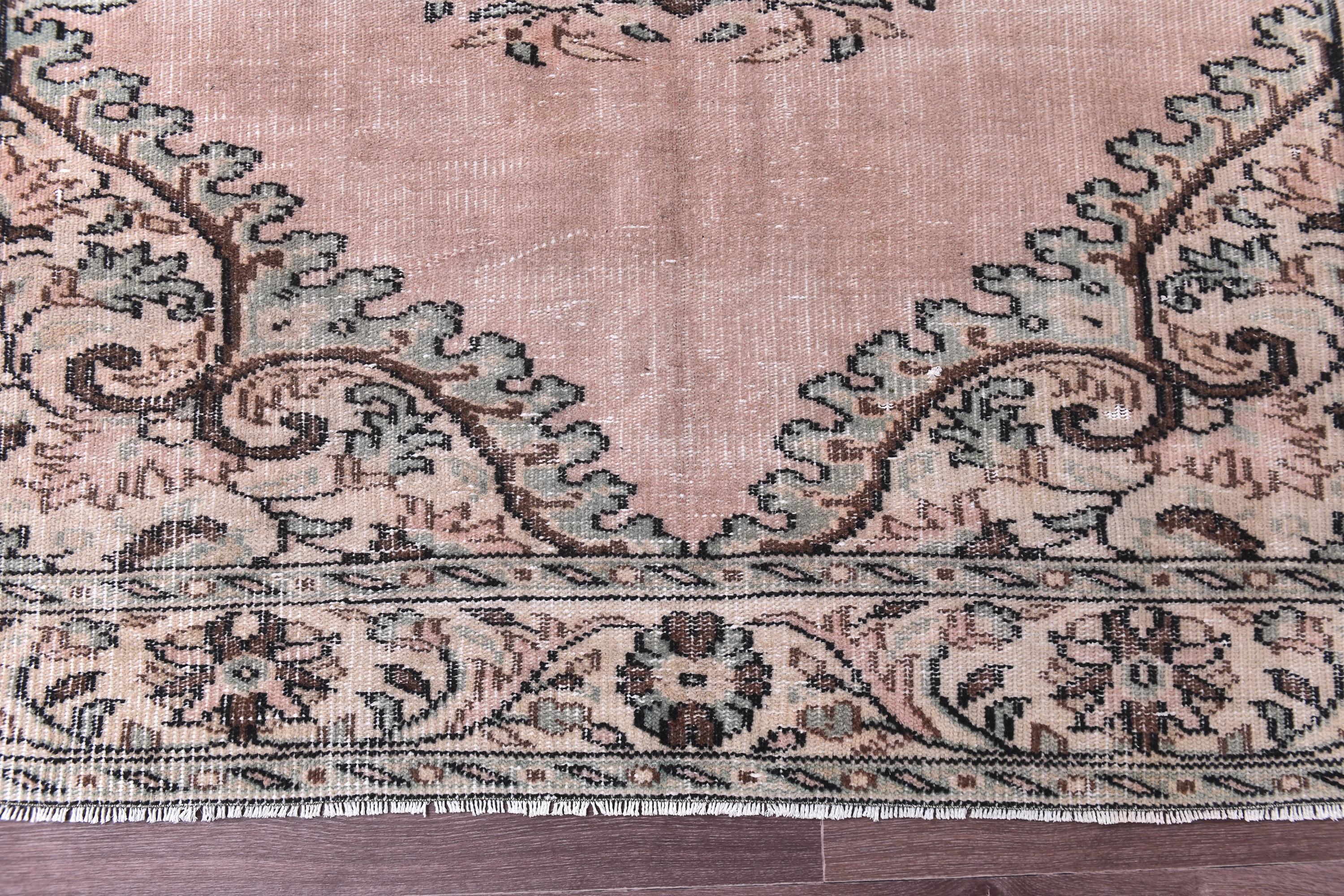 📜📌 Authentic vintage Turkish rug in pale blush pink with traditional Oushak-style medallion pattern. Showcases intricate floral and botanical designs with ornamental scrolling borders in muted sage, taupe, and cream colors. Distressed hand-woven wool with naturally faded appearance adds vintage charm and character. The soft pink palette and elegant classical design make this piece ideal for romantic, shabby chic, French country, or modern feminine interiors.