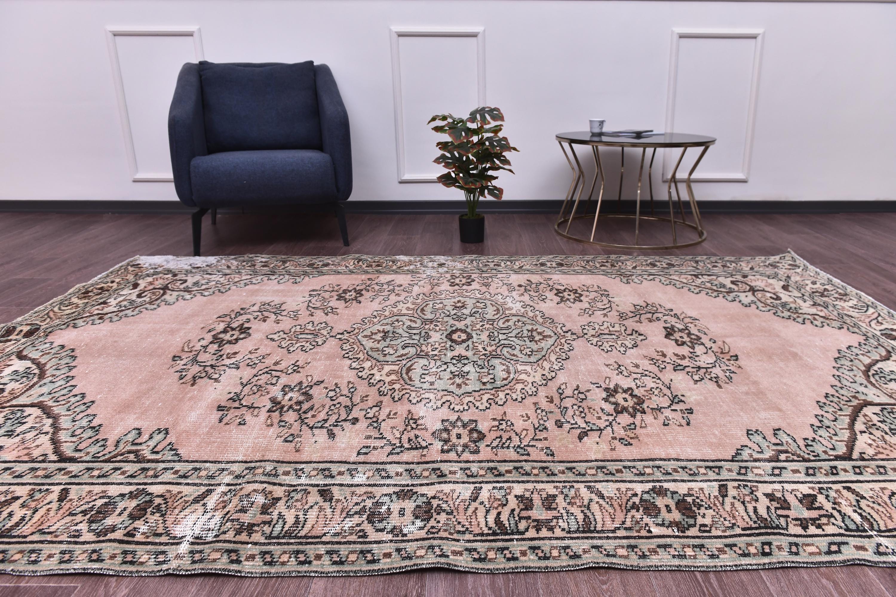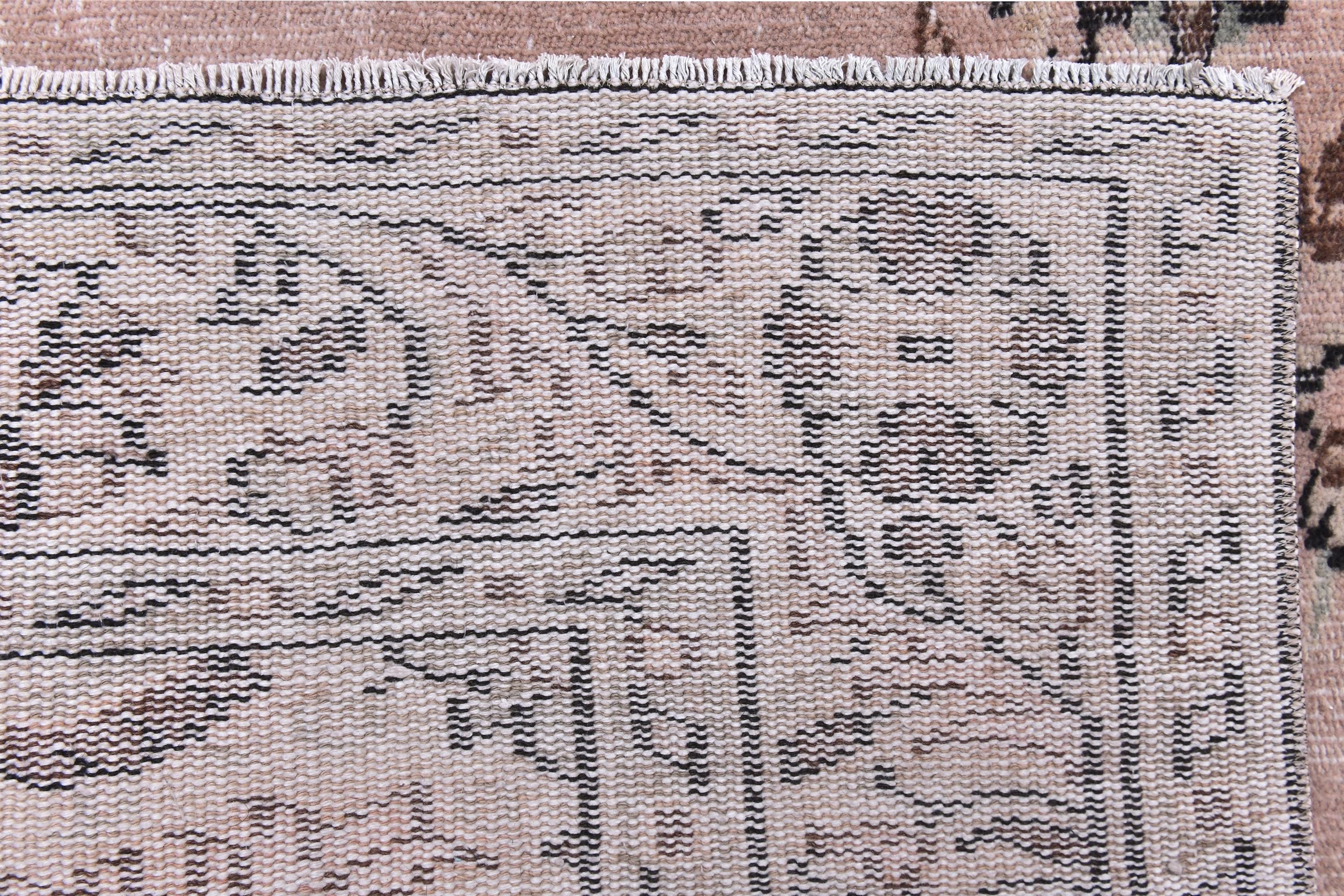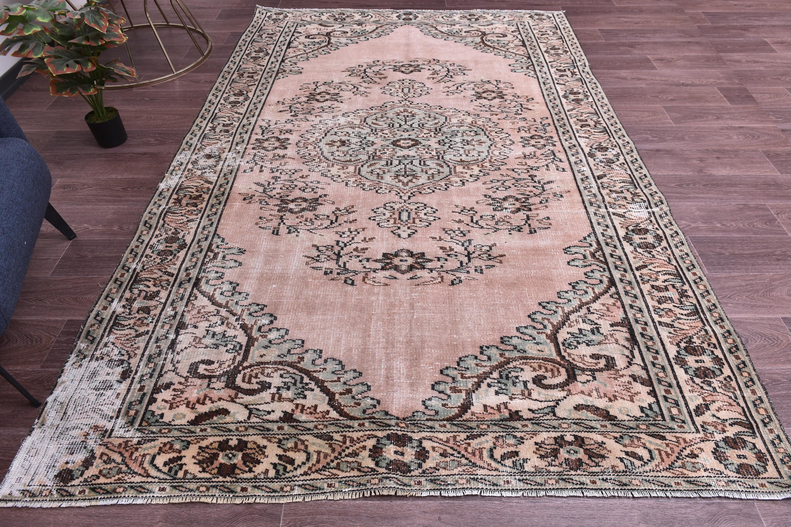 📜📌 Authentic vintage Turkish rug in pale blush pink with traditional Oushak-style medallion pattern. Showcases intricate floral and botanical designs with ornamental scrolling borders in muted sage, taupe, and cream colors. Distressed hand-woven wool with naturally faded appearance adds vintage charm and character. The soft pink palette and elegant classical design make this piece ideal for romantic, shabby chic, French country, or modern feminine interiors.