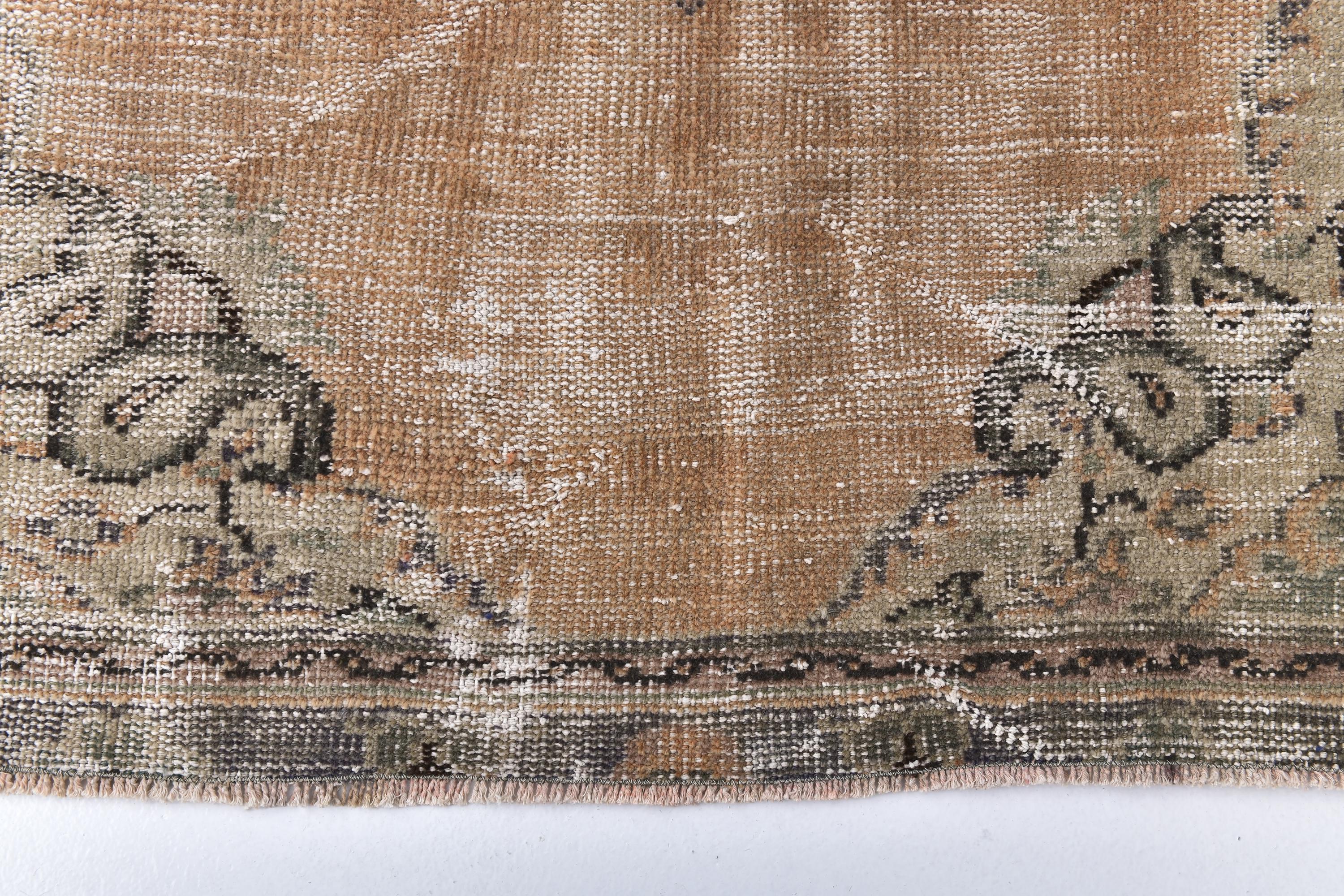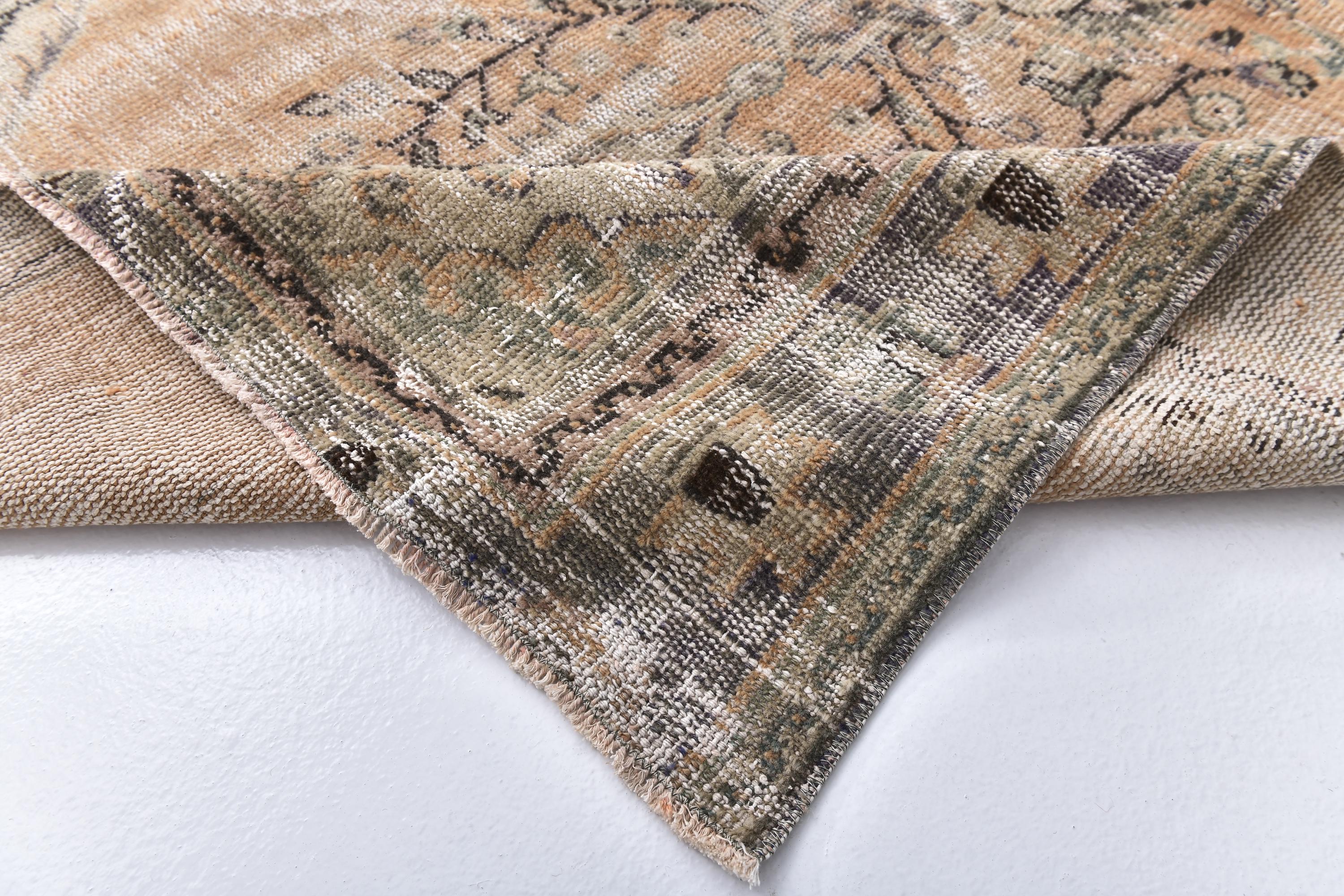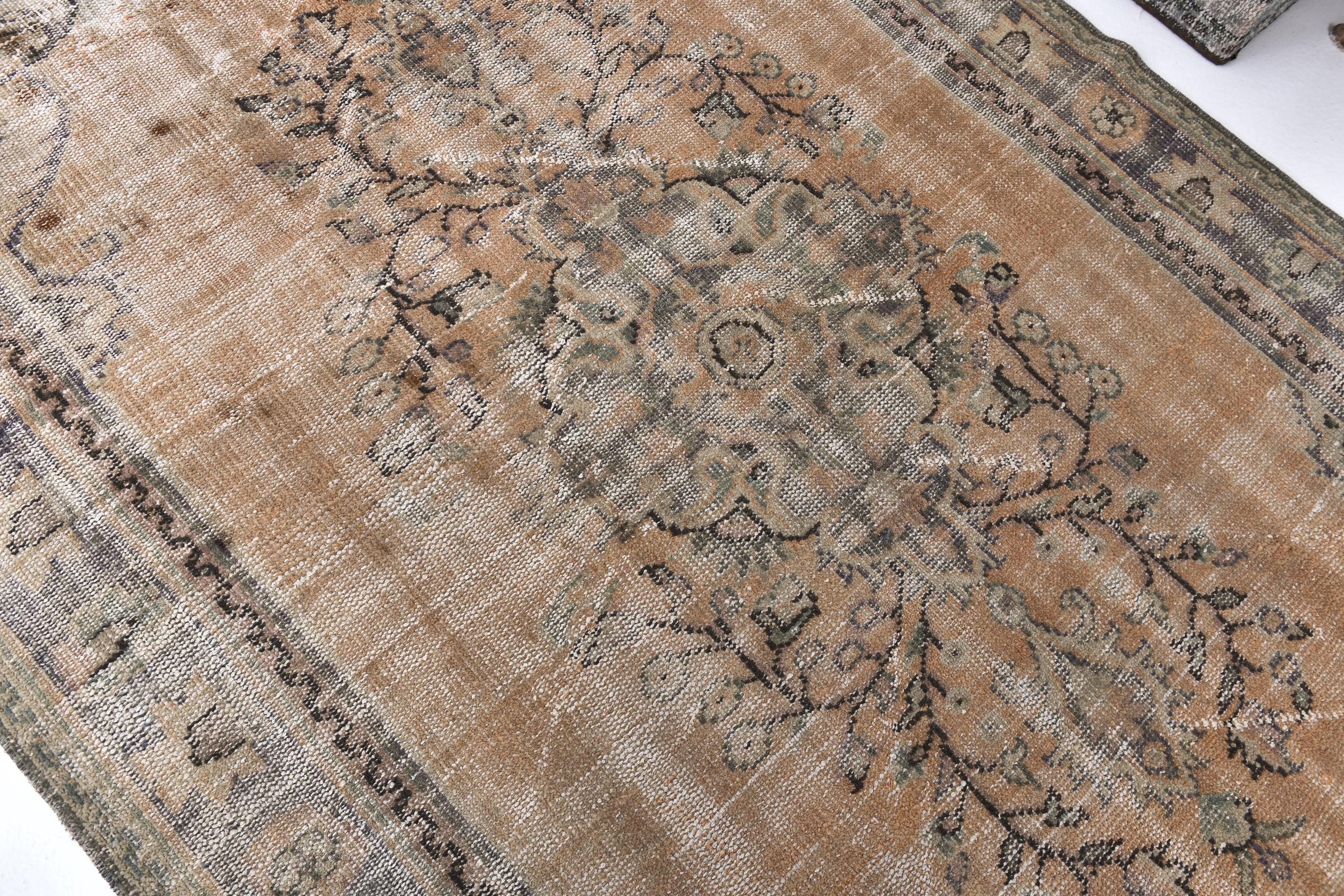 📜📌 Heavily distressed vintage Turkish area rug featuring faded beige and tan color palette with subtle floral medallion center design. Hand-knotted wool carpet displays aged patina with worn areas revealing natural fiber texture, decorative border with botanical motifs, and authentic antique character ideal for shabby chic or farmhouse interiors.