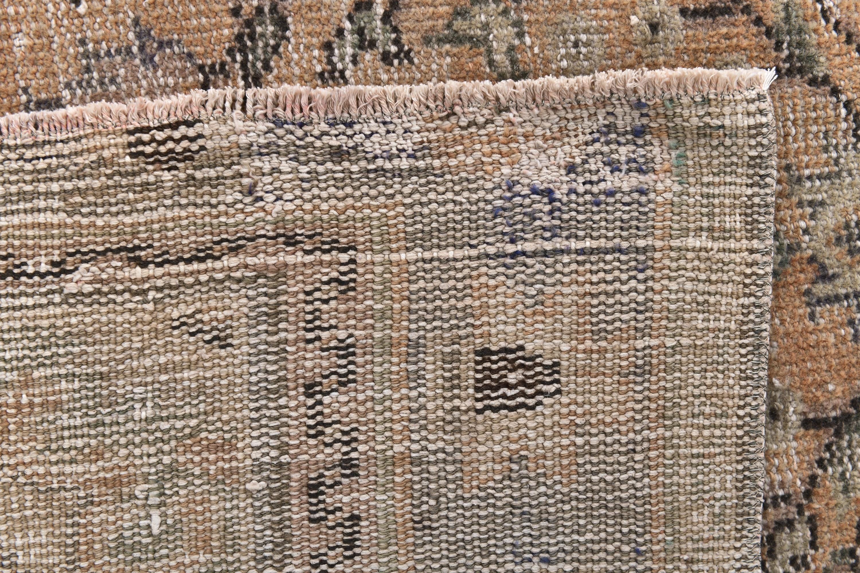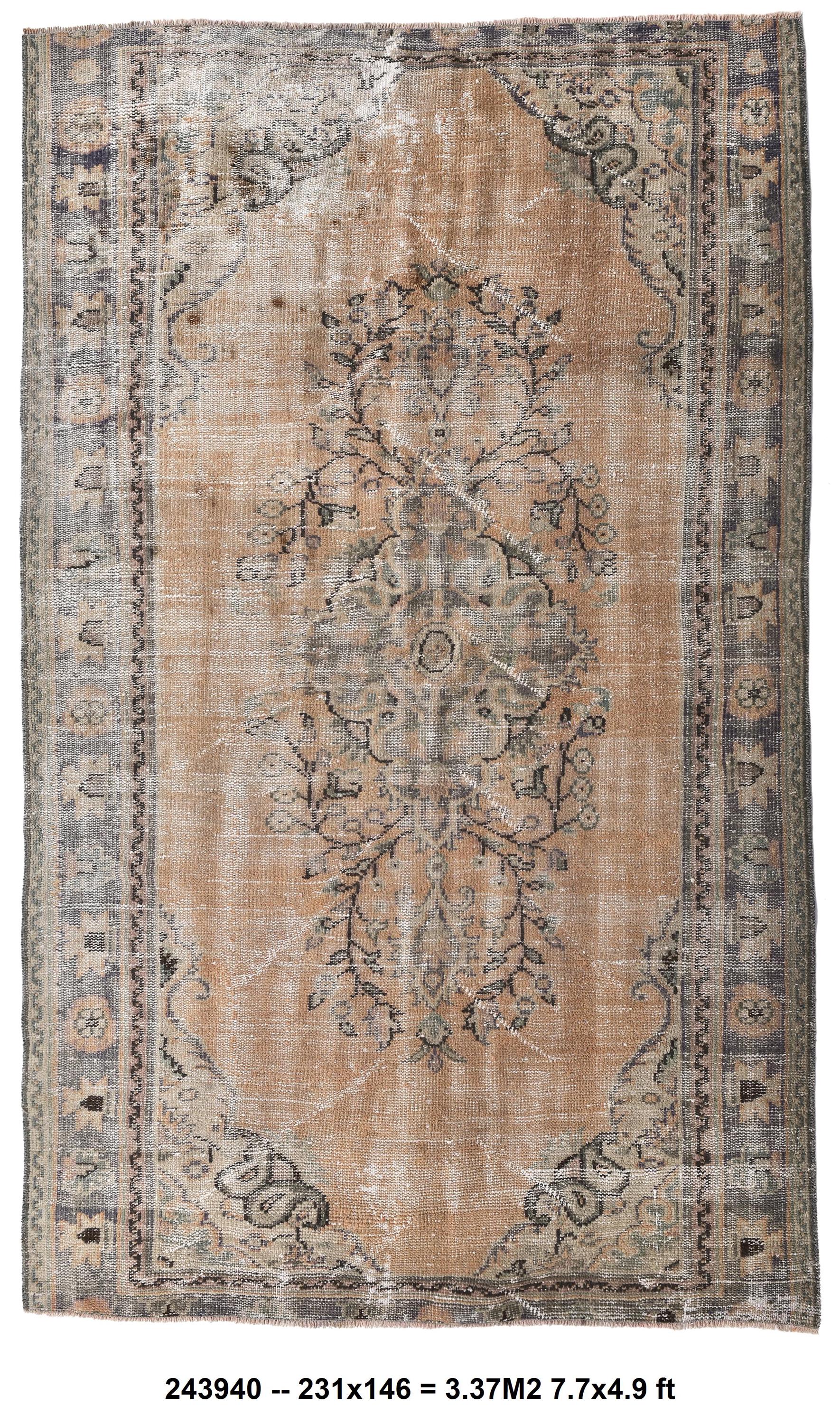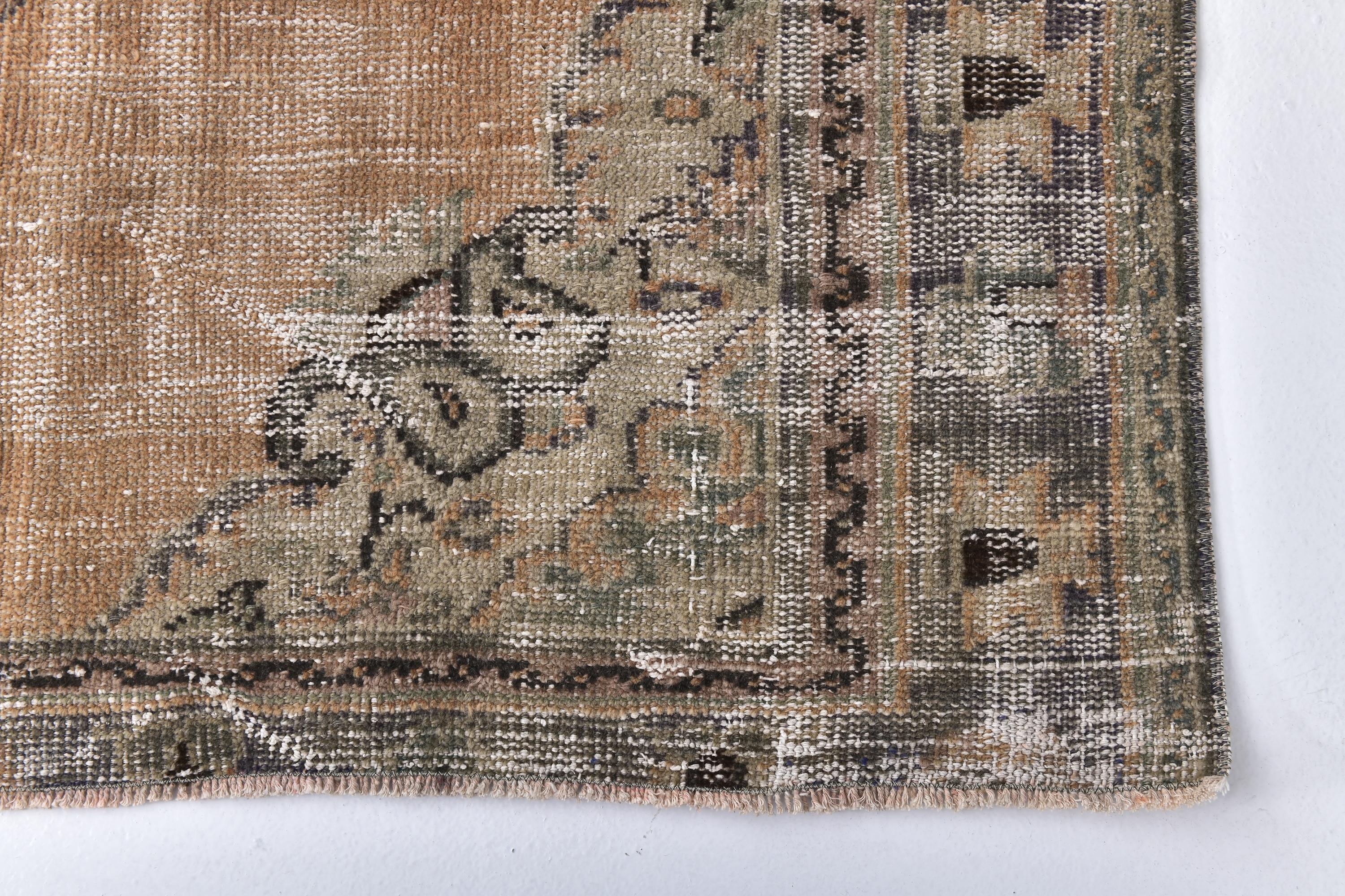 📜📌 Heavily distressed vintage Turkish area rug featuring faded beige and tan color palette with subtle floral medallion center design. Hand-knotted wool carpet displays aged patina with worn areas revealing natural fiber texture, decorative border with botanical motifs, and authentic antique character ideal for shabby chic or farmhouse interiors.