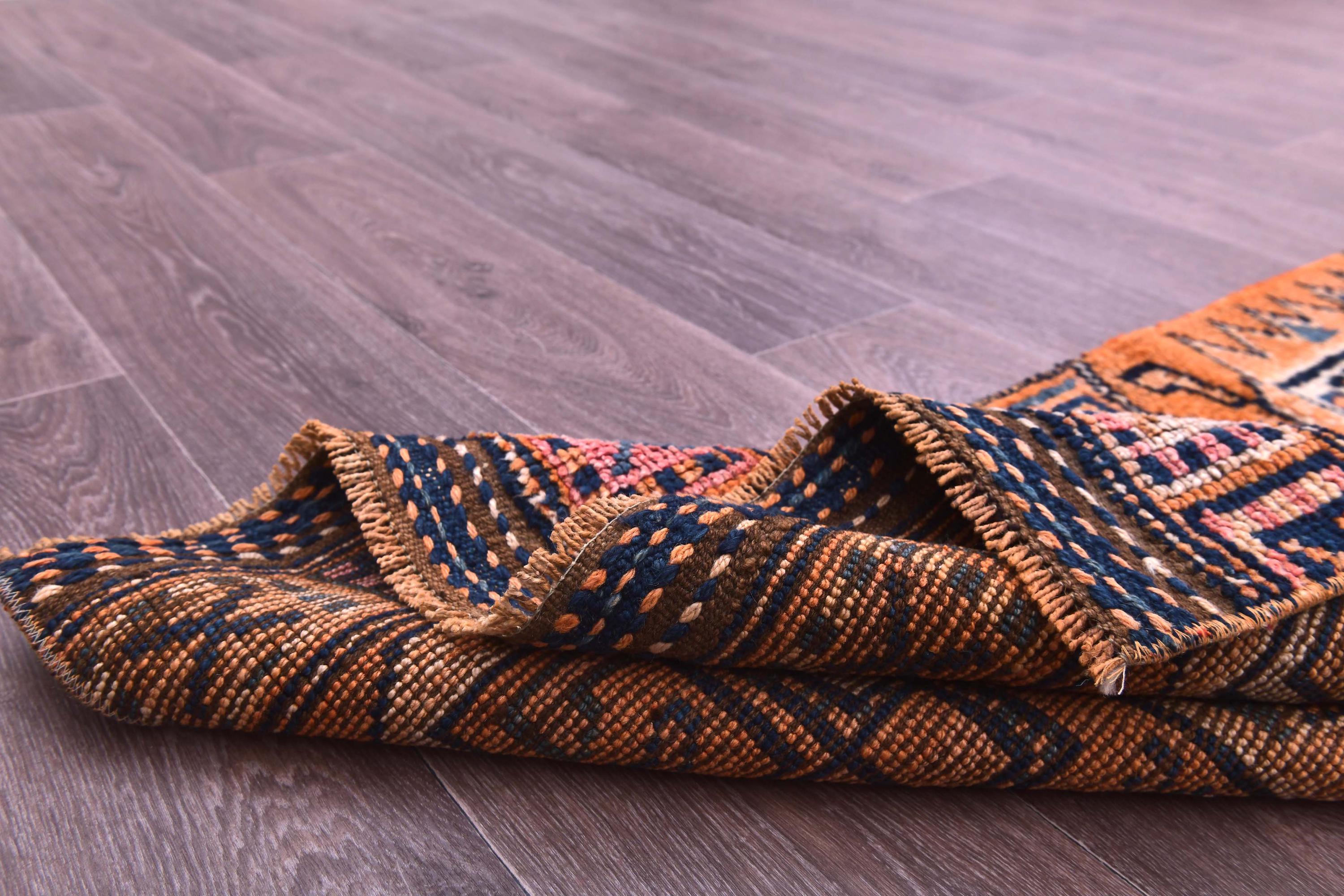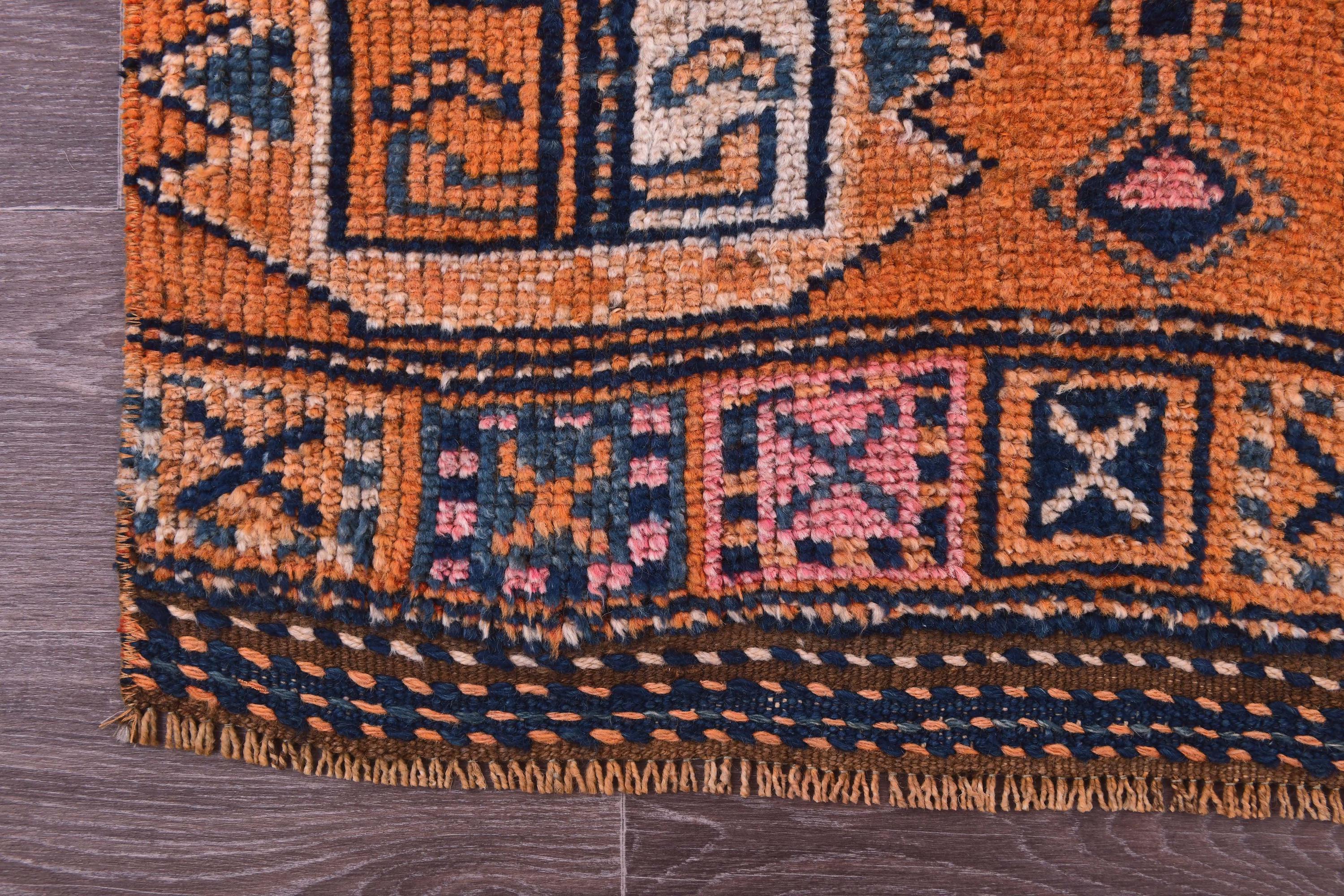 📜📌 Detailed close-up of antique Anatolian runner showing intricate hand-woven tribal patterns with chevron arrows, concentric square medallions and geometric symbols in bright orange with navy blue, pink and cream details and authentic low pile texture
