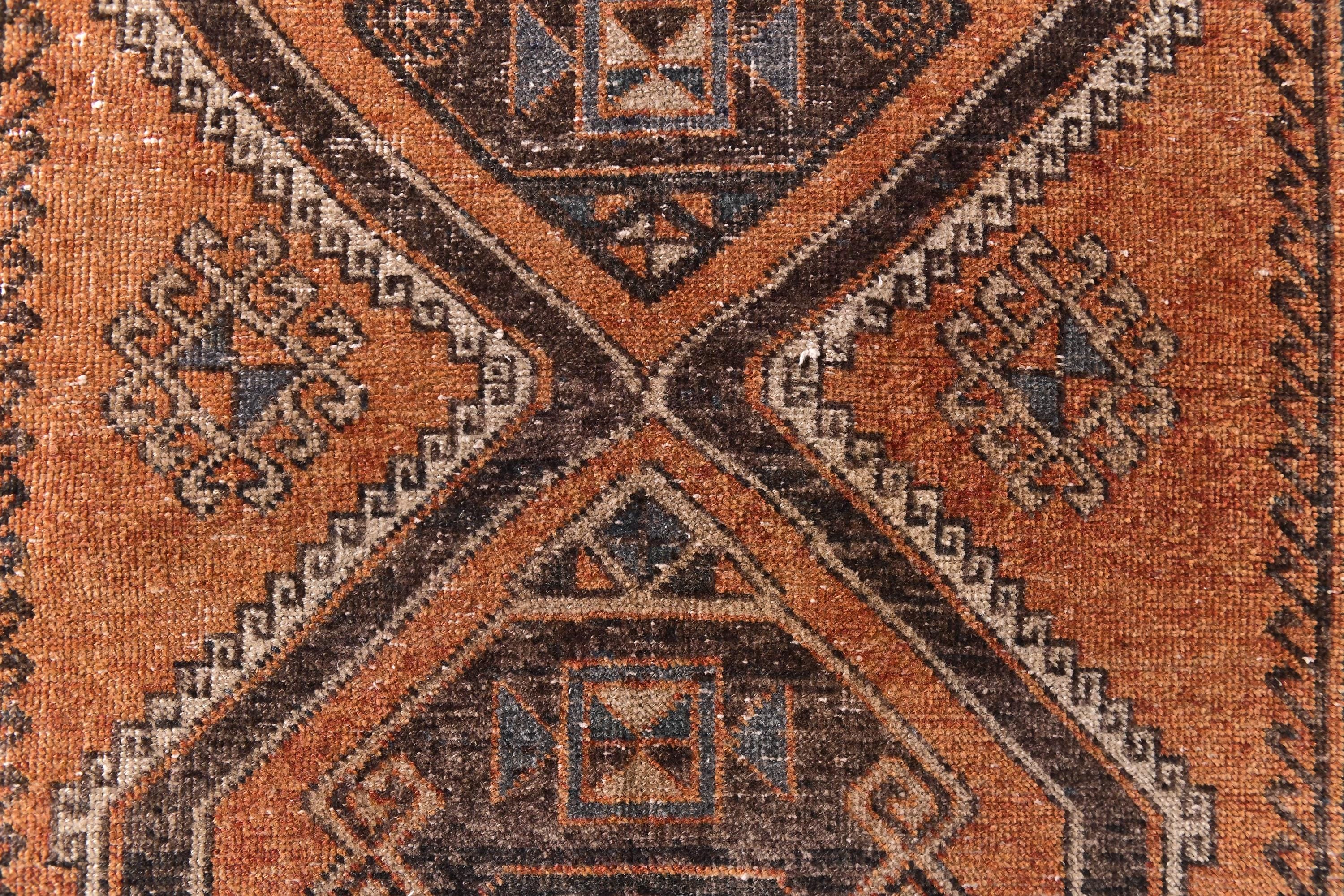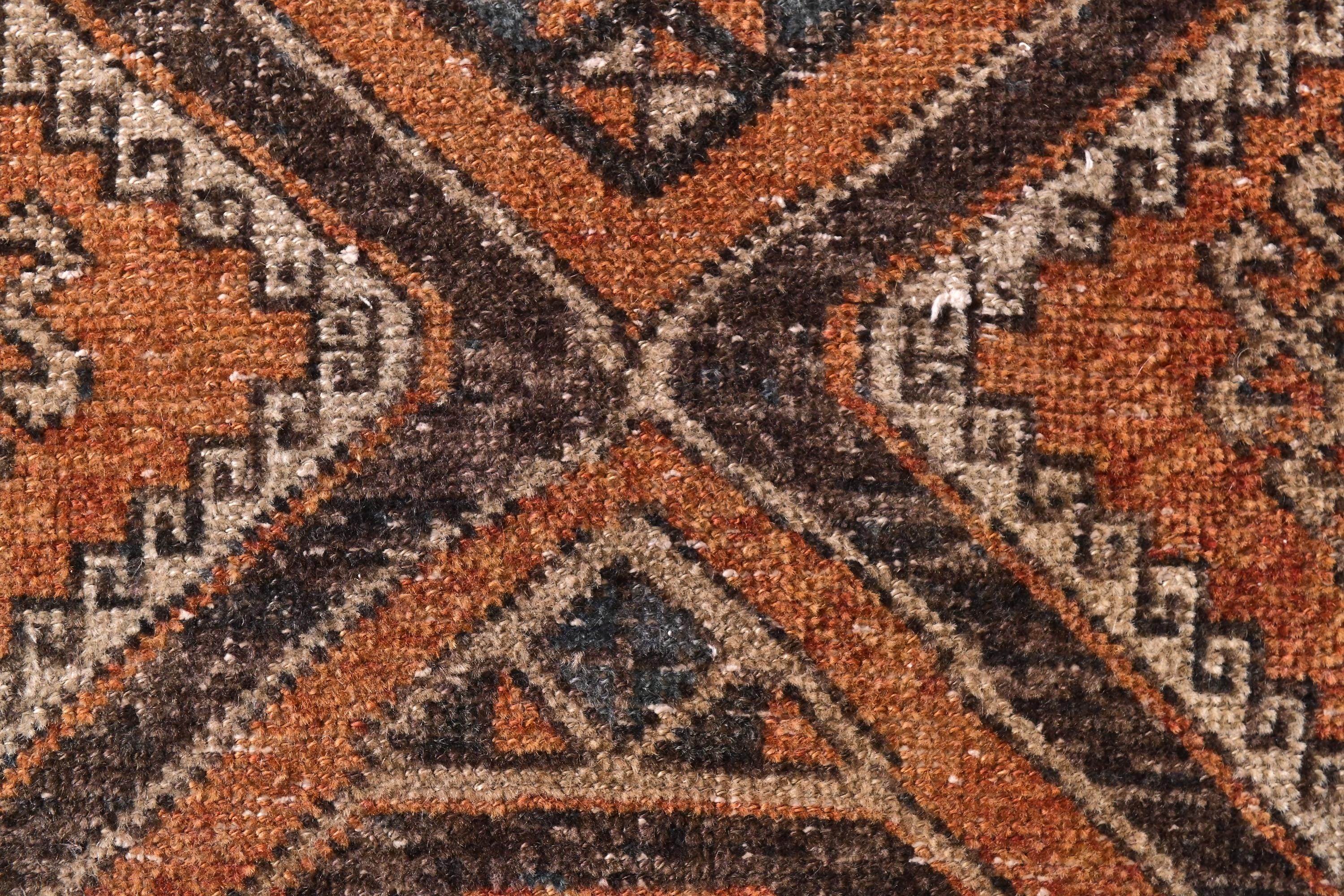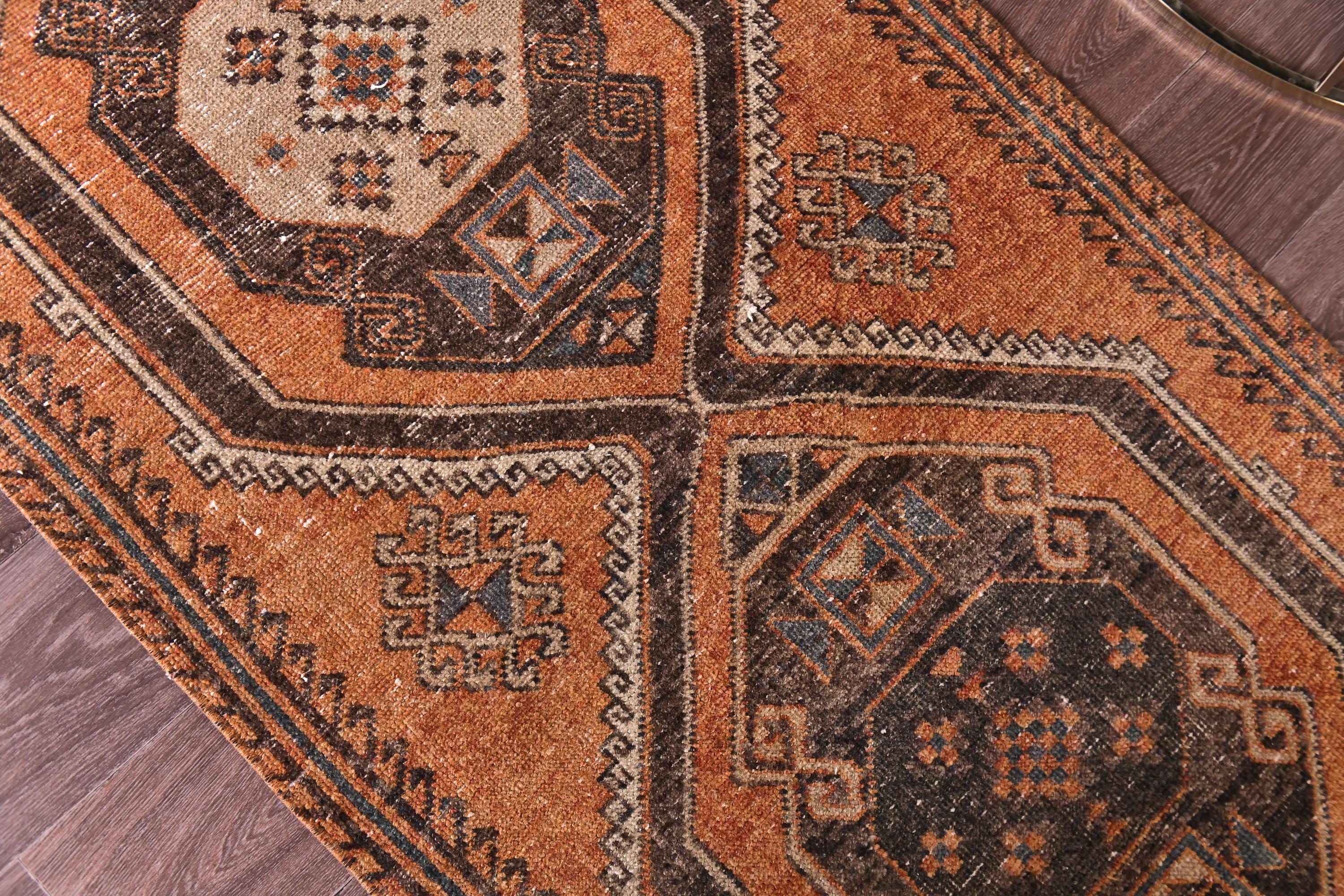 📜📌 Overhead view of hand-knotted vintage Anatolian runner displaying double medallion pattern in warm orange, chocolate brown, and cream tones with traditional tribal geometric designs, blue accent details, and naturally aged appearance ideal for bohemian or traditional home decor