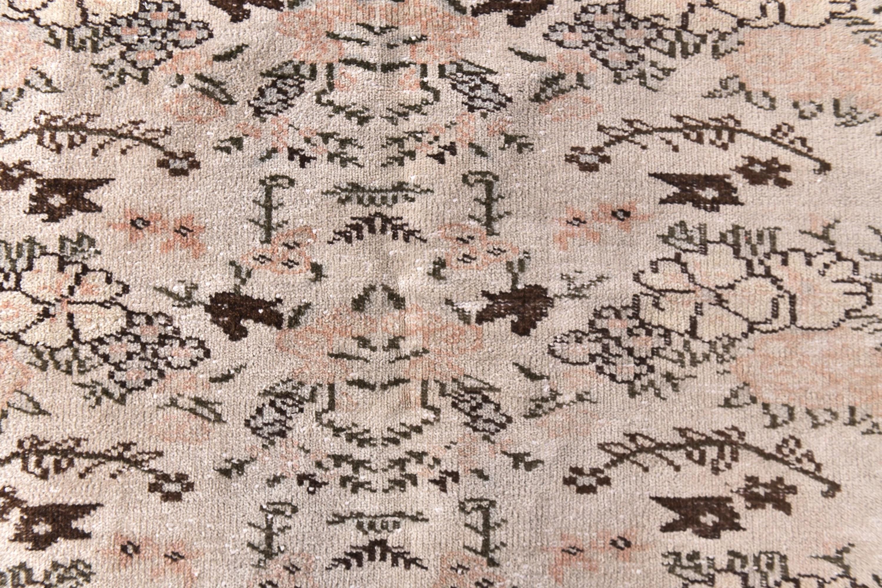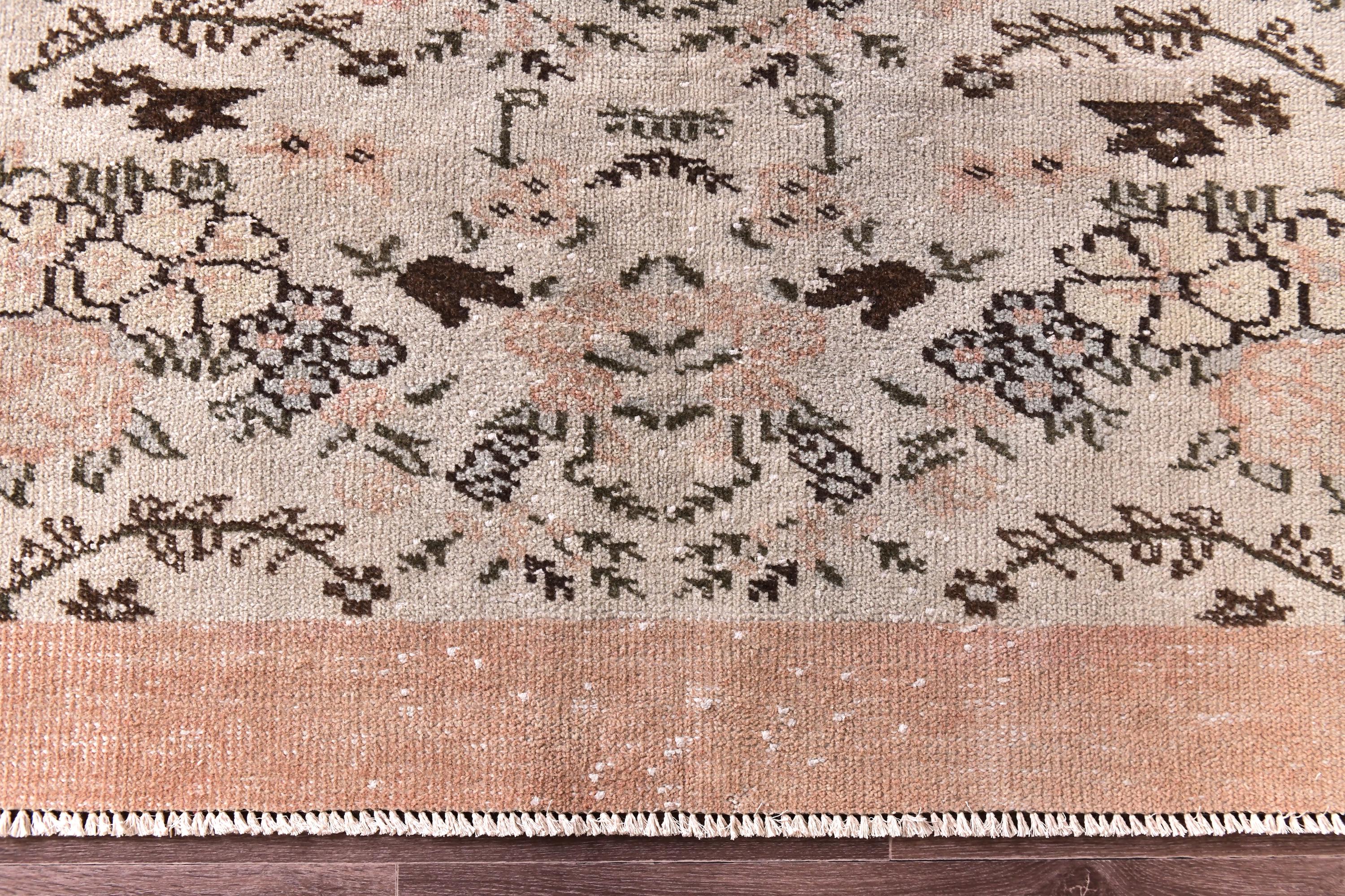 📜📌 Authentic vintage Turkish rug in pale blush pink with traditional Oushak-style medallion pattern. Showcases intricate floral and botanical designs with ornamental scrolling borders in muted sage, taupe, and cream colors. Distressed hand-woven wool with naturally faded appearance adds vintage charm and character. The soft pink palette and elegant classical design make this piece ideal for romantic, shabby chic, French country, or modern feminine interiors.