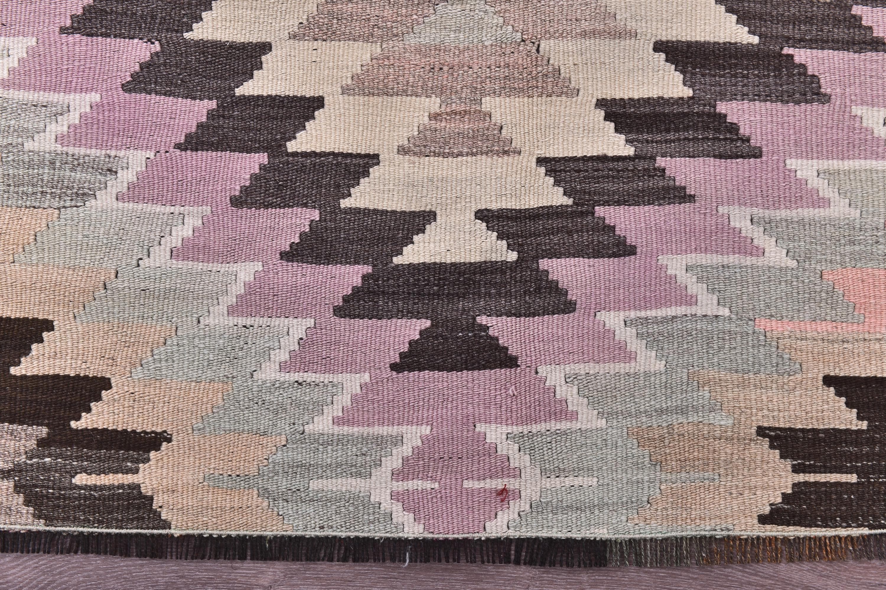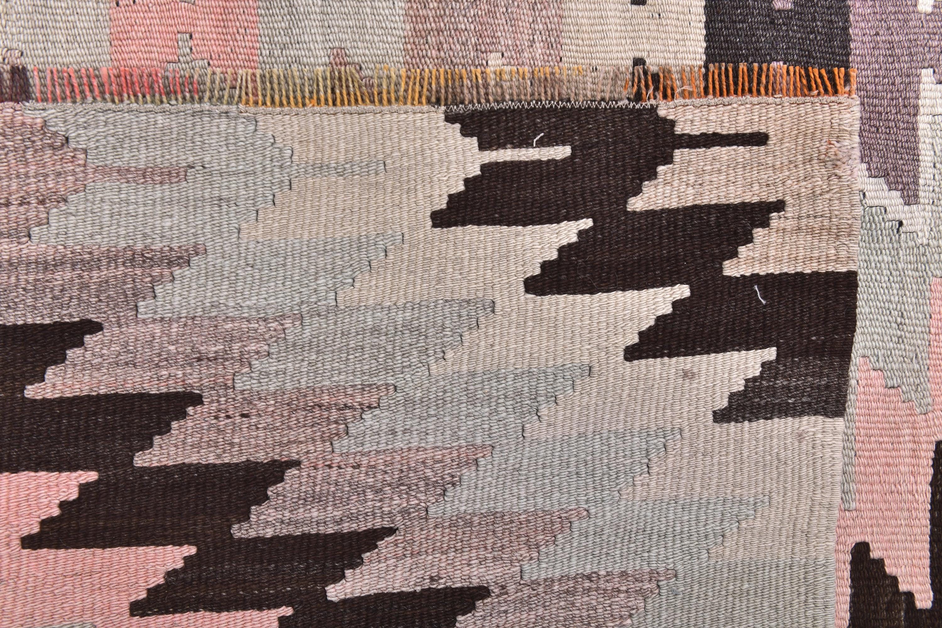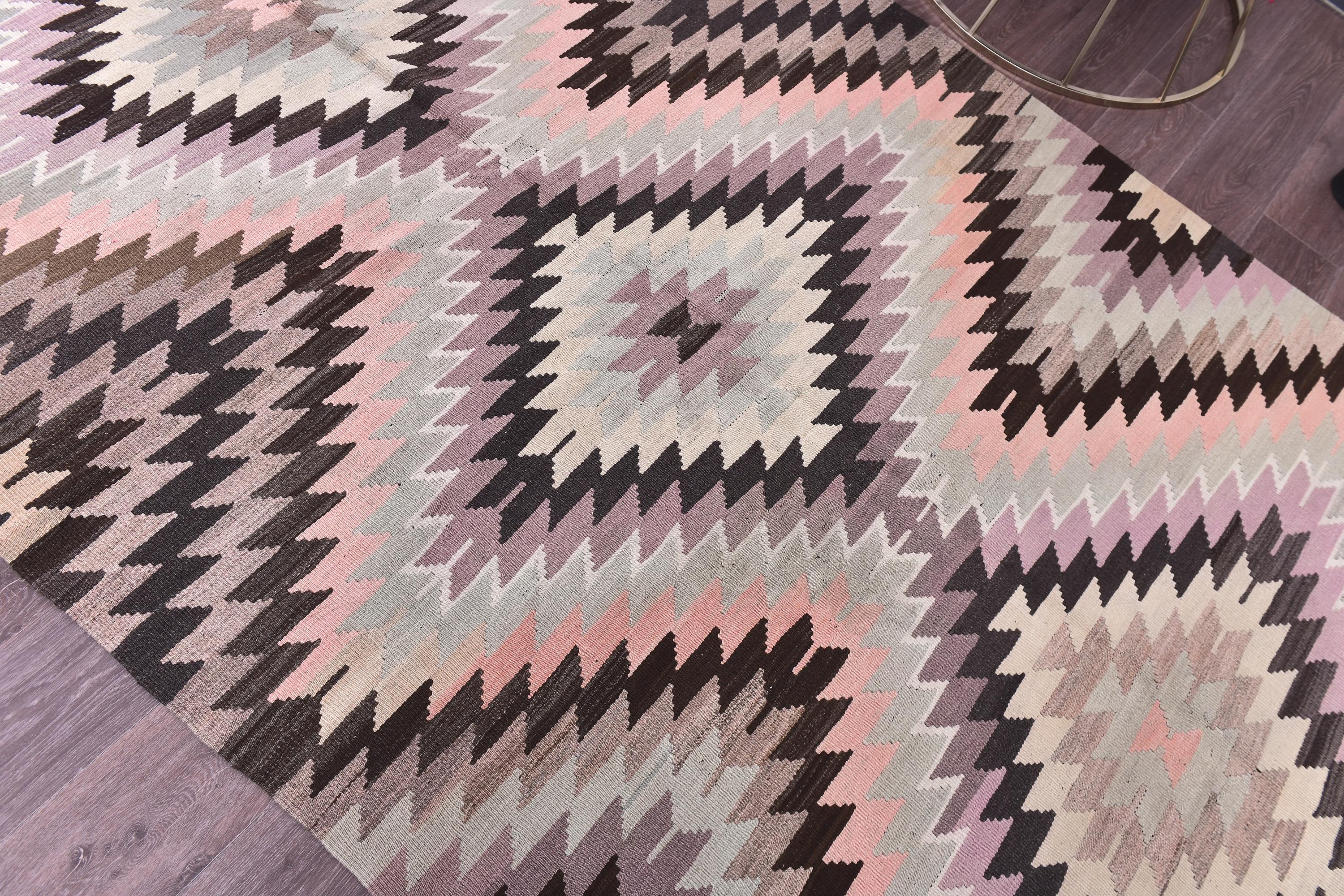 📜📌 Handwoven vintage Turkish kilim rug featuring repeating diamond geometric patterns in soft pastel pink, sage green, cream, brown, and charcoal gray colors. The flatweave wool rug displays traditional Southwestern tribal motifs with zigzag borders and a symmetrical design, placed on gray wood flooring with modern furniture.