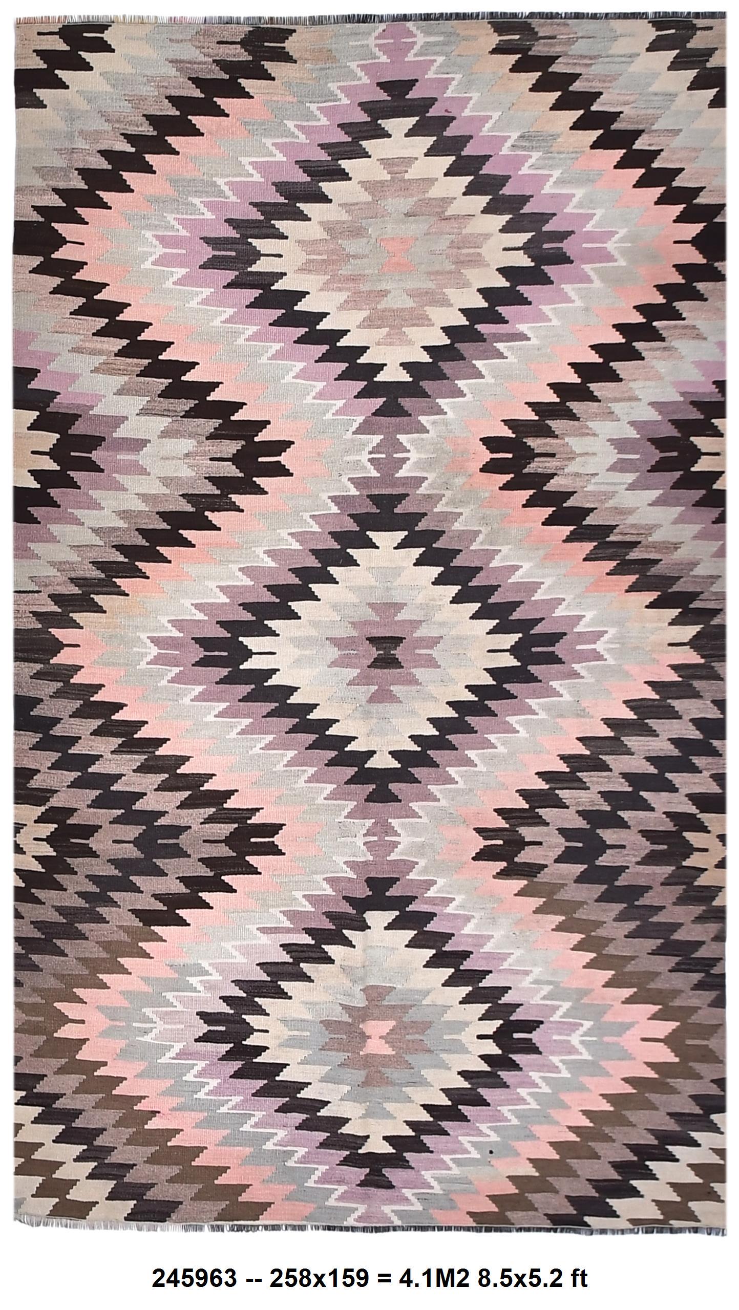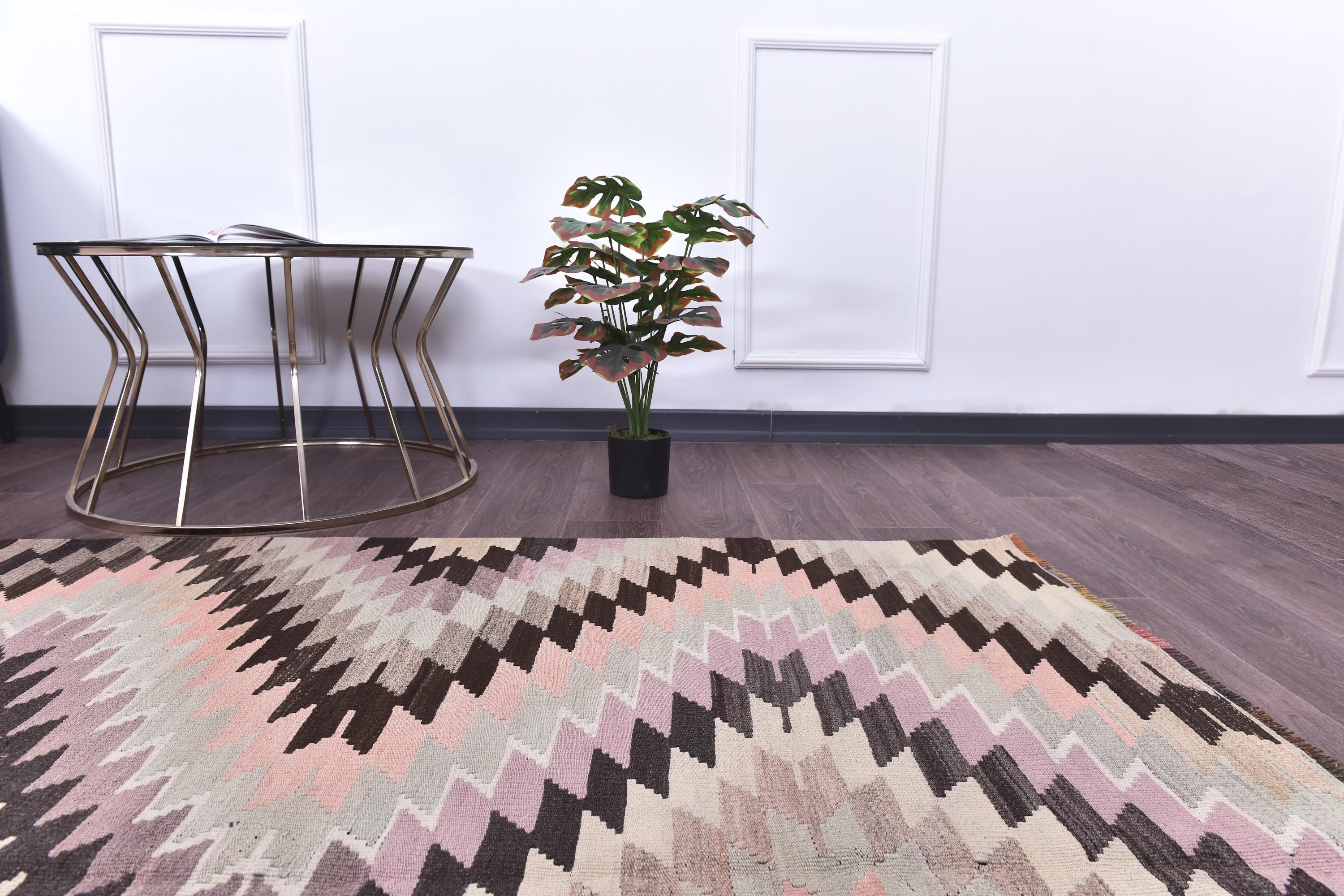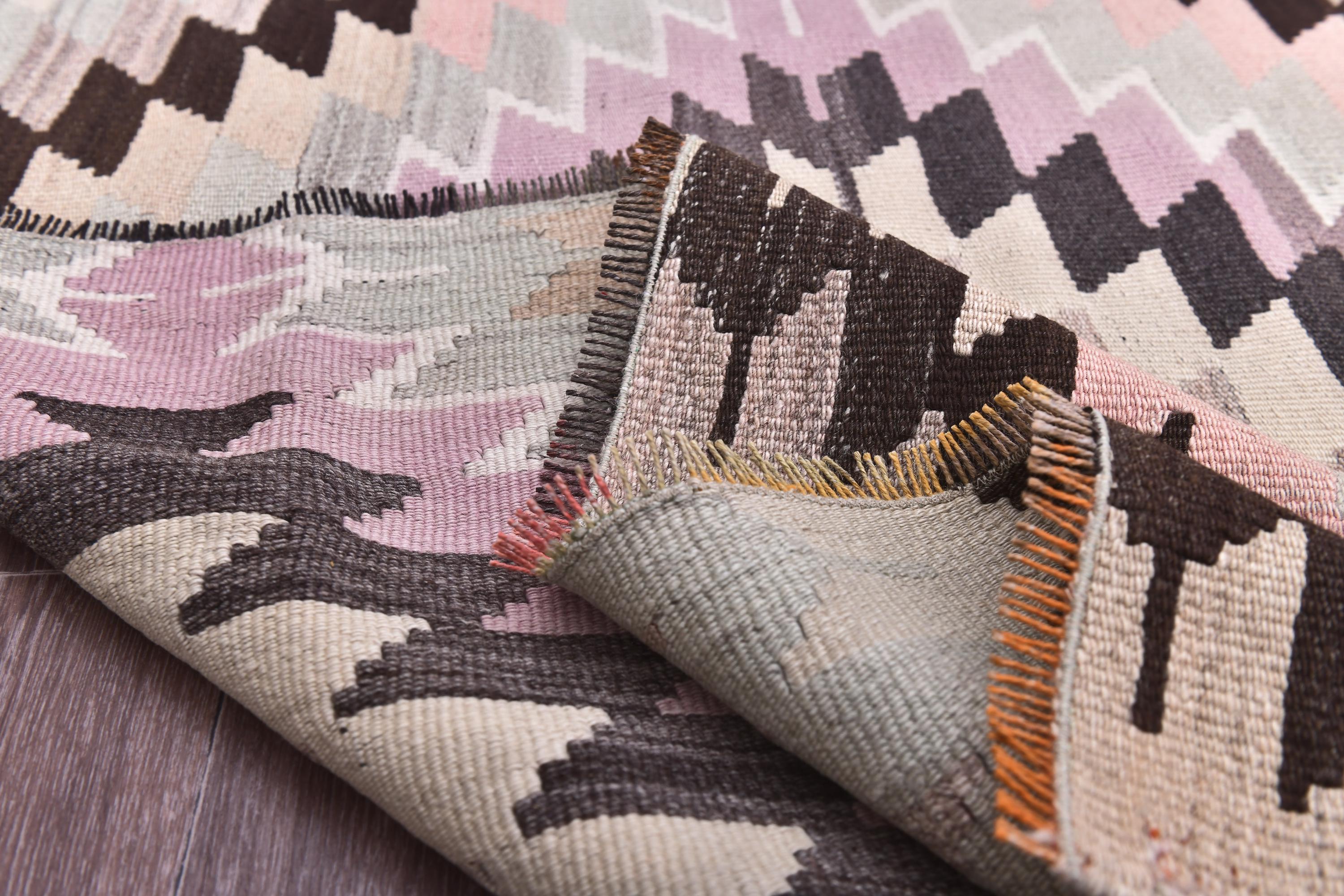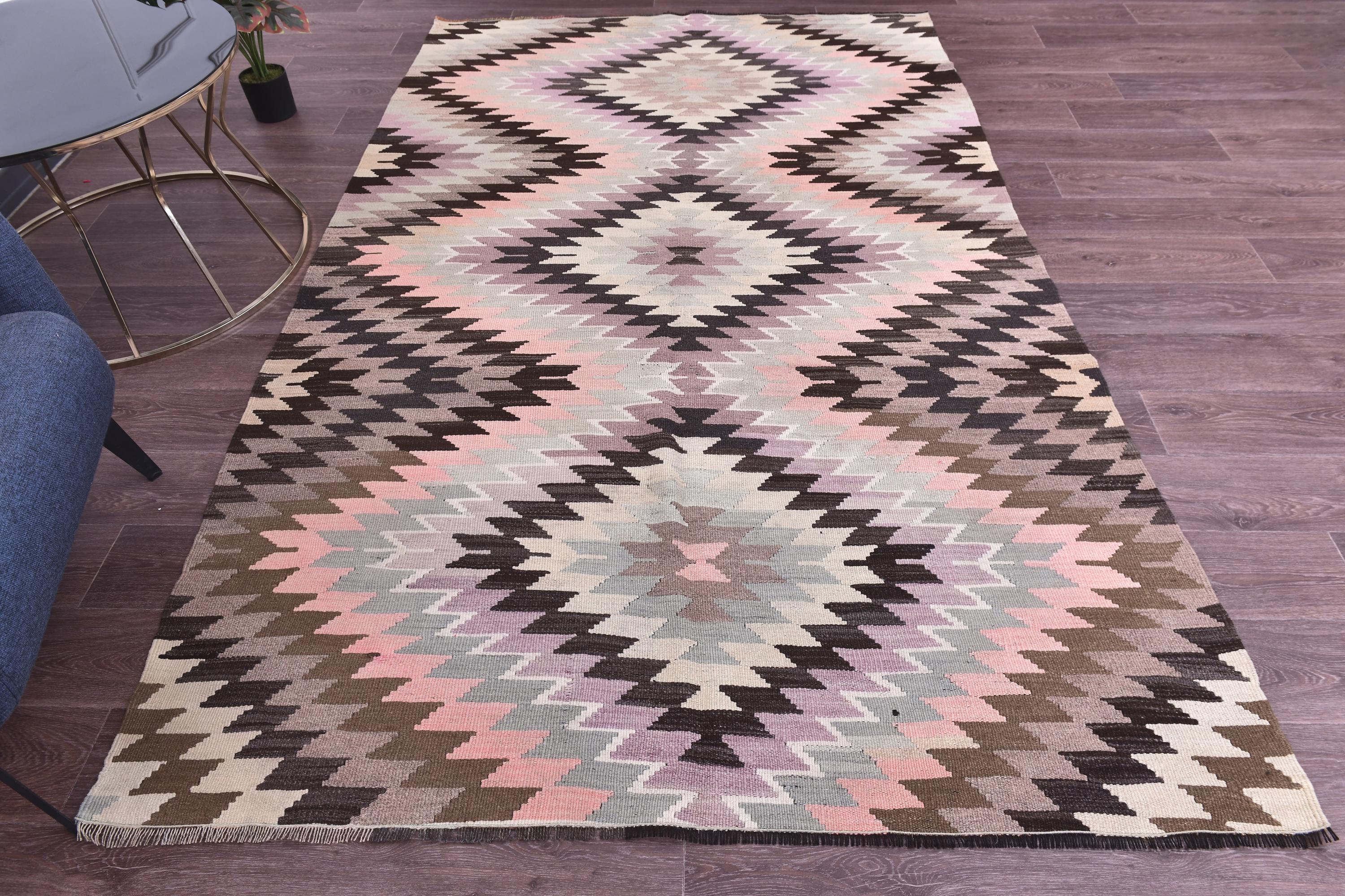 📜📌 Handwoven vintage Turkish kilim rug featuring repeating diamond geometric patterns in soft pastel pink, sage green, cream, brown, and charcoal gray colors. The flatweave wool rug displays traditional Southwestern tribal motifs with zigzag borders and a symmetrical design, placed on gray wood flooring with modern furniture.