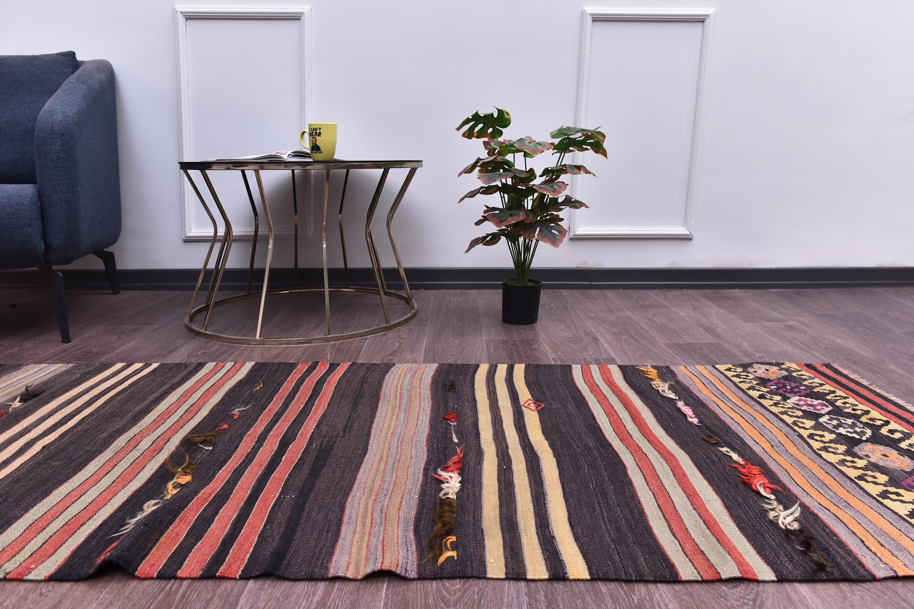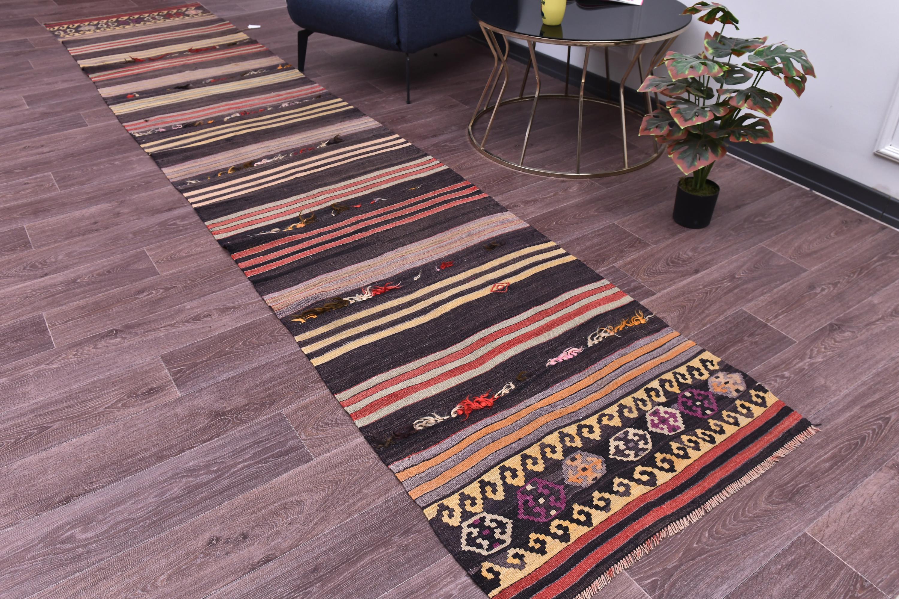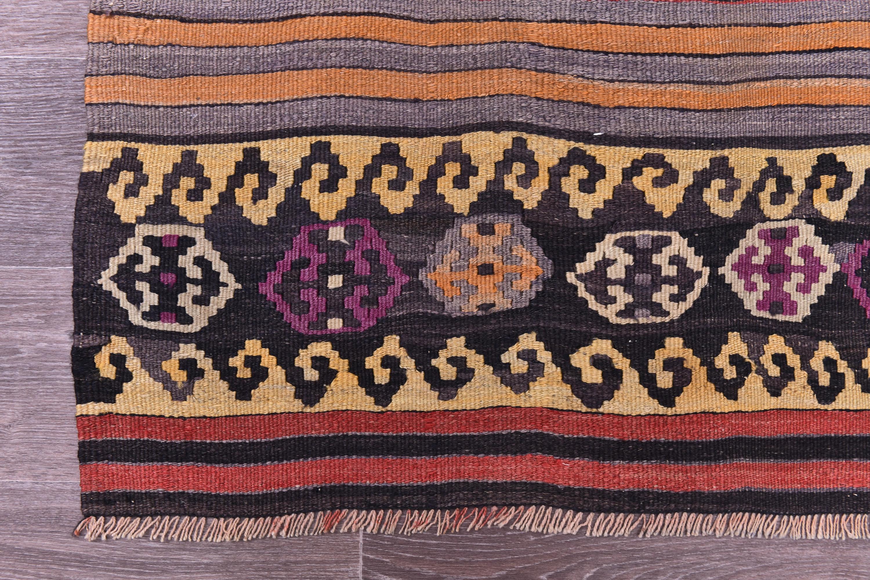 📜📌 Vintage handwoven Turkish kilim runner featuring bold horizontal stripes in charcoal black, rust red, cream, tan, and orange colors with scattered embroidered floral motifs throughout. The long flatweave wool rug displays an ornate decorative end panel with geometric medallions in purple, orange, and cream with zigzag borders and natural fringe on gray wood floor.