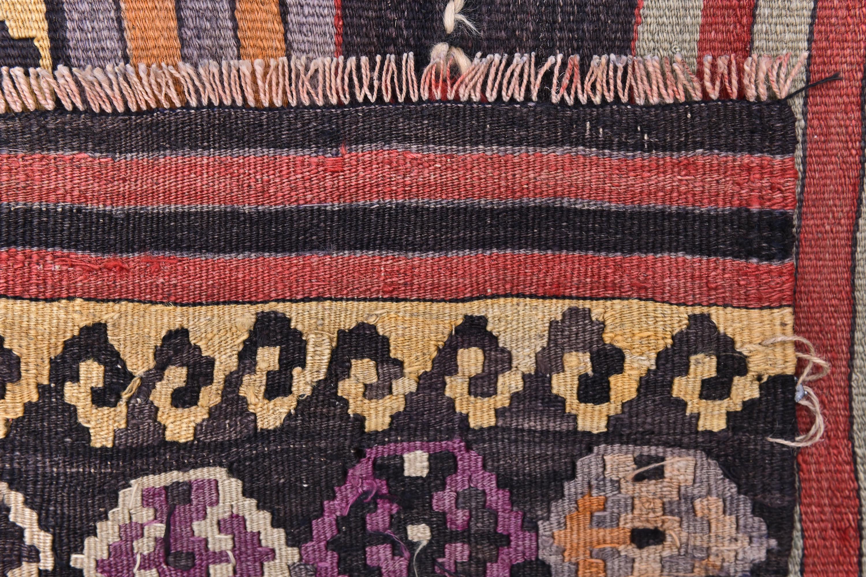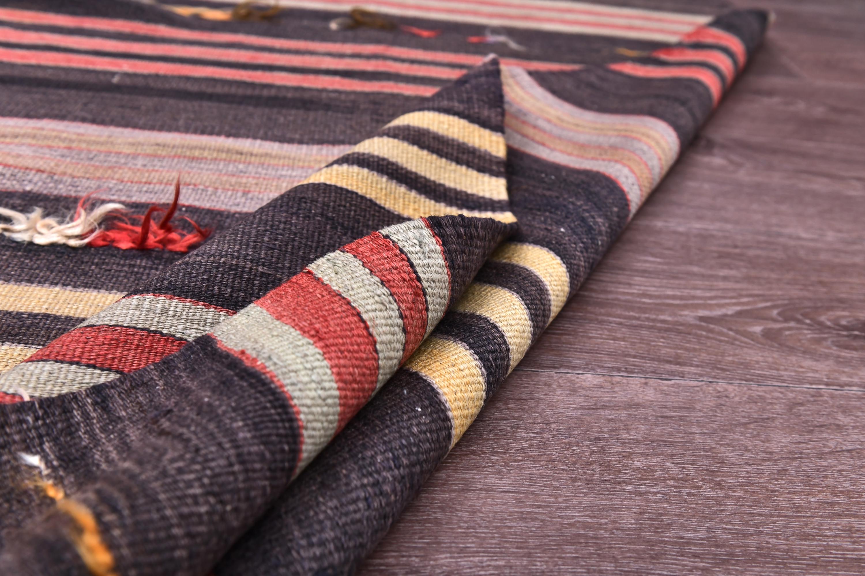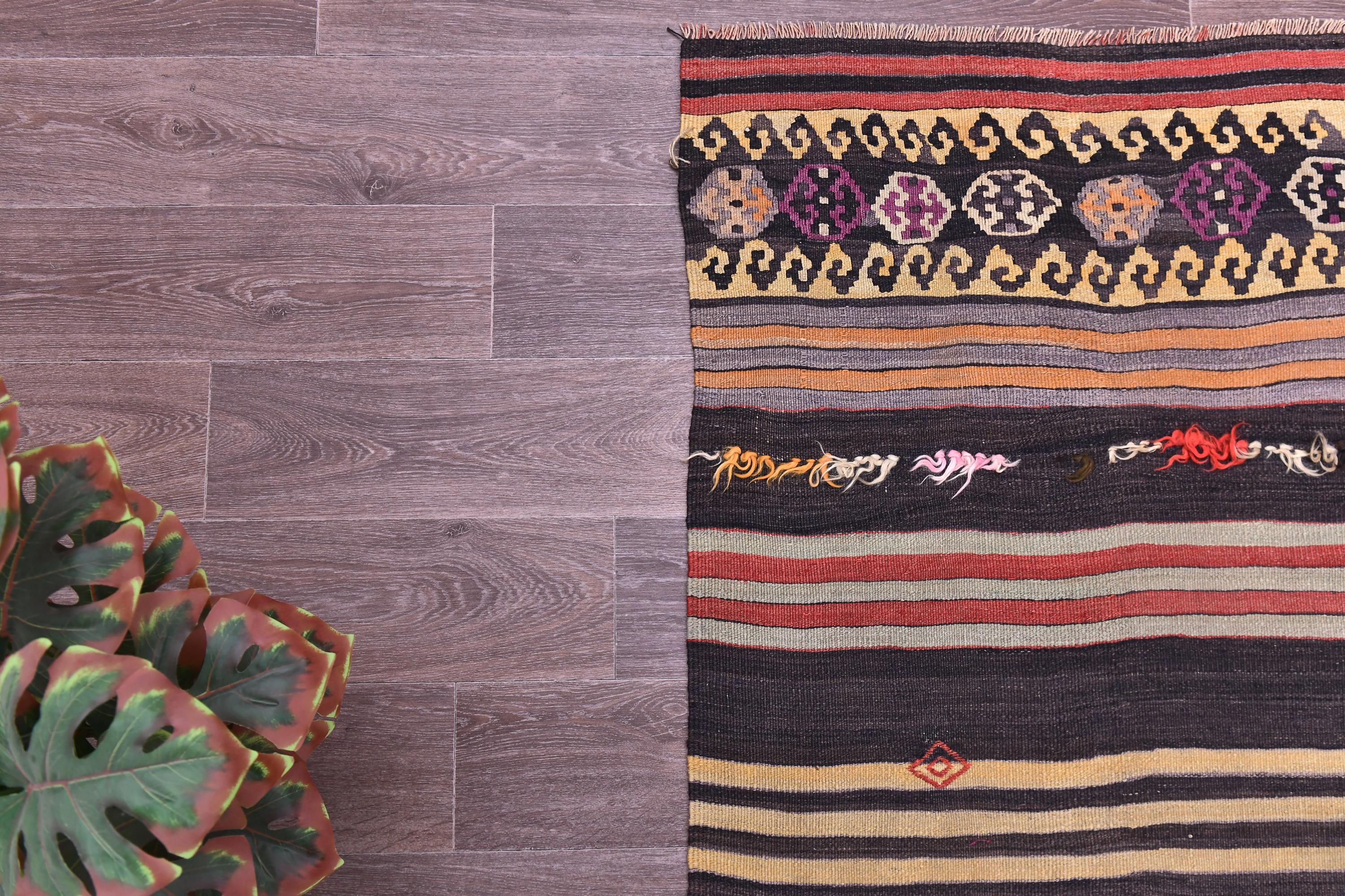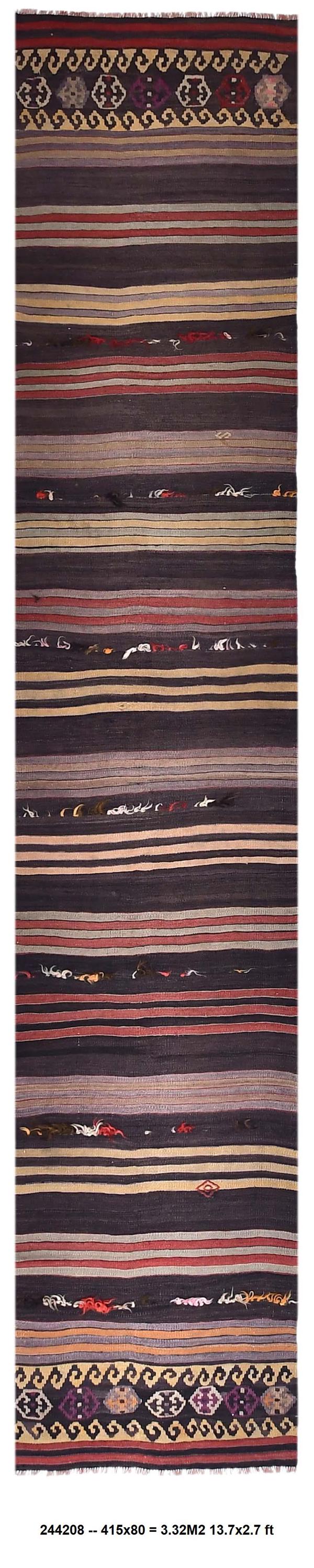 📜📌 Vintage handwoven Turkish kilim runner featuring bold horizontal stripes in charcoal black, rust red, cream, tan, and orange colors with scattered embroidered floral motifs throughout. The long flatweave wool rug displays an ornate decorative end panel with geometric medallions in purple, orange, and cream with zigzag borders and natural fringe on gray wood floor.