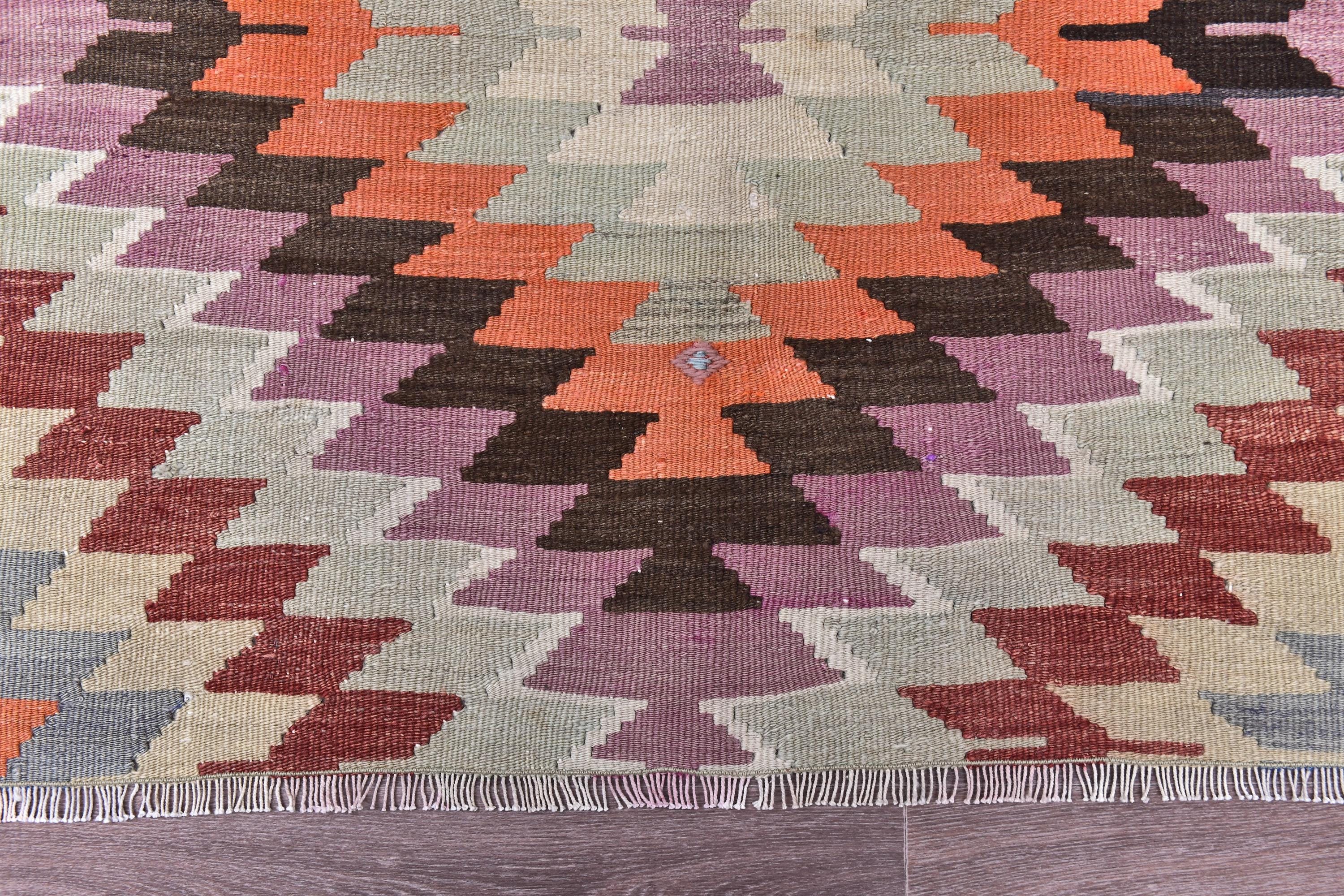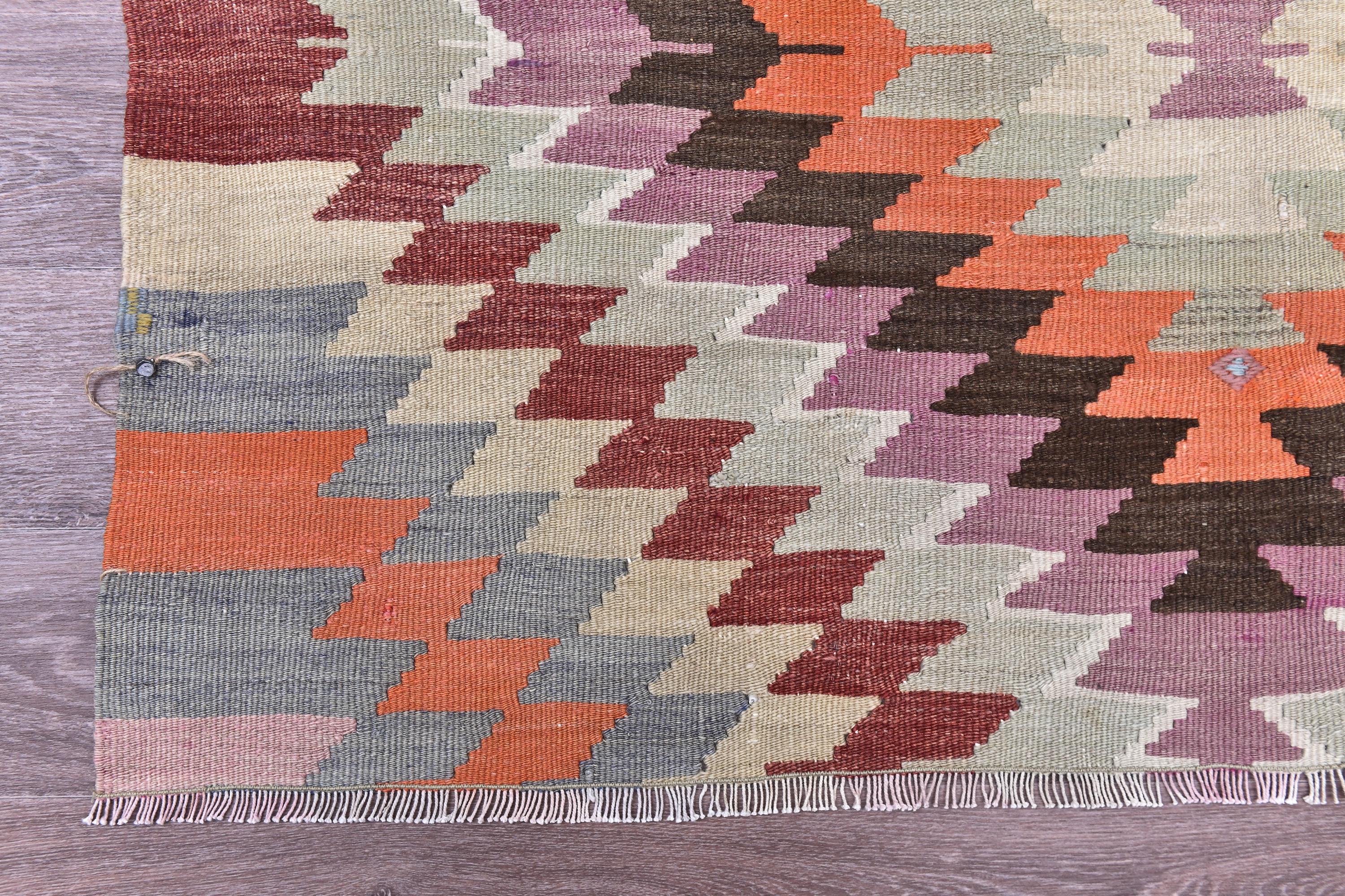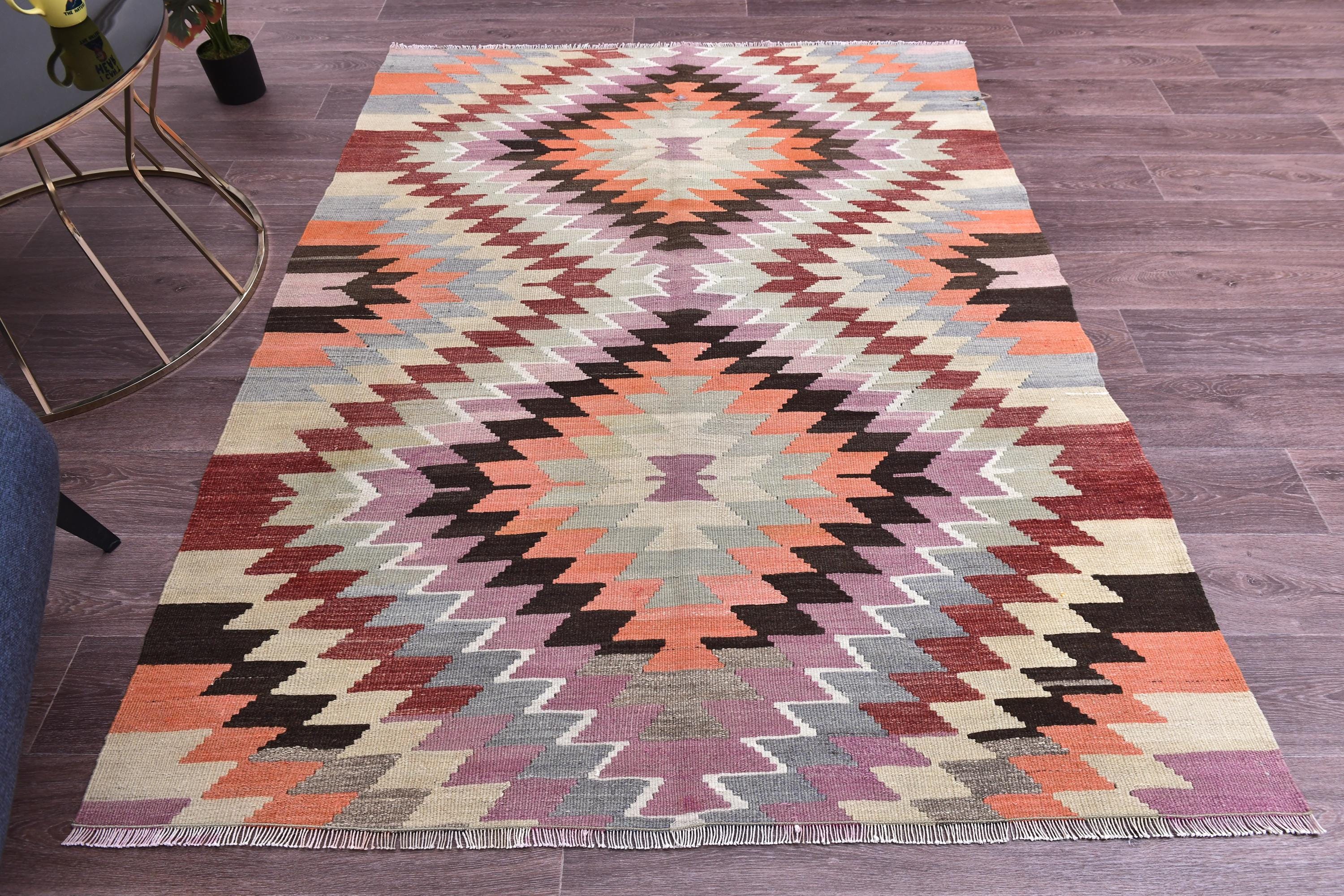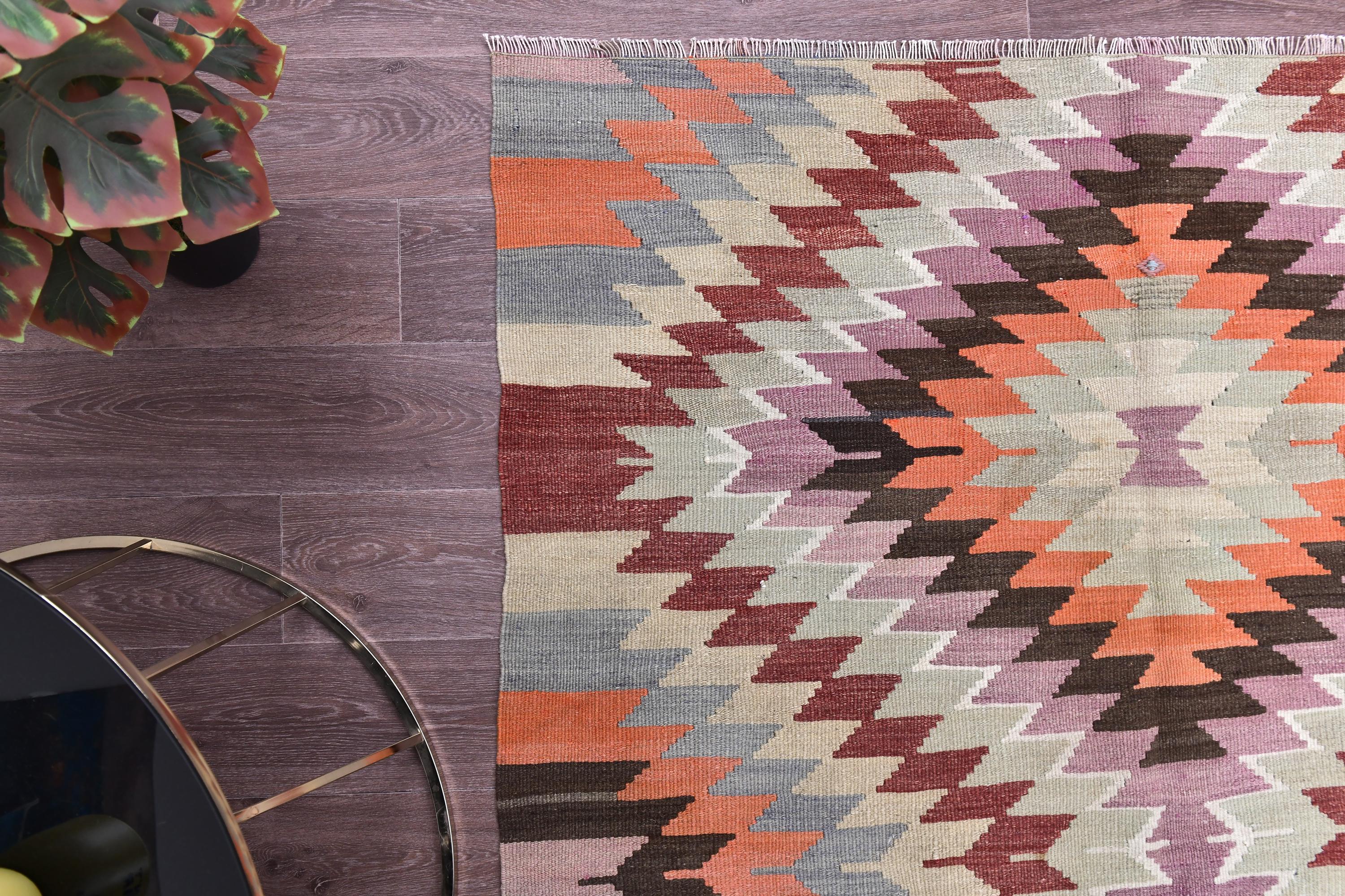 📜📌 5x6 Vintage Turkish Kilim Rug, Purple Orange Green Black Color, 5x6 Handmade Wool Jute Rug, 5x6 Turkish Accent Rug, Traditional Home Decor, Geometric