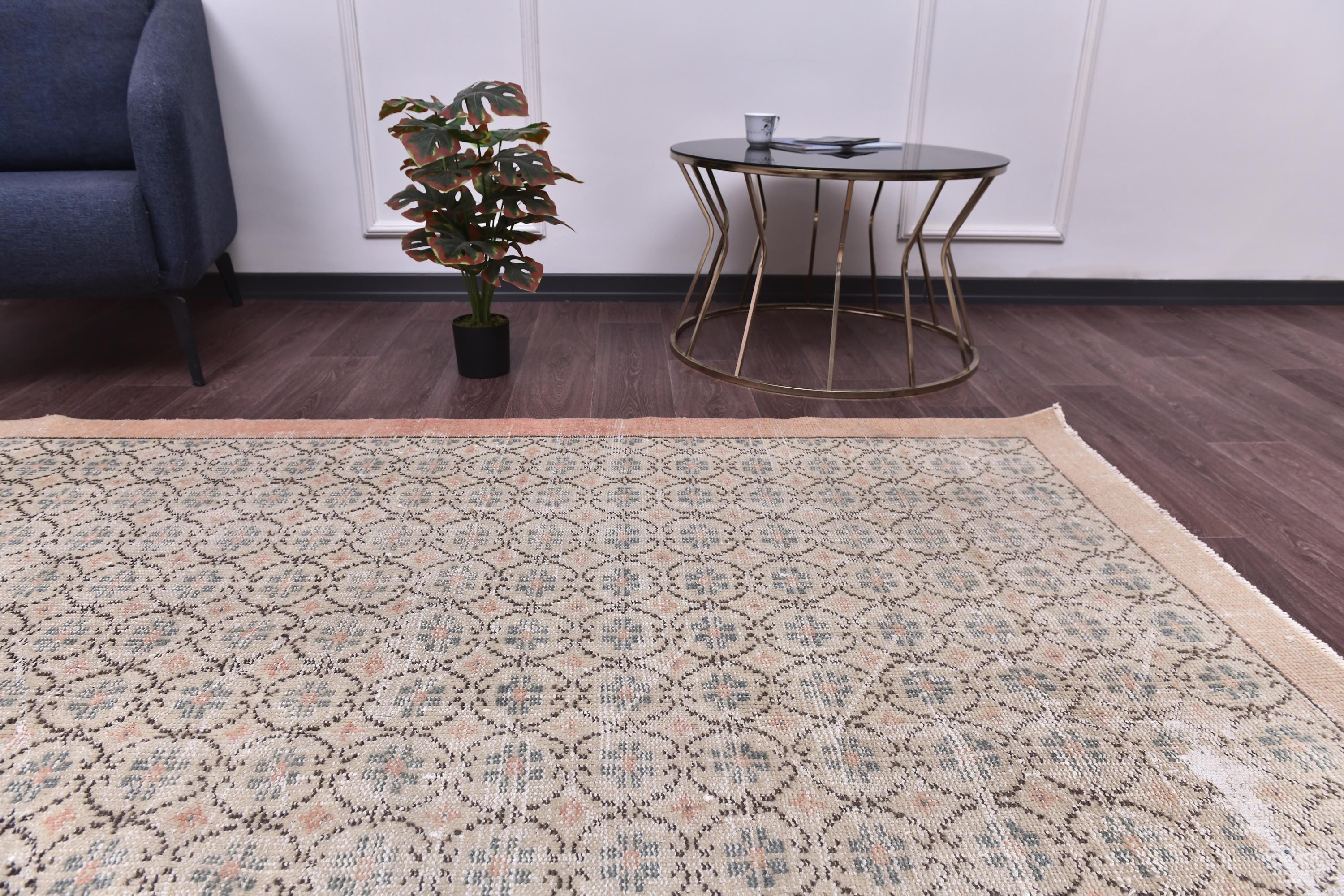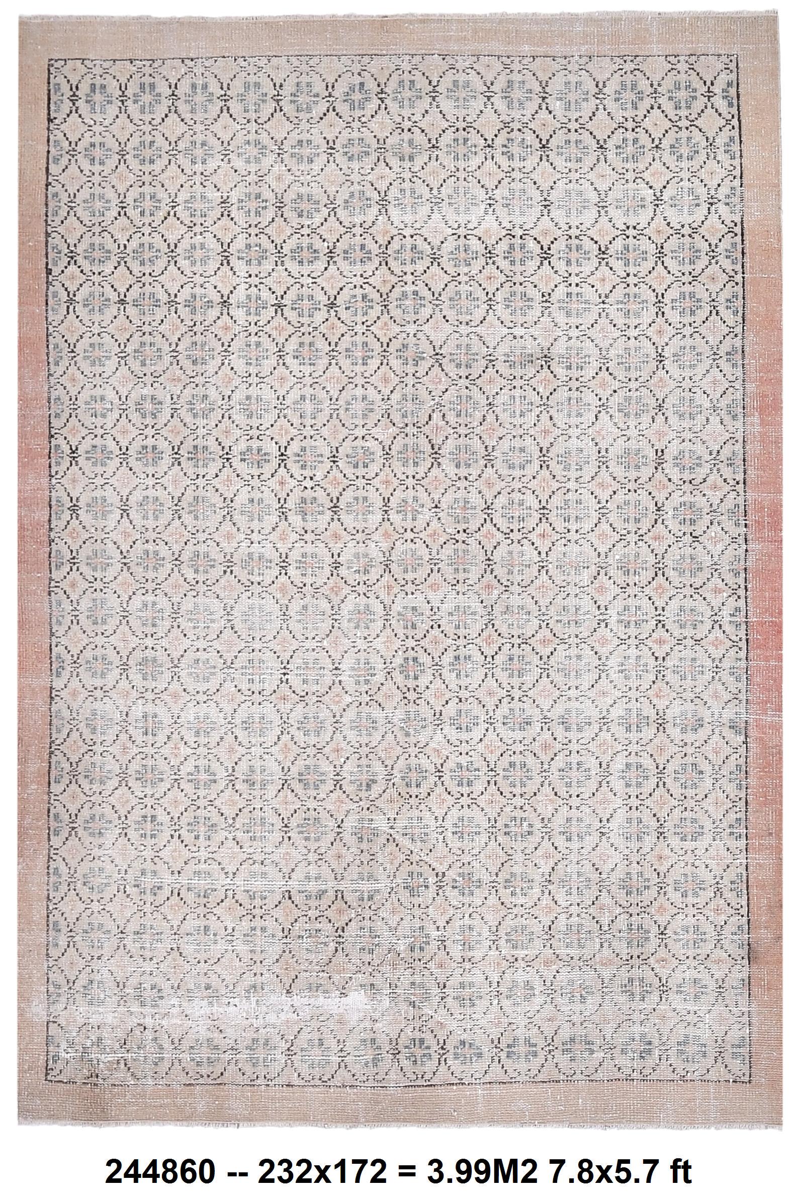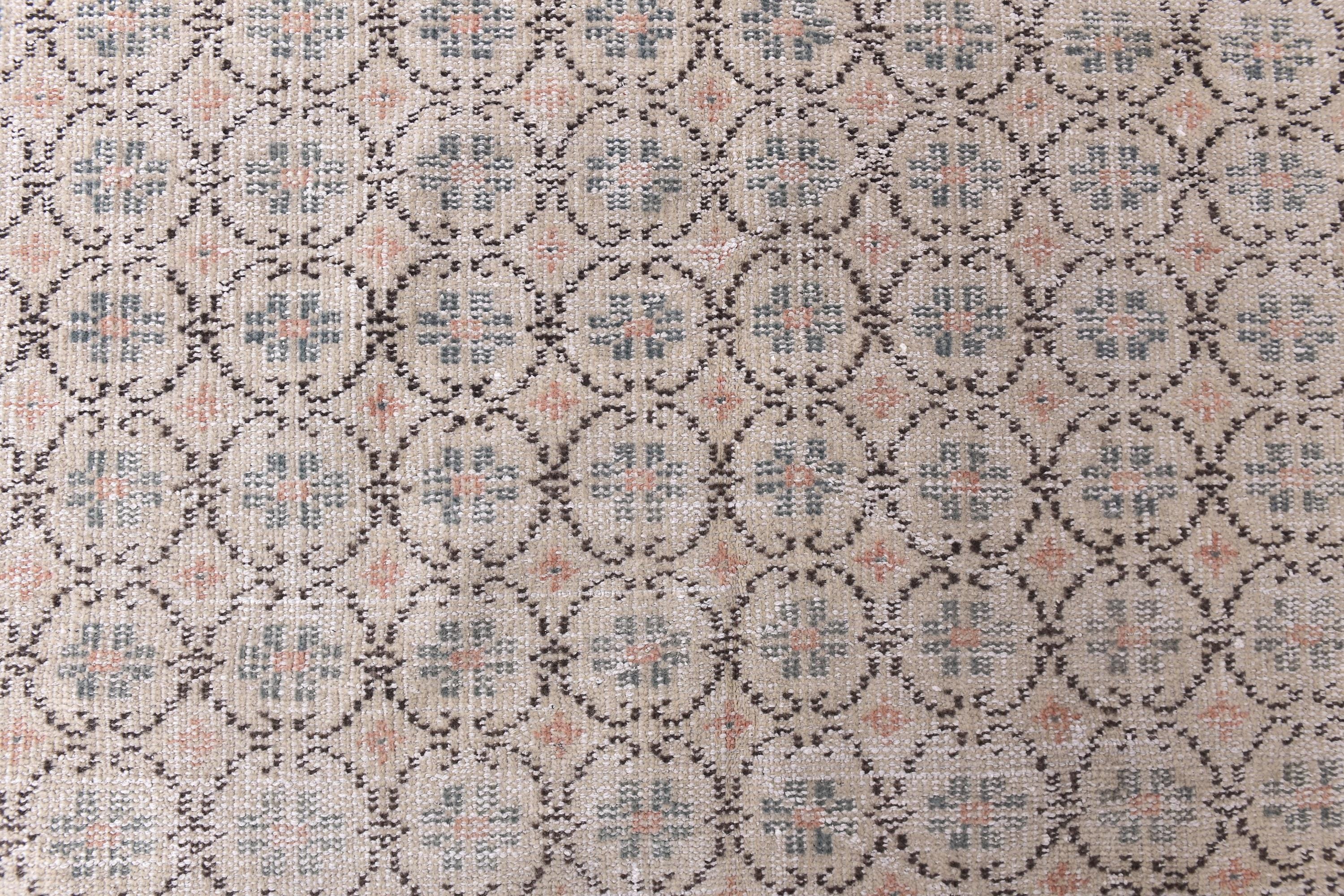 📜📌 Vintage Turkish area rug featuring an all-over geometric floral medallion pattern in muted grays, beiges, and blues on a light taupe background with a distinctive peachy-beige border. The distressed, faded appearance gives this hand-knotted wool carpet an authentic antique Oushak style perfect for bohemian or traditional interiors.