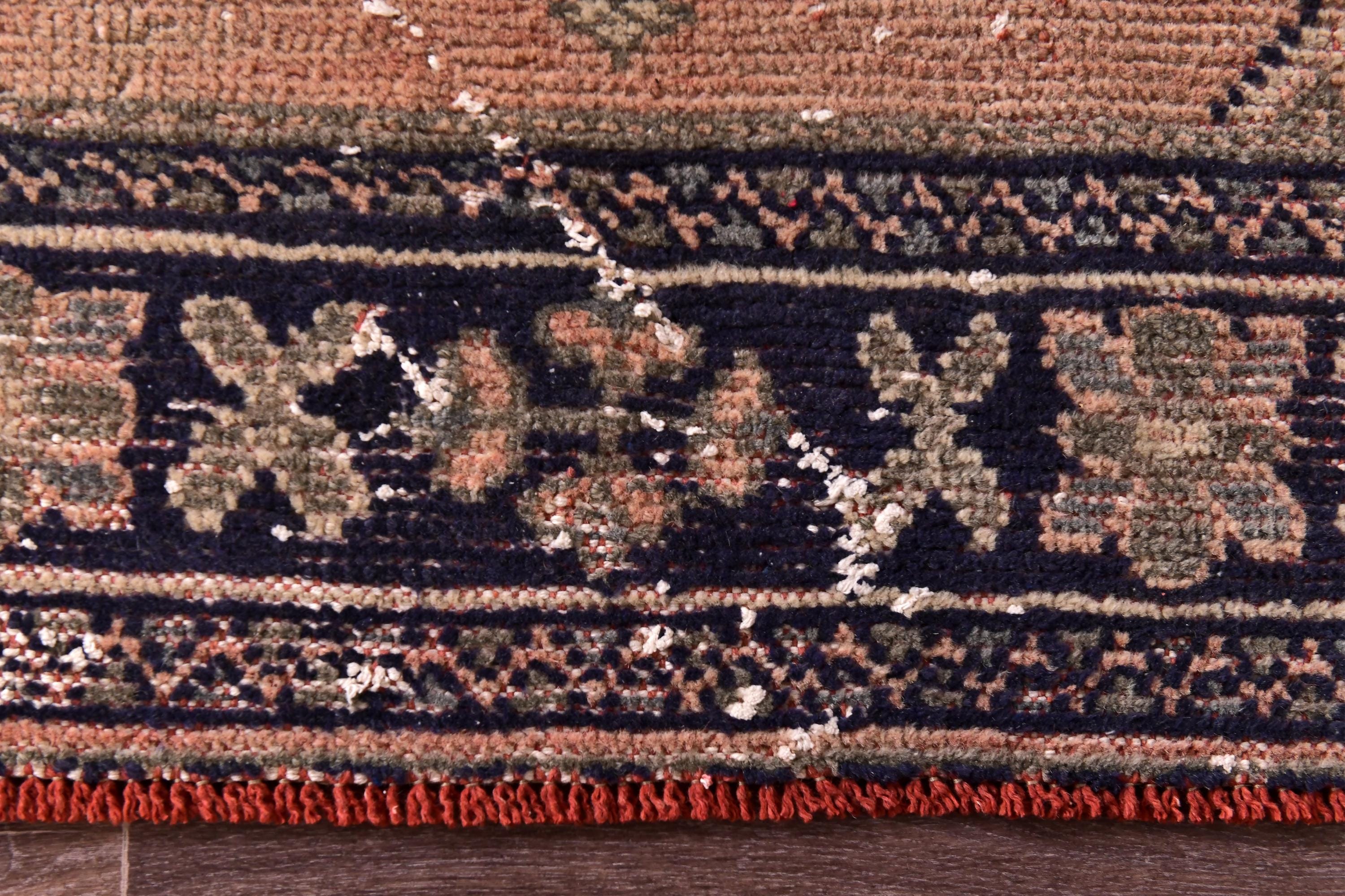 📜📌 Vintage Turkish runner rug featuring five repeating ornate medallions aligned vertically on a warm terracotta-coral background with beautiful distressed patina. The hand-knotted wool runner displays intricate floral motifs in navy blue, beige, and taupe tones, finished with a decorative navy blue border containing geometric patterns and a distinctive red-orange selvage edge.