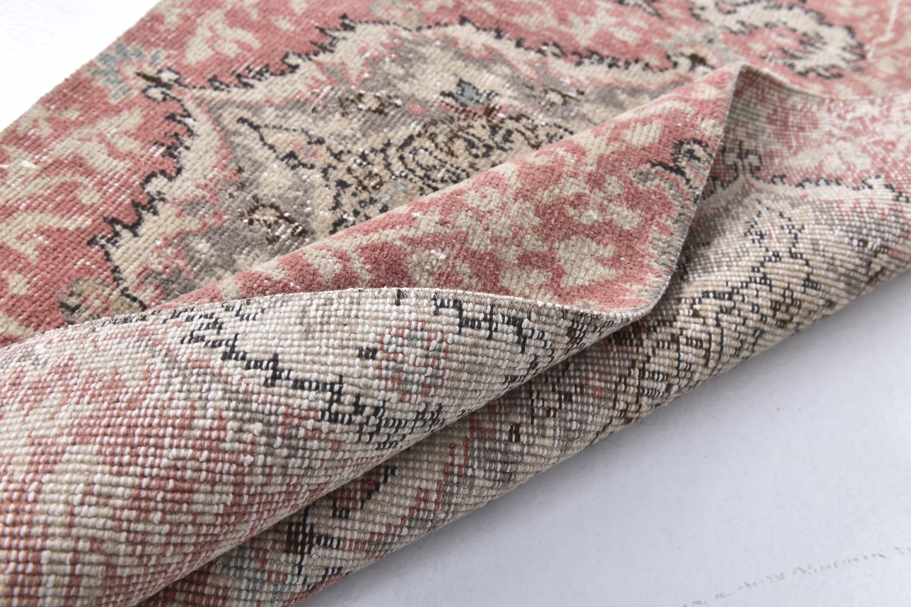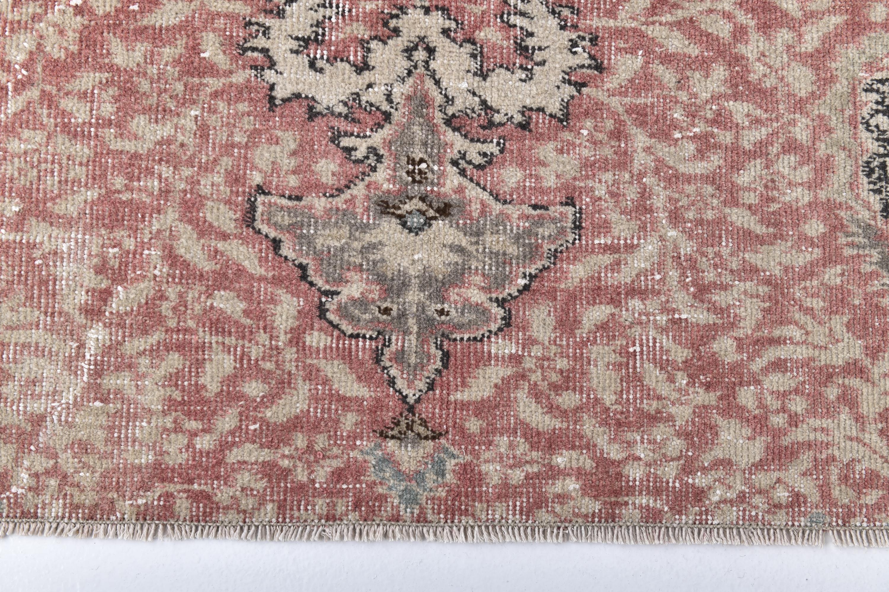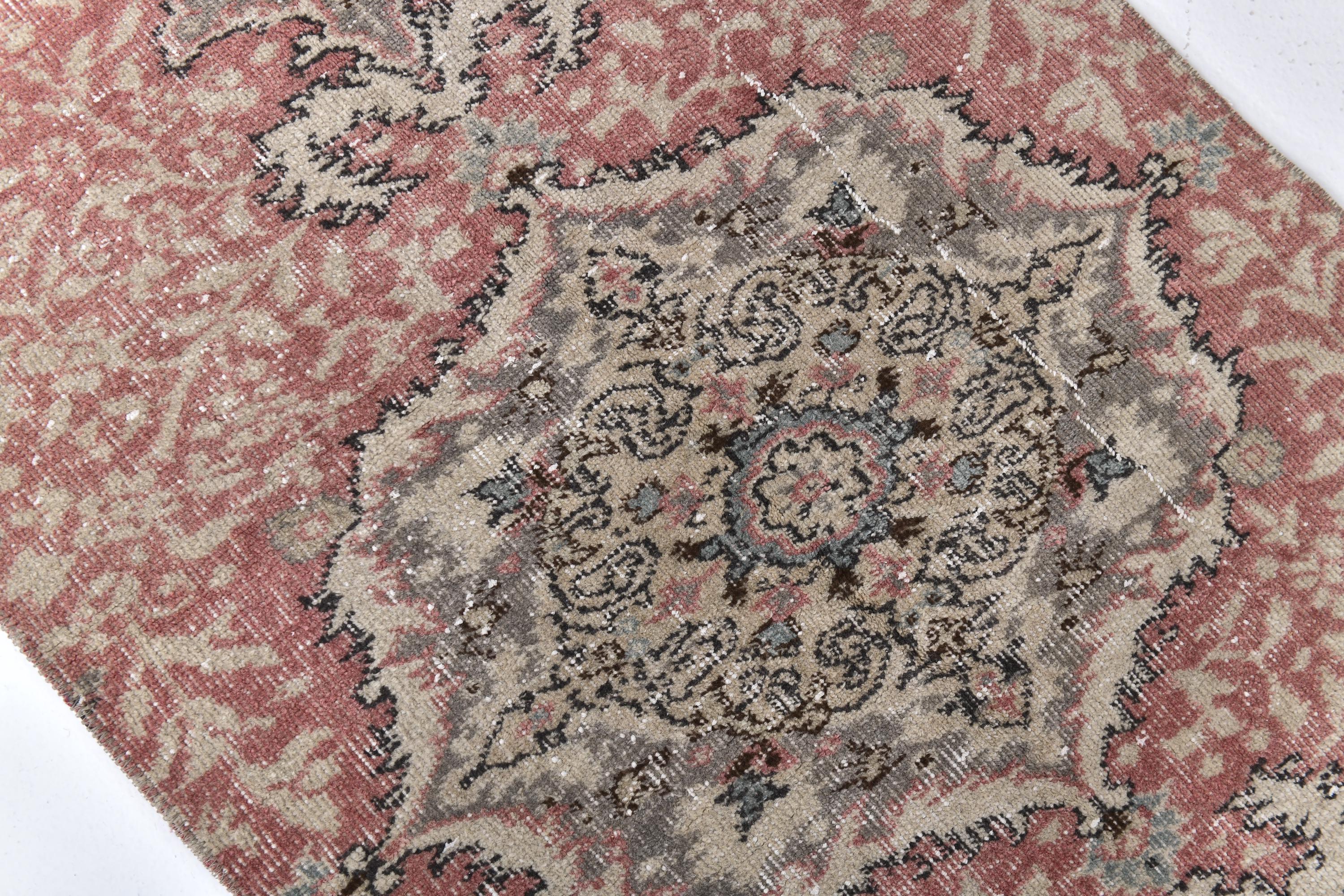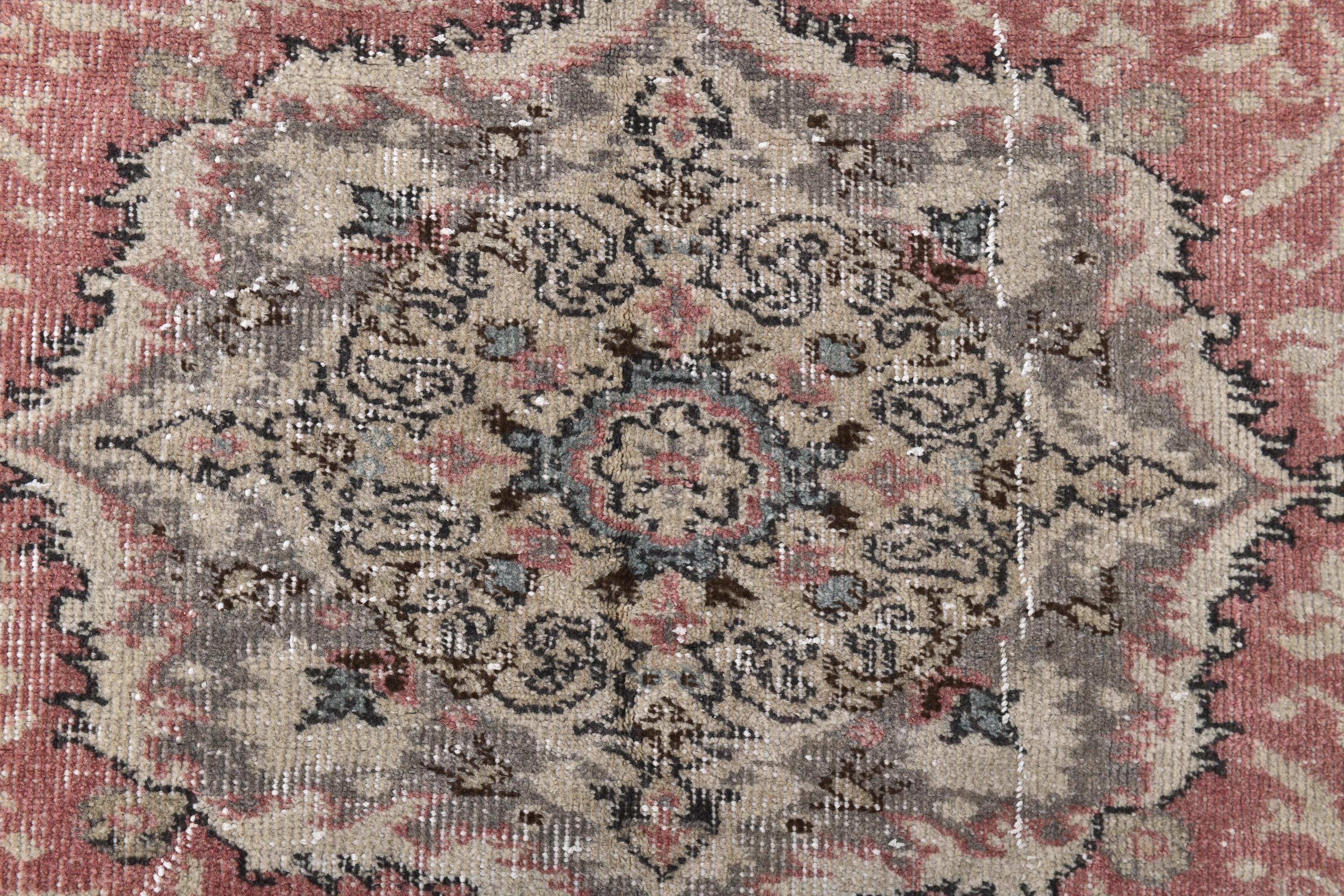 📜📌 A vintage Turkish Oushak small area rug featuring a coral pink background with an ornate beige central medallion design. The hand-knotted wool rug displays intricate floral motifs with corner spandrels in cream and gray tones. The distressed, faded appearance showcases natural aging with worn edges and a soft vintage patina characteristic of authentic Anatolian textiles.