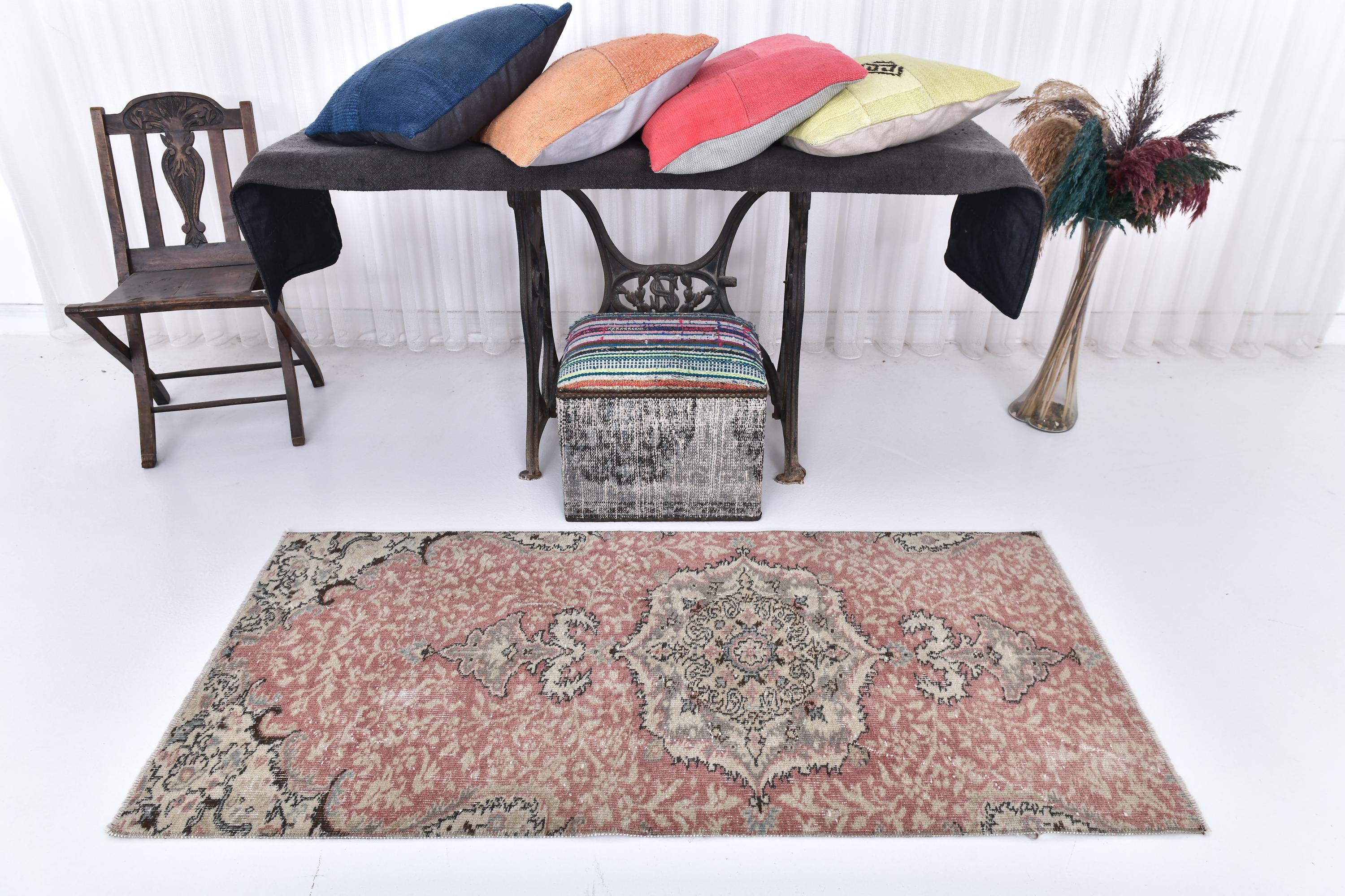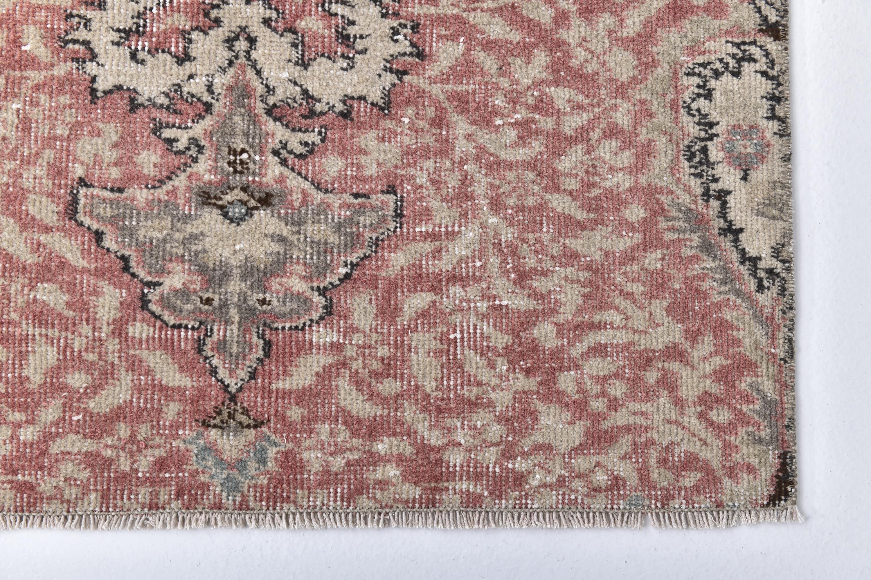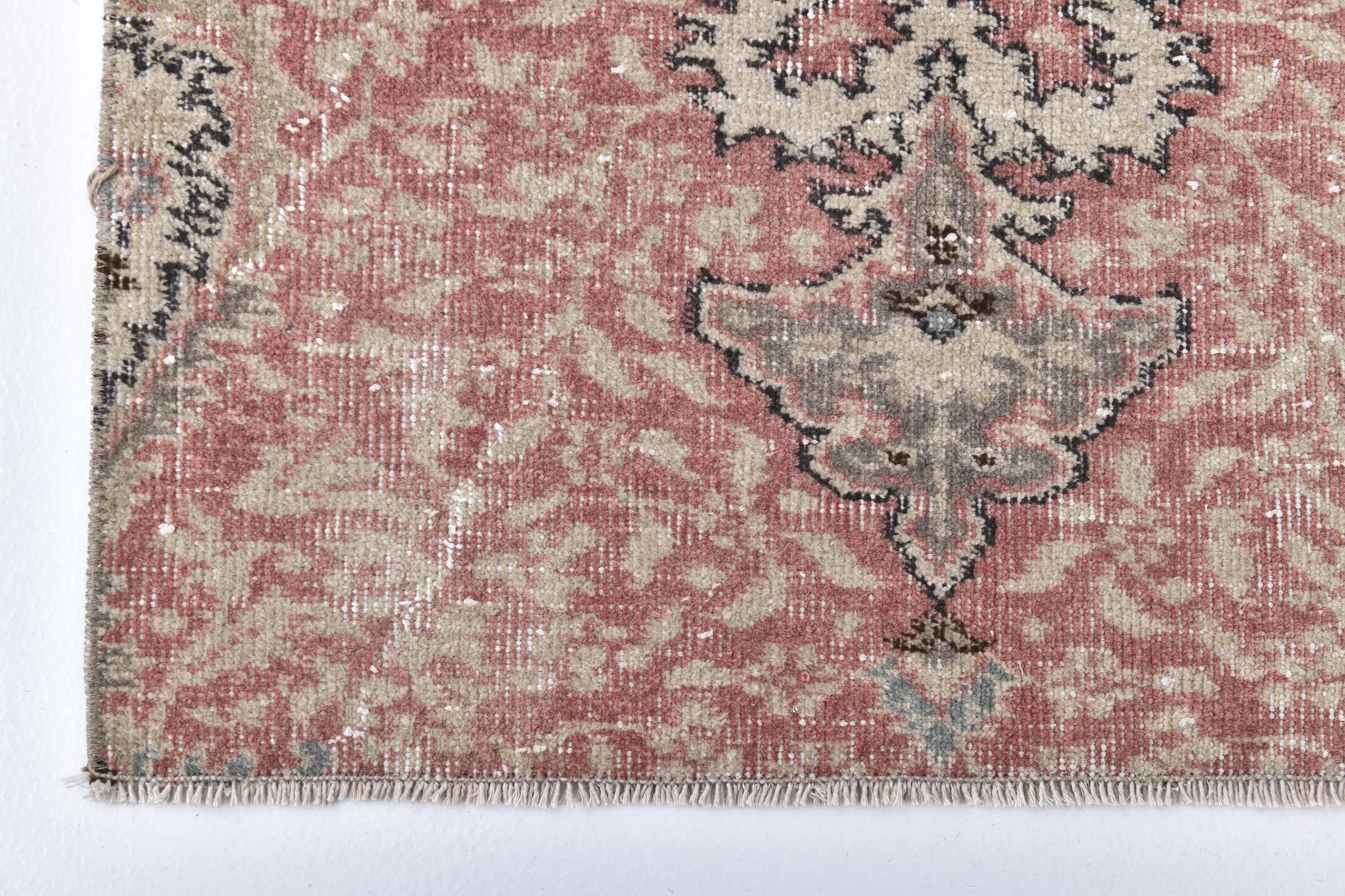 📜📌 A vintage Turkish Oushak small area rug featuring a coral pink background with an ornate beige central medallion design. The hand-knotted wool rug displays intricate floral motifs with corner spandrels in cream and gray tones. The distressed, faded appearance showcases natural aging with worn edges and a soft vintage patina characteristic of authentic Anatolian textiles.