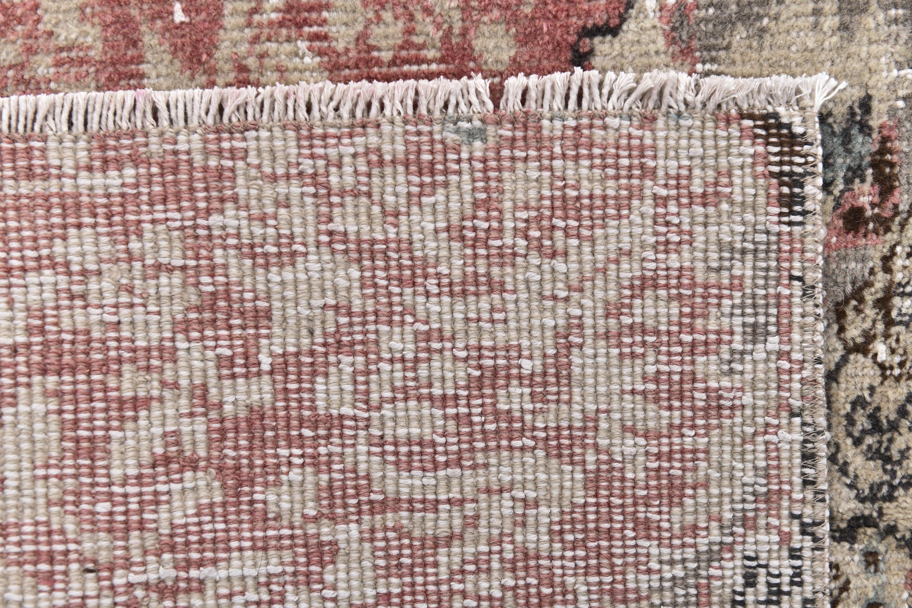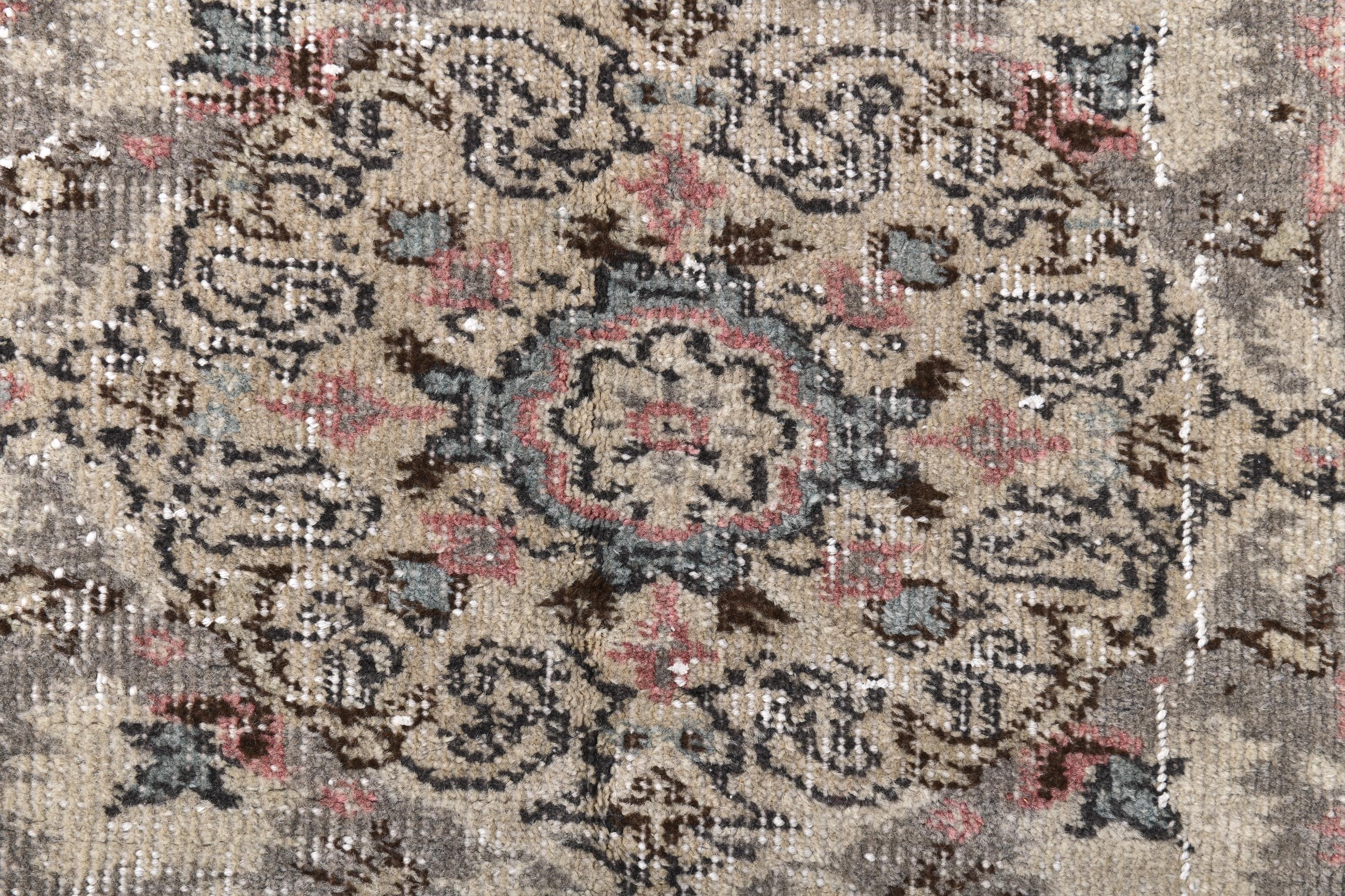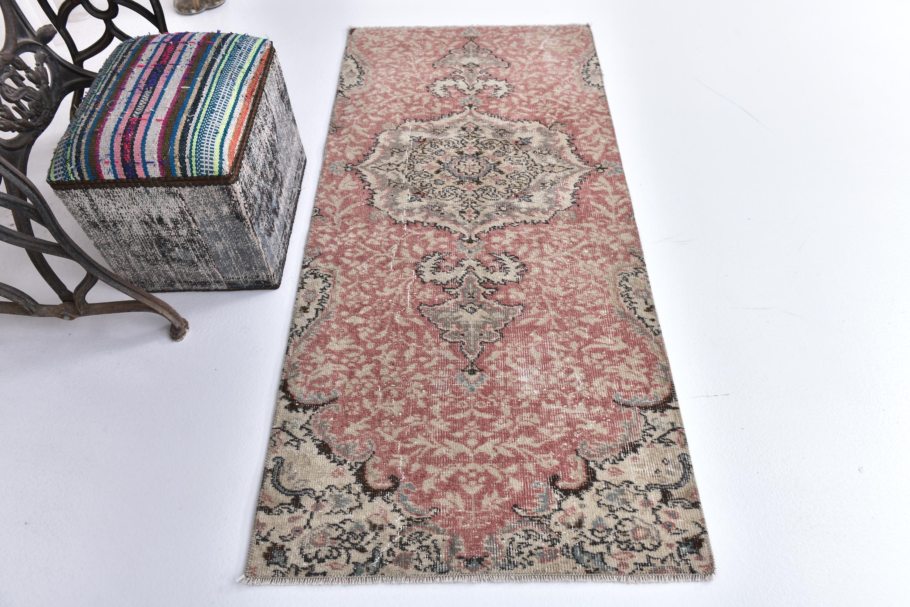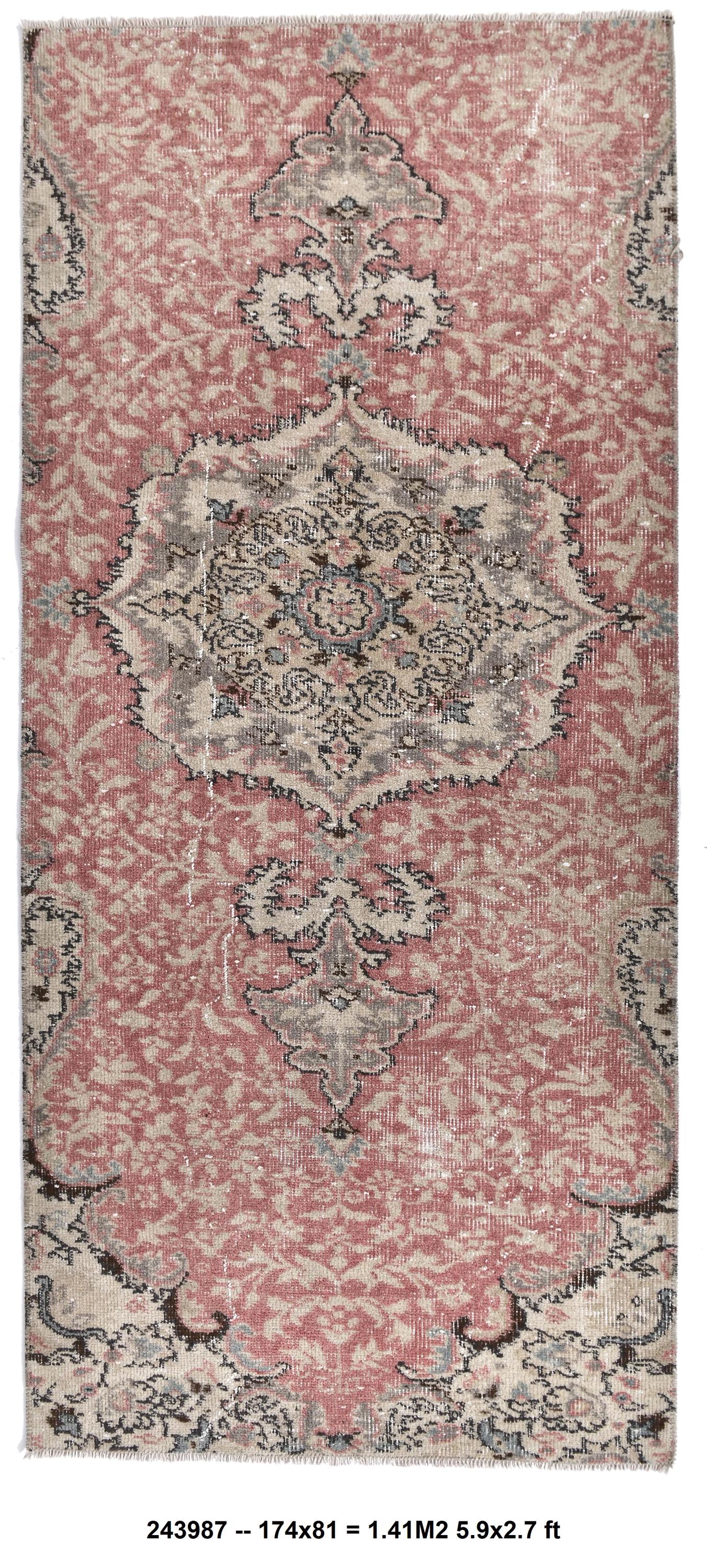 📜📌 A vintage Turkish Oushak small area rug featuring a coral pink background with an ornate beige central medallion design. The hand-knotted wool rug displays intricate floral motifs with corner spandrels in cream and gray tones. The distressed, faded appearance showcases natural aging with worn edges and a soft vintage patina characteristic of authentic Anatolian textiles.