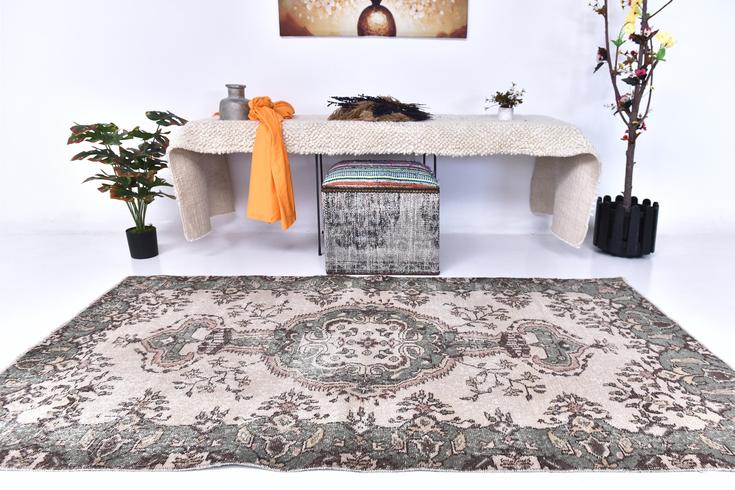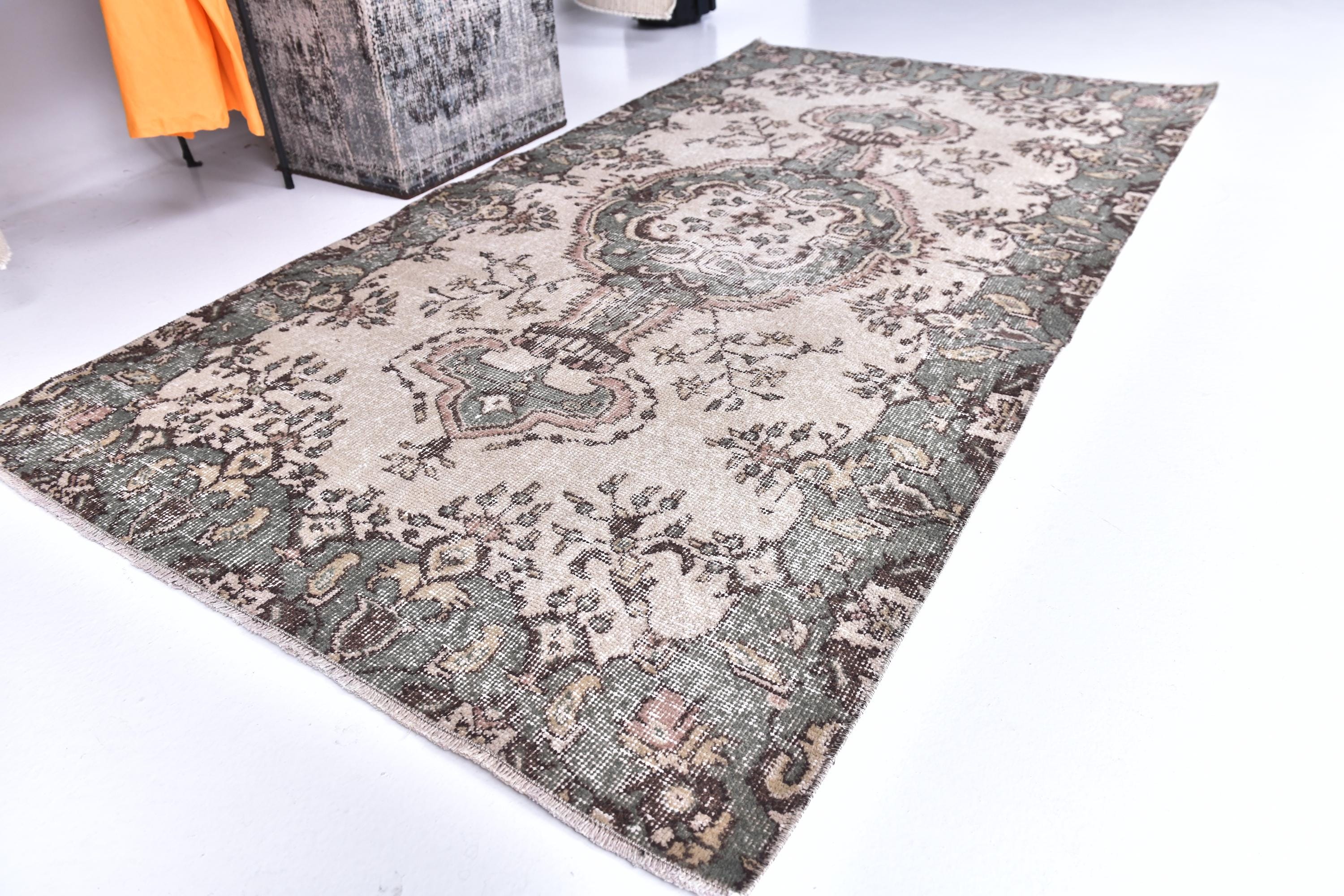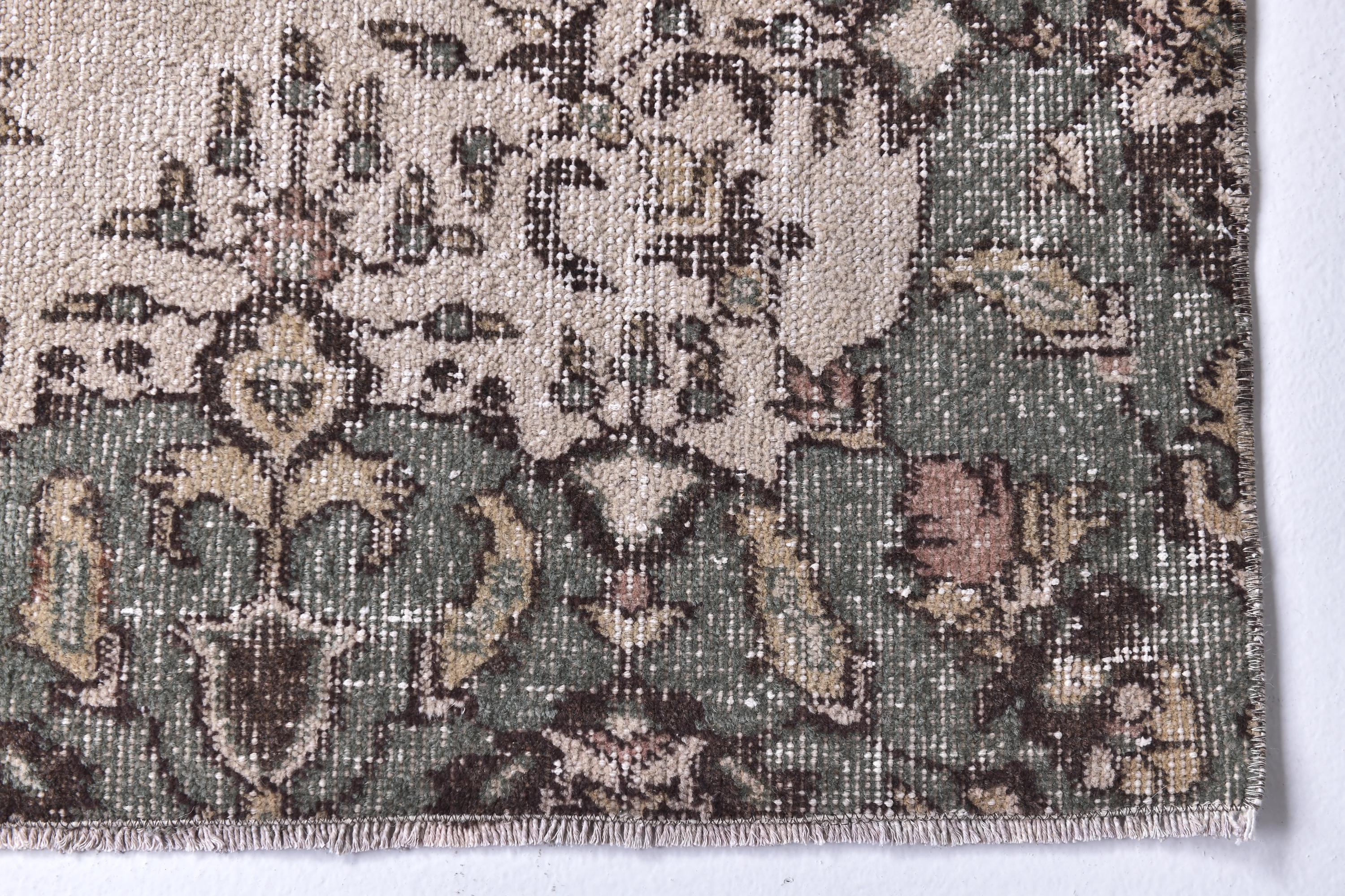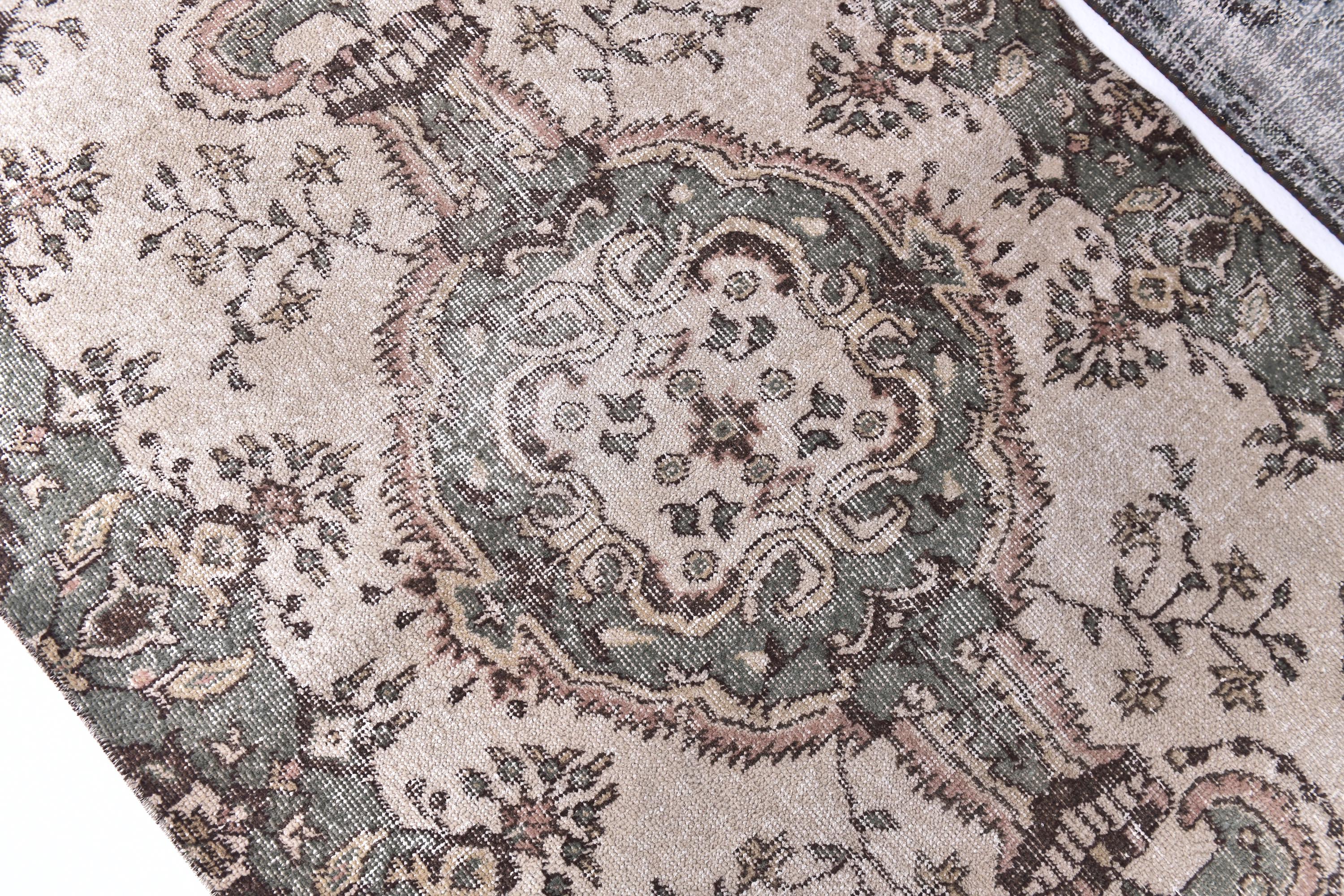 📜📌 An antique Turkish rug with overdyed treatment in neutral gray, sage green, and cream colors showcasing traditional Persian-inspired medallion design. The vintage wool carpet features delicate floral motifs, curved vines, and symmetrical patterns throughout. The deliberately faded finish with visible texture reveals authentic hand-knotted construction, ideal for adding subtle elegance to modern, transitional, or bohemian spaces.