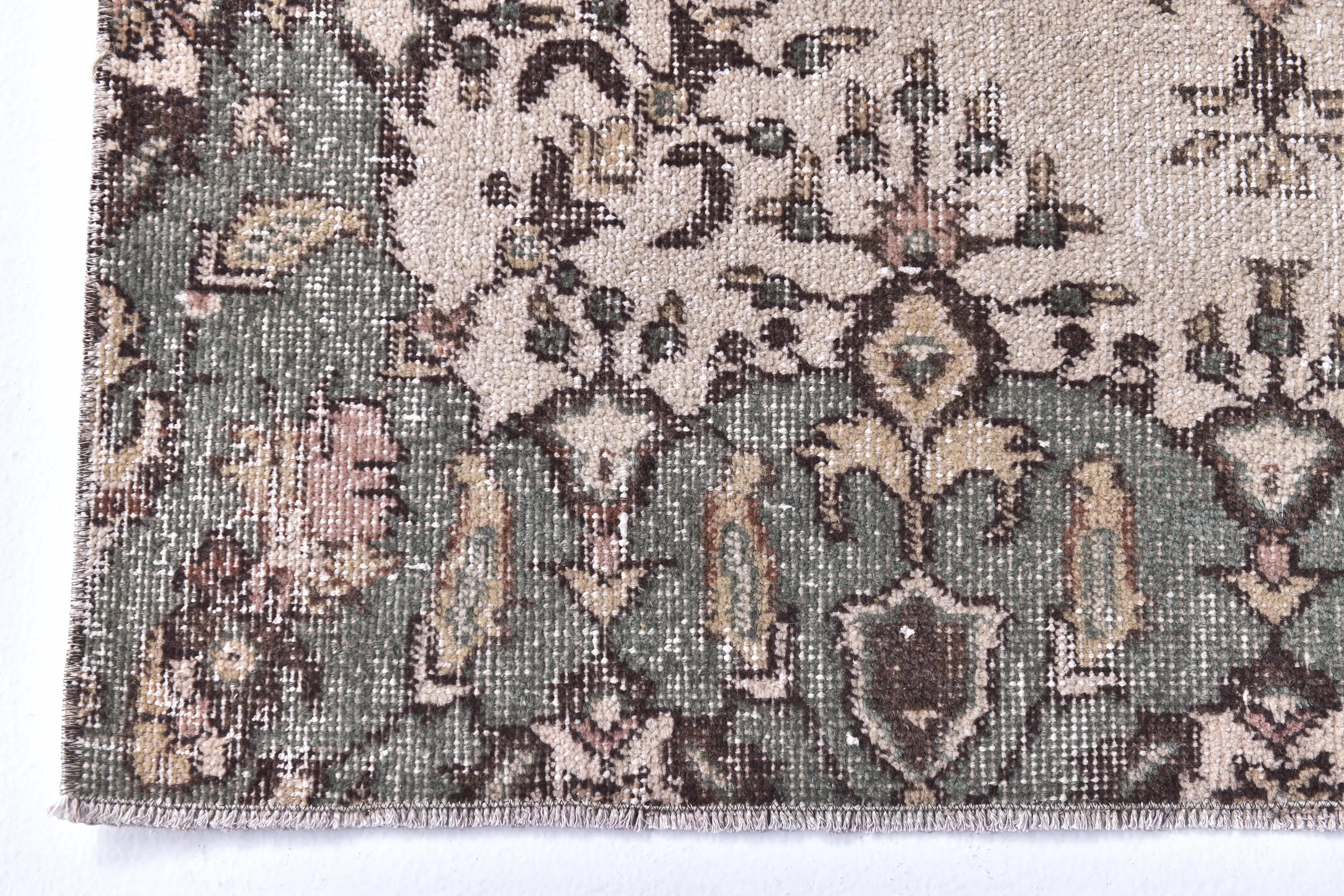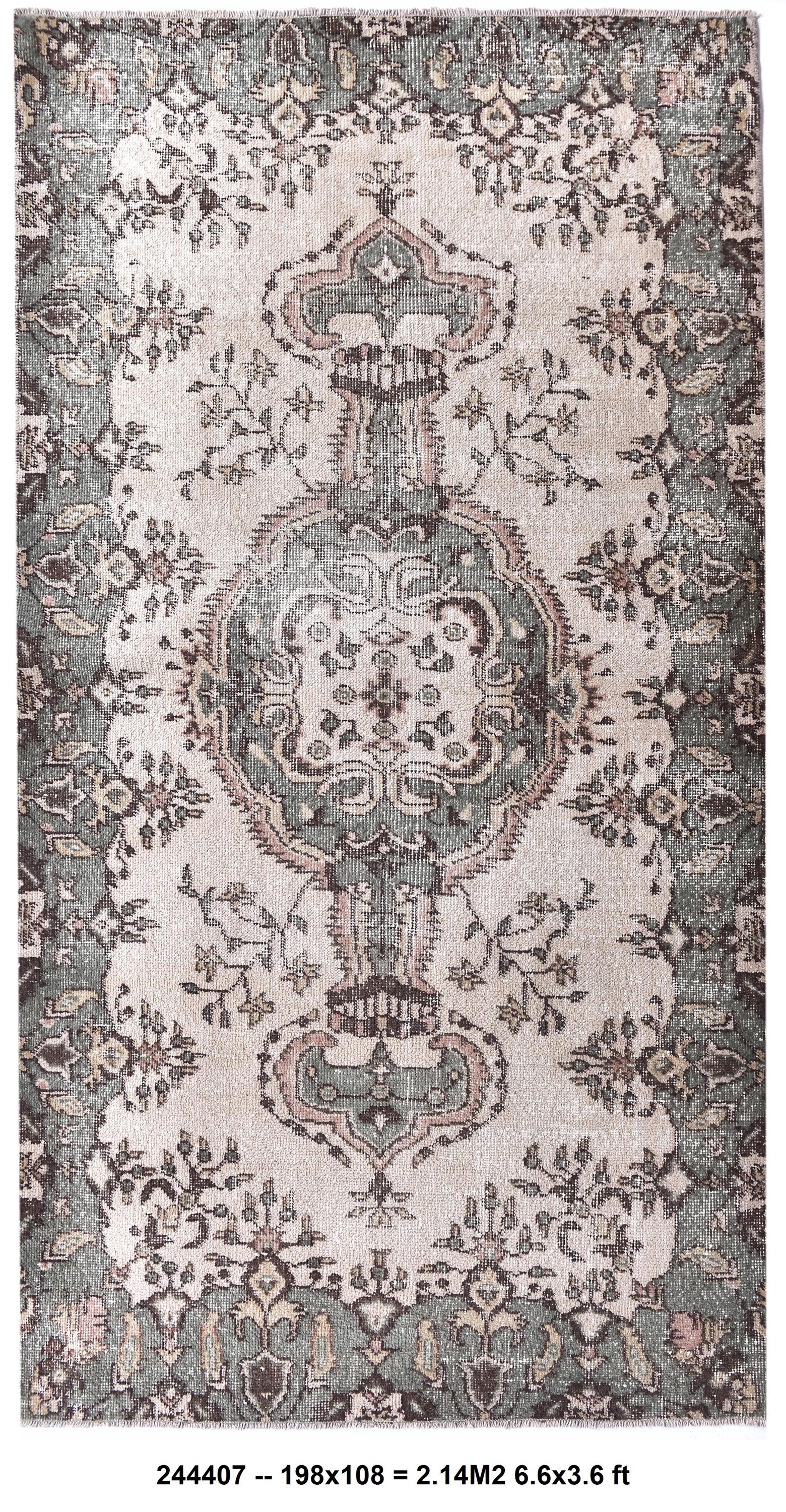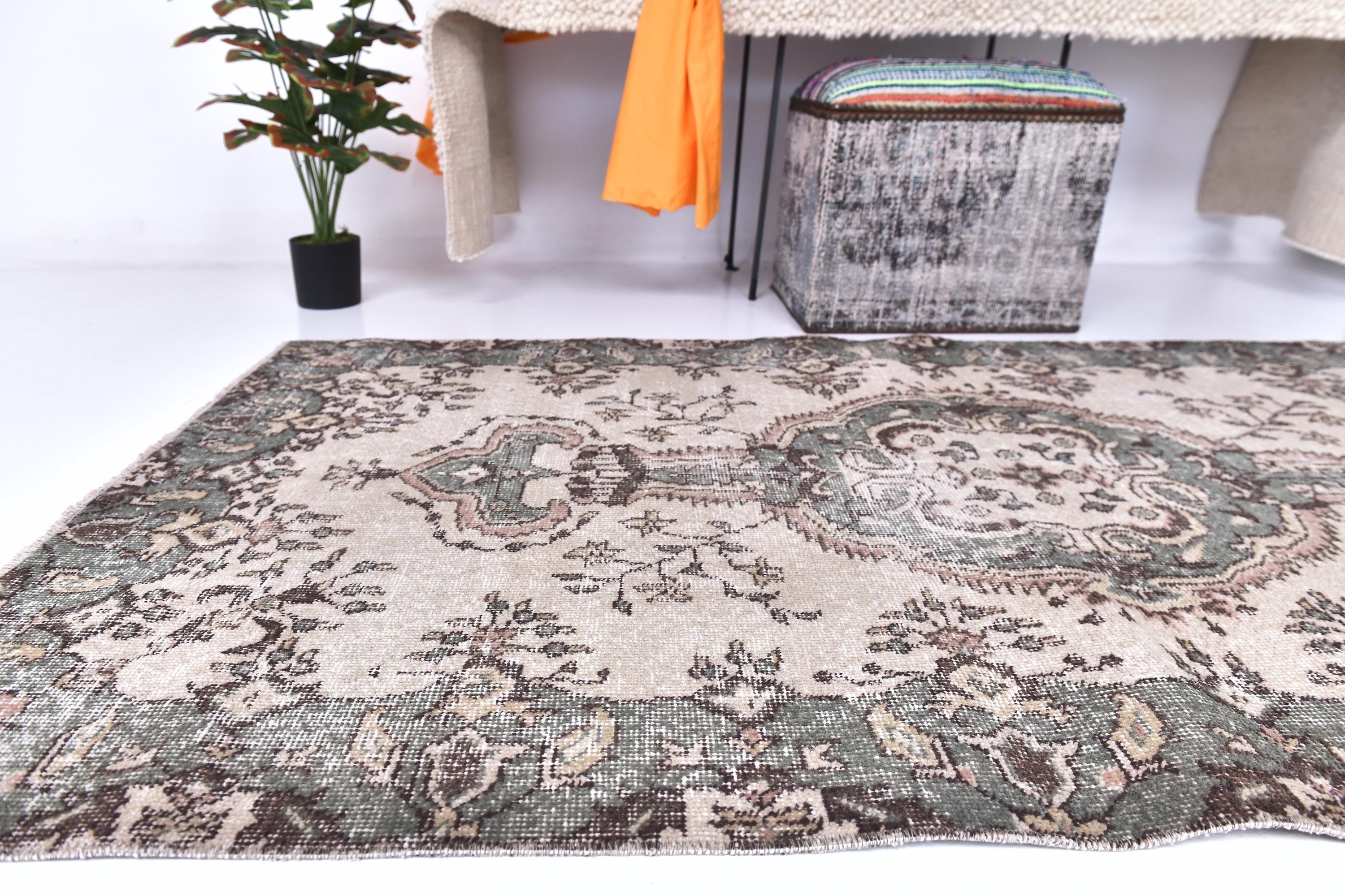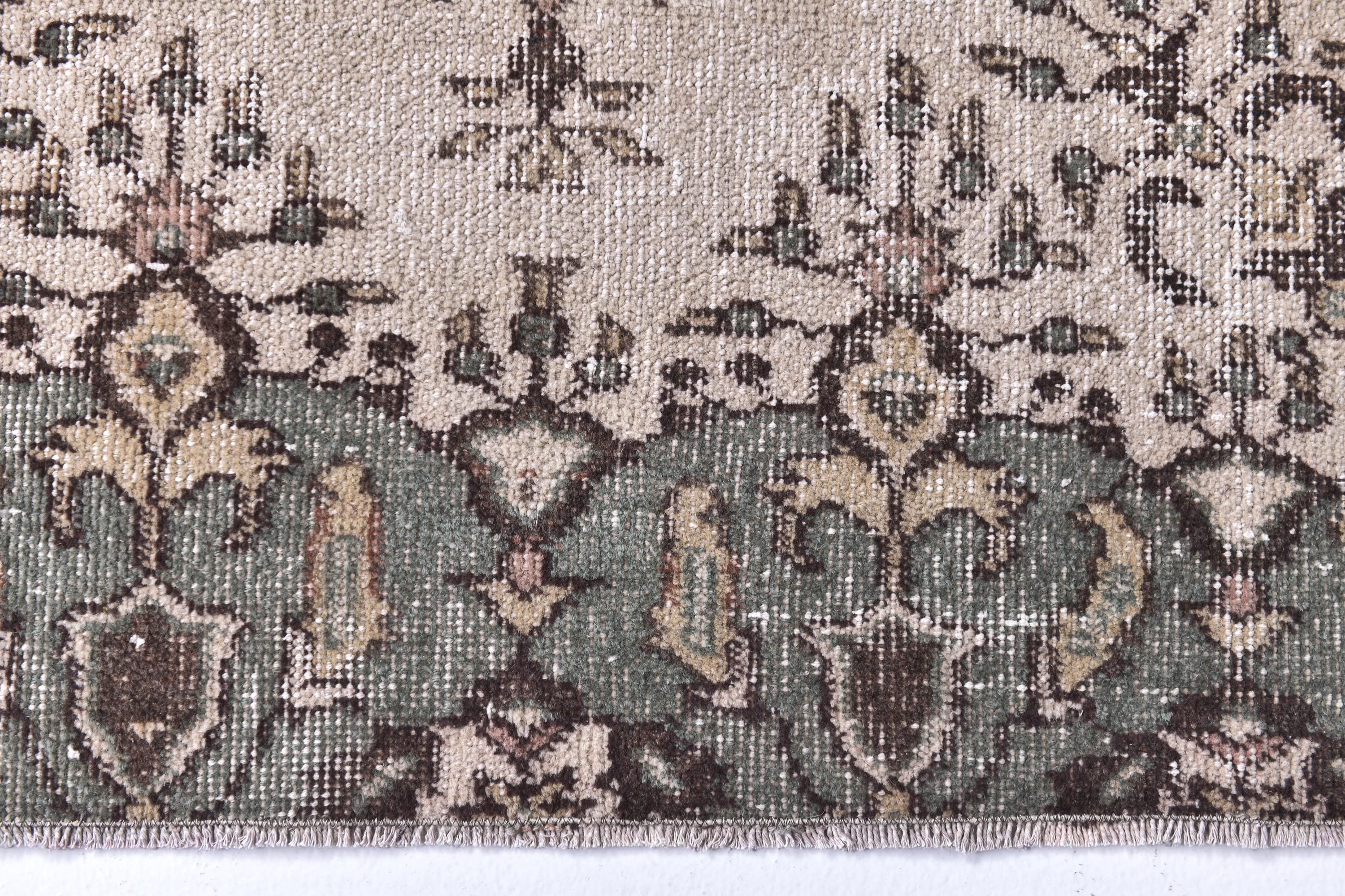📜📌 An antique Turkish rug with overdyed treatment in neutral gray, sage green, and cream colors showcasing traditional Persian-inspired medallion design. The vintage wool carpet features delicate floral motifs, curved vines, and symmetrical patterns throughout. The deliberately faded finish with visible texture reveals authentic hand-knotted construction, ideal for adding subtle elegance to modern, transitional, or bohemian spaces.