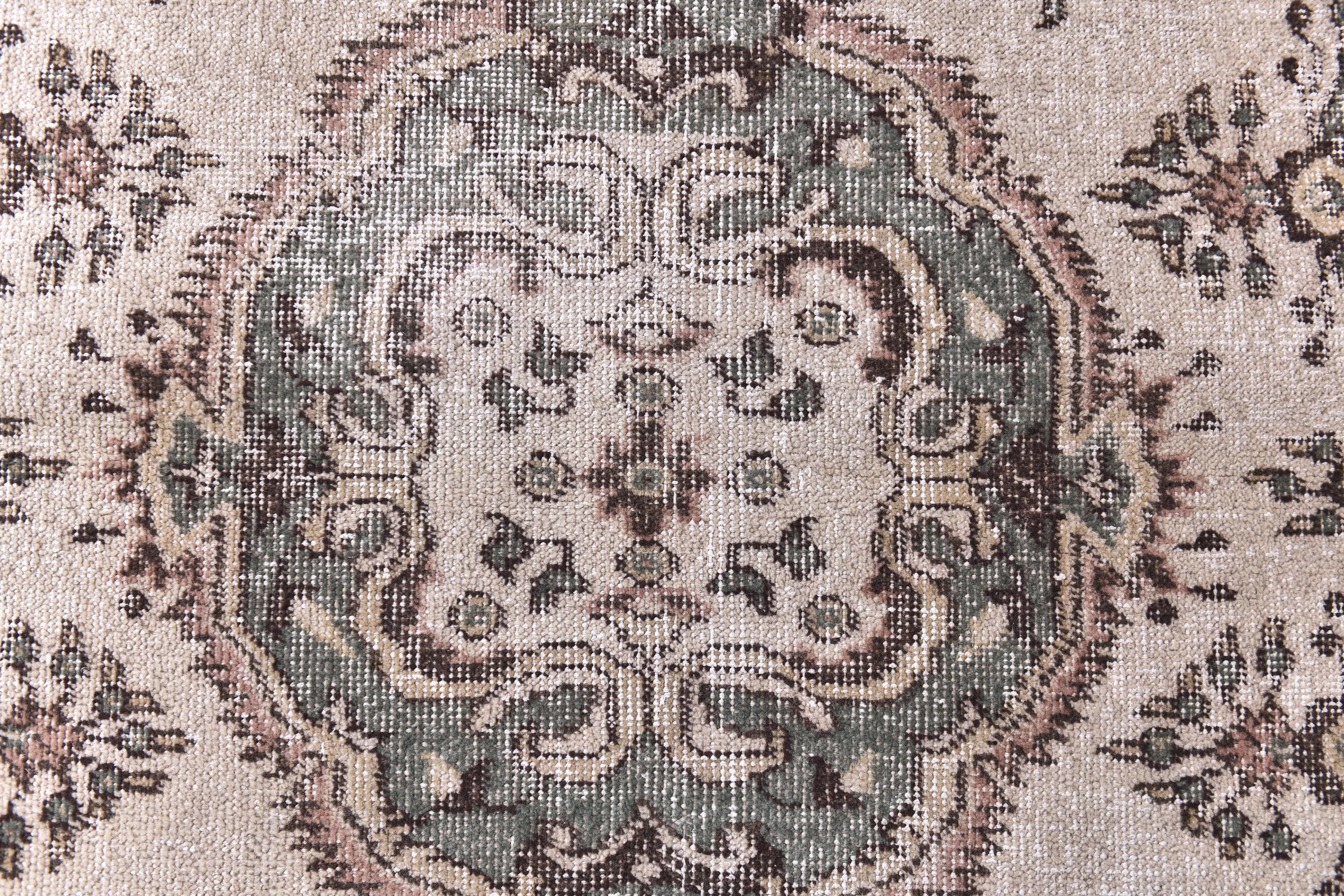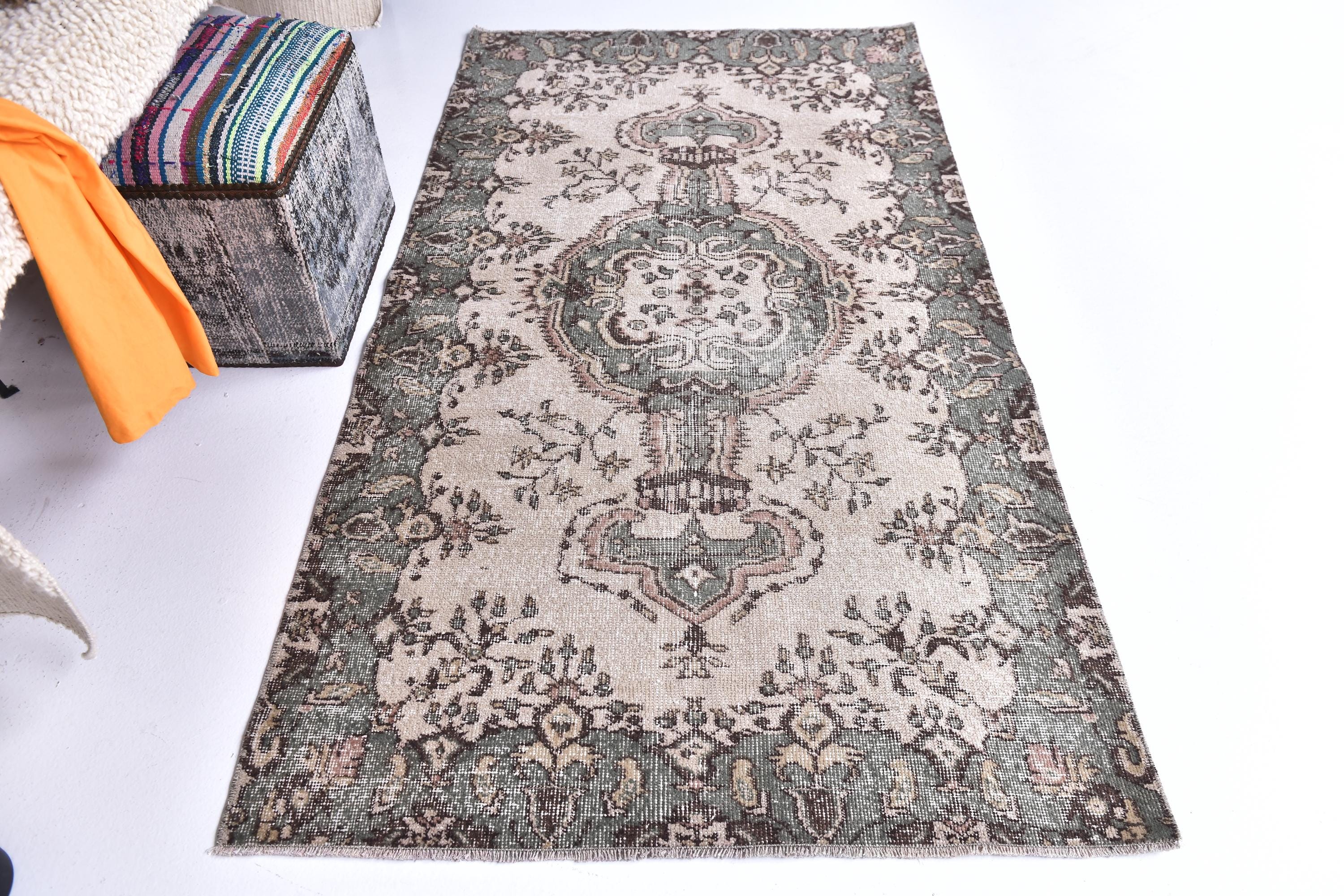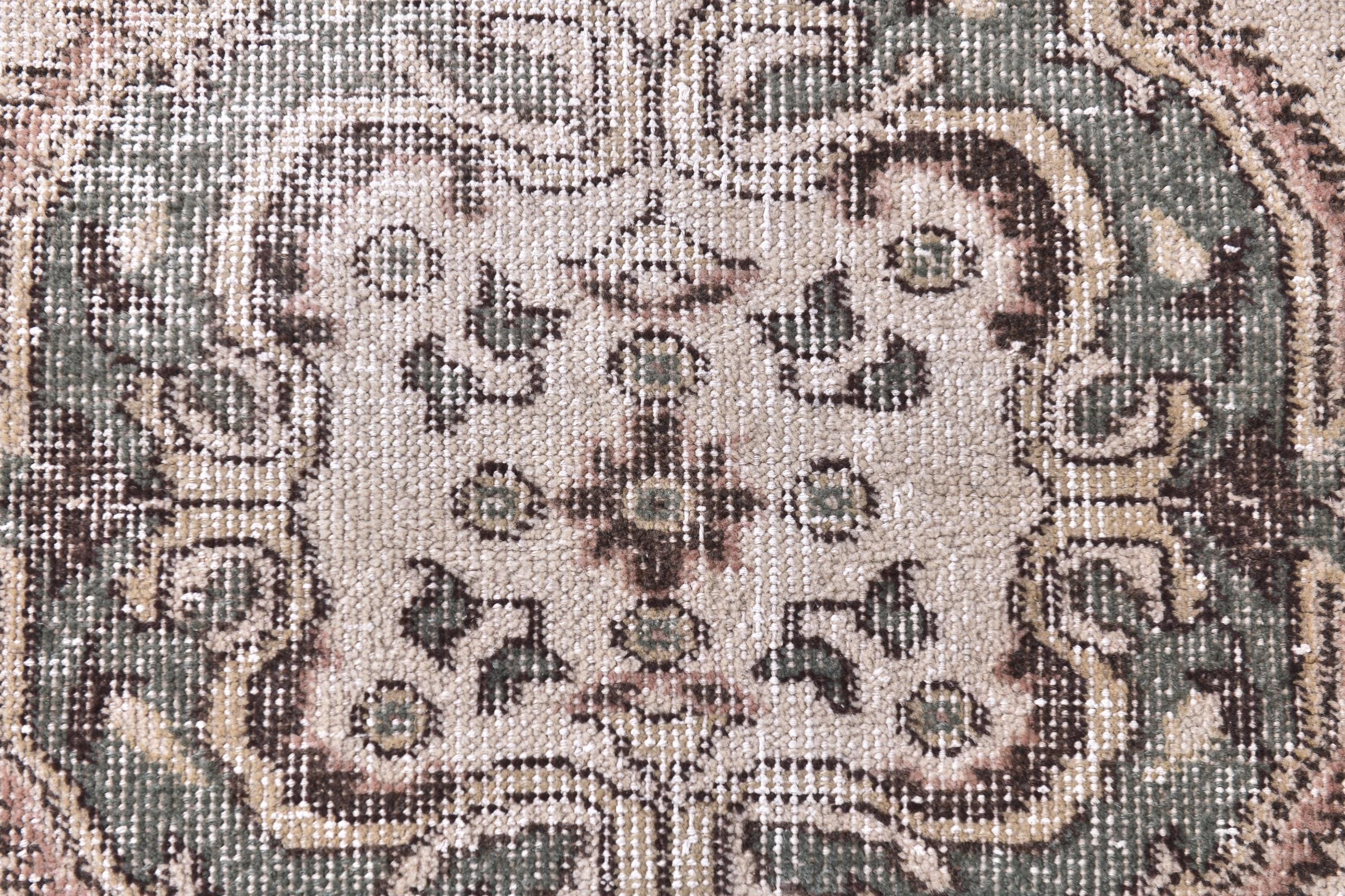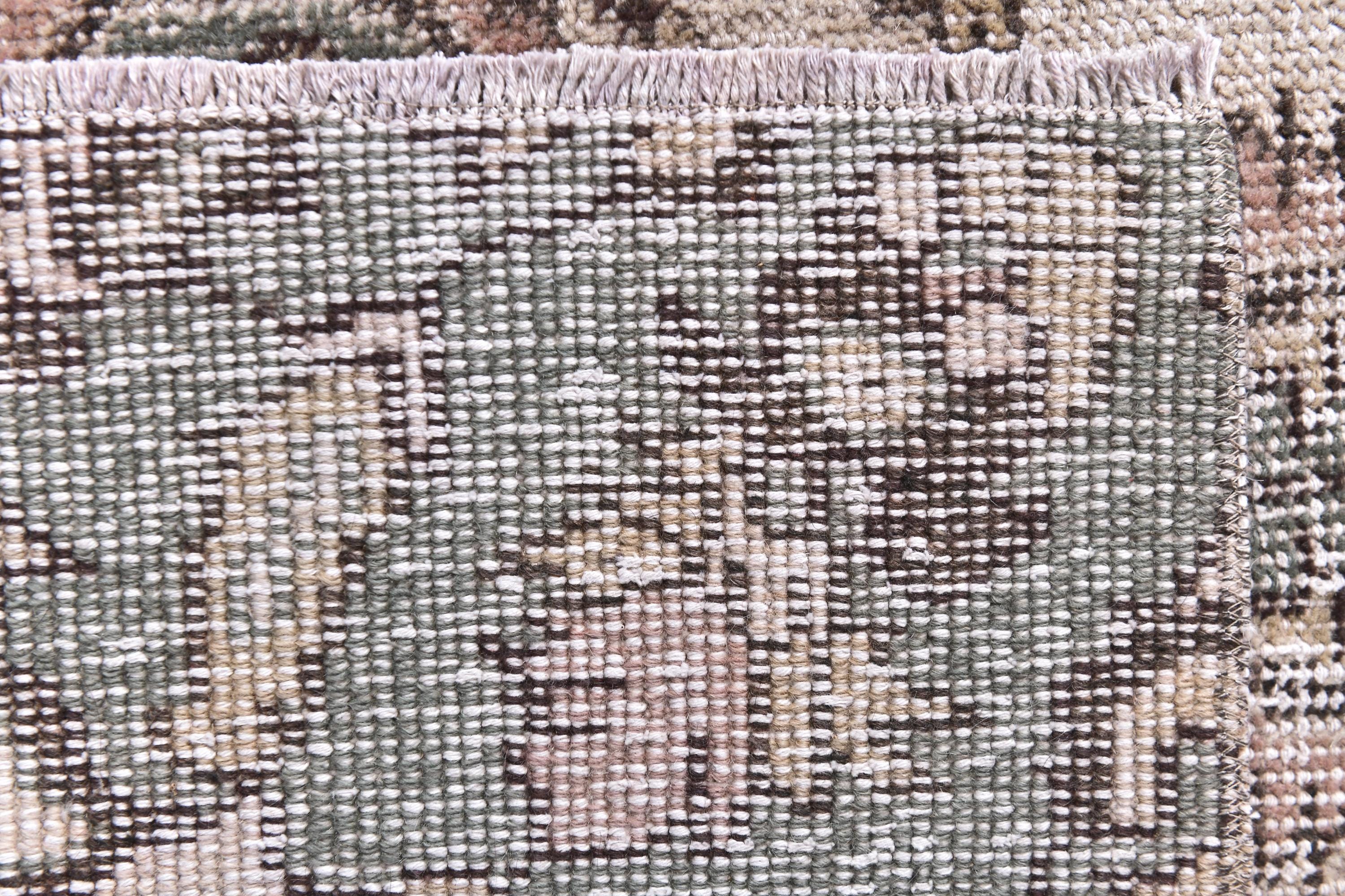 📜📌 An antique Turkish rug with overdyed treatment in neutral gray, sage green, and cream colors showcasing traditional Persian-inspired medallion design. The vintage wool carpet features delicate floral motifs, curved vines, and symmetrical patterns throughout. The deliberately faded finish with visible texture reveals authentic hand-knotted construction, ideal for adding subtle elegance to modern, transitional, or bohemian spaces.
