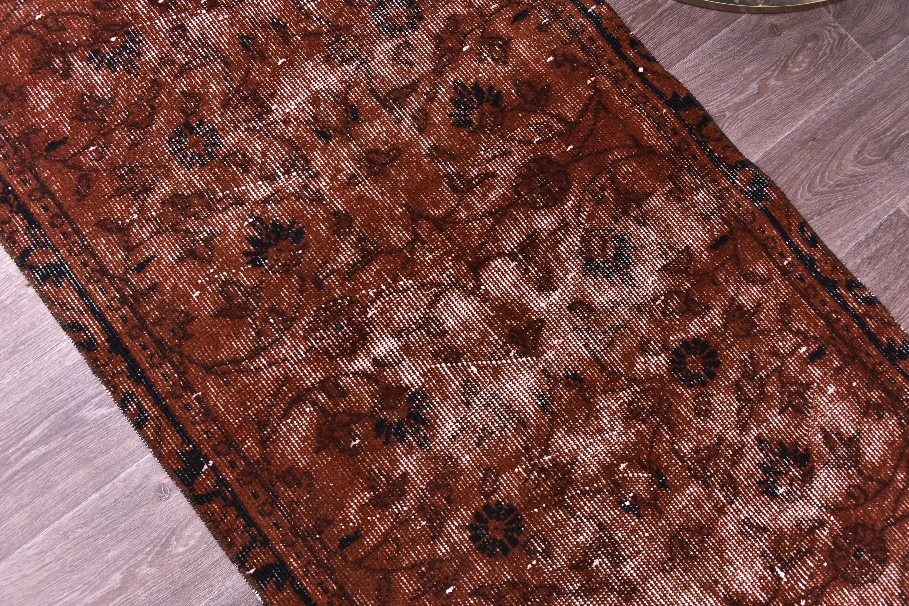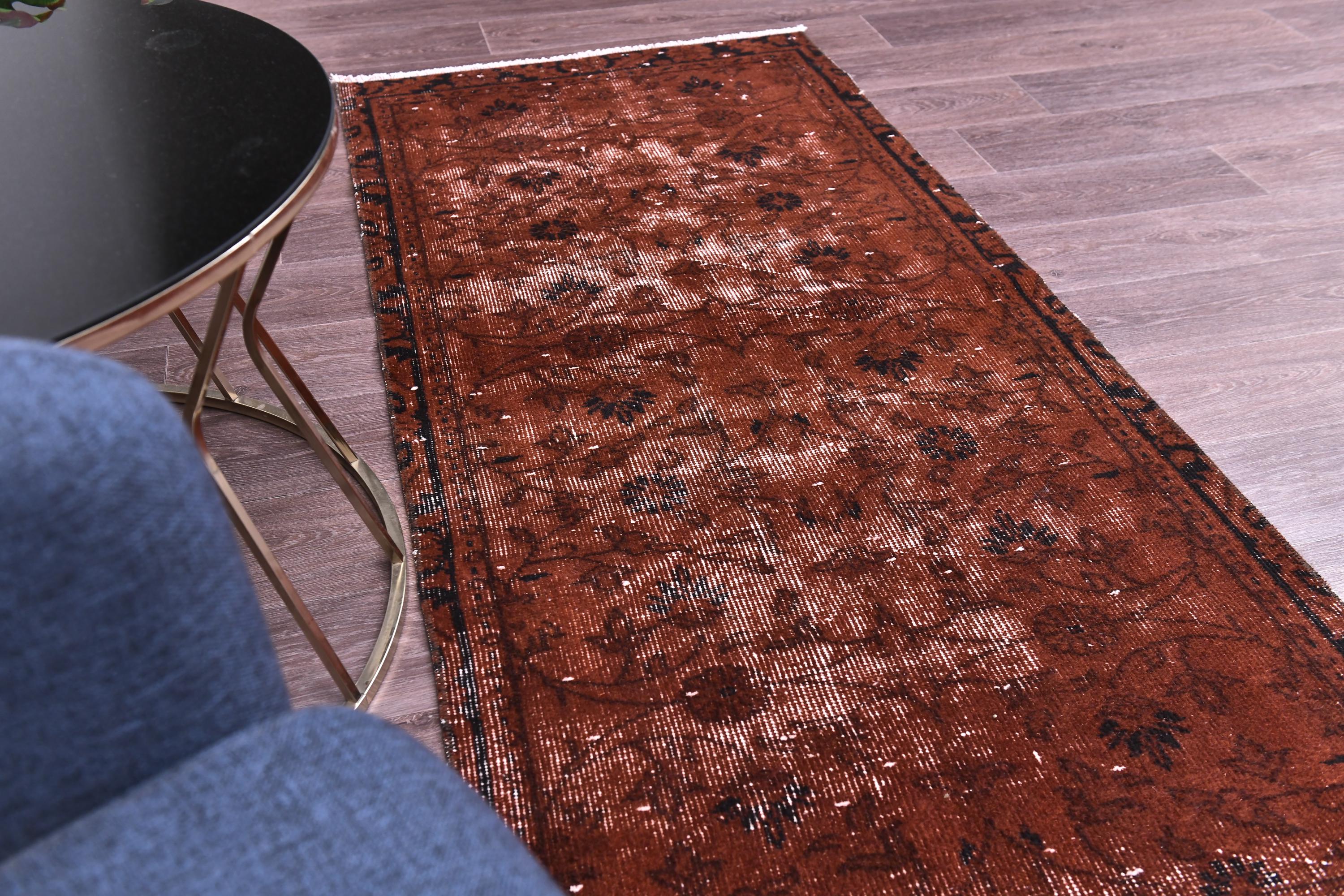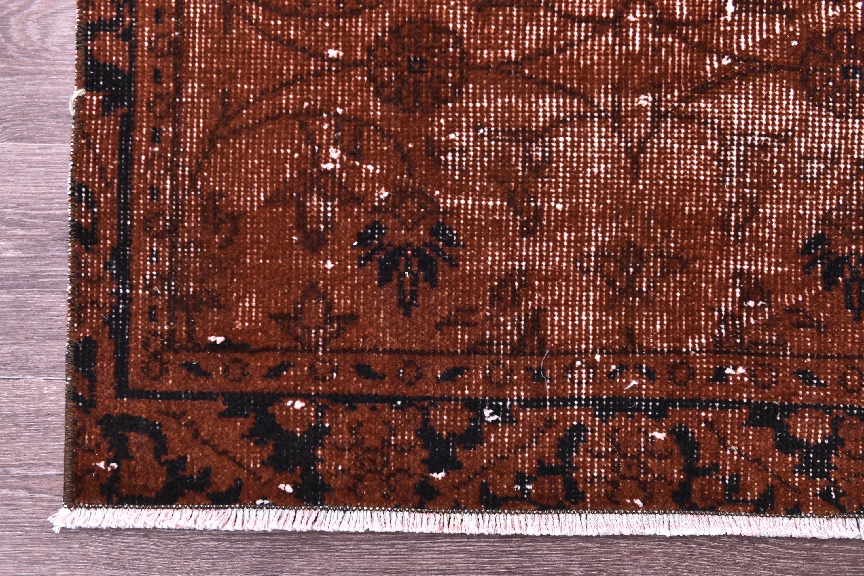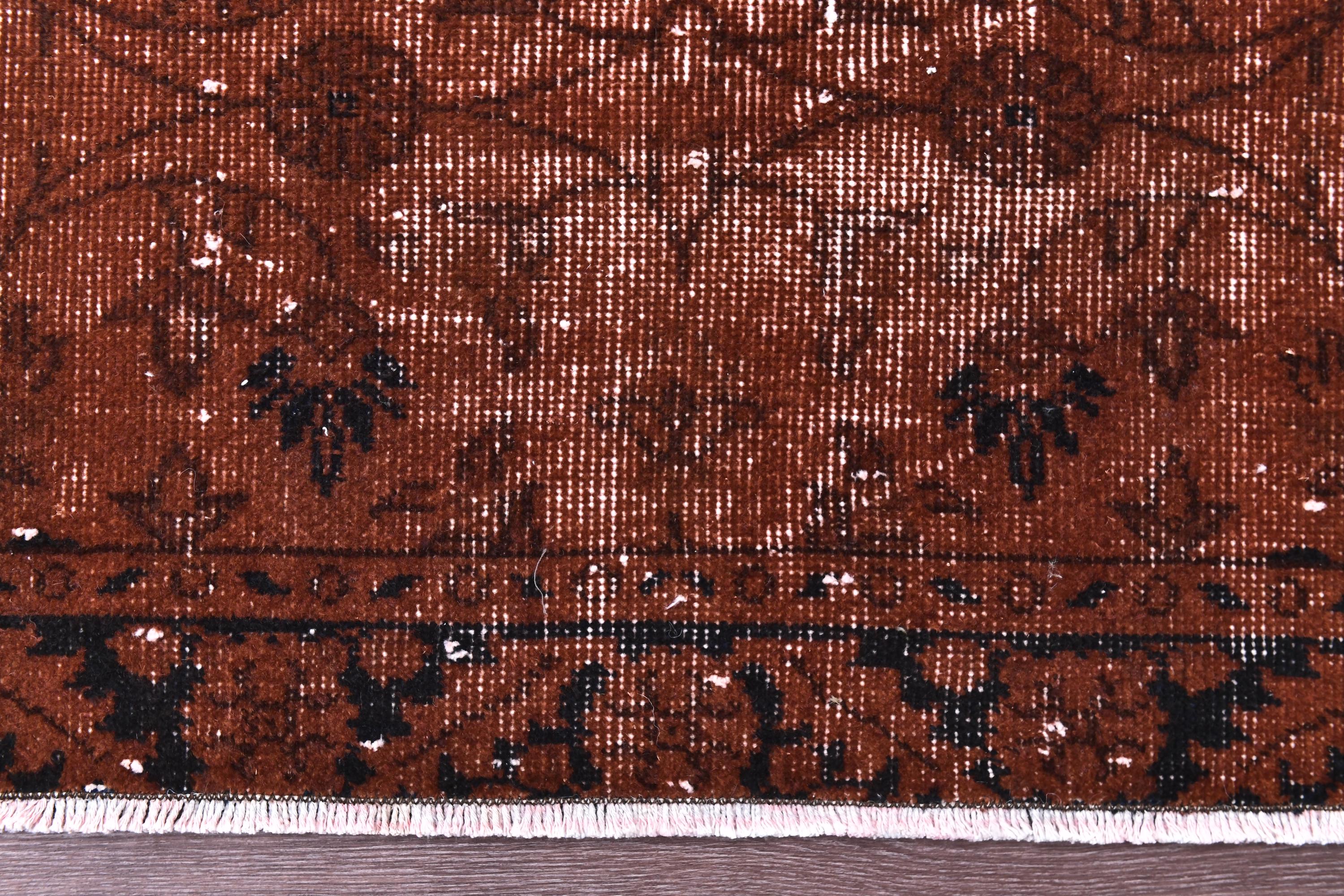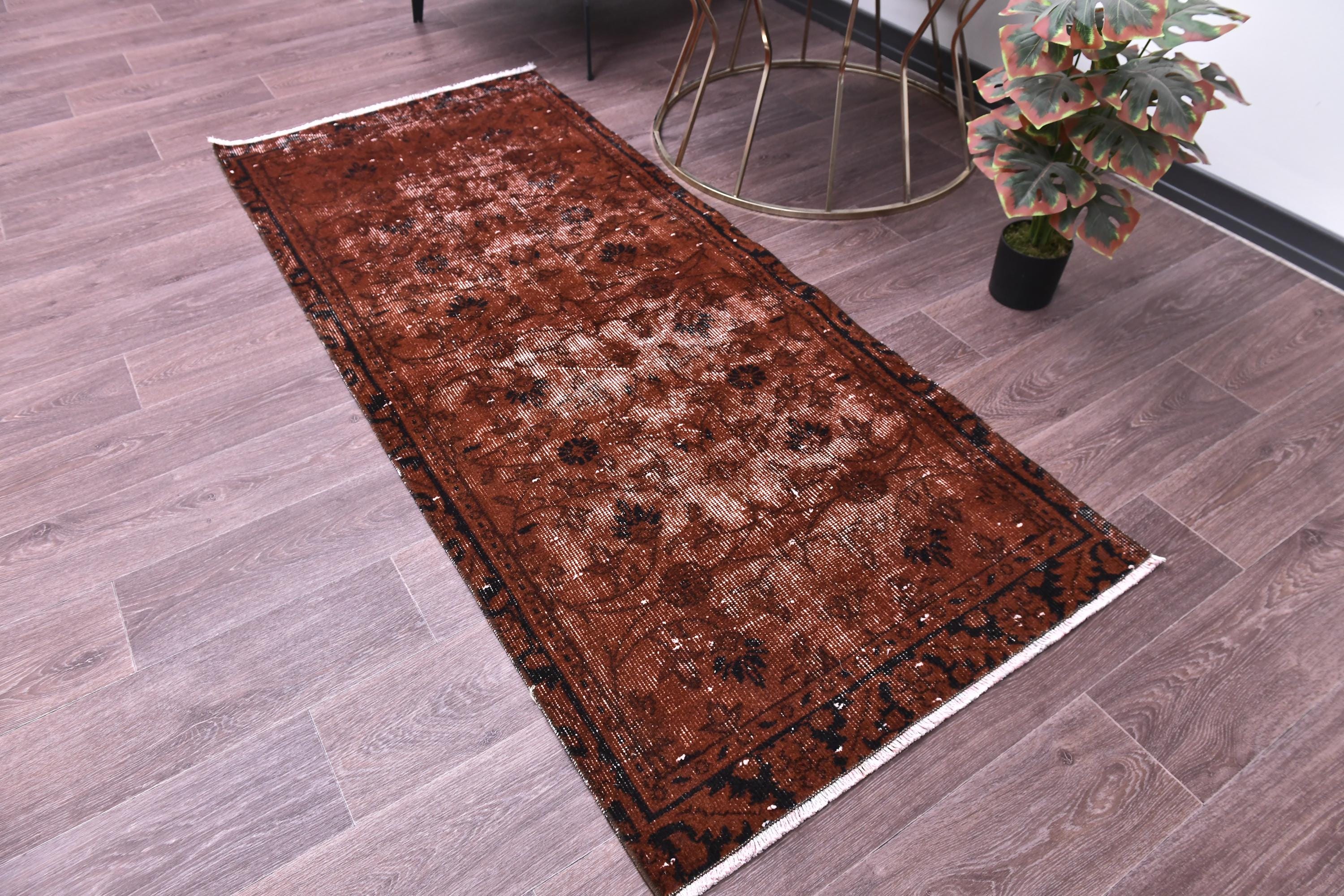 📜📌Vintage overdyed Turkish runner rug in rich Burgundy rust brown and burnt orange tones with distressed traditional floral medallion pattern, dark border accents, hand-knotted wool construction with visible patina, featuring fringed edges on gray wood floor