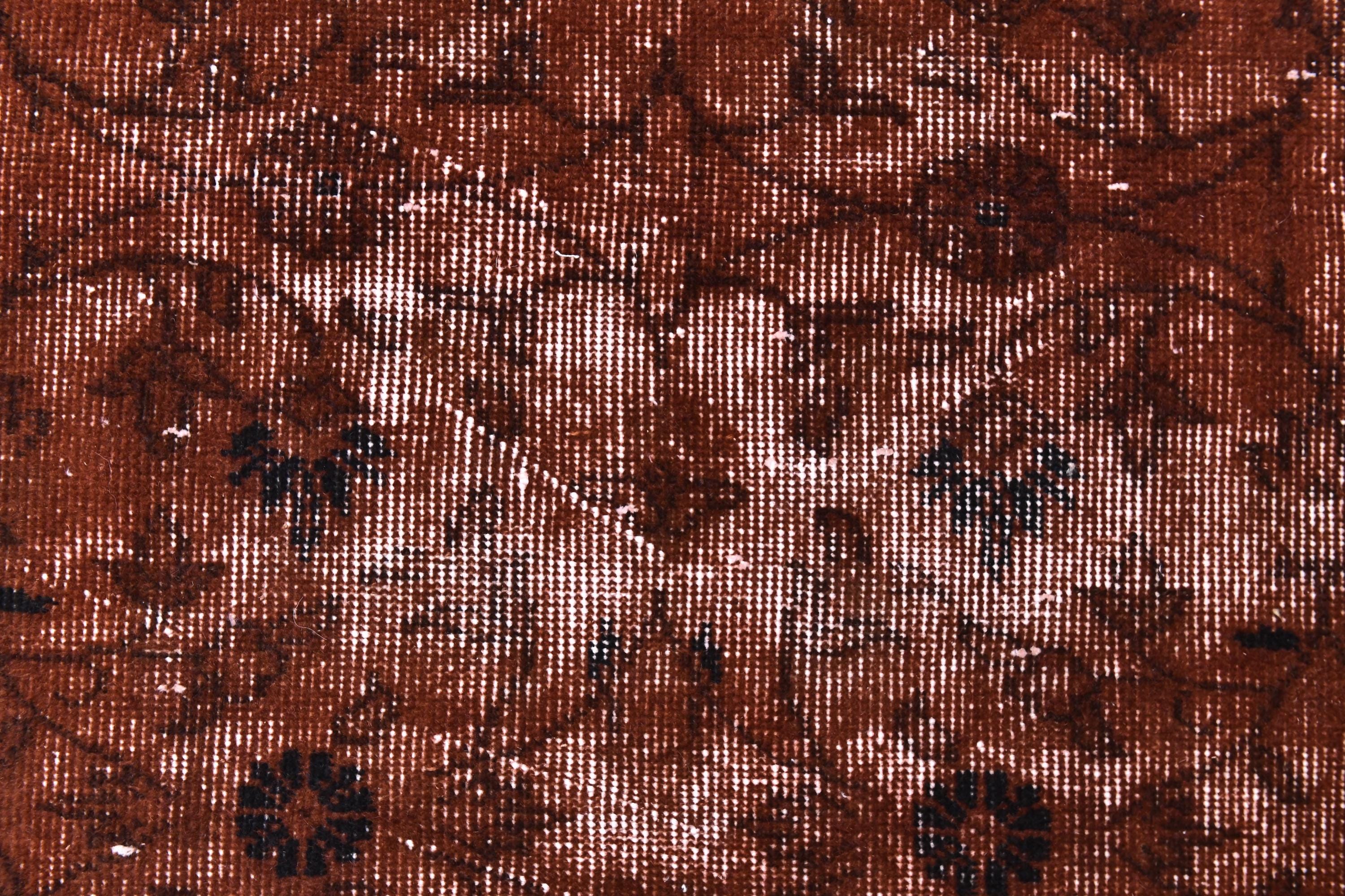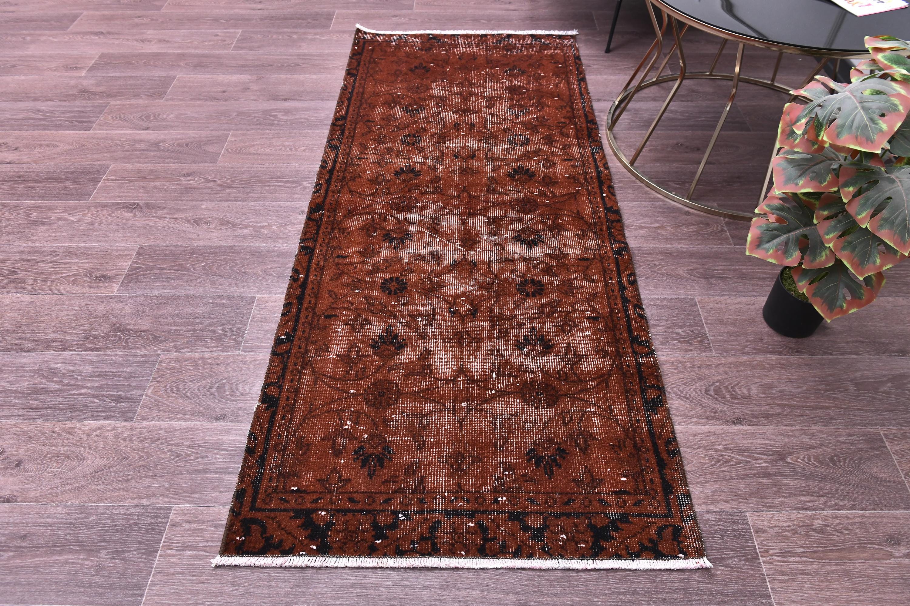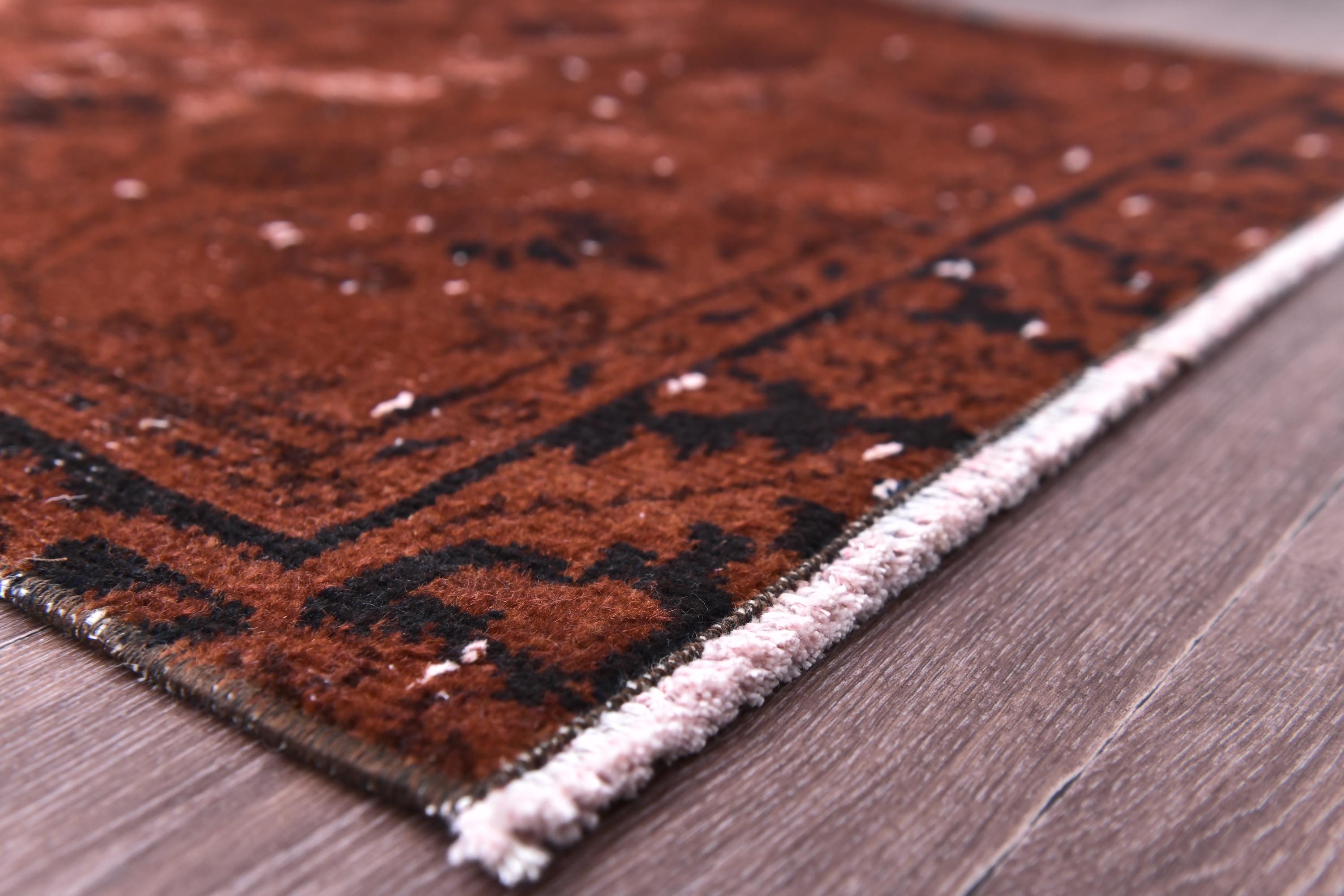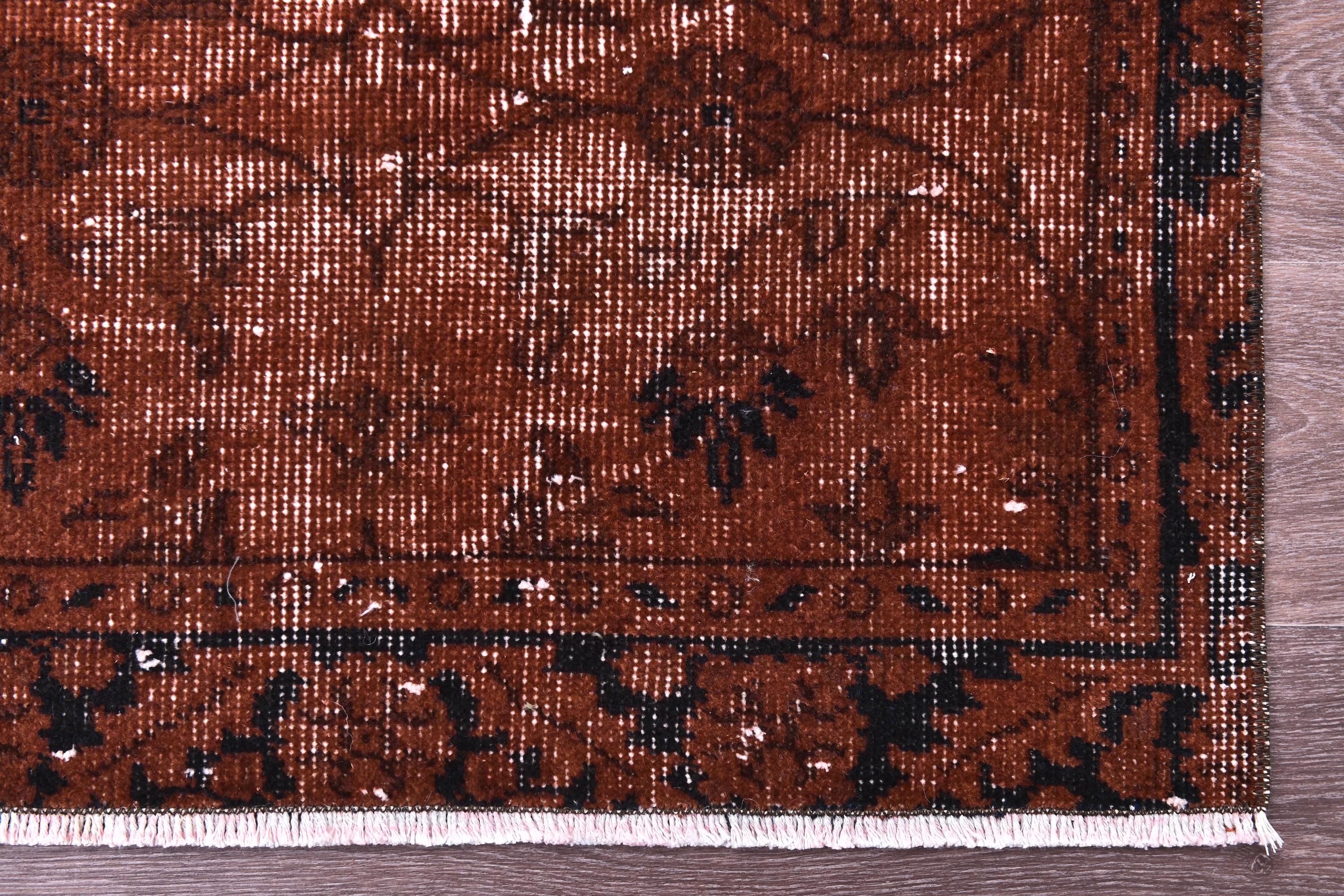 📜📌Vintage overdyed Turkish runner rug in rich Burgundy rust brown and burnt orange tones with distressed traditional floral medallion pattern, dark border accents, hand-knotted wool construction with visible patina, featuring fringed edges on gray wood floor