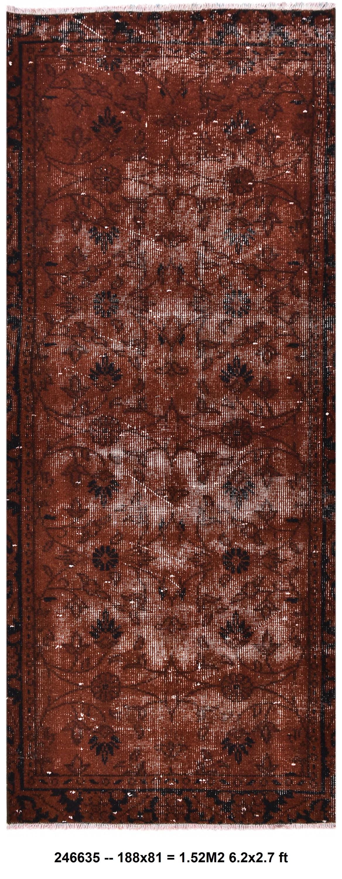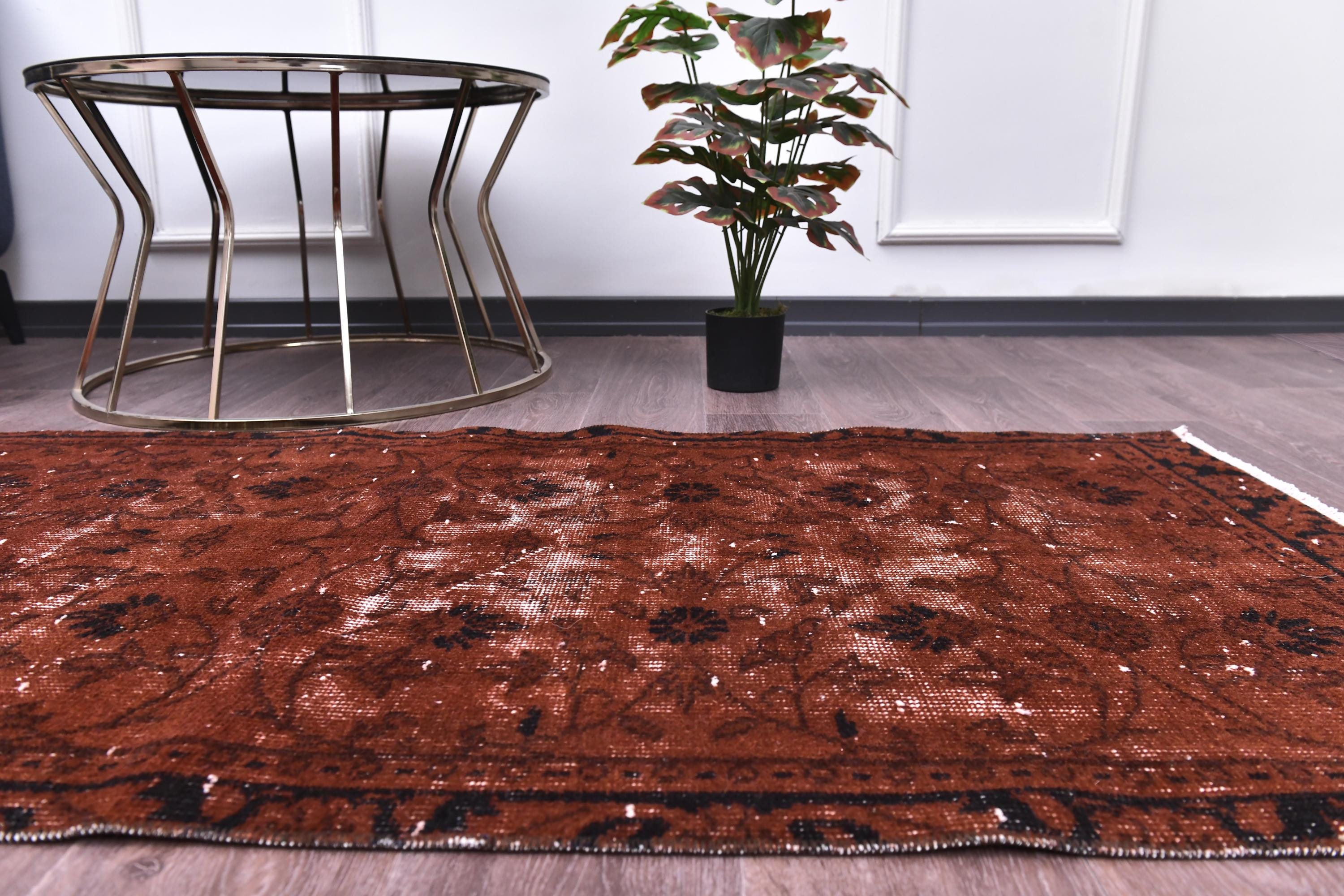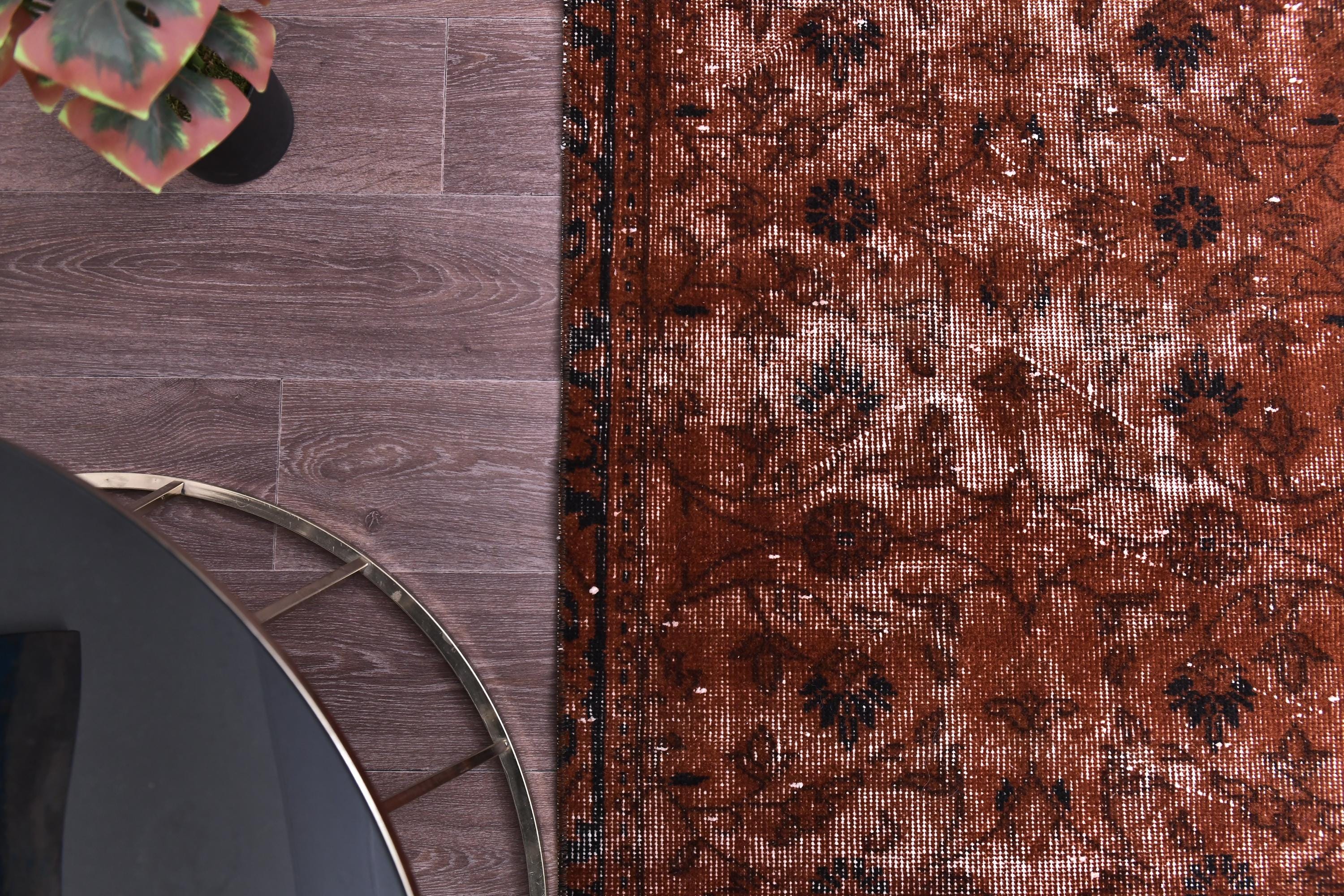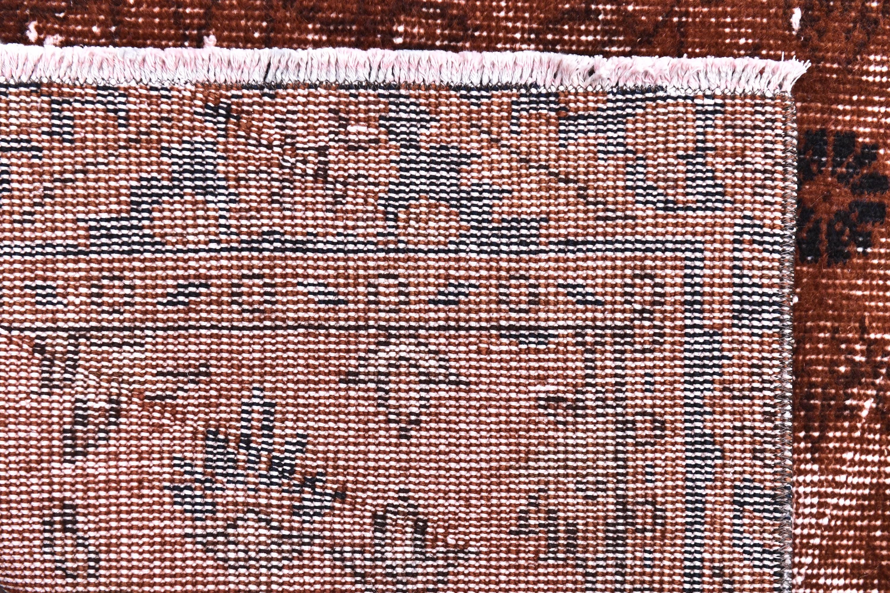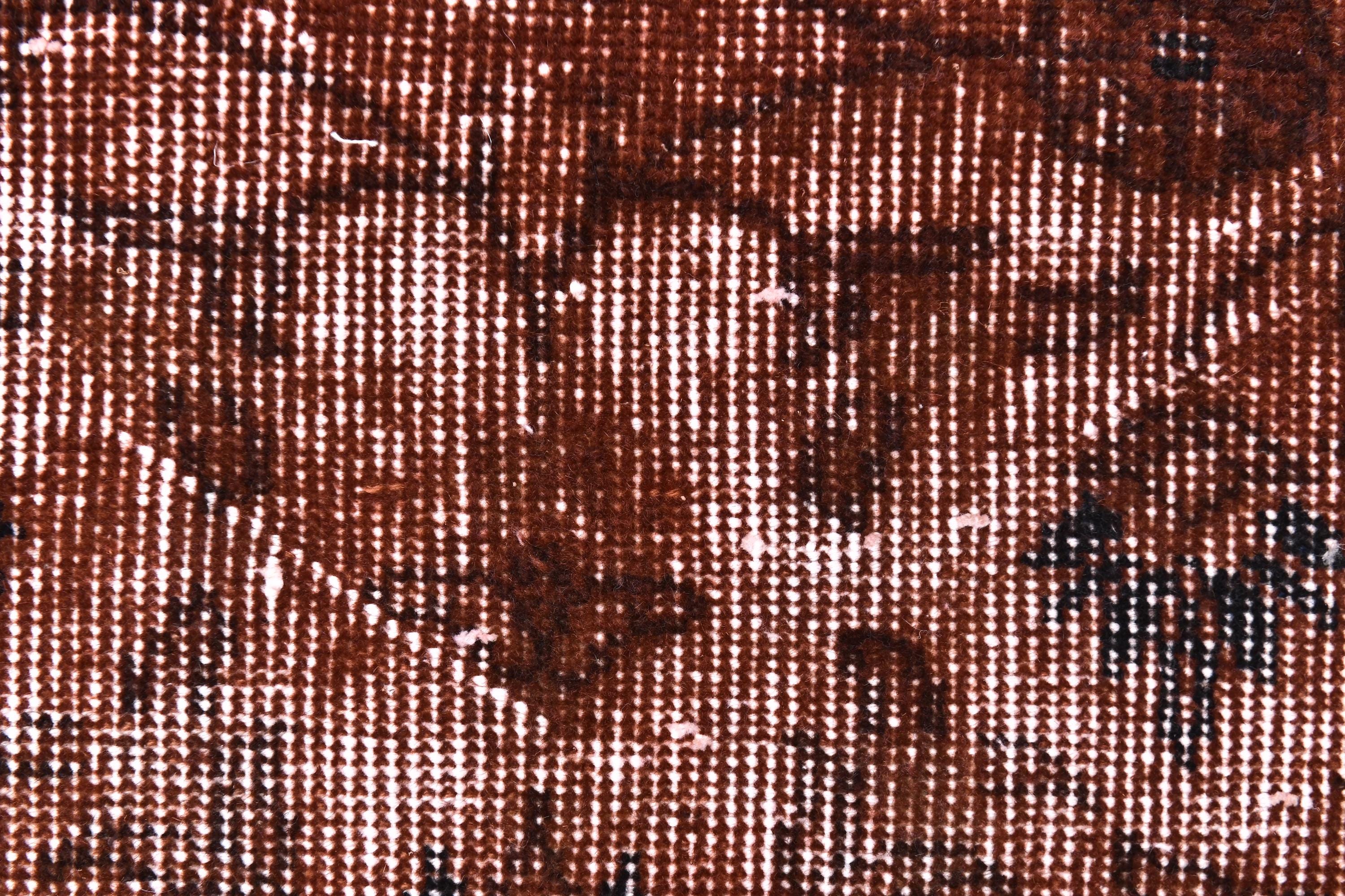 📜📌Vintage overdyed Turkish runner rug in rich Burgundy rust brown and burnt orange tones with distressed traditional floral medallion pattern, dark border accents, hand-knotted wool construction with visible patina, featuring fringed edges on gray wood floor