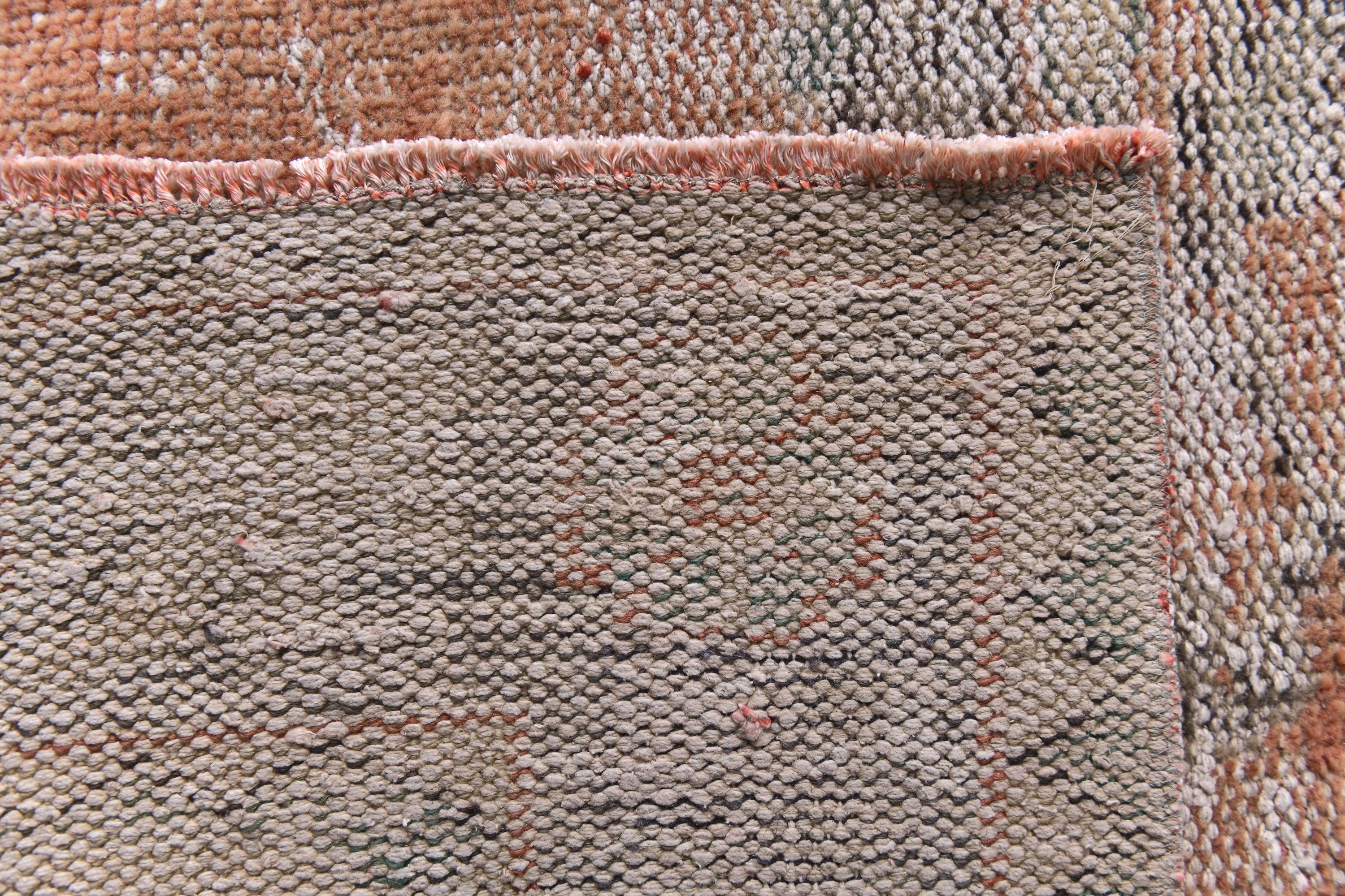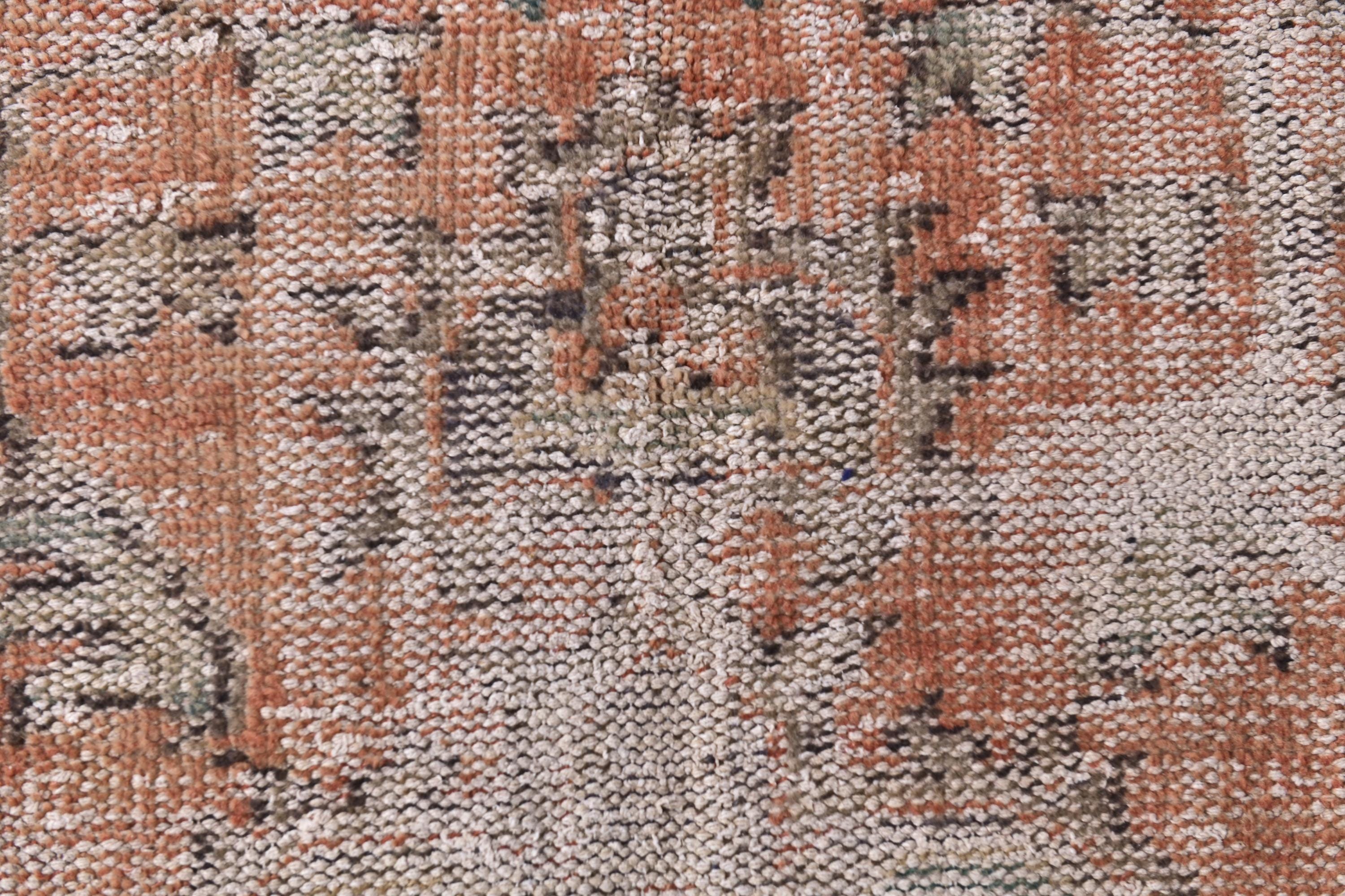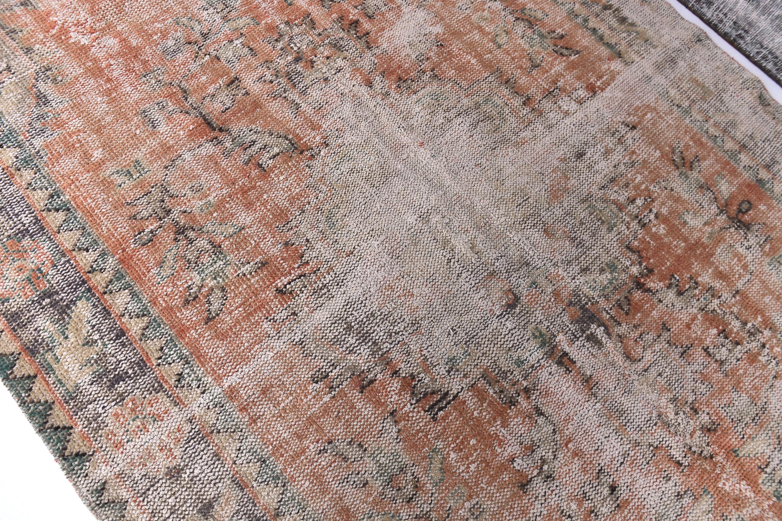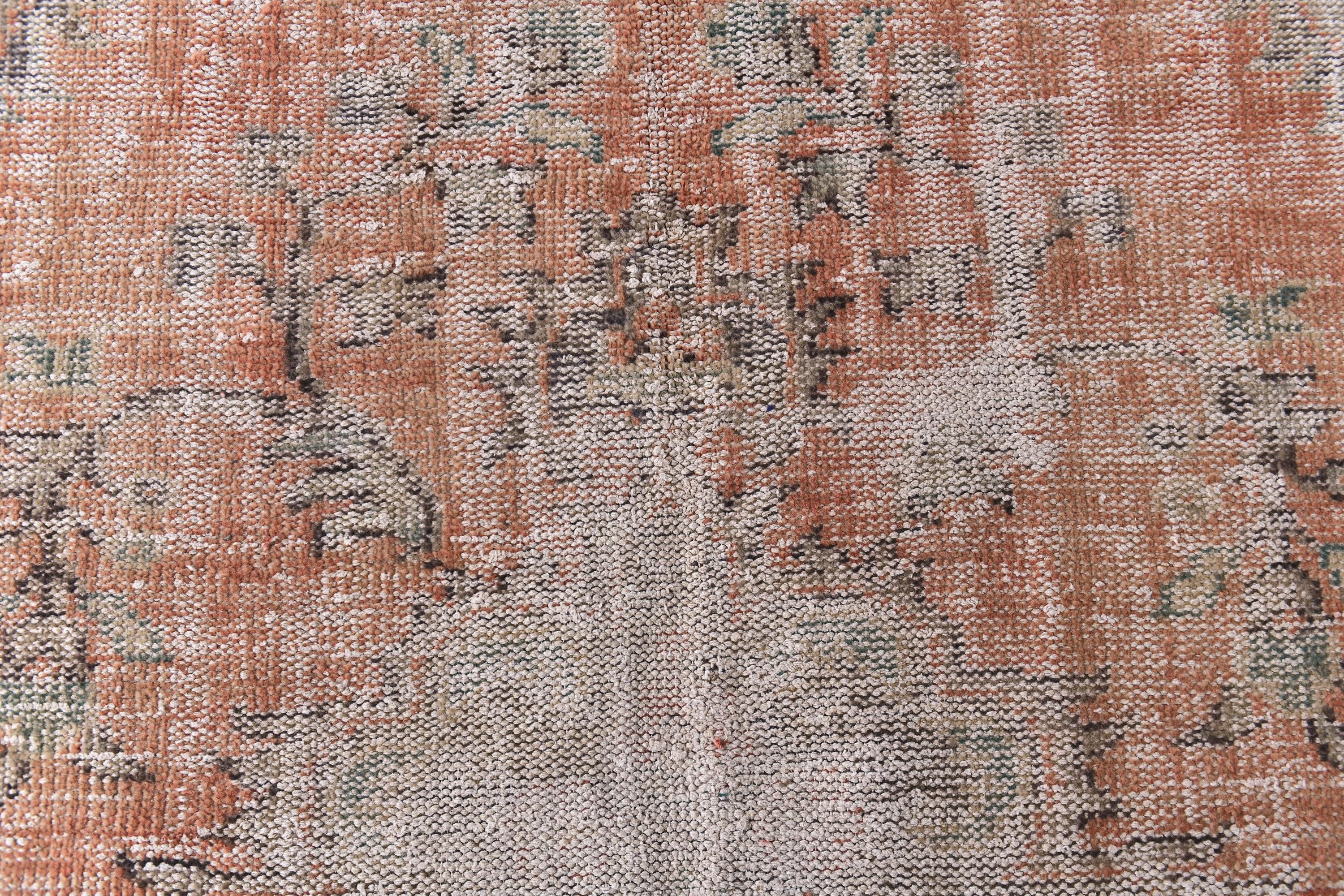📜📌Distressed vintage area rug in coral pink and sage green colors with worn patina finish, Turkish Oushak style hand-knotted wool carpet with traditional geometric border and center medallion motifs