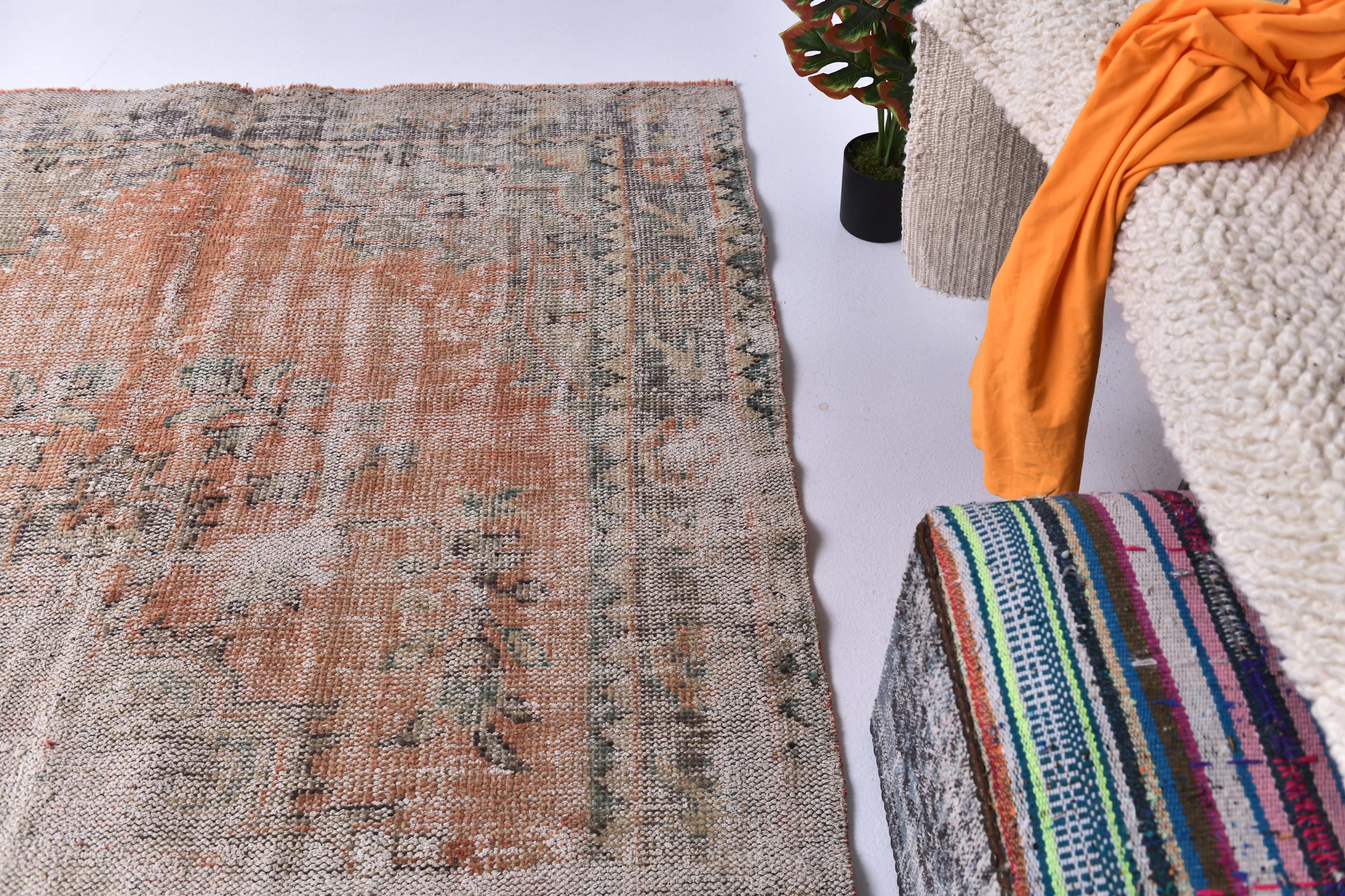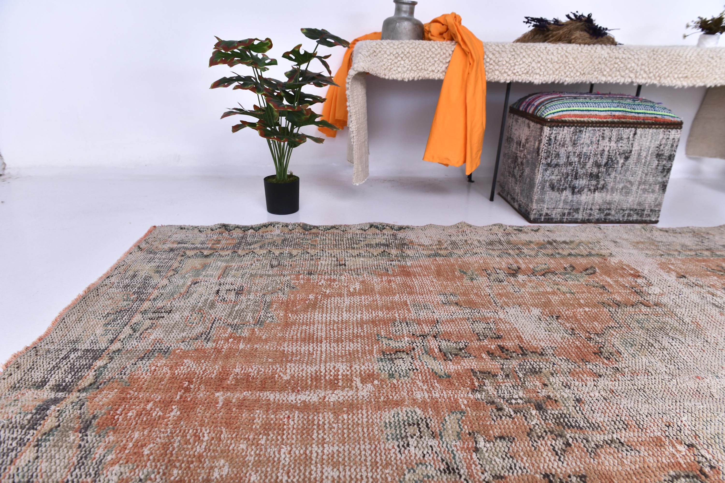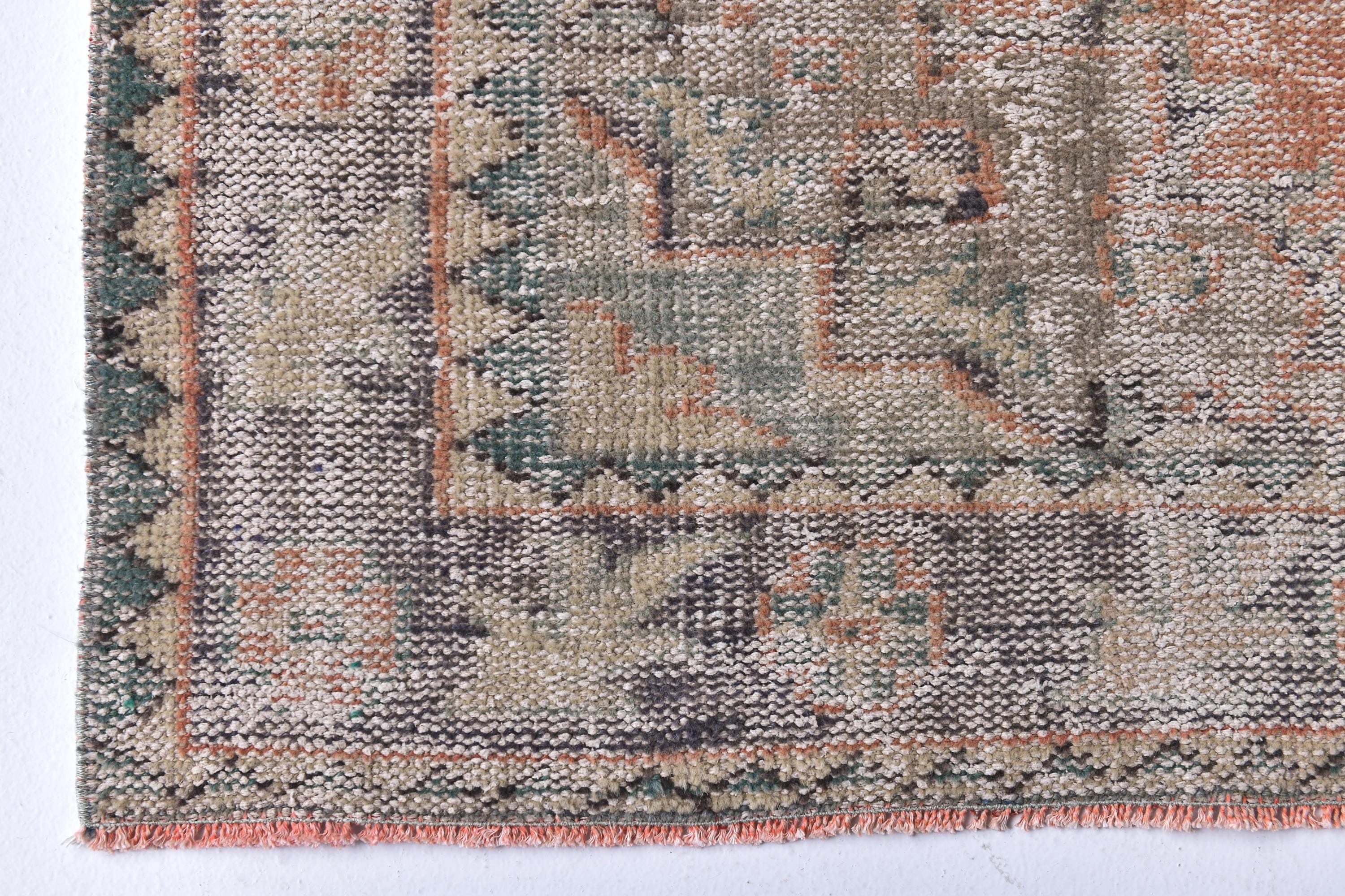 📜📌Distressed vintage area rug in coral pink and sage green colors with worn patina finish, Turkish Oushak style hand-knotted wool carpet with traditional geometric border and center medallion motifs
