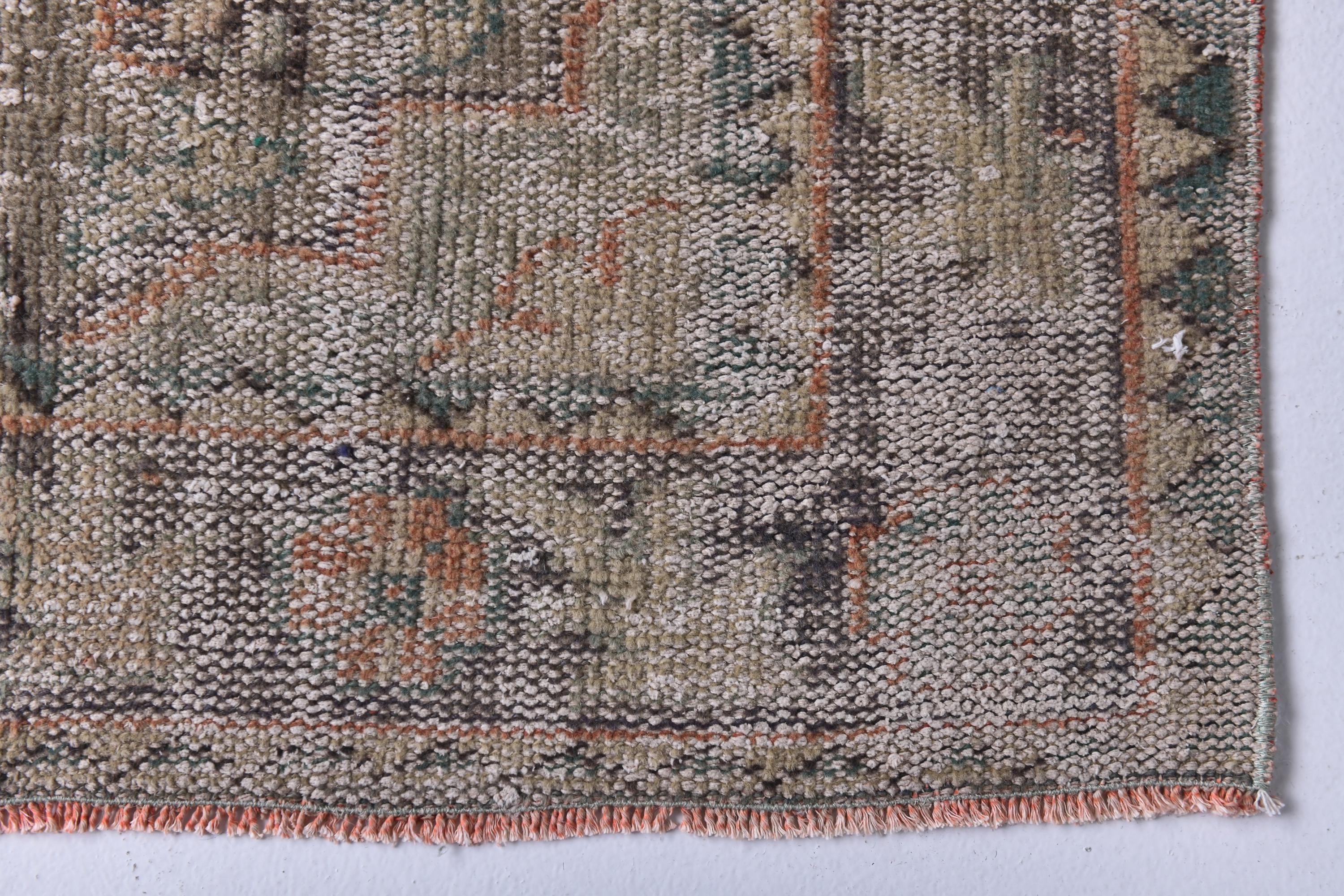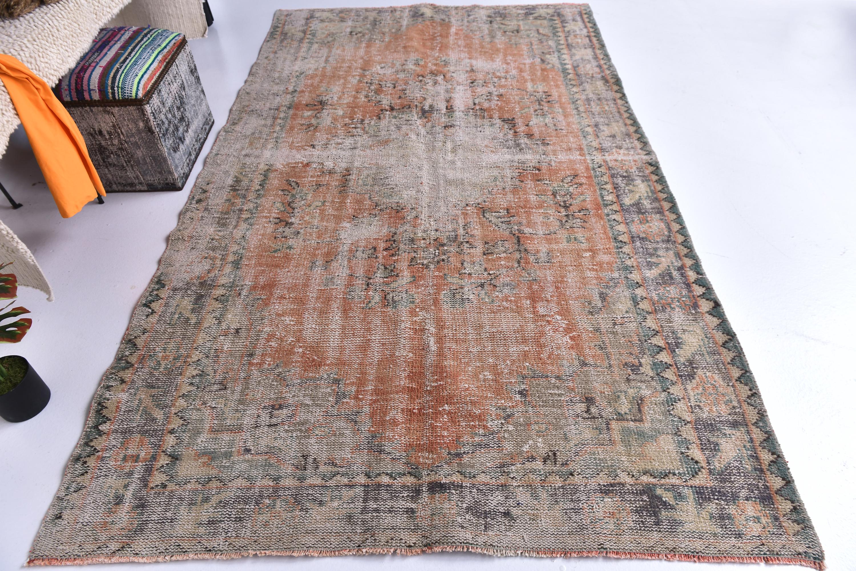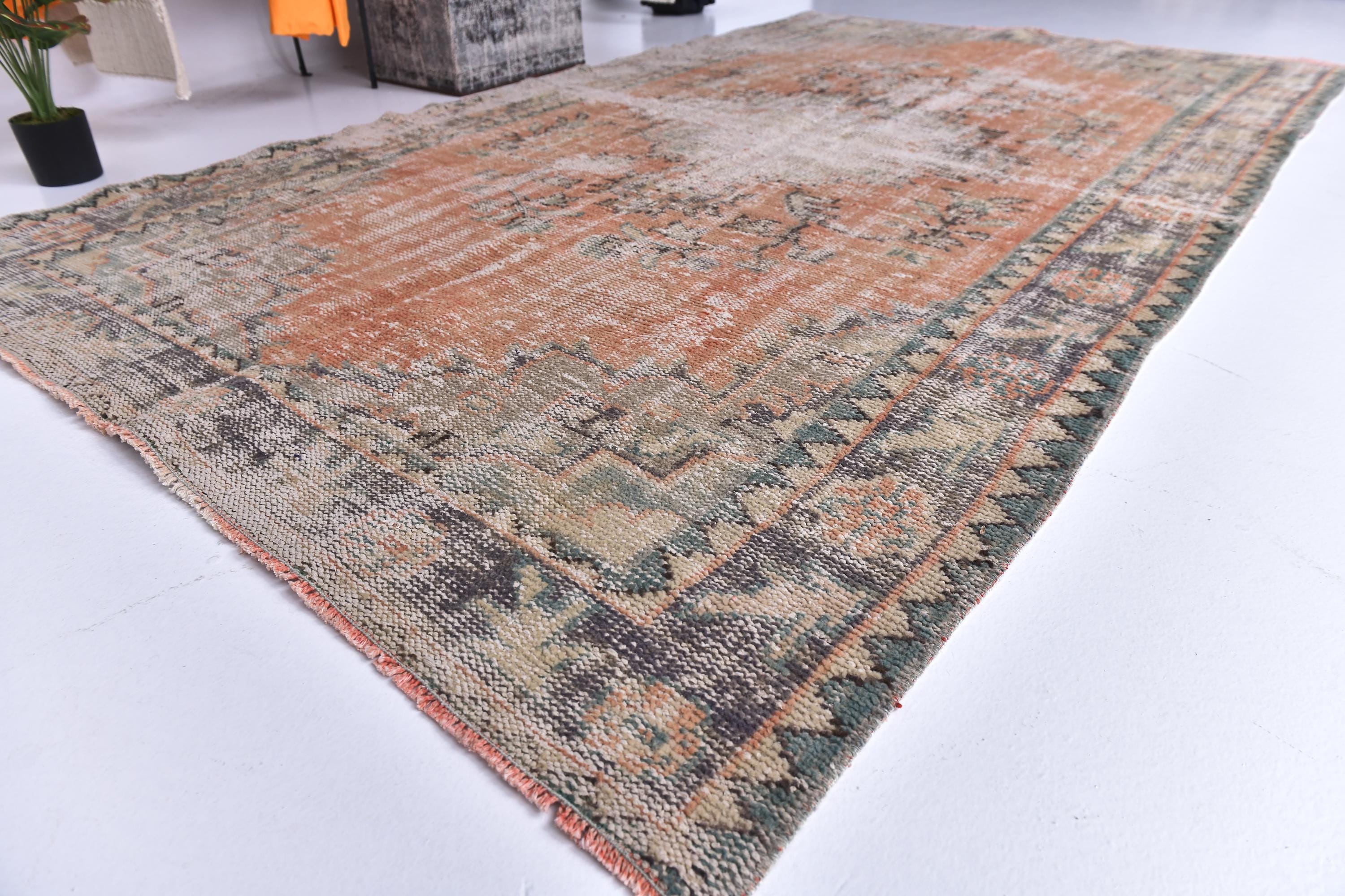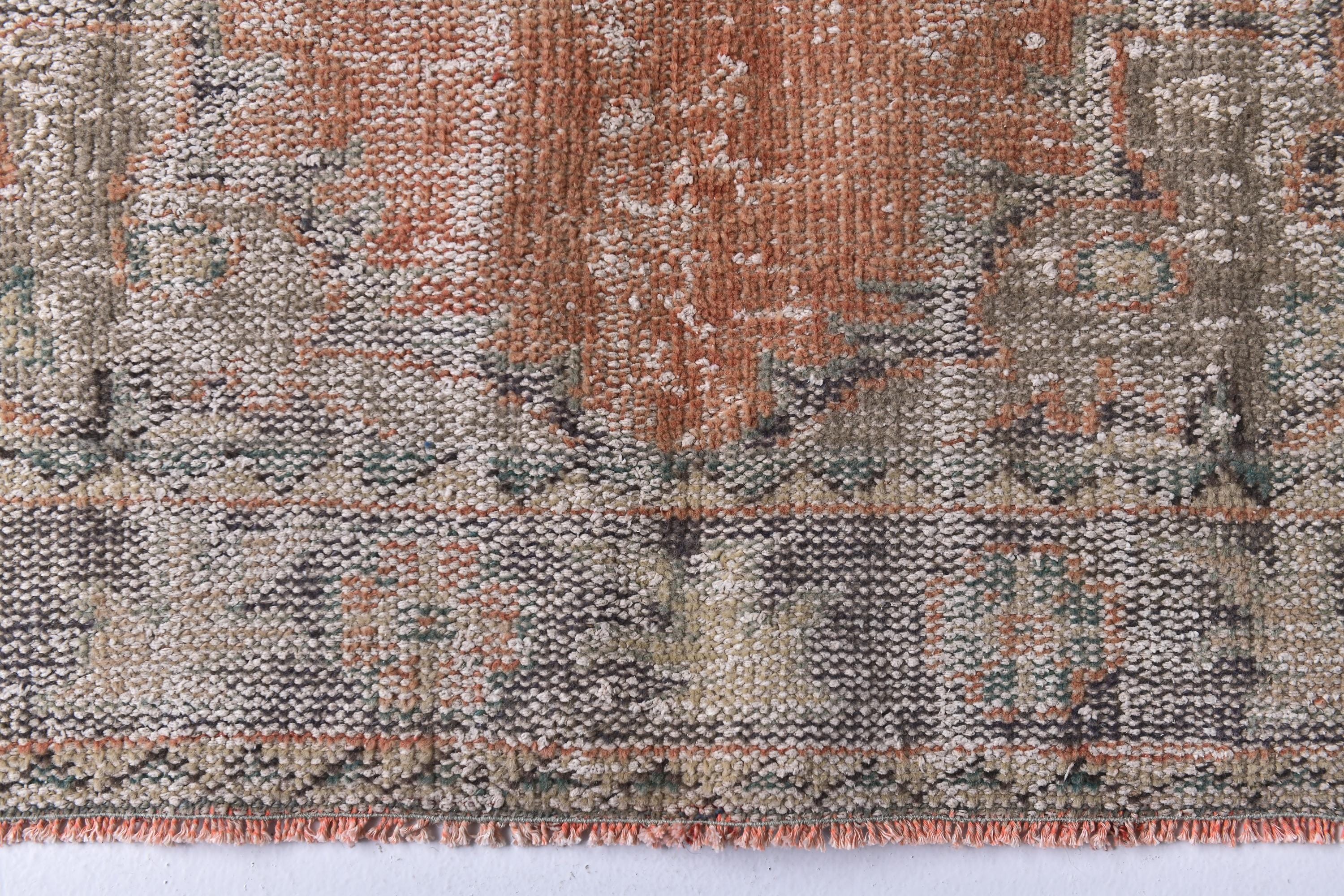 📜📌Distressed vintage area rug in coral pink and sage green colors with worn patina finish, Turkish Oushak style hand-knotted wool carpet with traditional geometric border and center medallion motifs