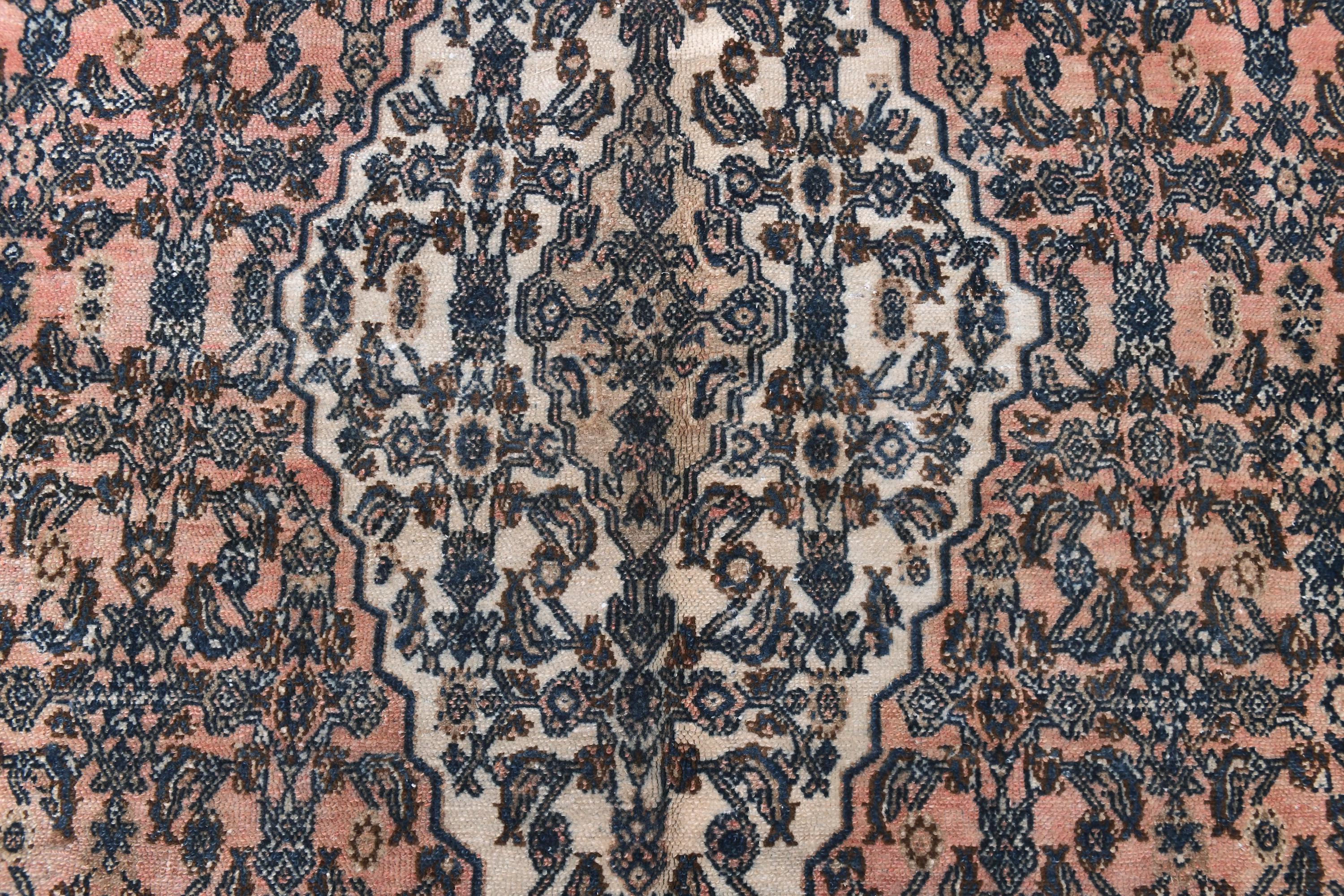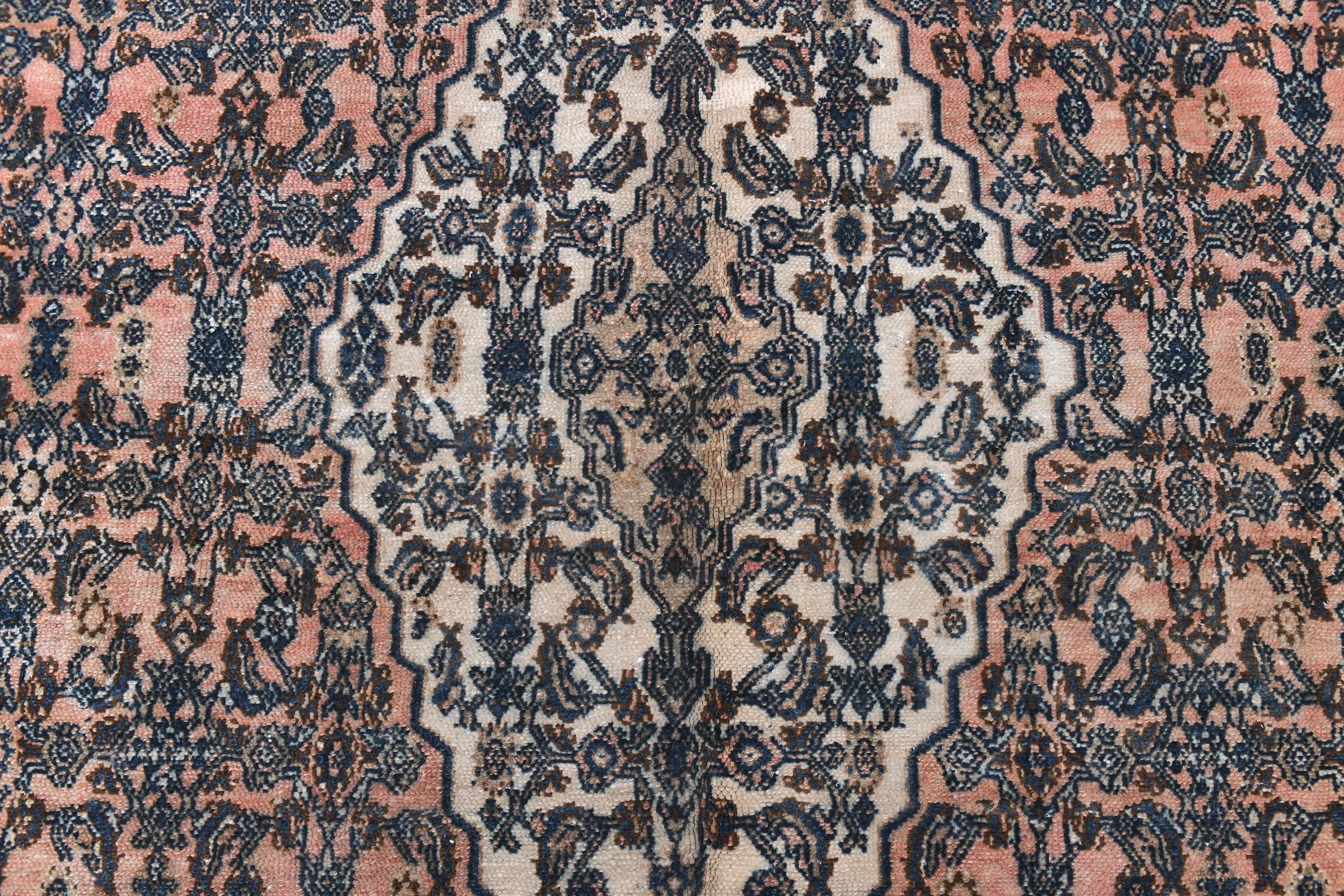 📜📌 Traditional Persian area rug featuring an ornate central floral medallion in cream and salmon pink on a navy blue field with intricate botanical motifs, complemented by detailed multi-border design in coral, cream, and dark blue tones with delicate floral patterns throughout.
