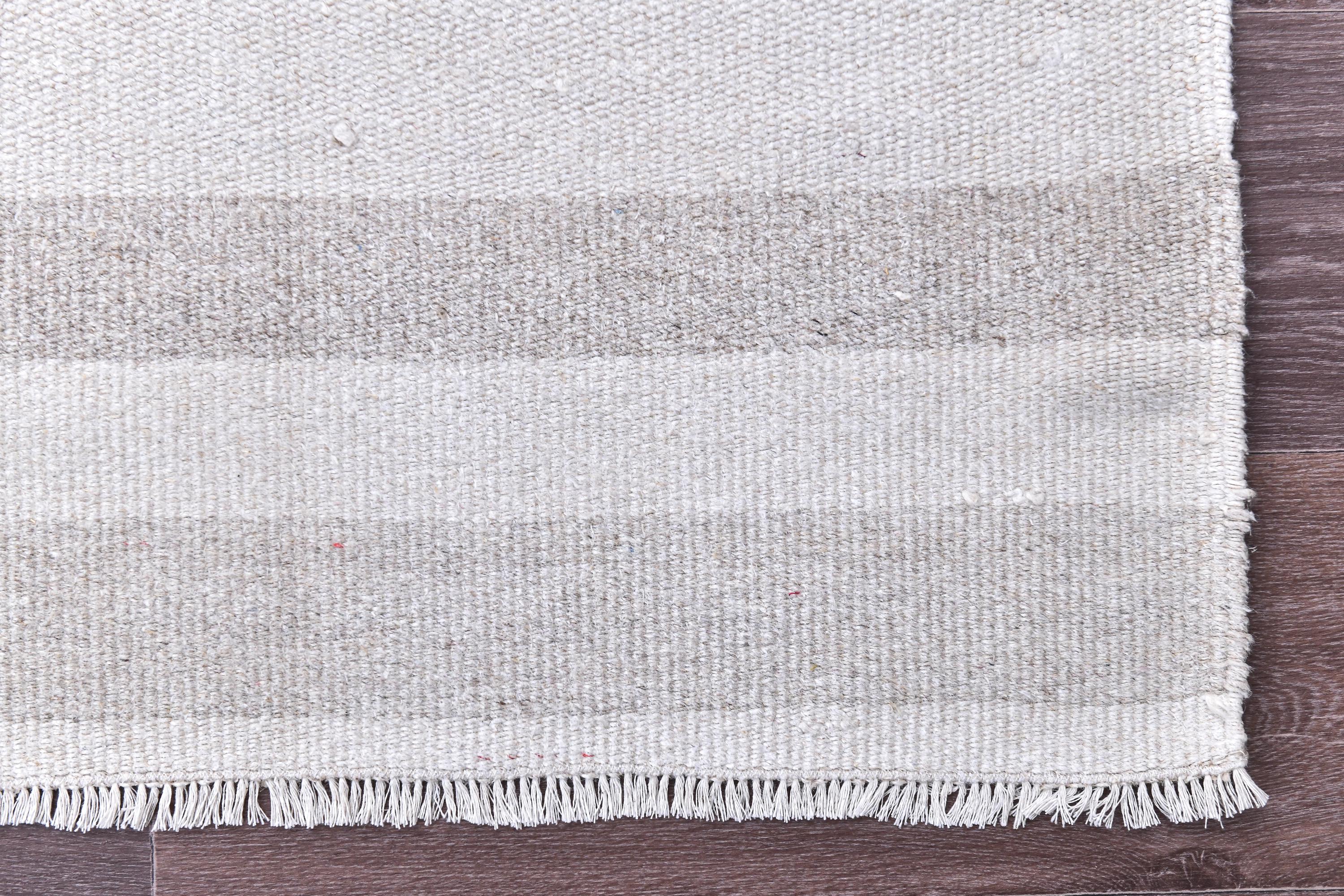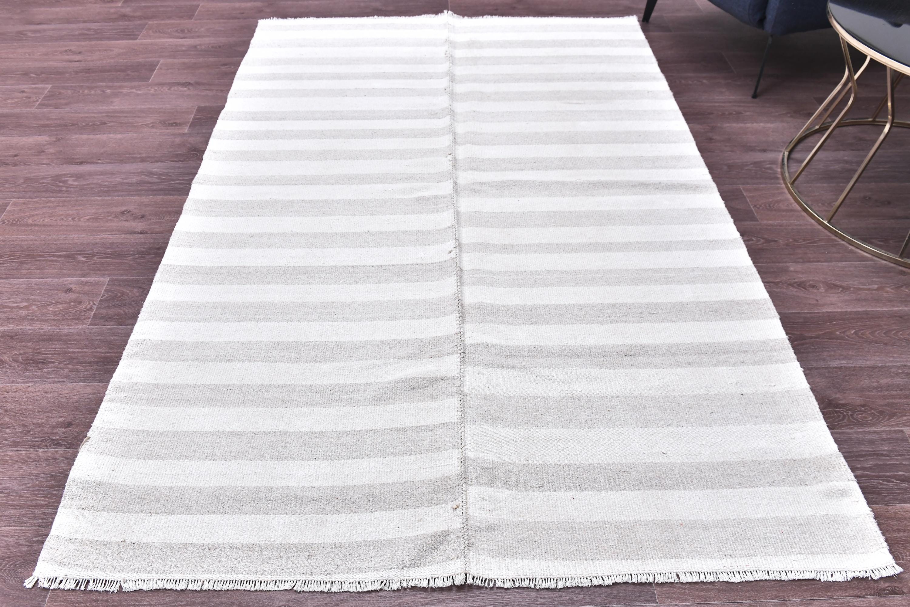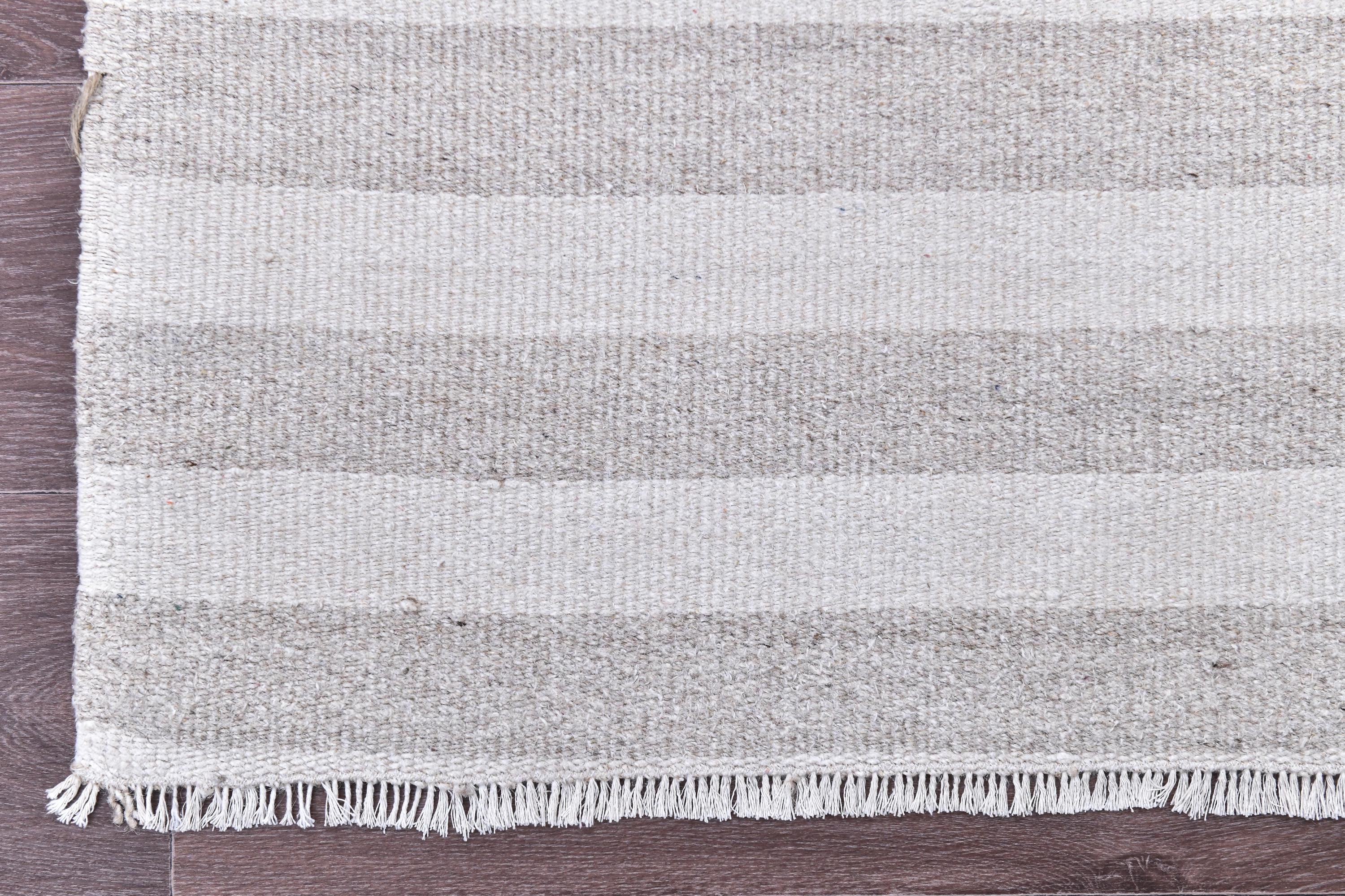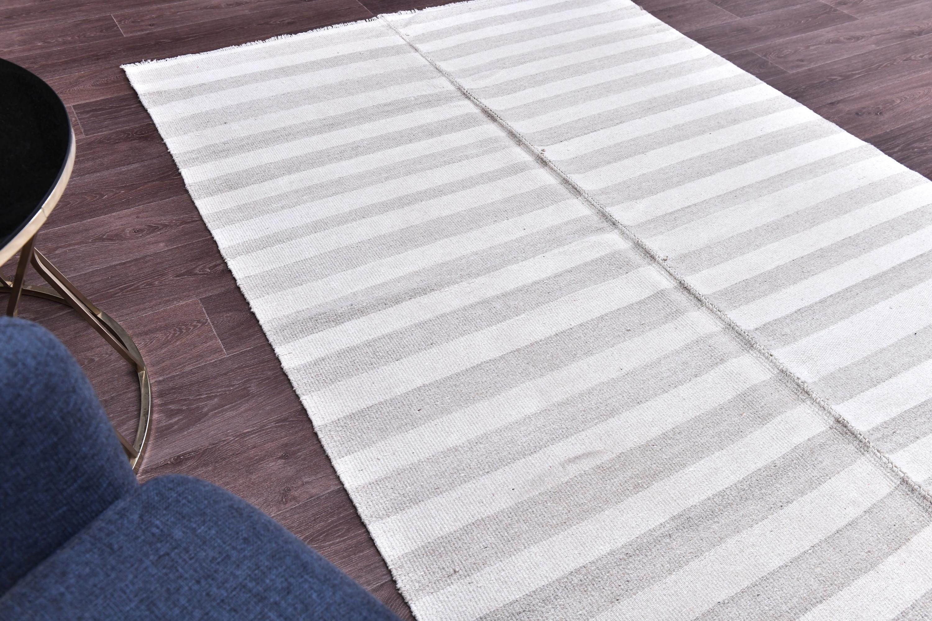 📜📌 Handmade striped area rug in soft gray and white colors with textured flat weave construction, featuring alternating horizontal stripe pattern and decorative fringed borders, cotton kilim style floor covering in neutral palette