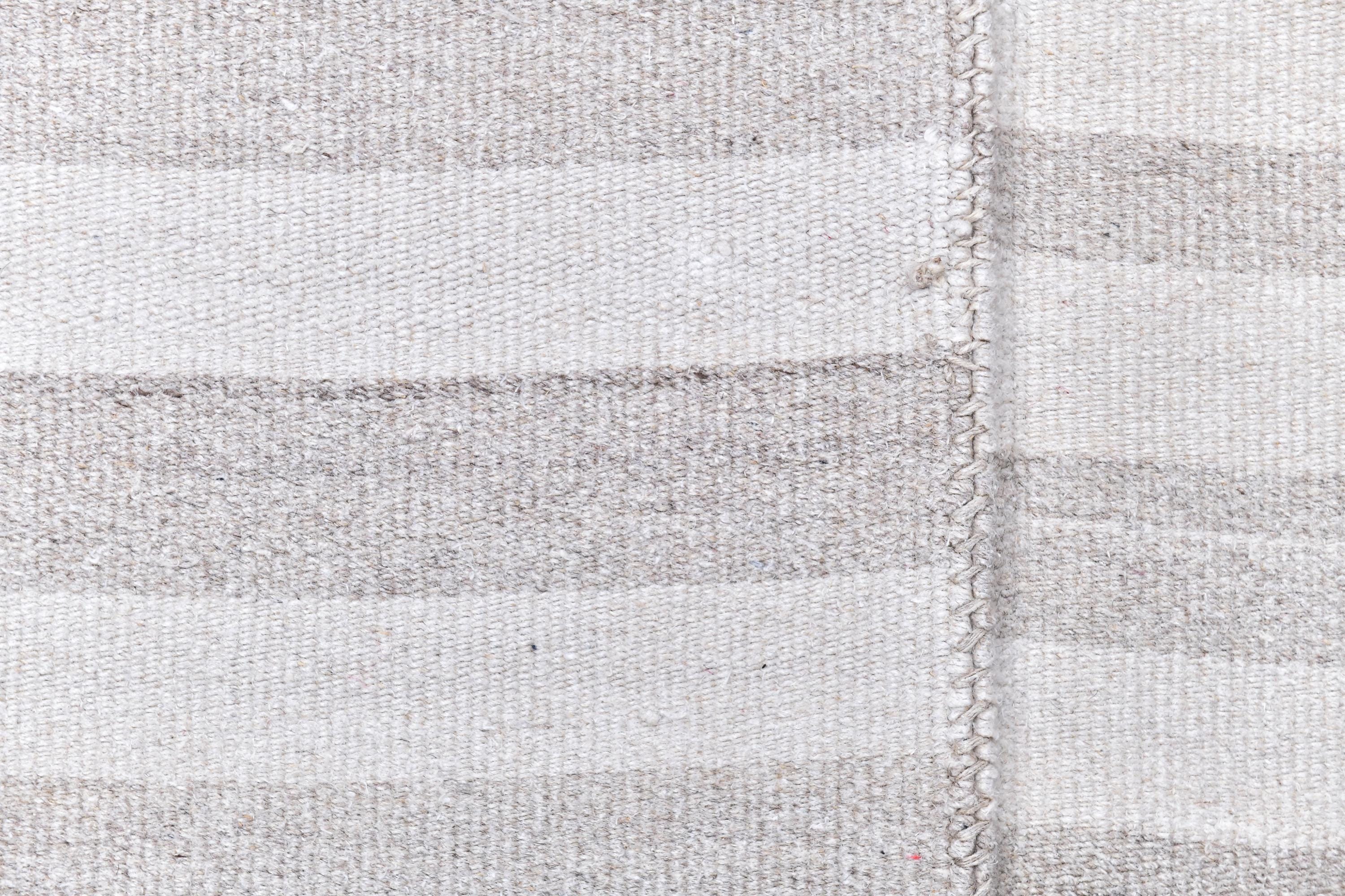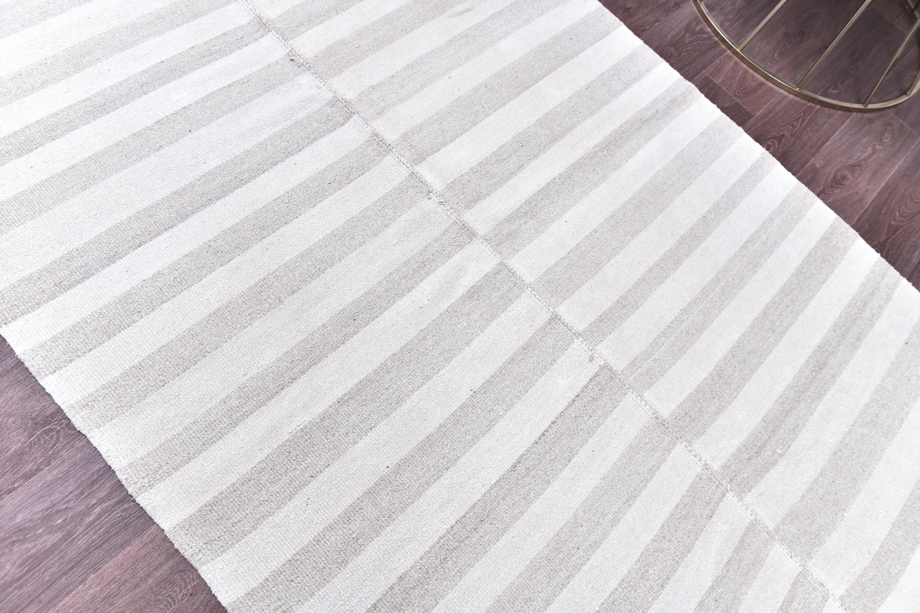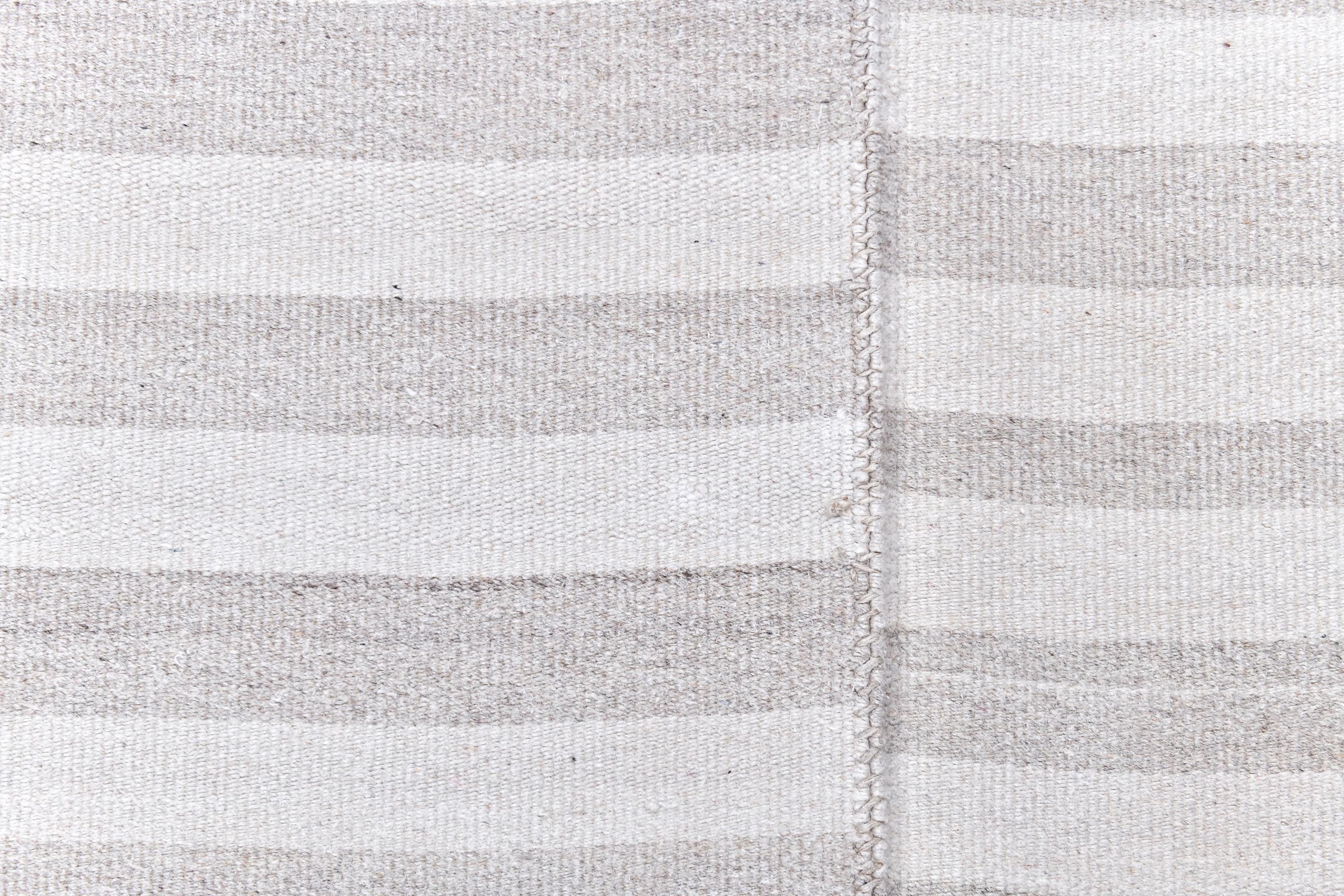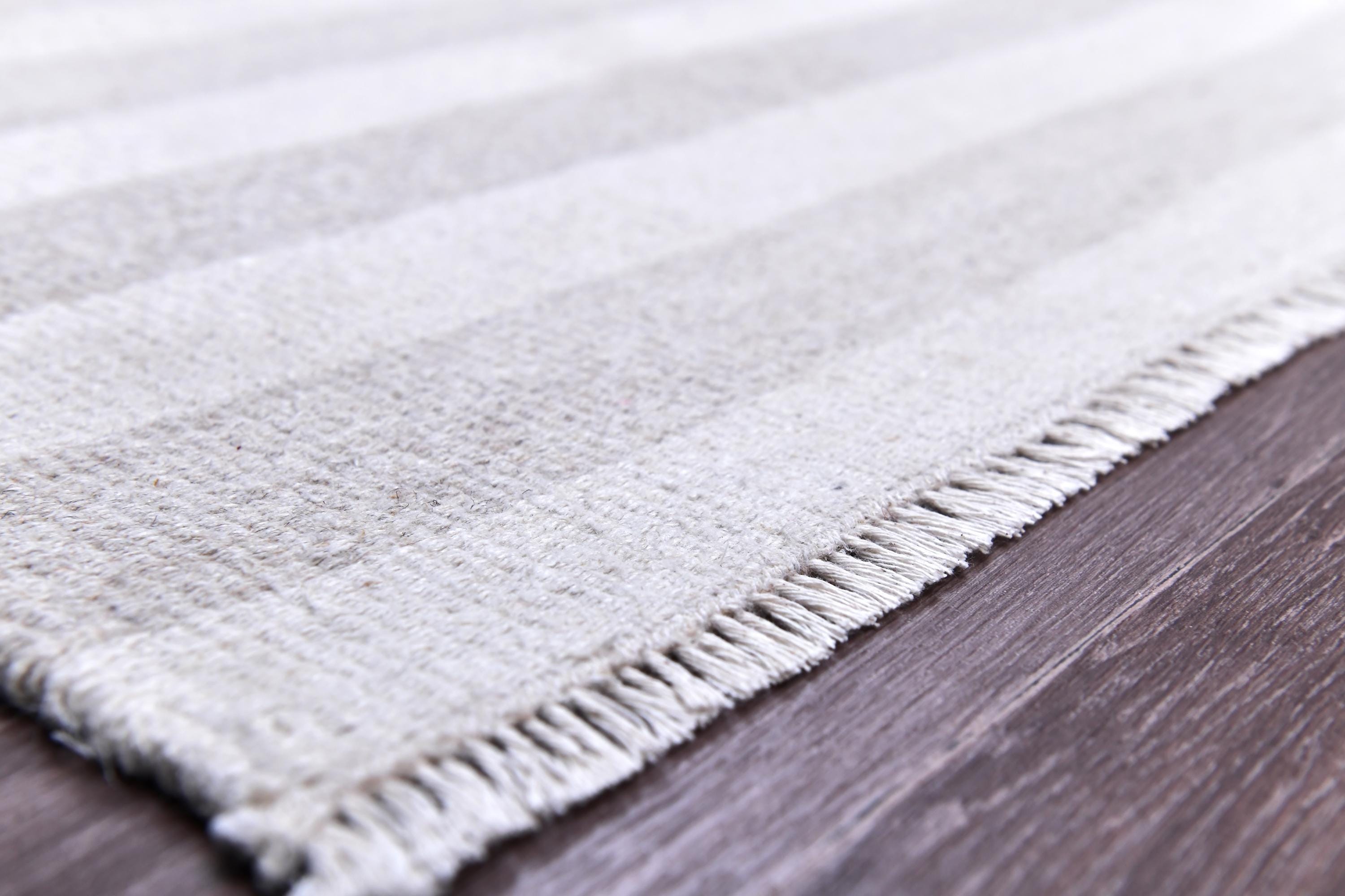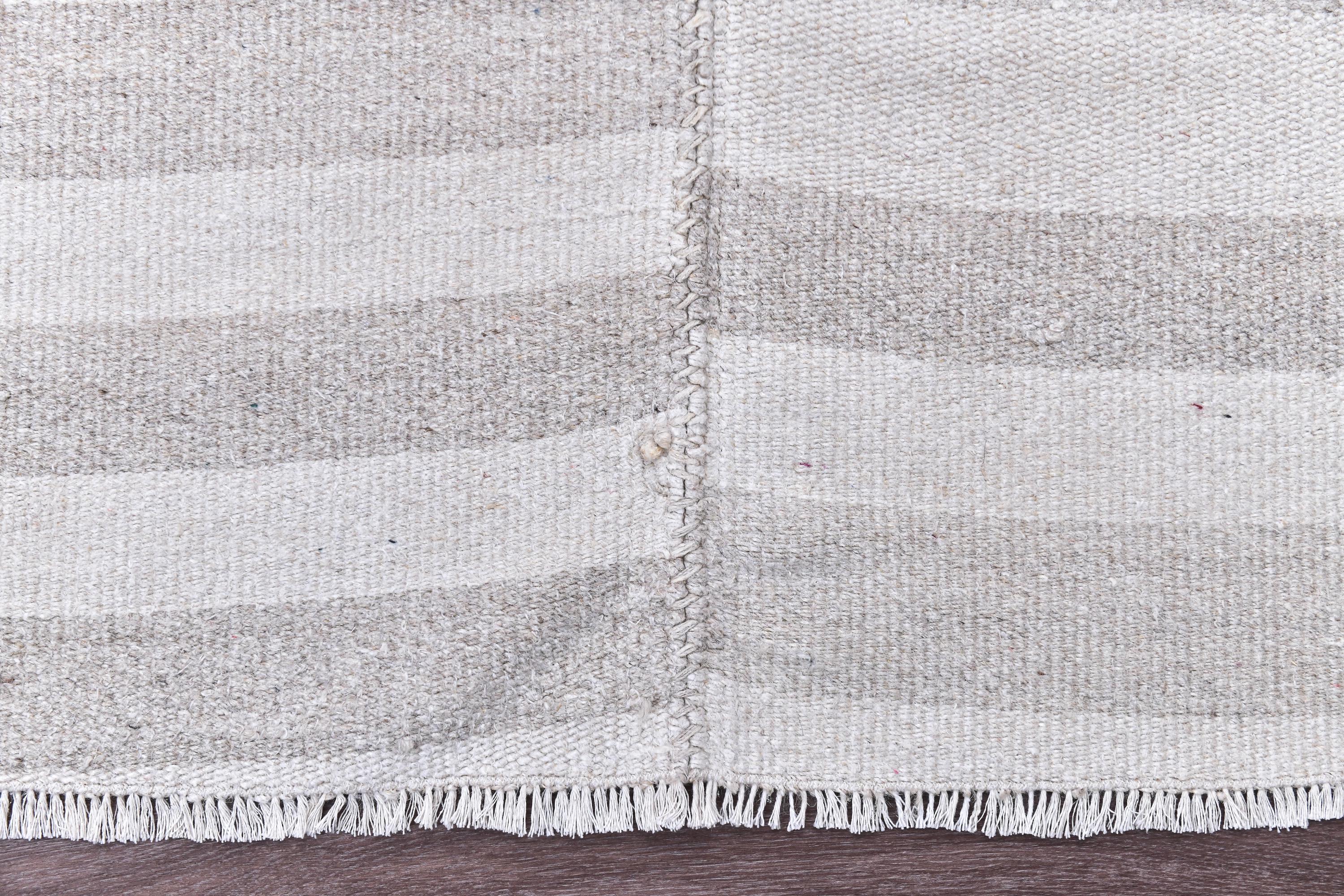 📜📌 Handmade striped area rug in soft gray and white colors with textured flat weave construction, featuring alternating horizontal stripe pattern and decorative fringed borders, cotton kilim style floor covering in neutral palette