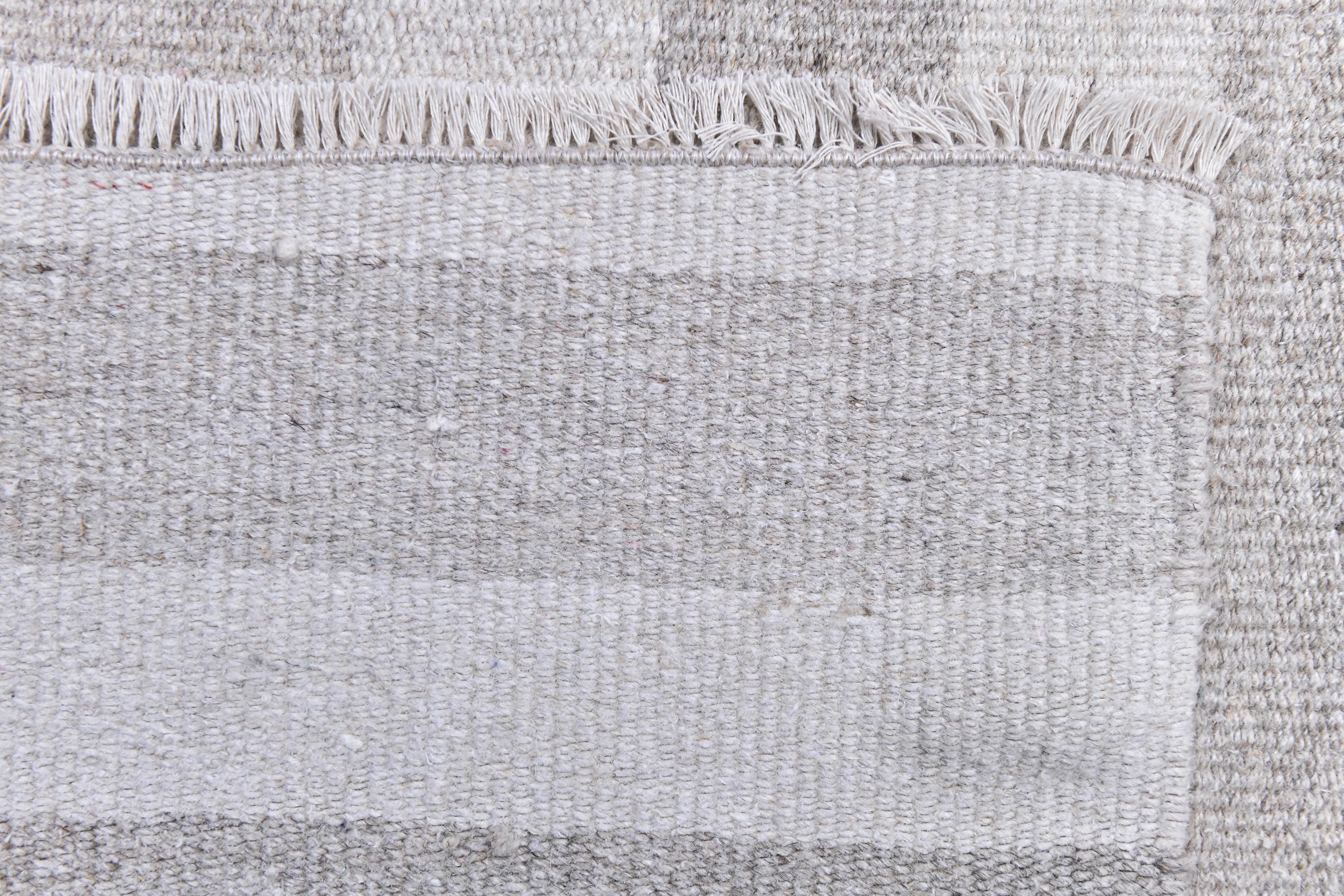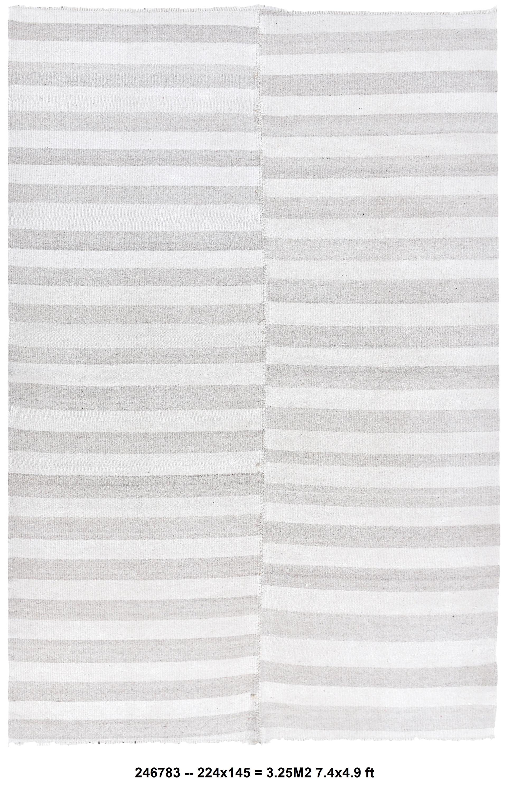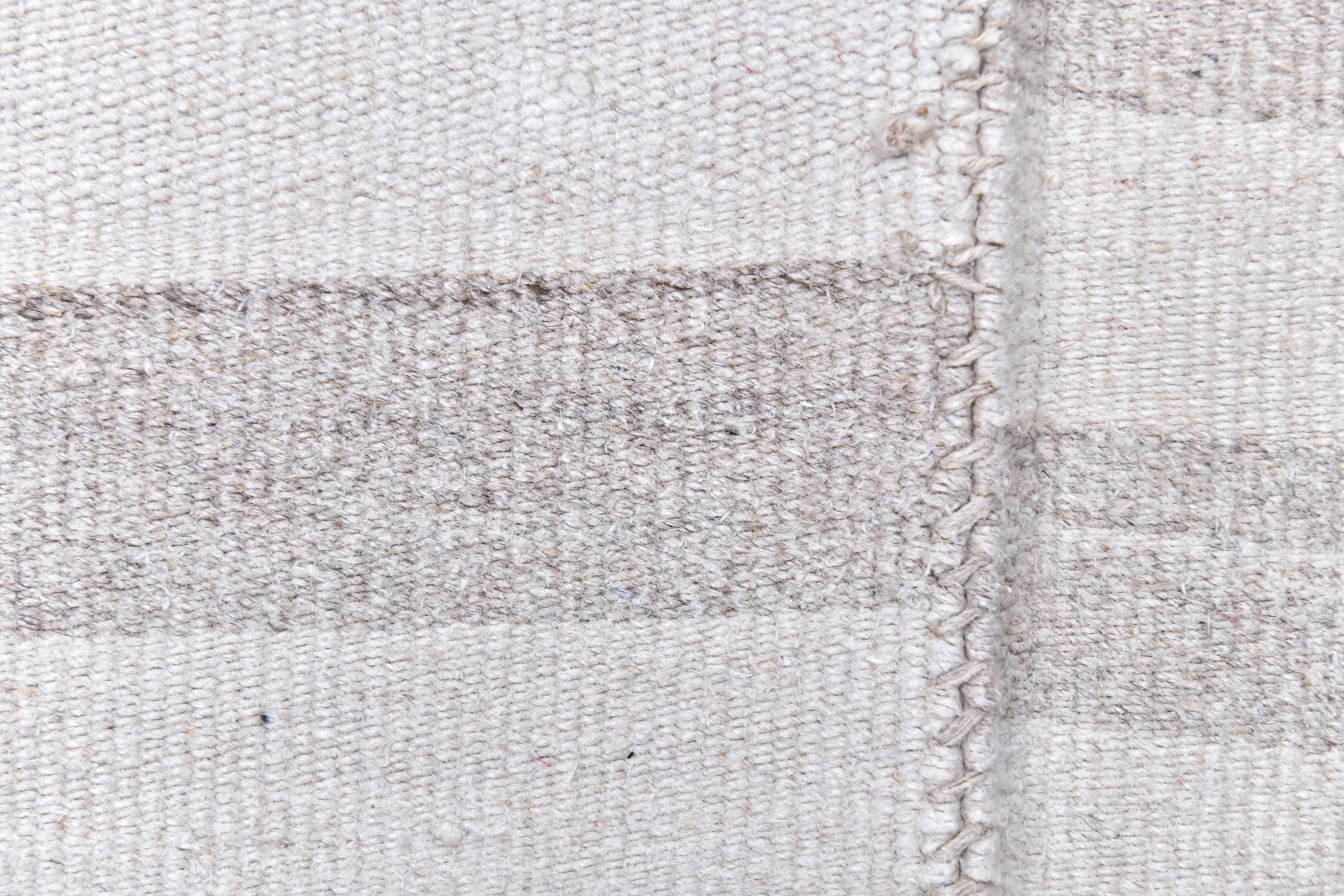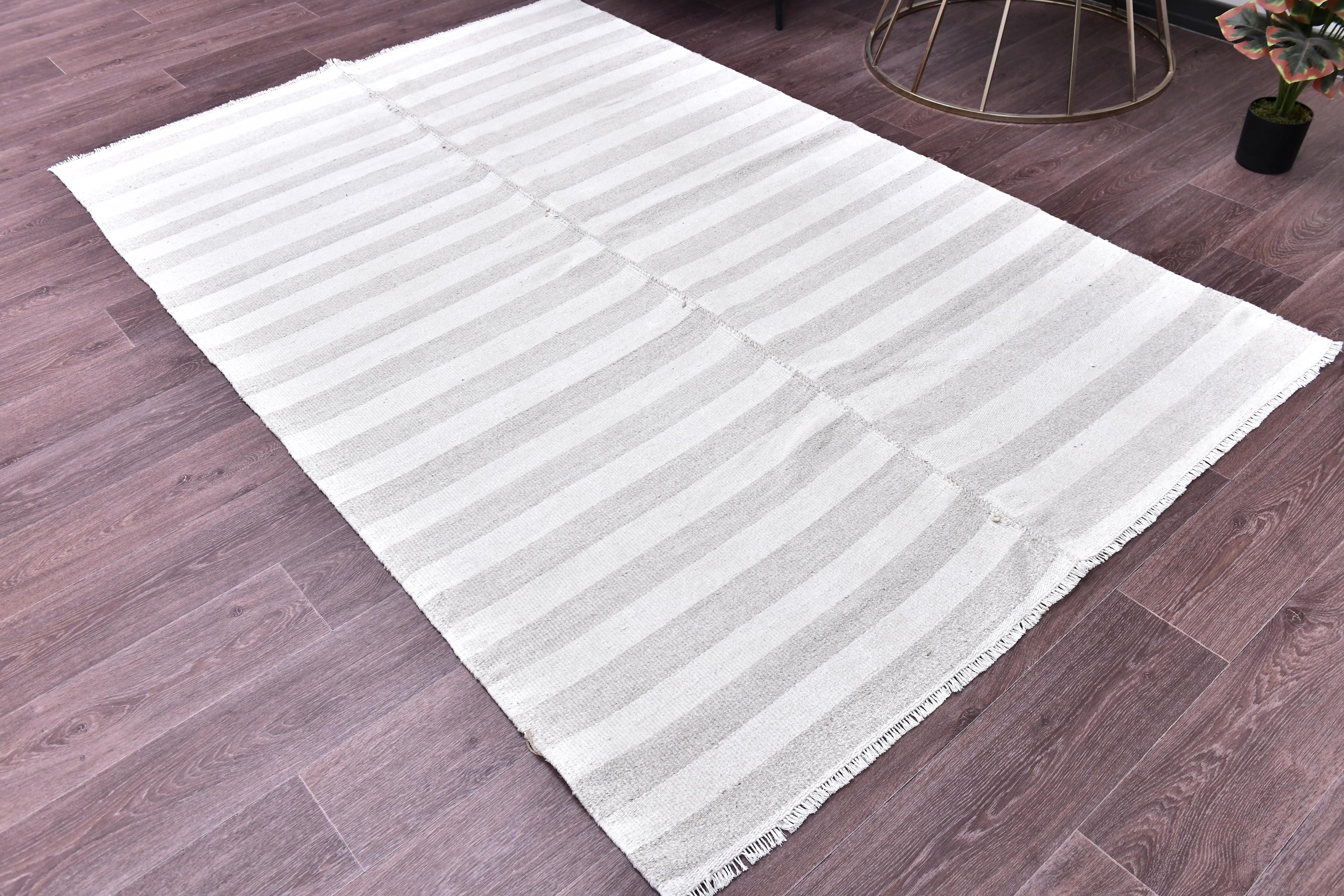 📜📌 Handmade striped area rug in soft gray and white colors with textured flat weave construction, featuring alternating horizontal stripe pattern and decorative fringed borders, cotton kilim style floor covering in neutral palette