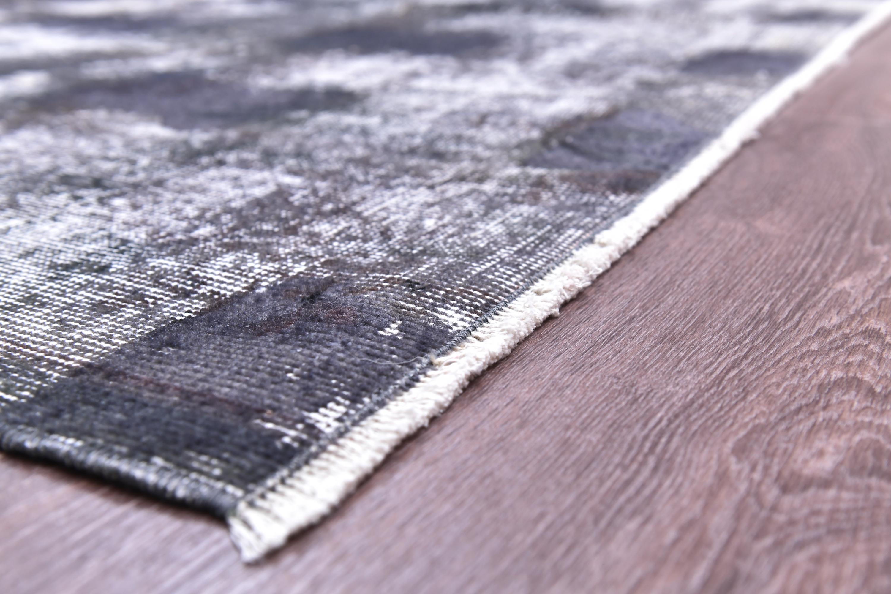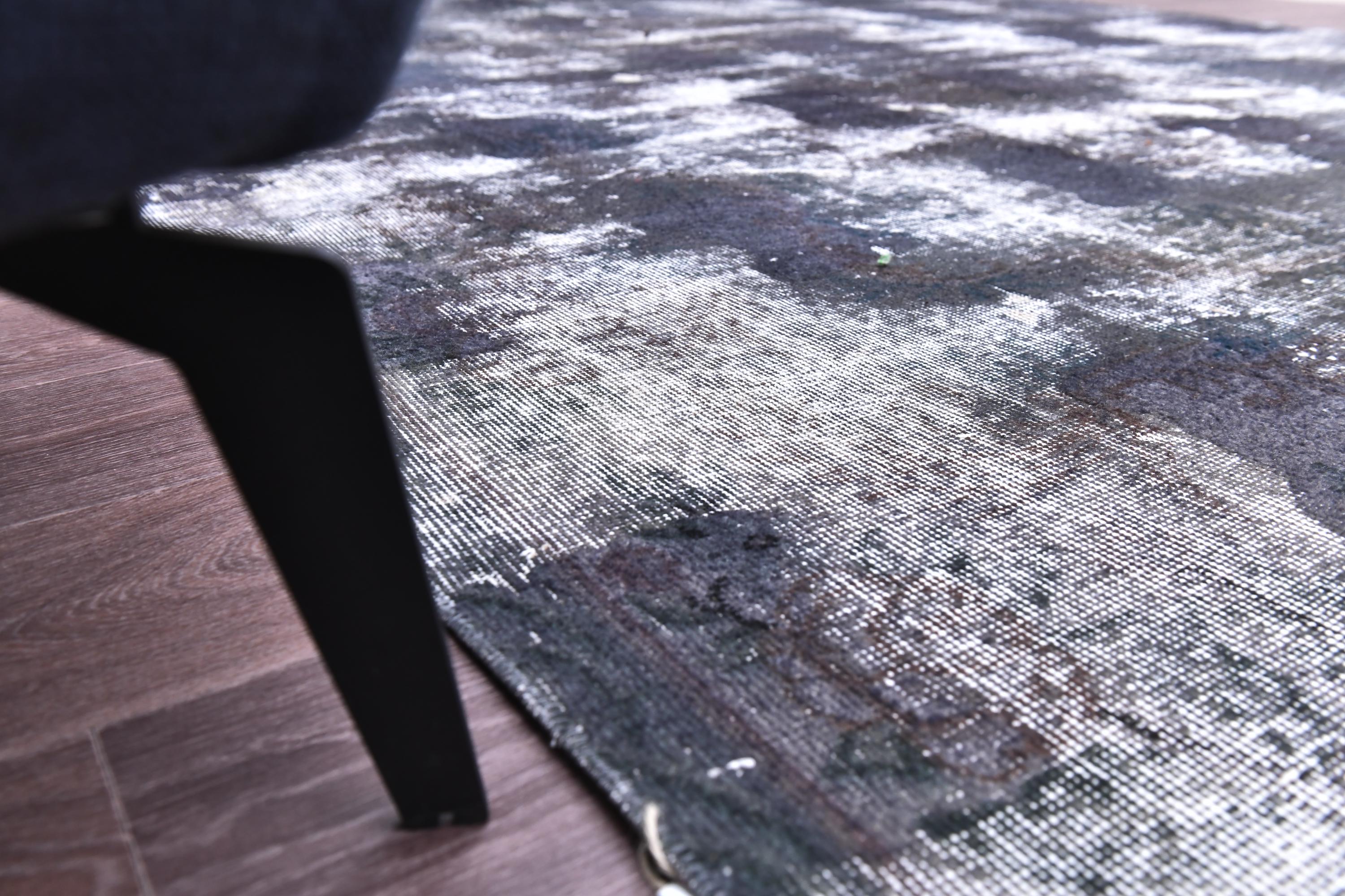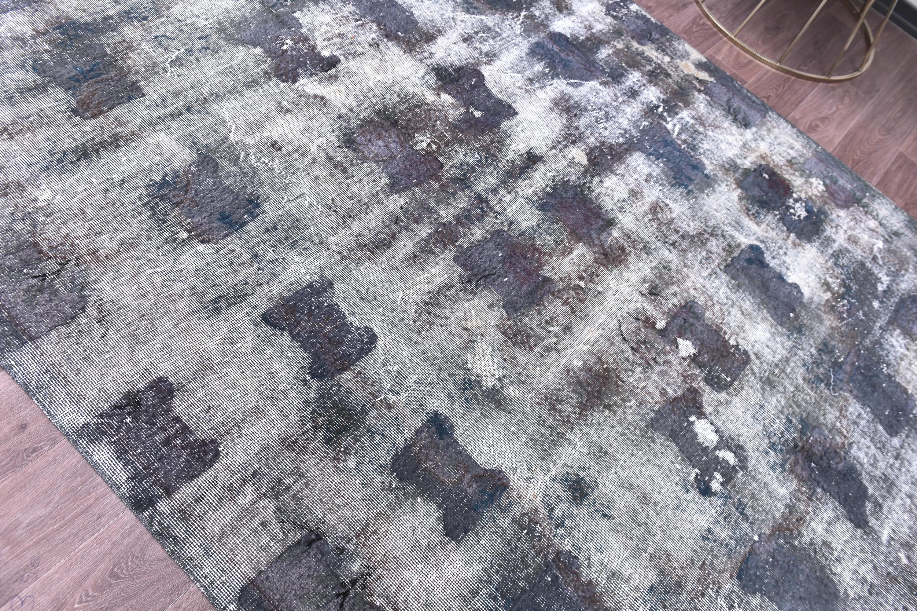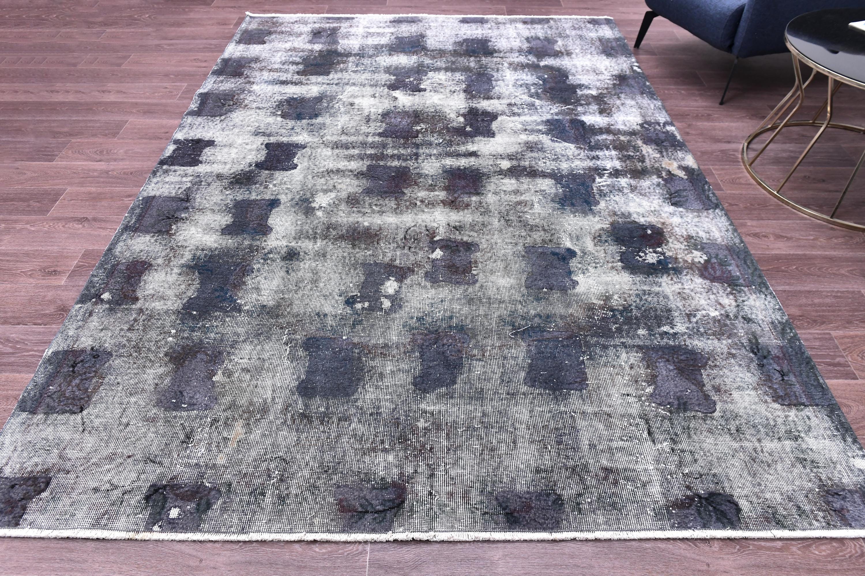📜📌Vintage Turkish overdyed area rug in distressed gray and white tones featuring abstract weathered patterns. Hand-knotted wool Oushak carpet with low pile texture, measuring approximately 6x9 feet, displaying charcoal gray, light gray, and ivory mottled design with white fringed edges, perfect for modern bohemian interiors.