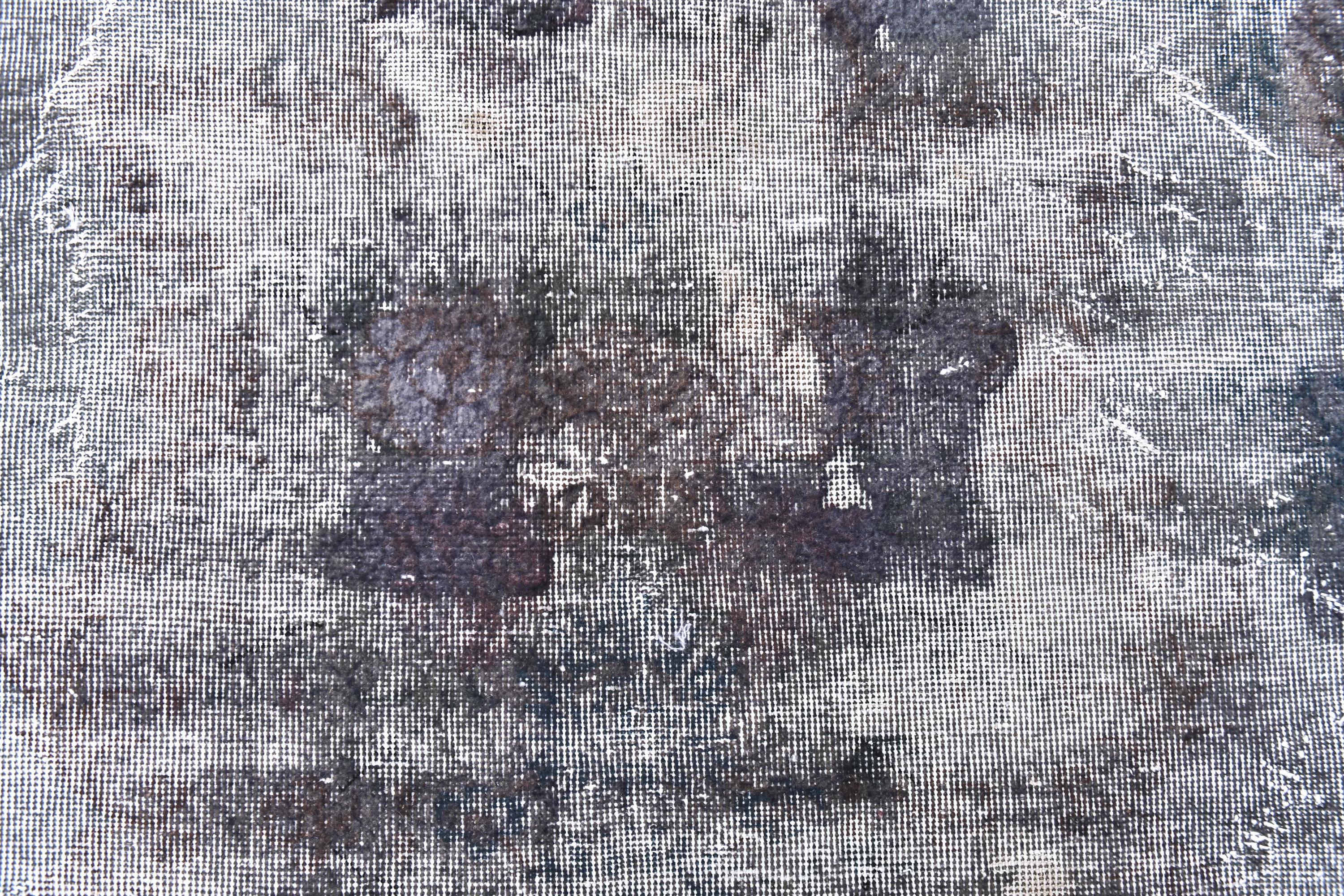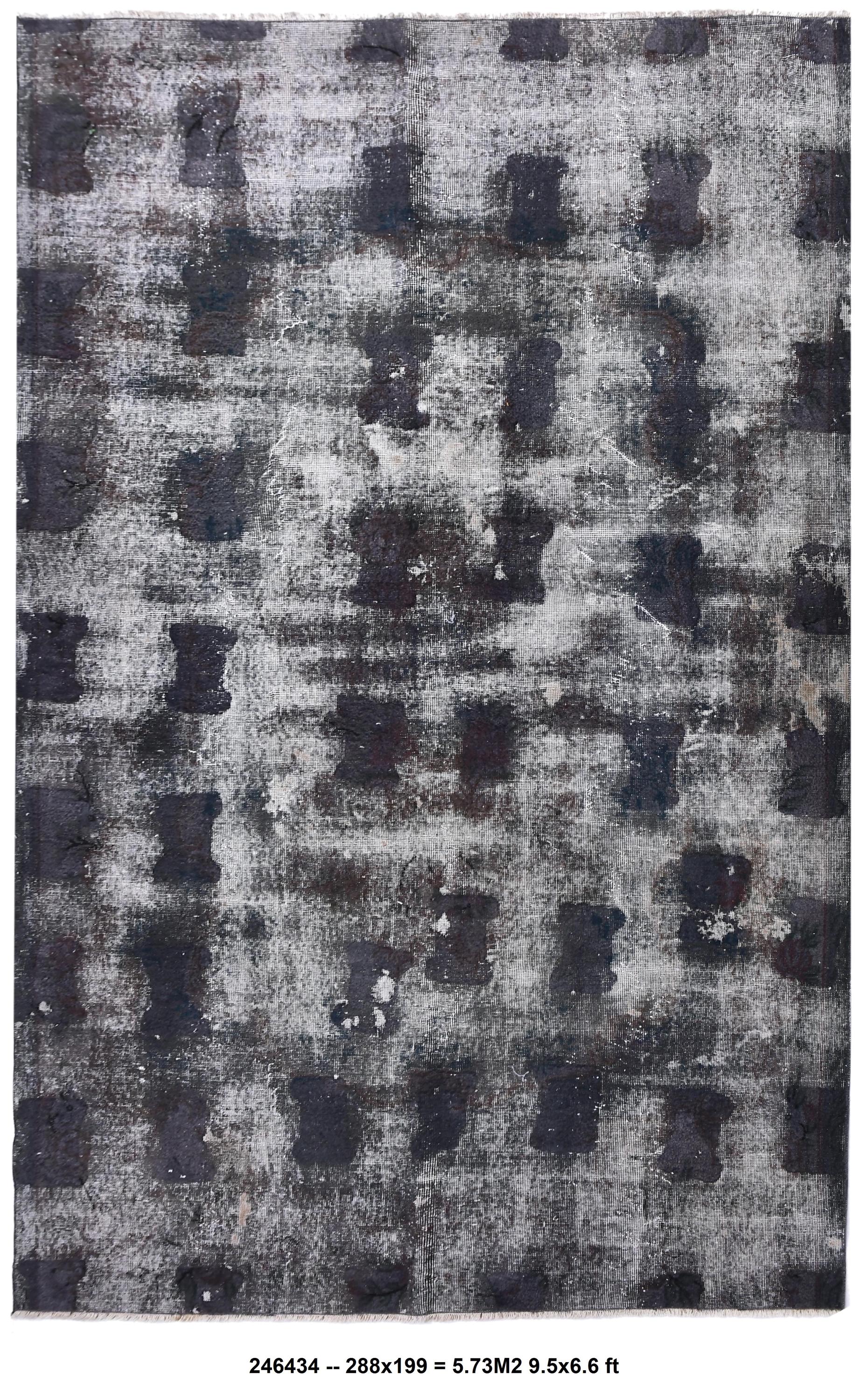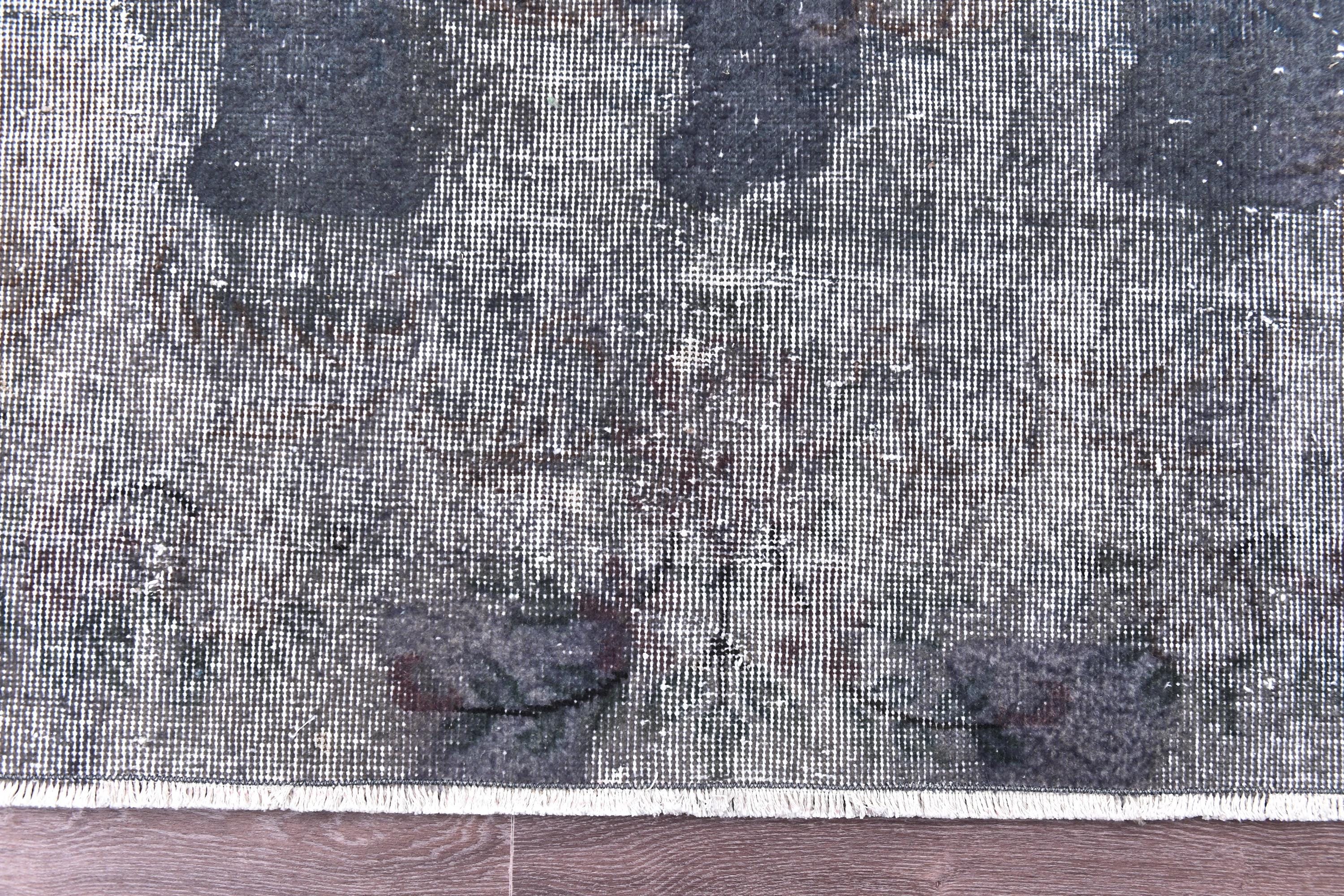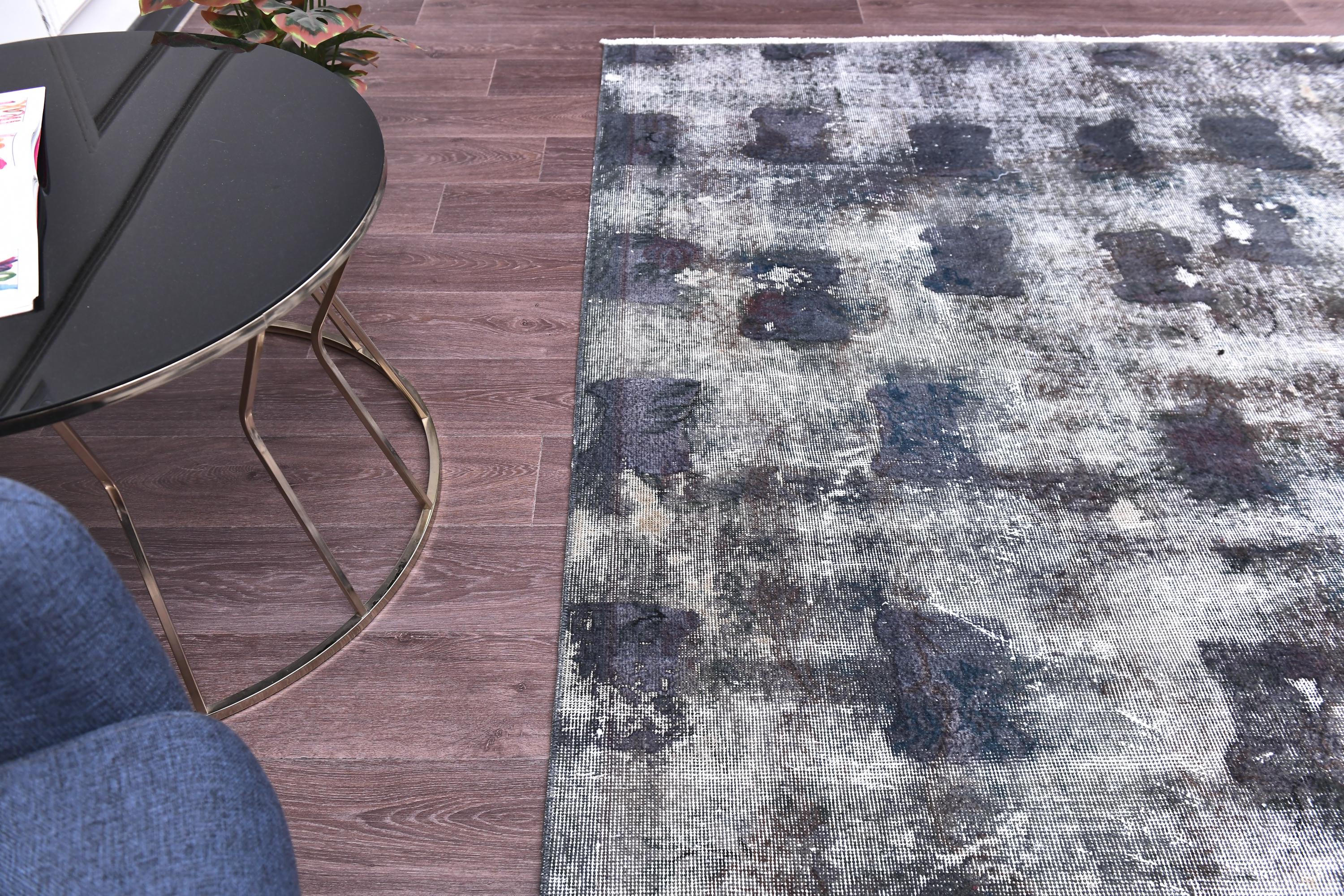 📜📌Vintage Turkish overdyed area rug in distressed gray and white tones featuring abstract weathered patterns. Hand-knotted wool Oushak carpet with low pile texture, measuring approximately 6x9 feet, displaying charcoal gray, light gray, and ivory mottled design with white fringed edges, perfect for modern bohemian interiors.