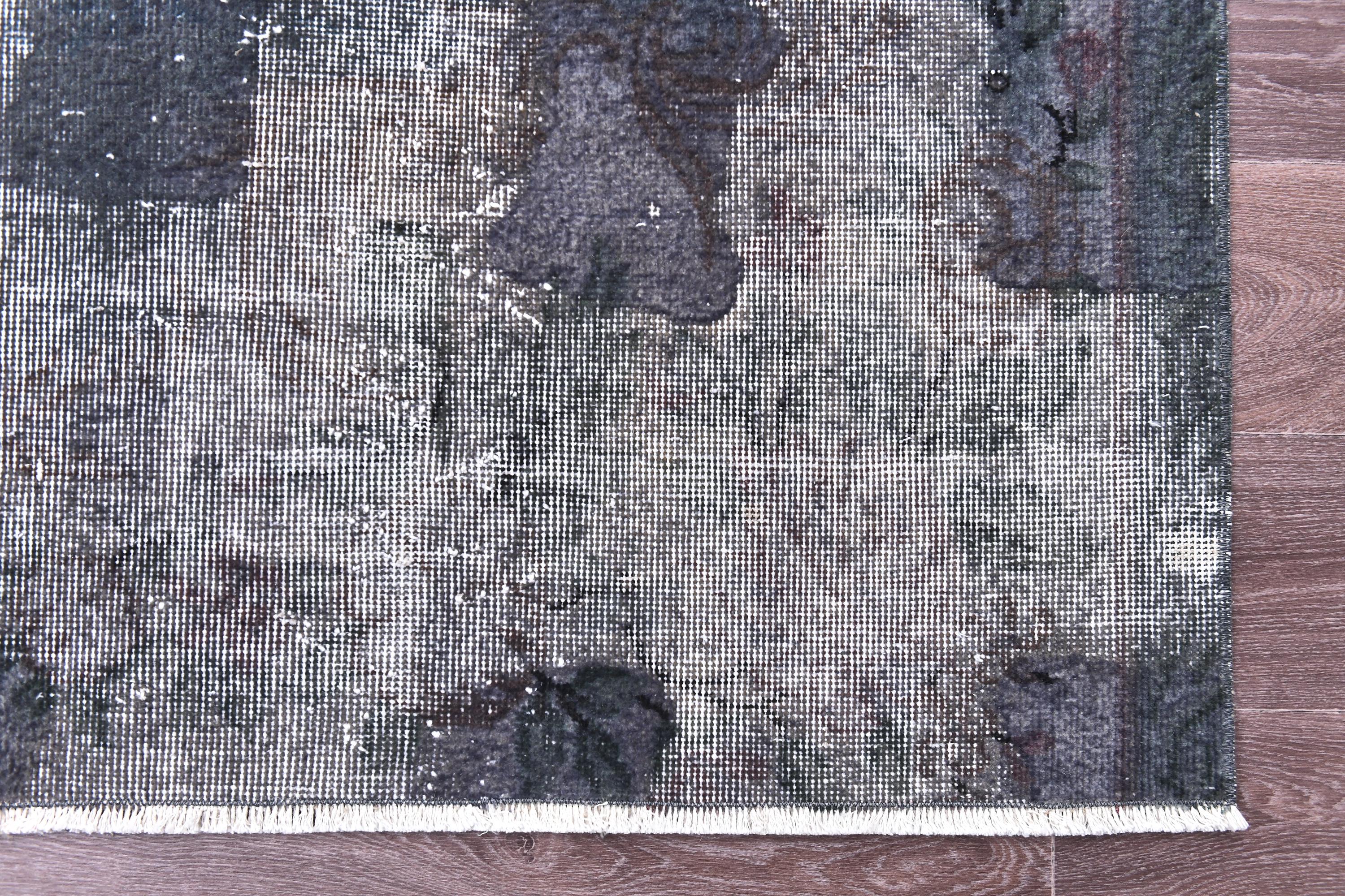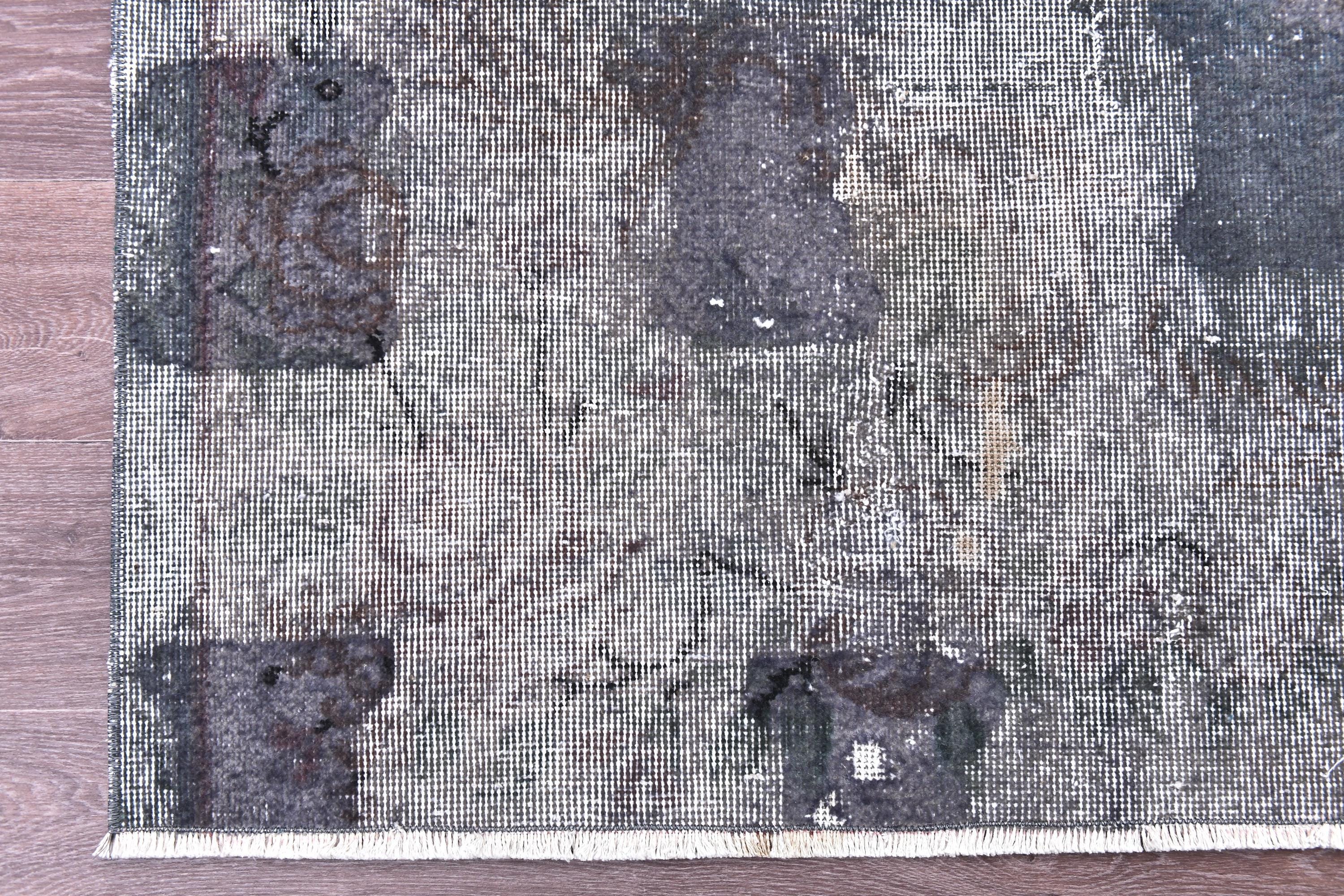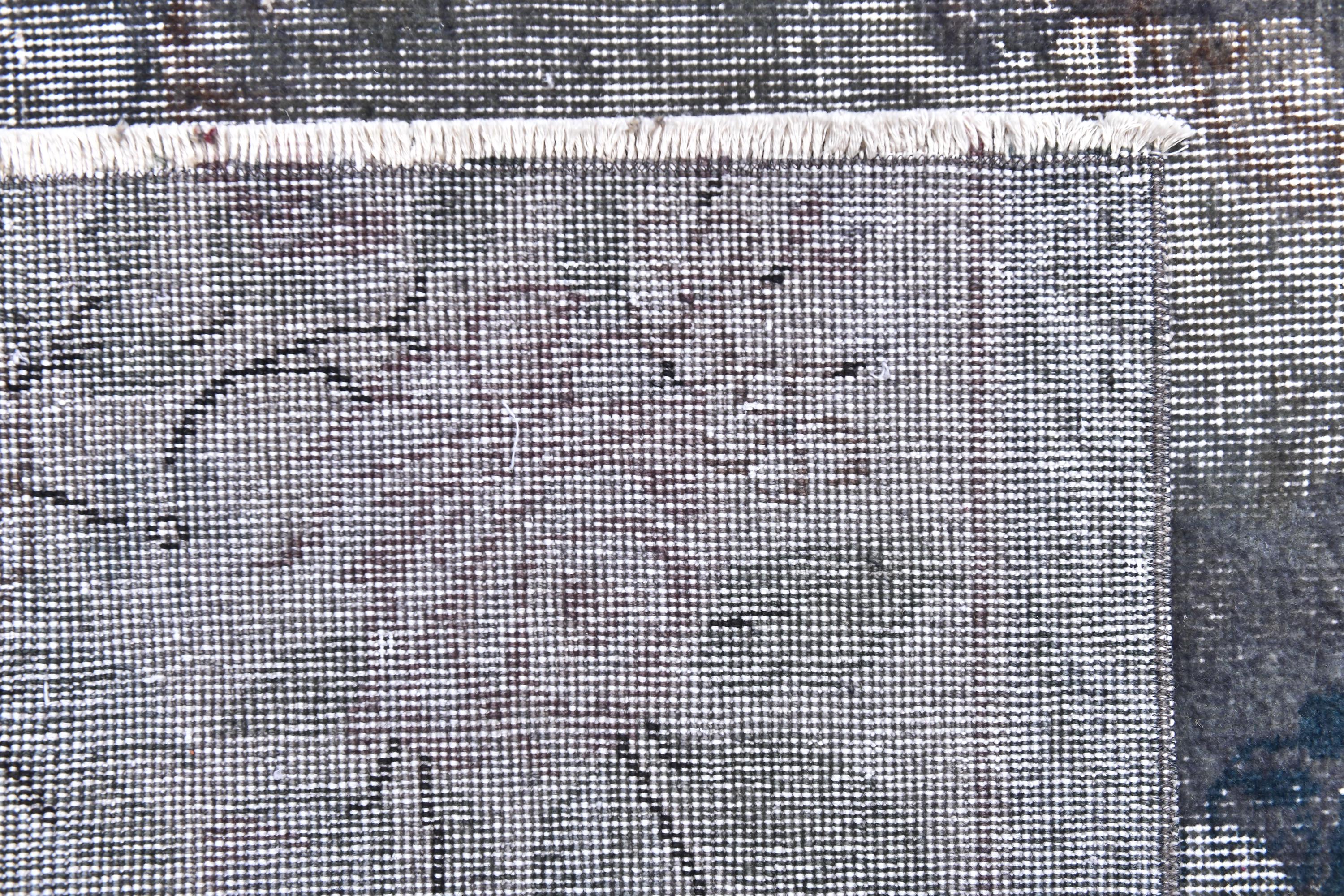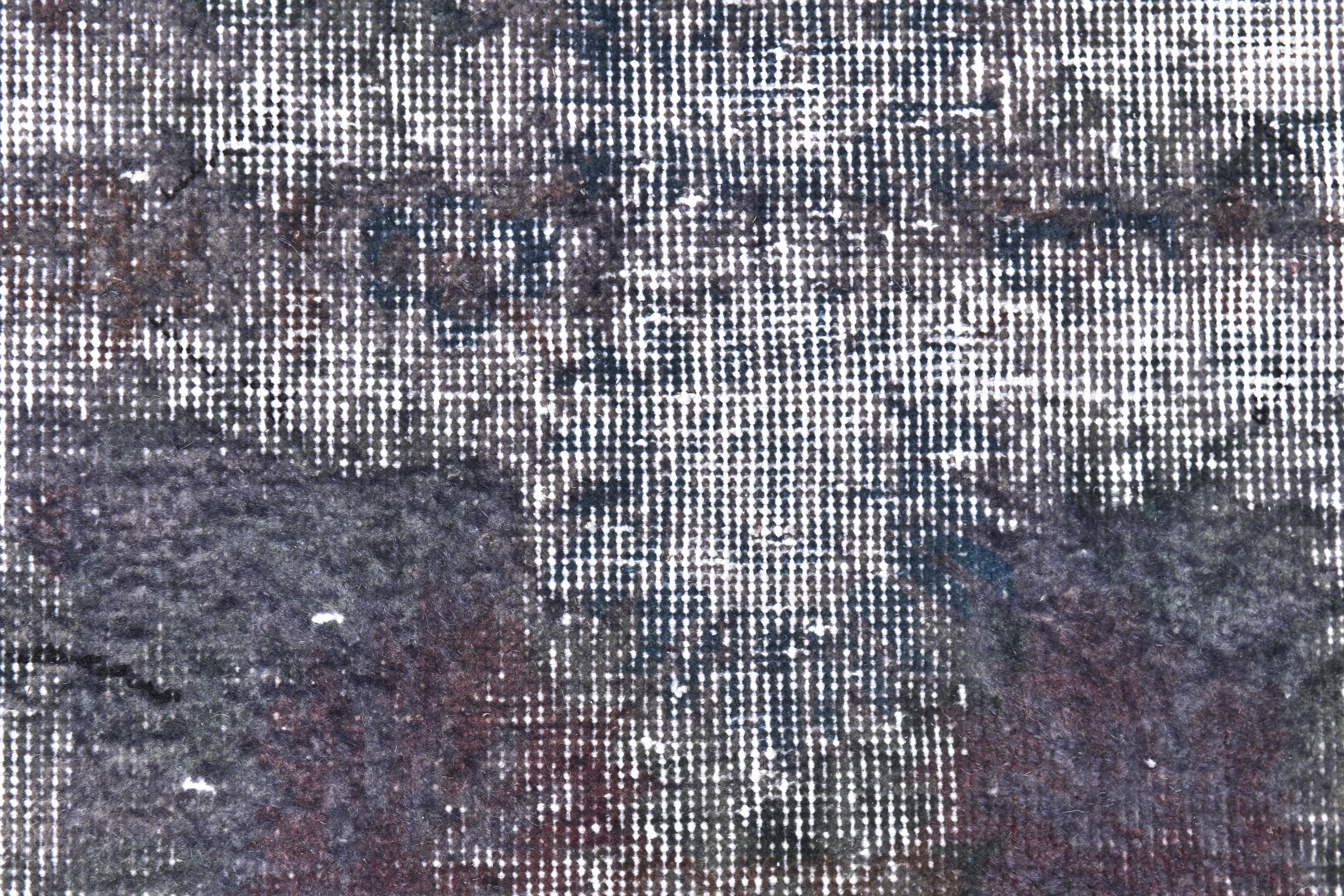 📜📌Vintage Turkish overdyed area rug in distressed gray and white tones featuring abstract weathered patterns. Hand-knotted wool Oushak carpet with low pile texture, measuring approximately 6x9 feet, displaying charcoal gray, light gray, and ivory mottled design with white fringed edges, perfect for modern bohemian interiors.