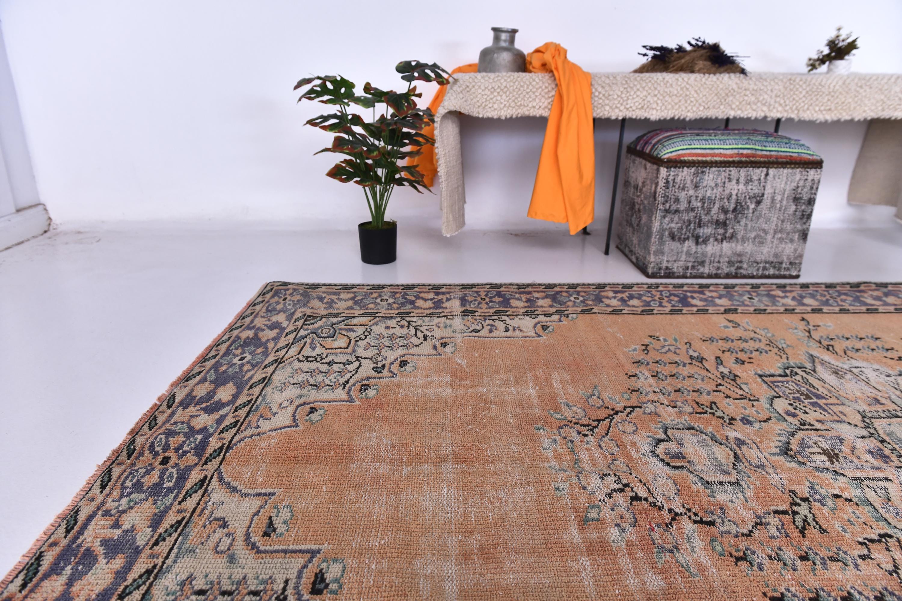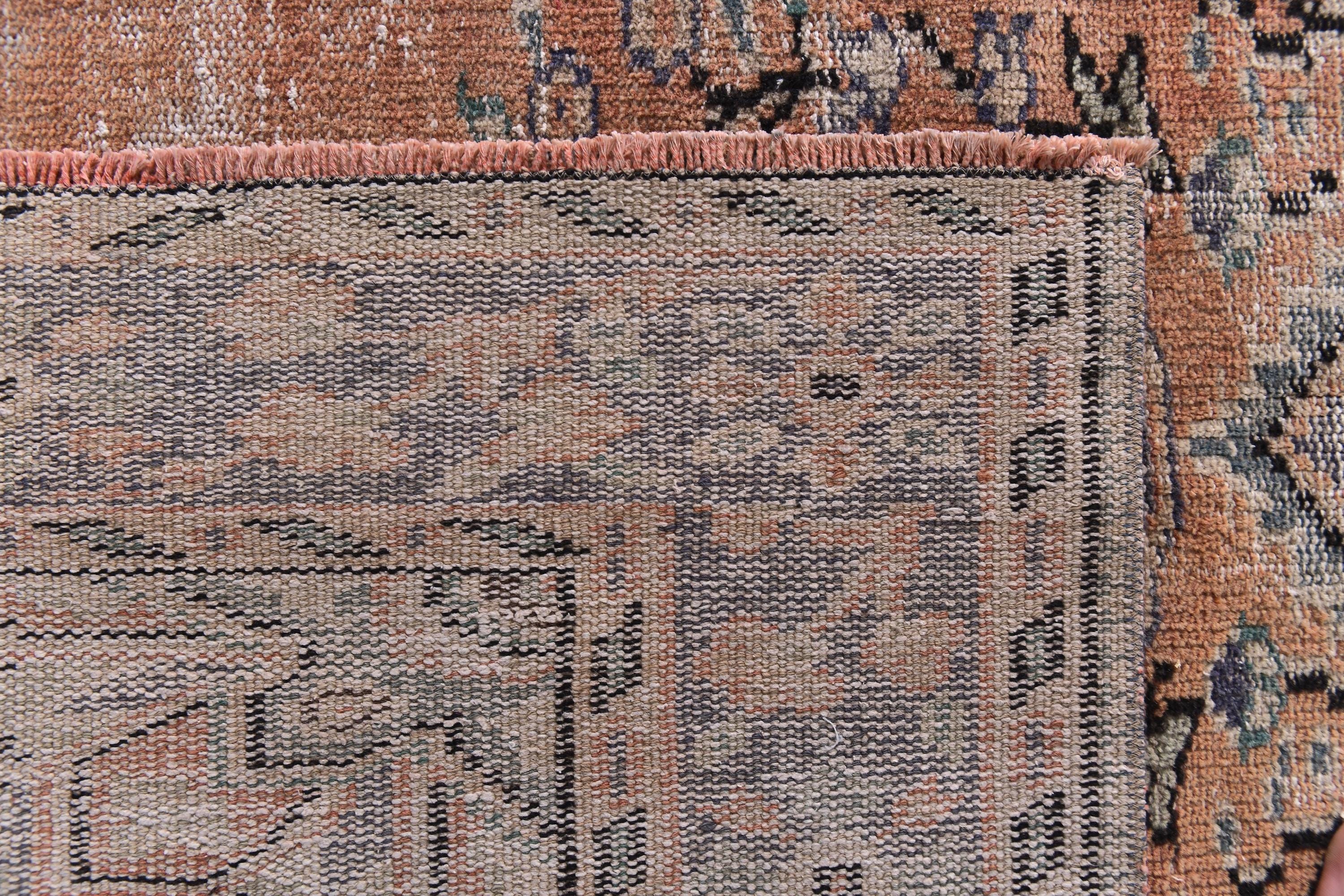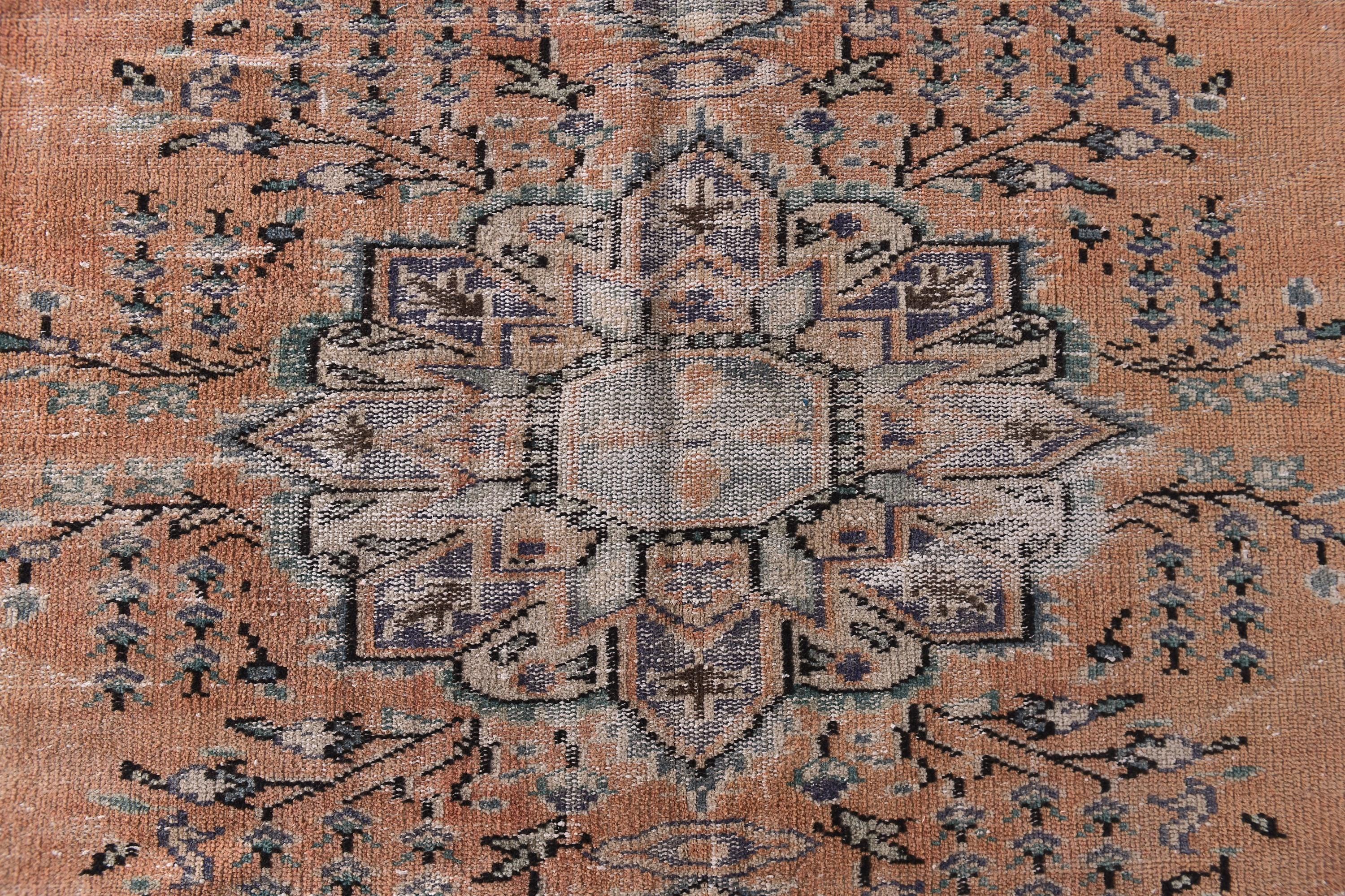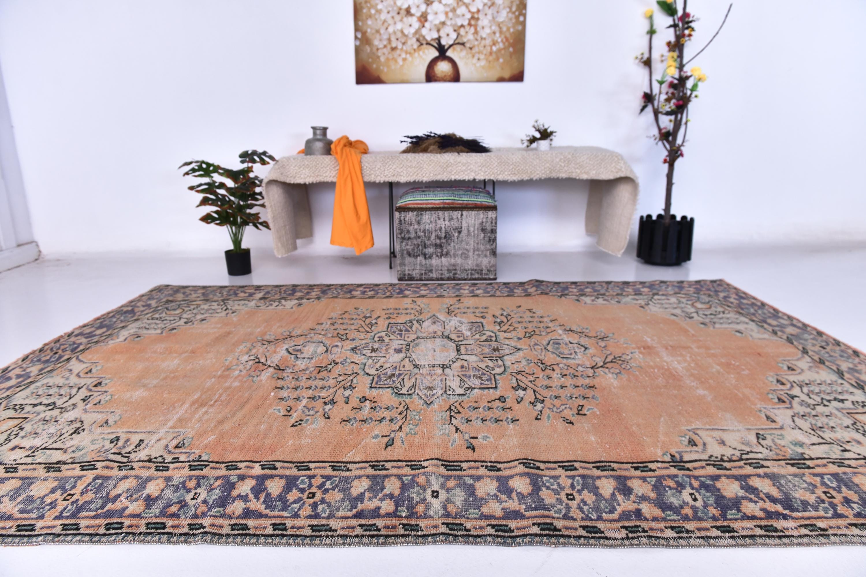 📜📌Antique Anatolian area rug in faded salmon and peach tones with central geometric medallion pattern in navy blue and cream. Hand-woven wool construction shows authentic vintage distressing and natural patina. Features traditional Turkish border designs with floral and geometric elements. Ideal statement piece for living rooms, bedrooms, or dining spaces with boho or vintage aesthetic.